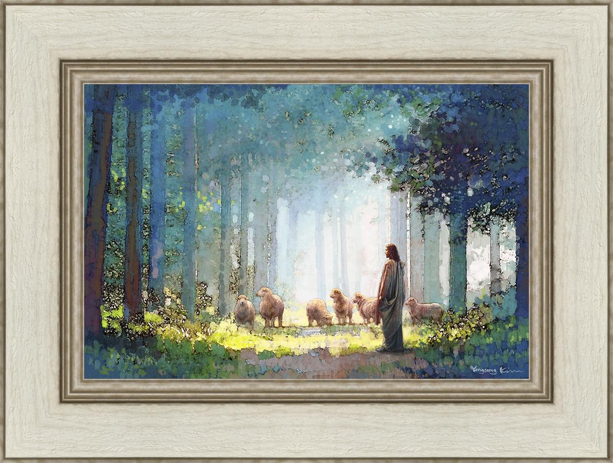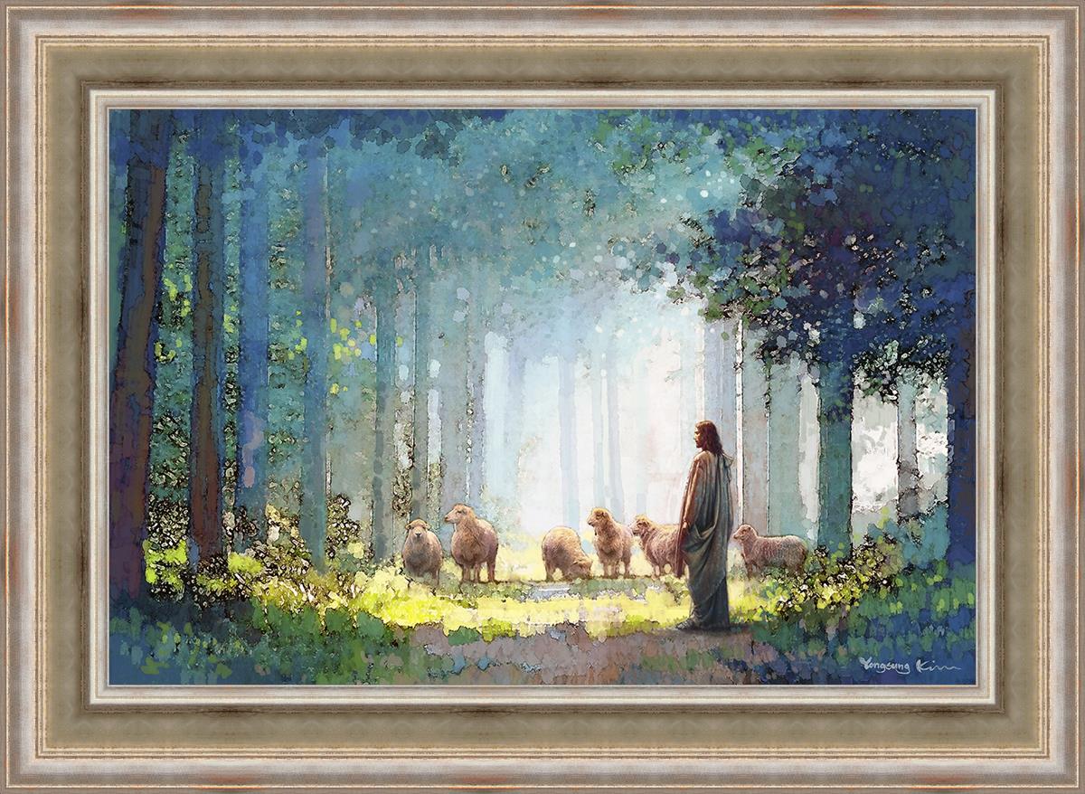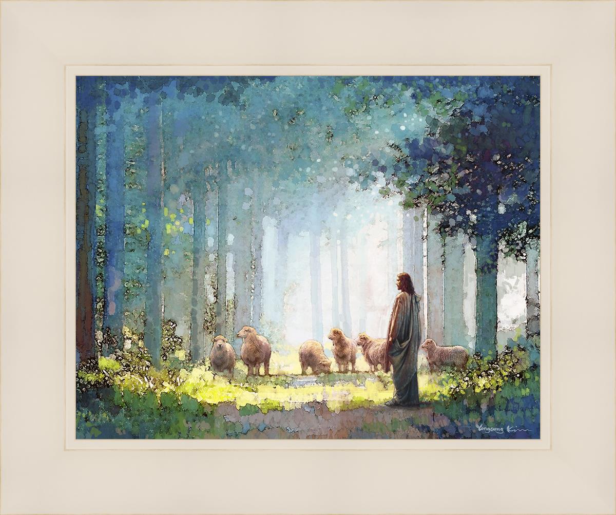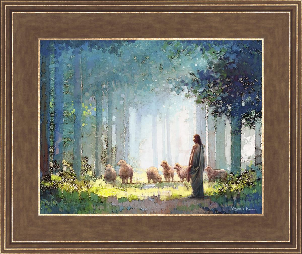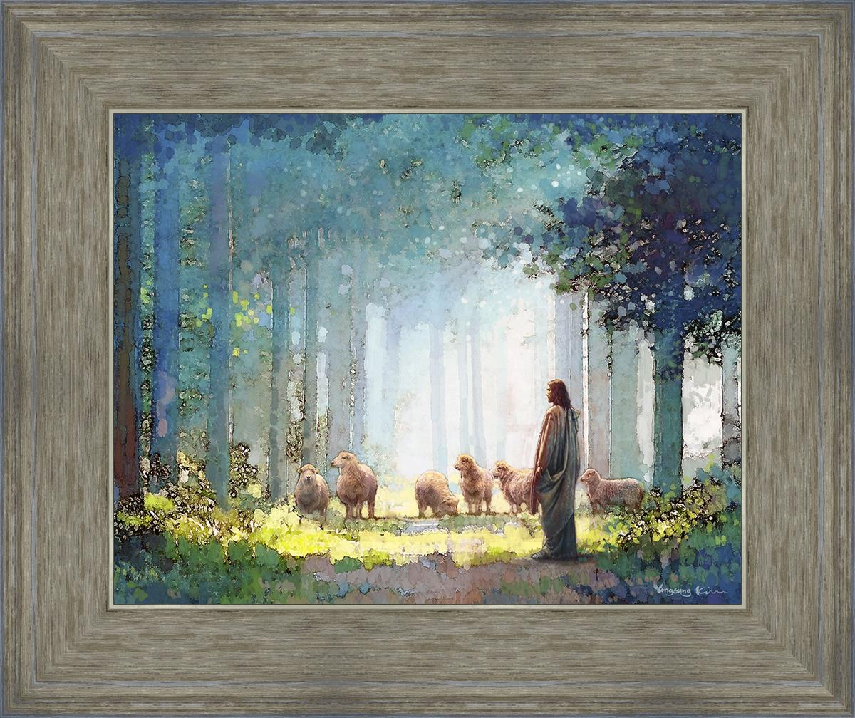 Painting of Keeping Watch by Yongsung Kim featuring Jesus Christ guiding His flock of sheep through a deep blue wilderness