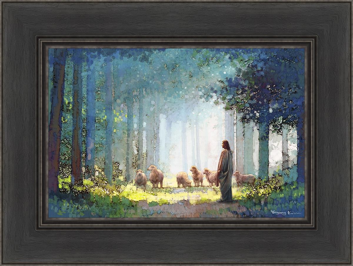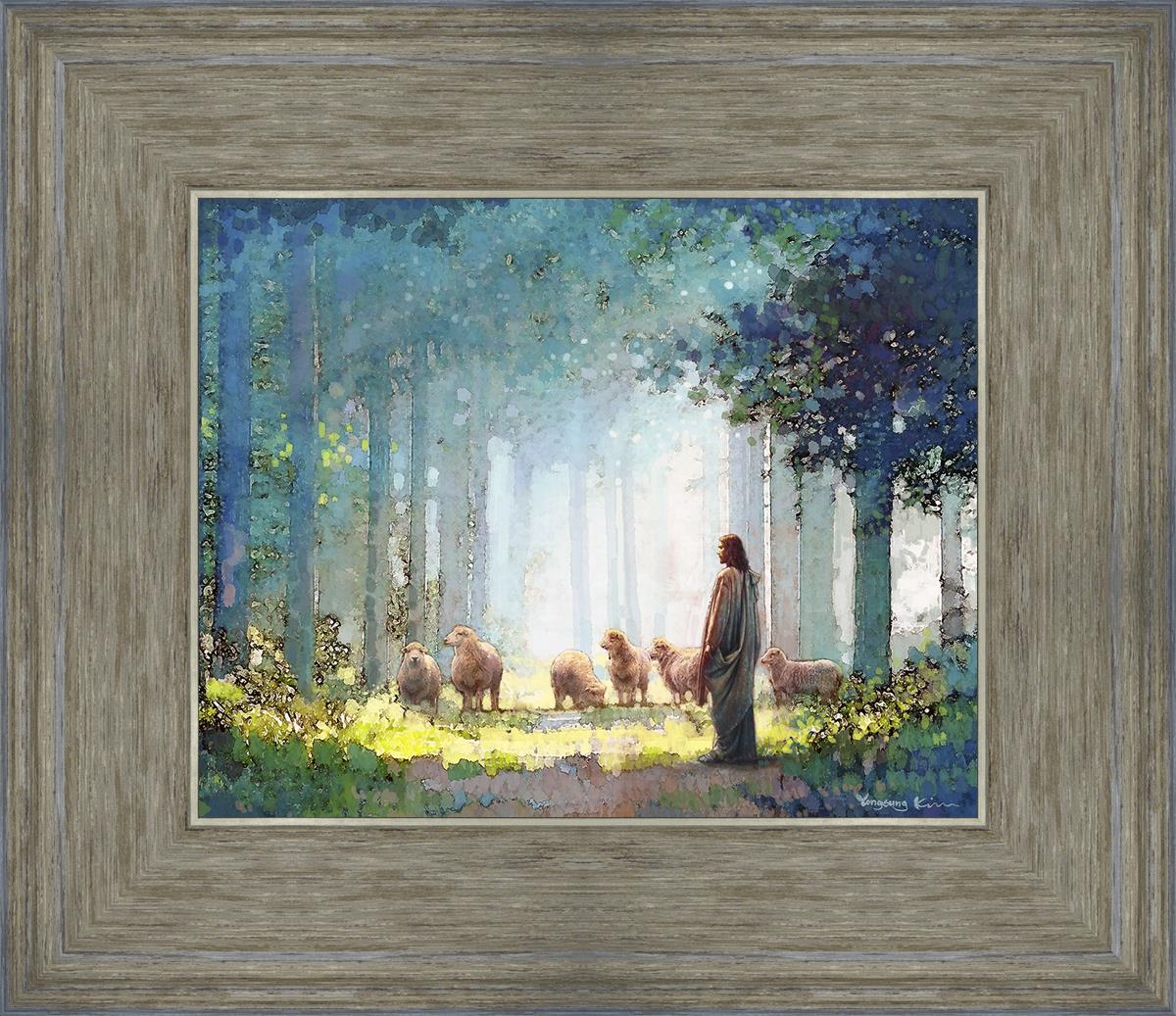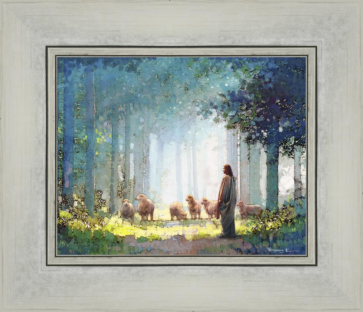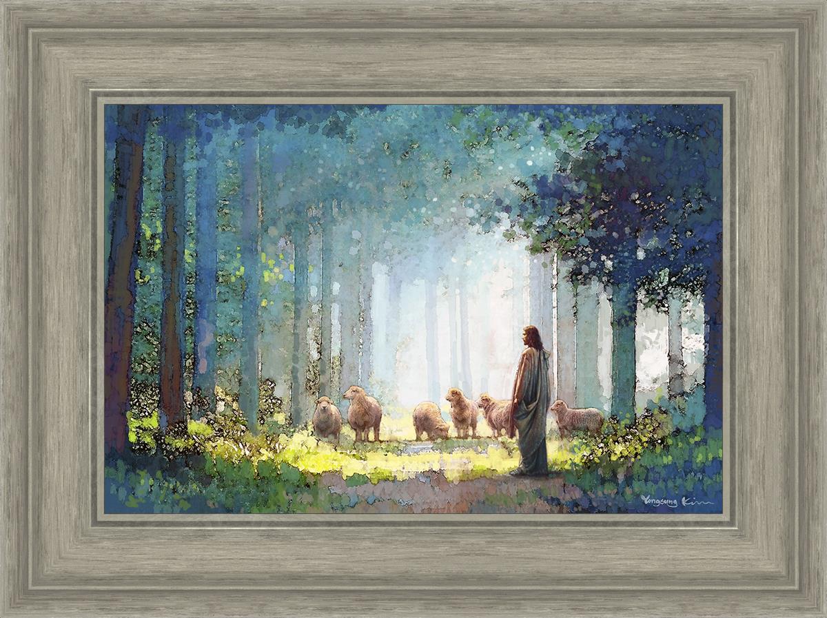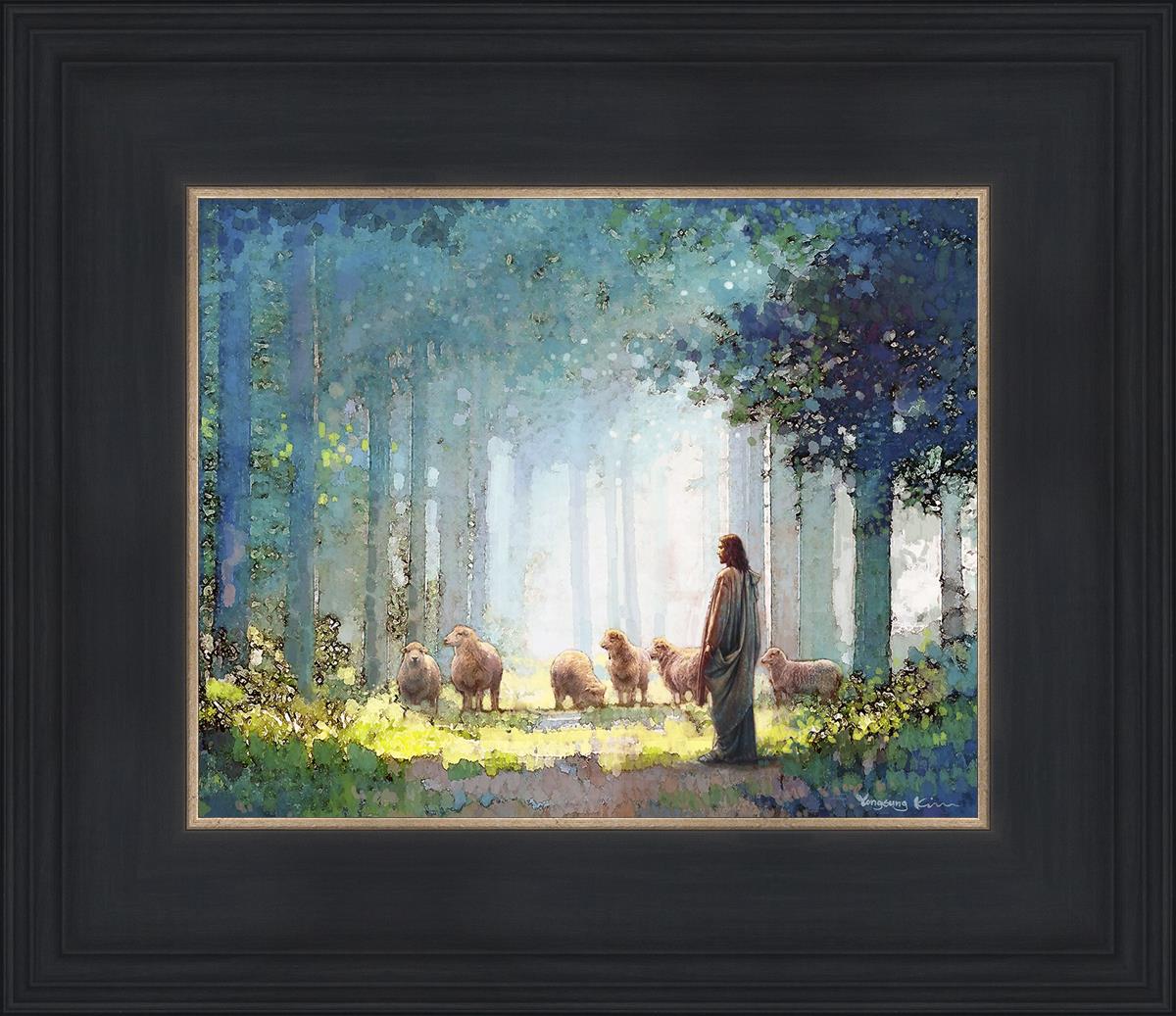 Painting of Keeping Watch by Yongsung Kim featuring Jesus Christ guiding His flock of sheep through a deep blue wilderness