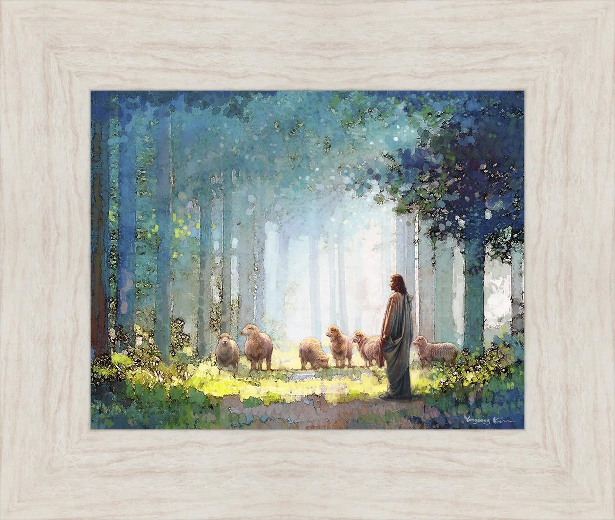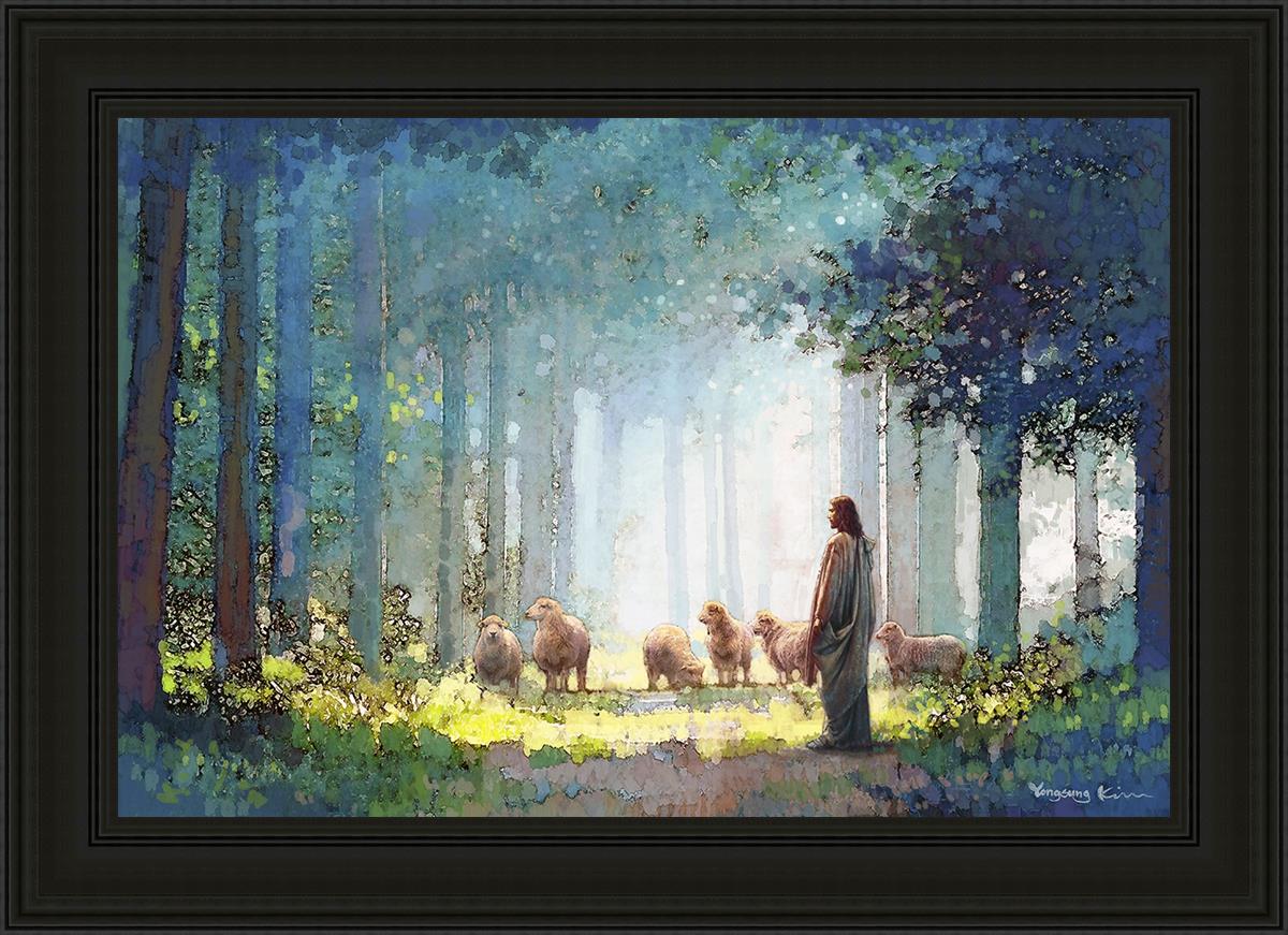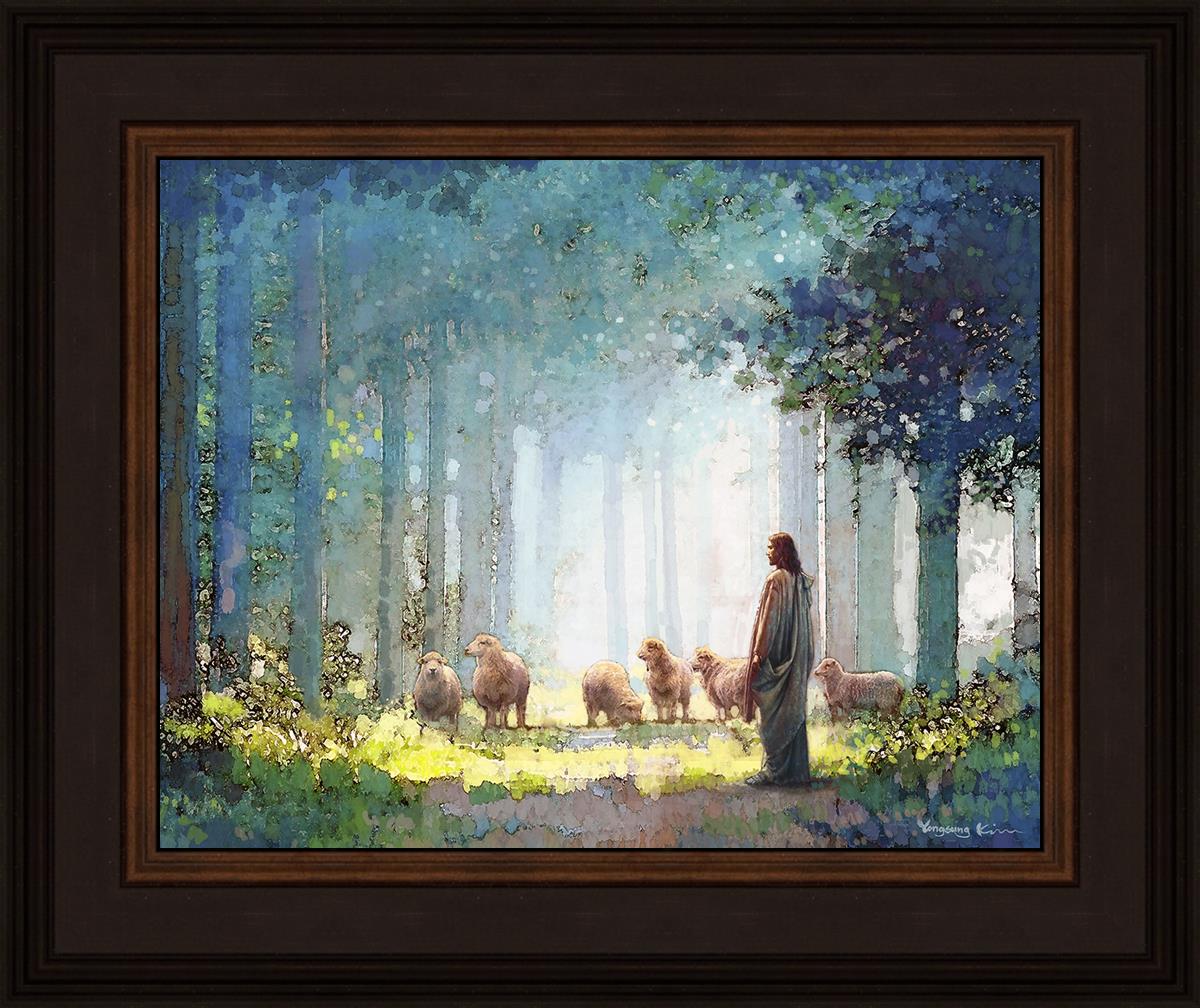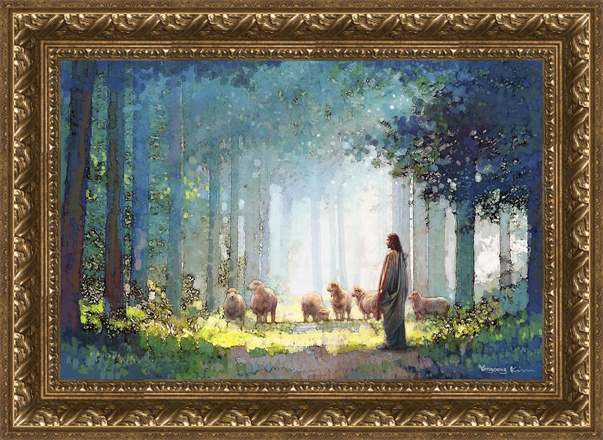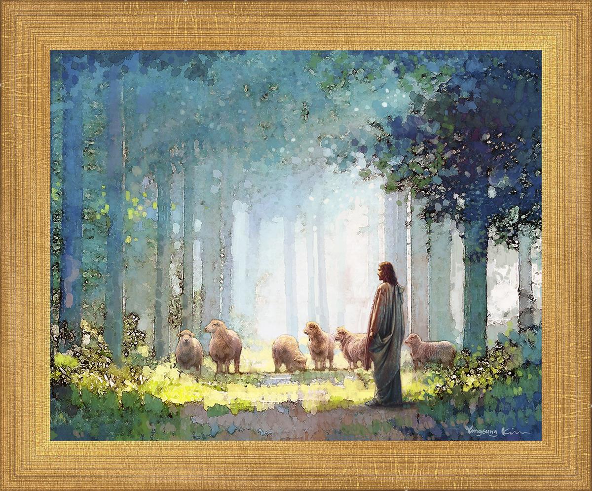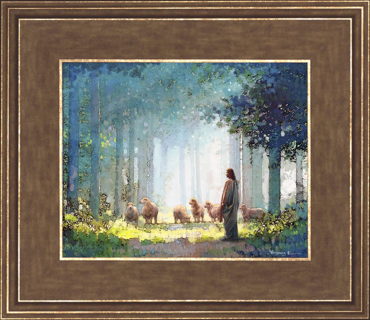 Painting of Keeping Watch by Yongsung Kim featuring Jesus Christ guiding His flock of sheep through a deep blue wilderness