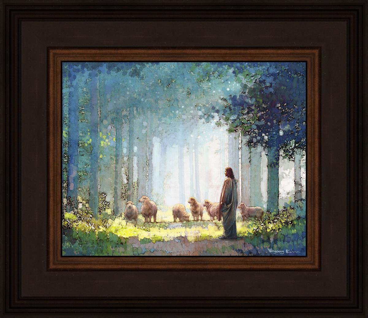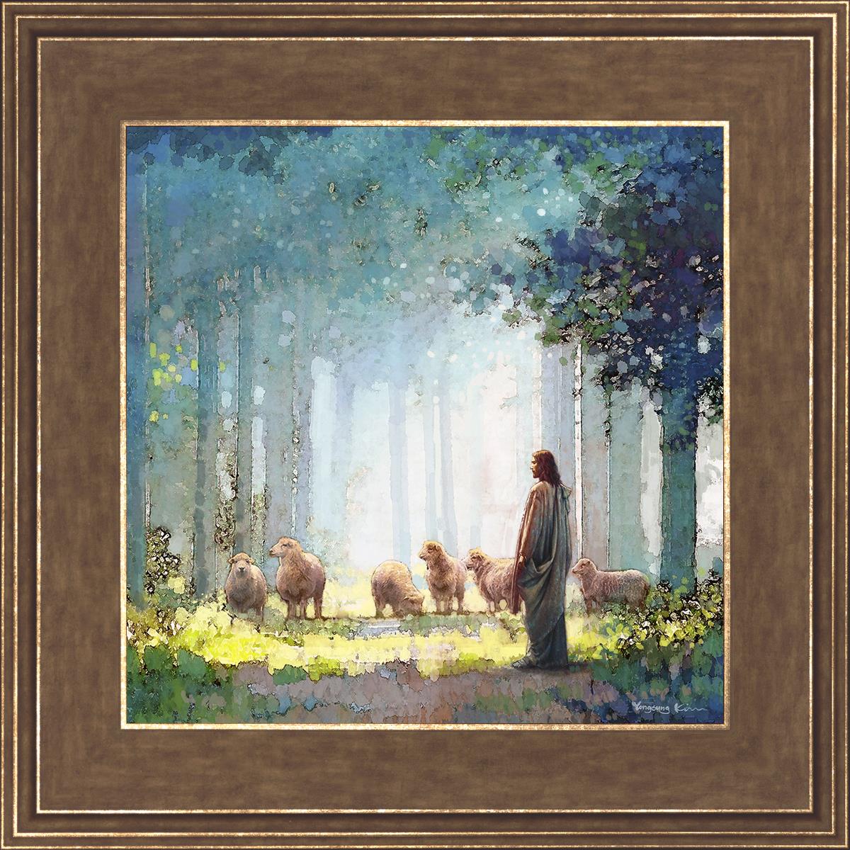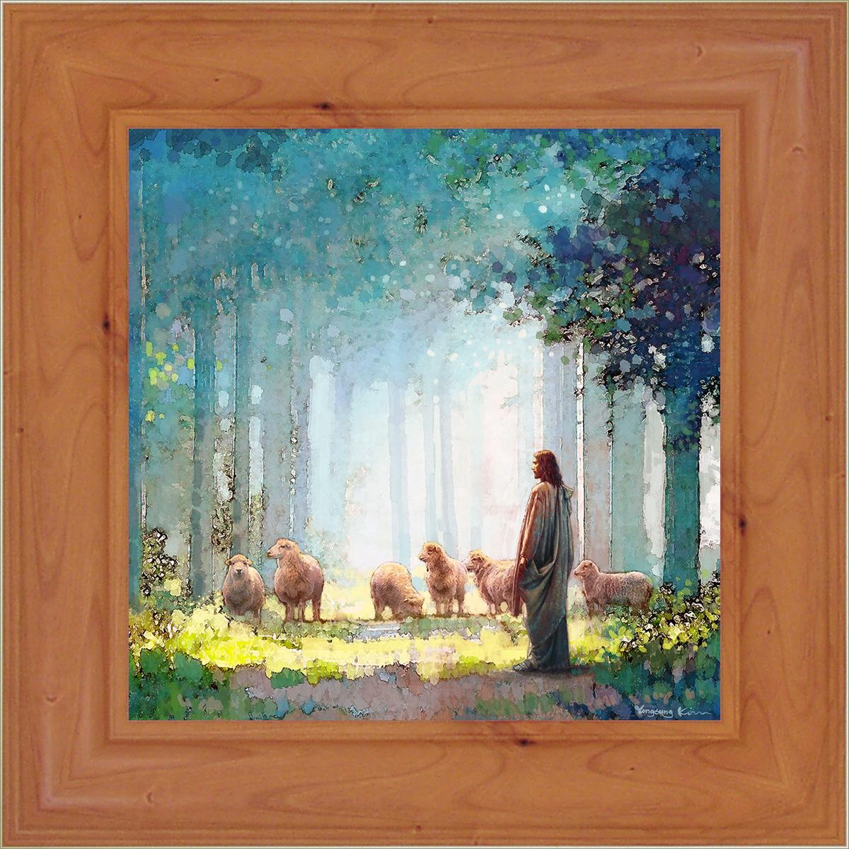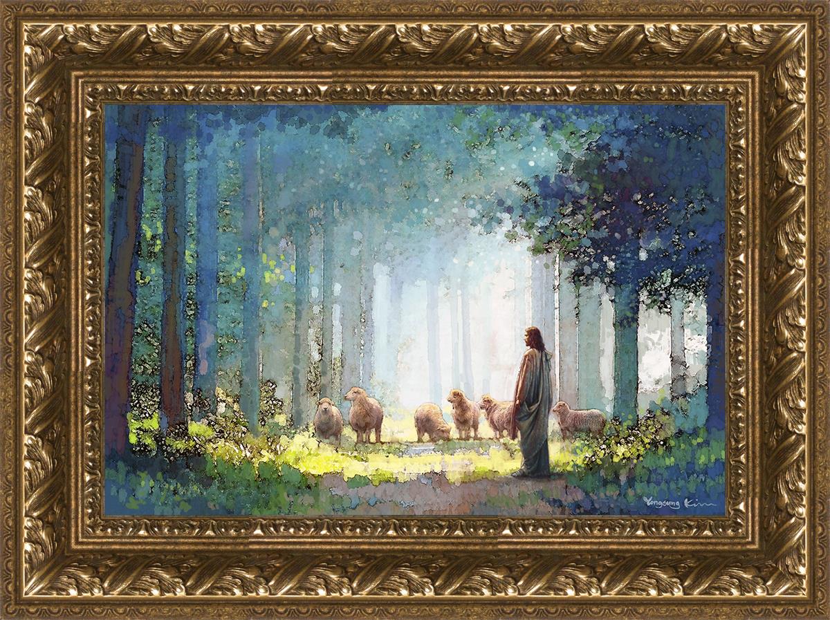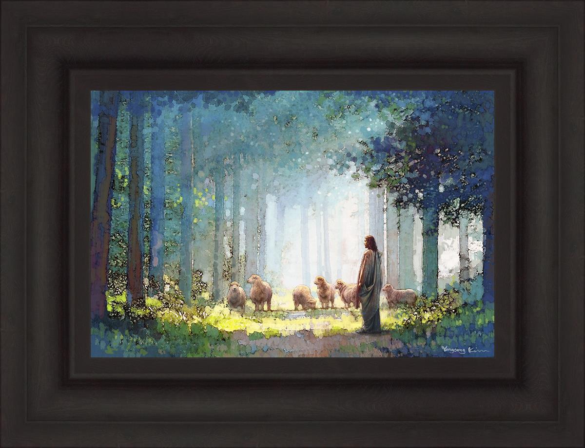 Painting of Keeping Watch by Yongsung Kim featuring Jesus Christ guiding His flock of sheep through a deep blue wilderness