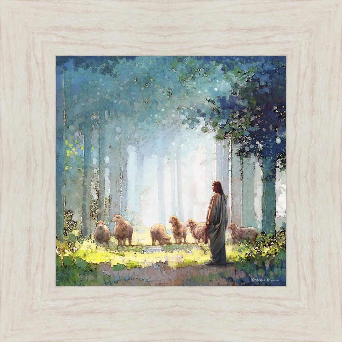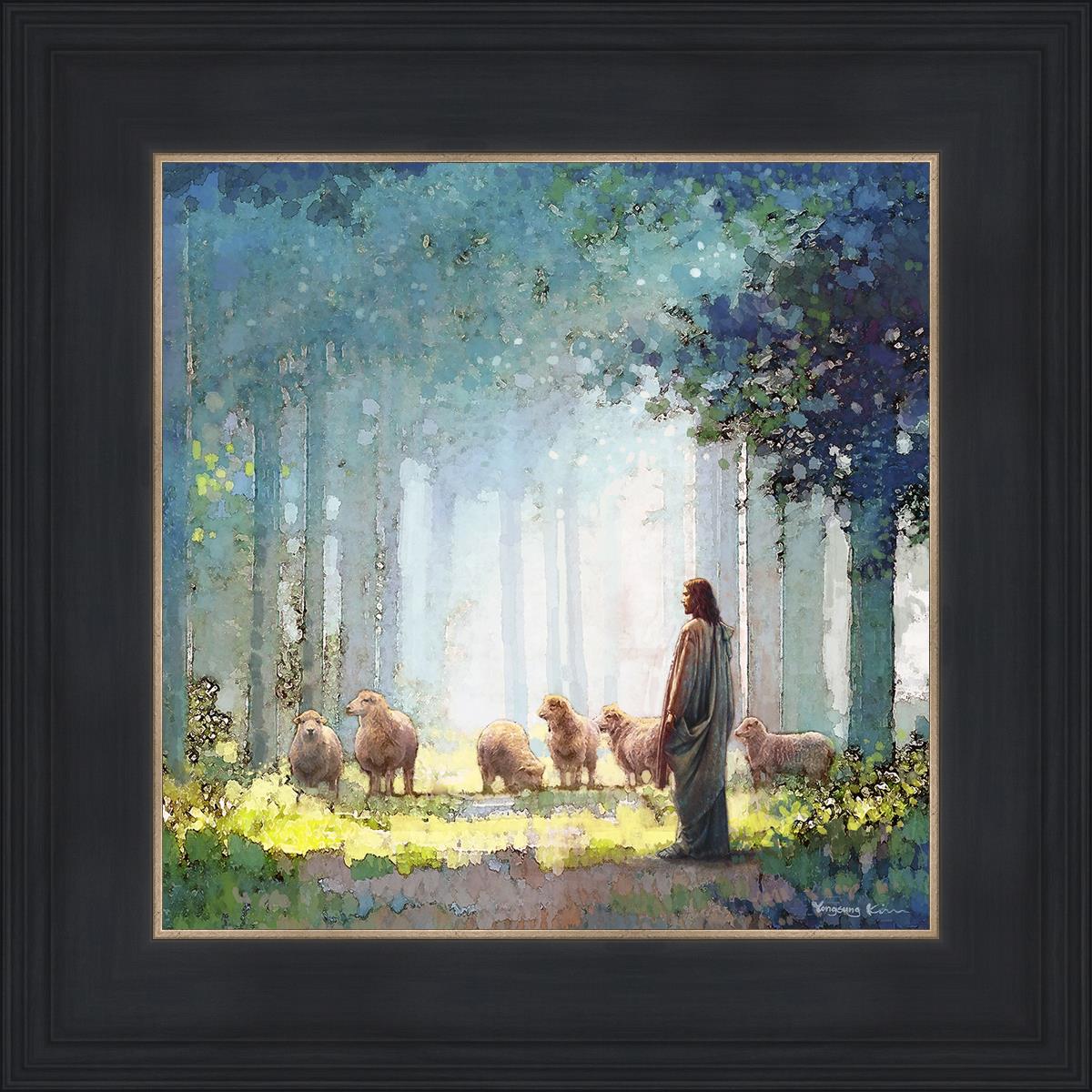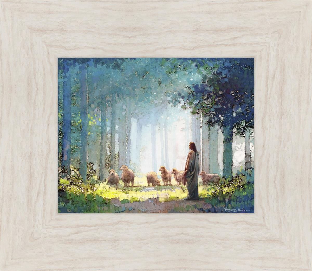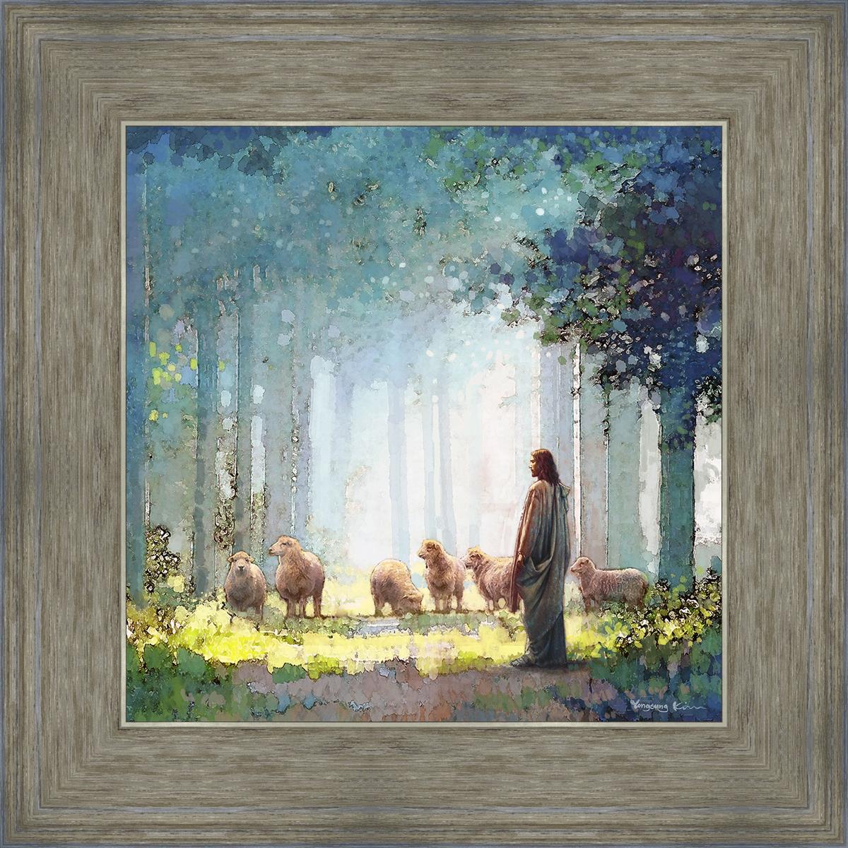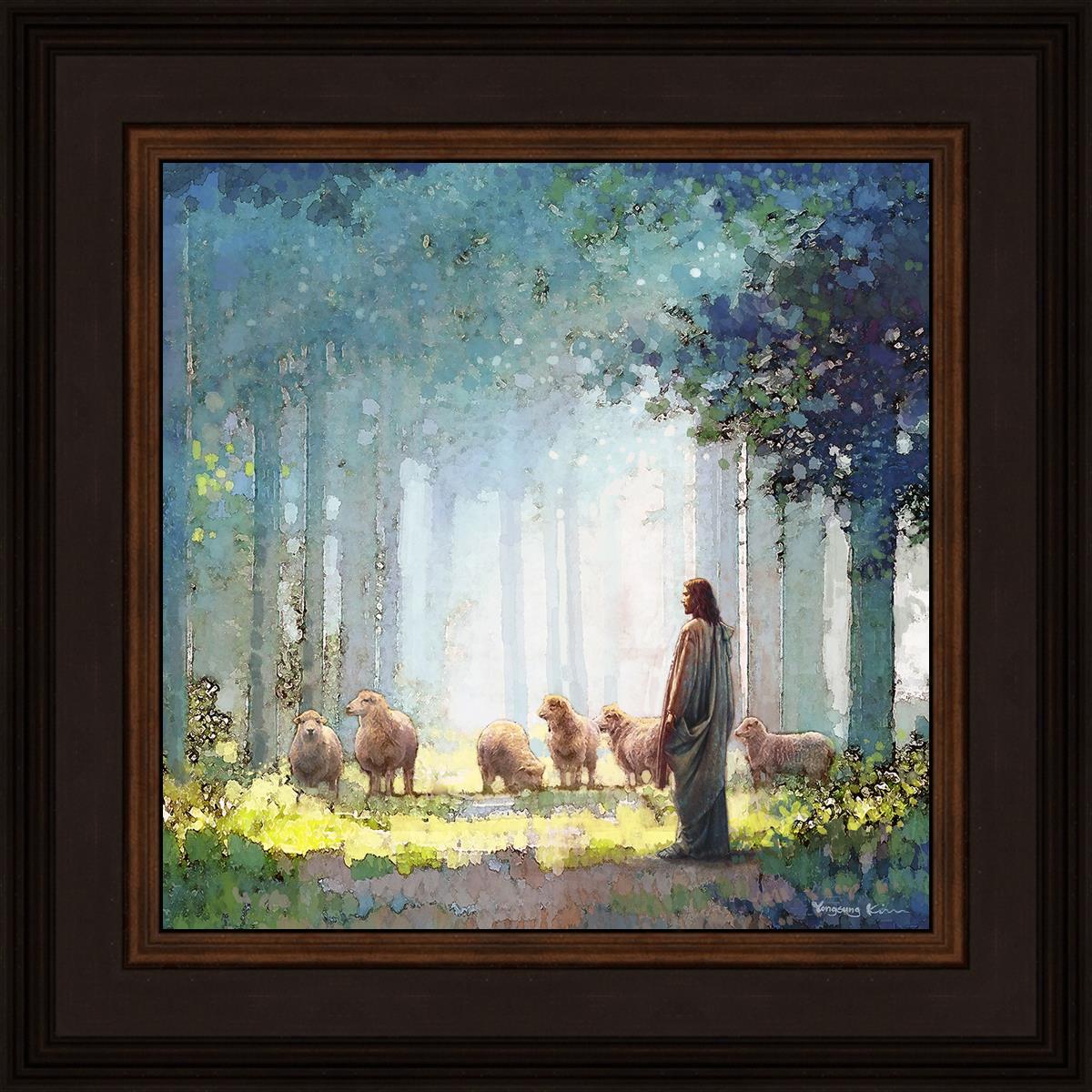 Painting of Keeping Watch by Yongsung Kim featuring Jesus Christ guiding His flock of sheep through a deep blue wilderness
