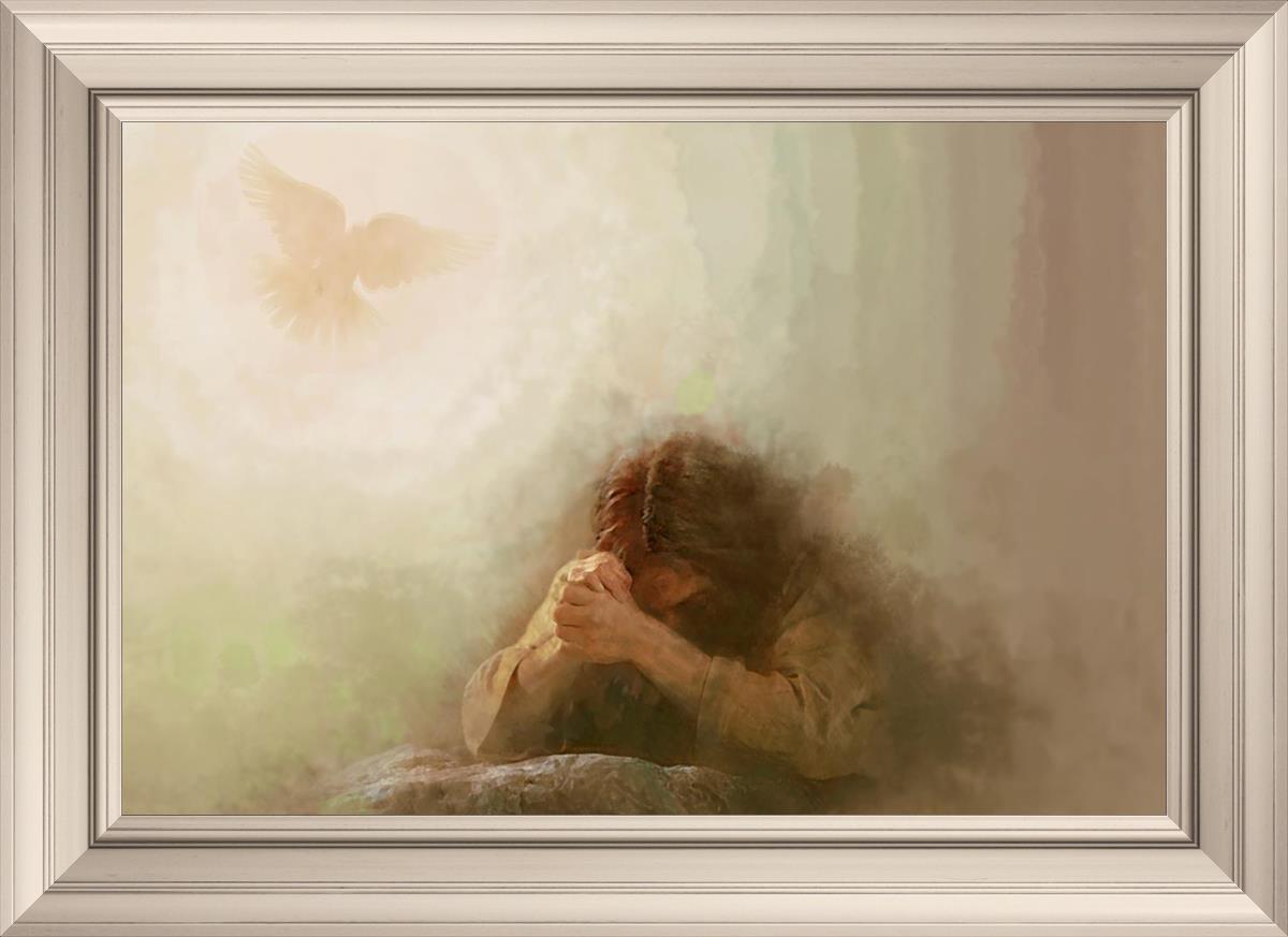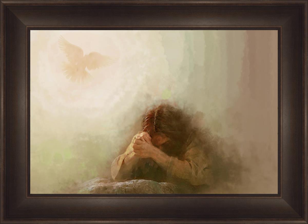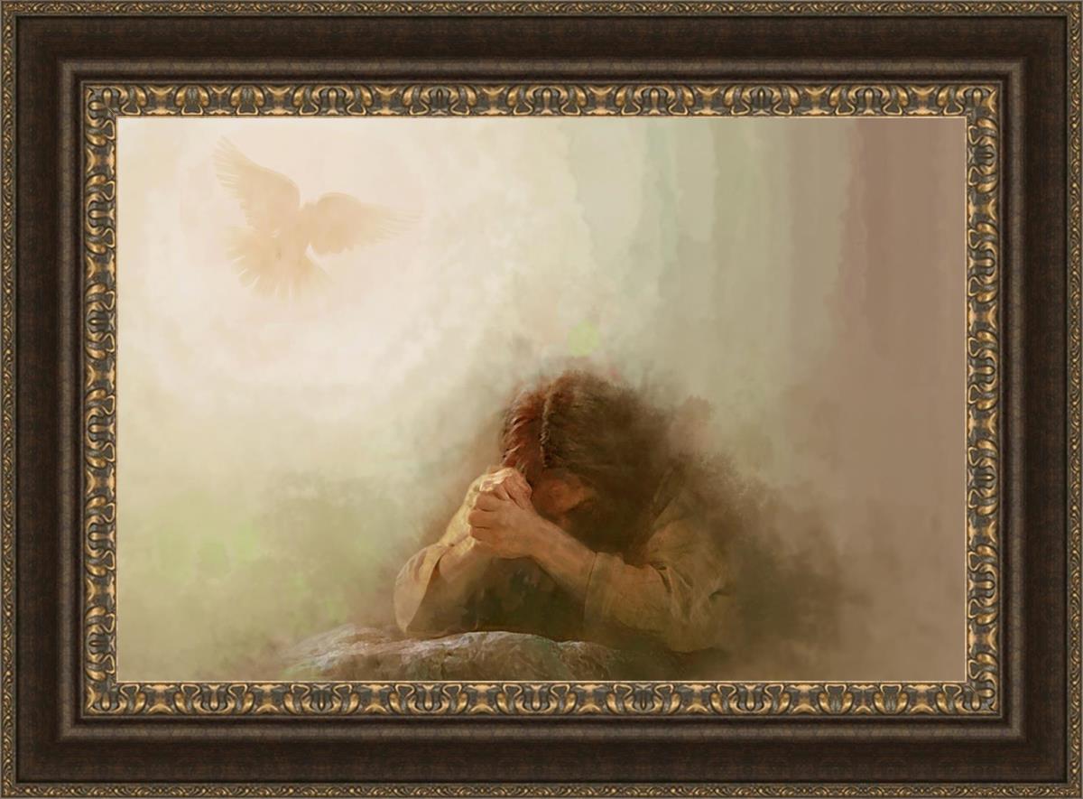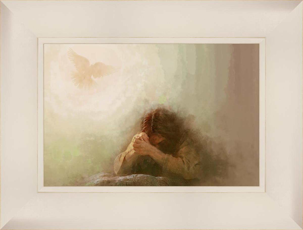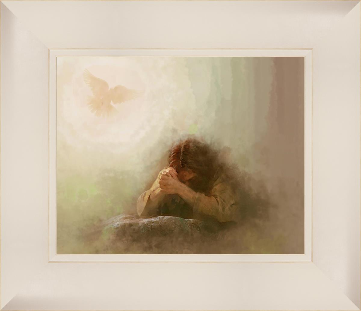 Lord of Prayer NEUTRAL by Yongsung Kim depicts Jesus christ praying on a rock with the Holy Ghost in the form of a dove descending from a bright light in the sky. This painting is available in print and canvas.