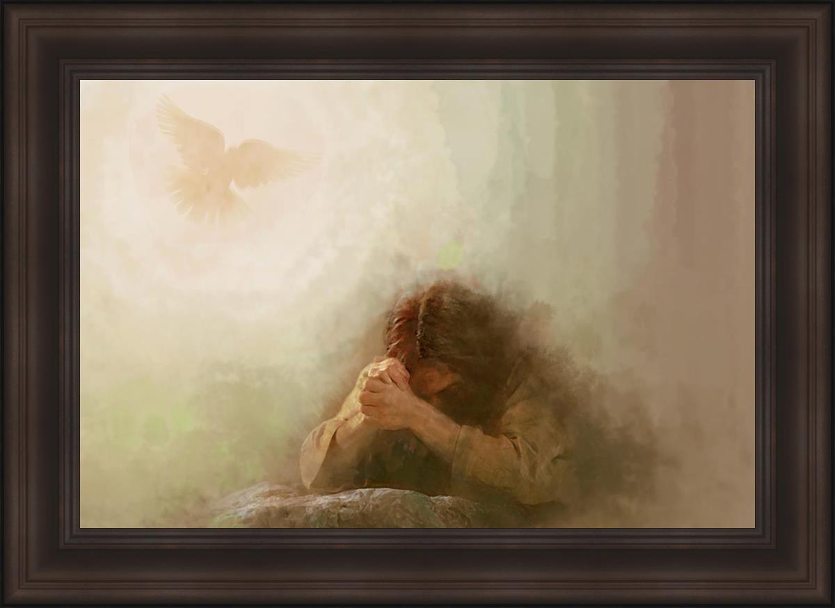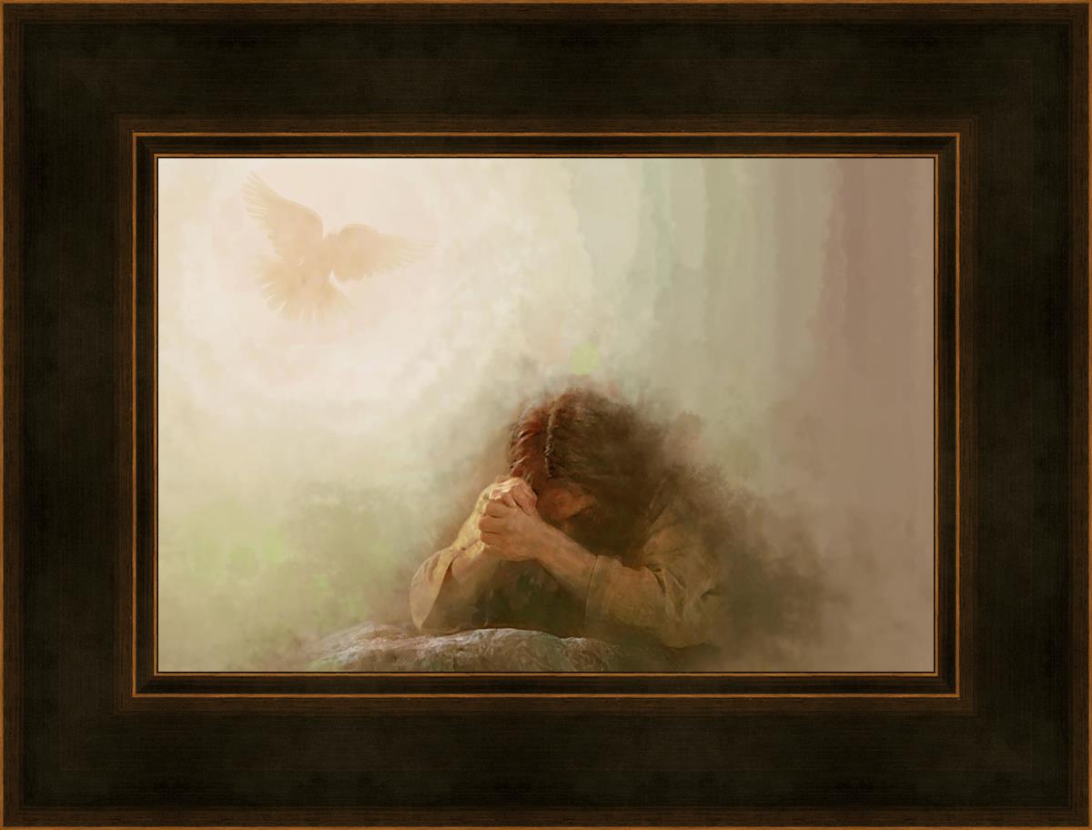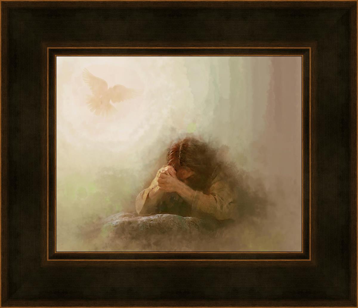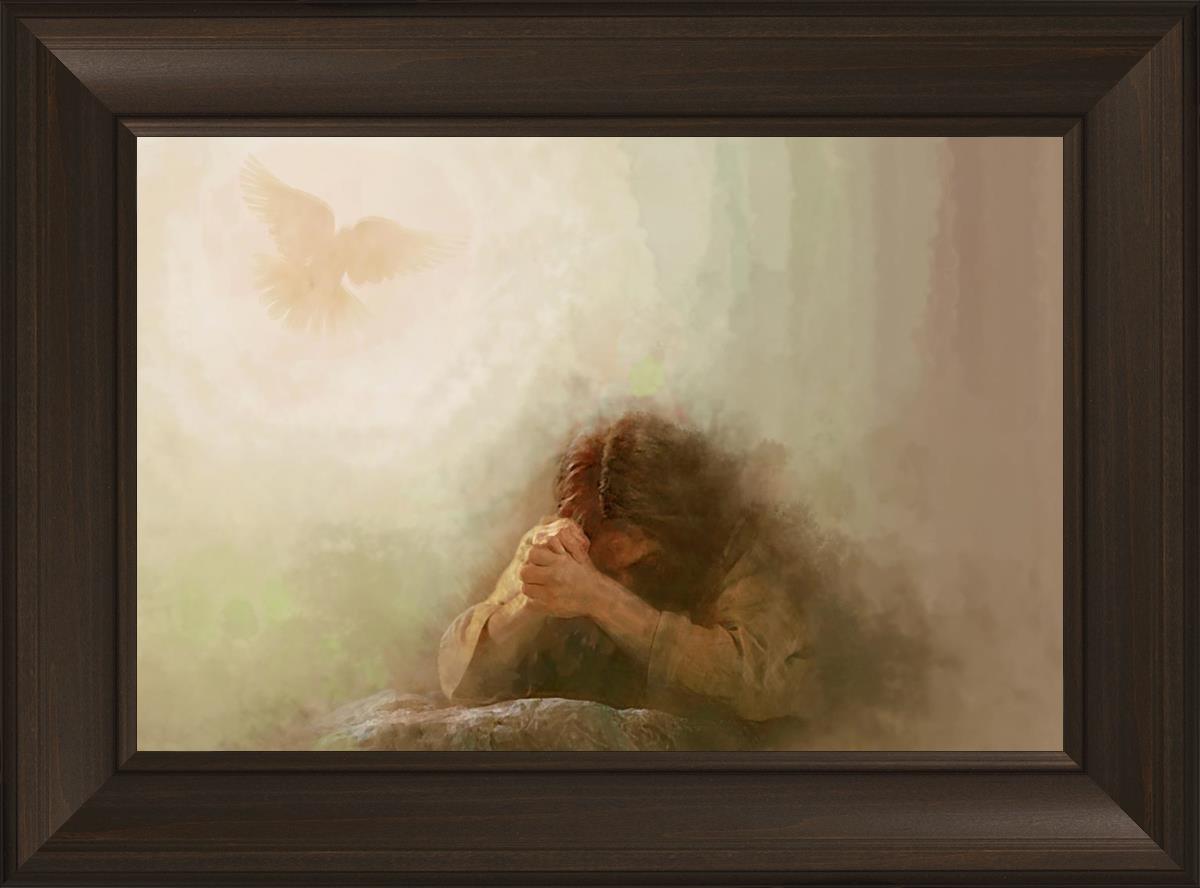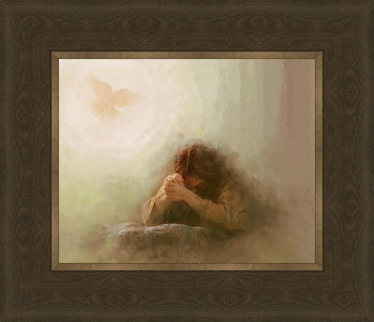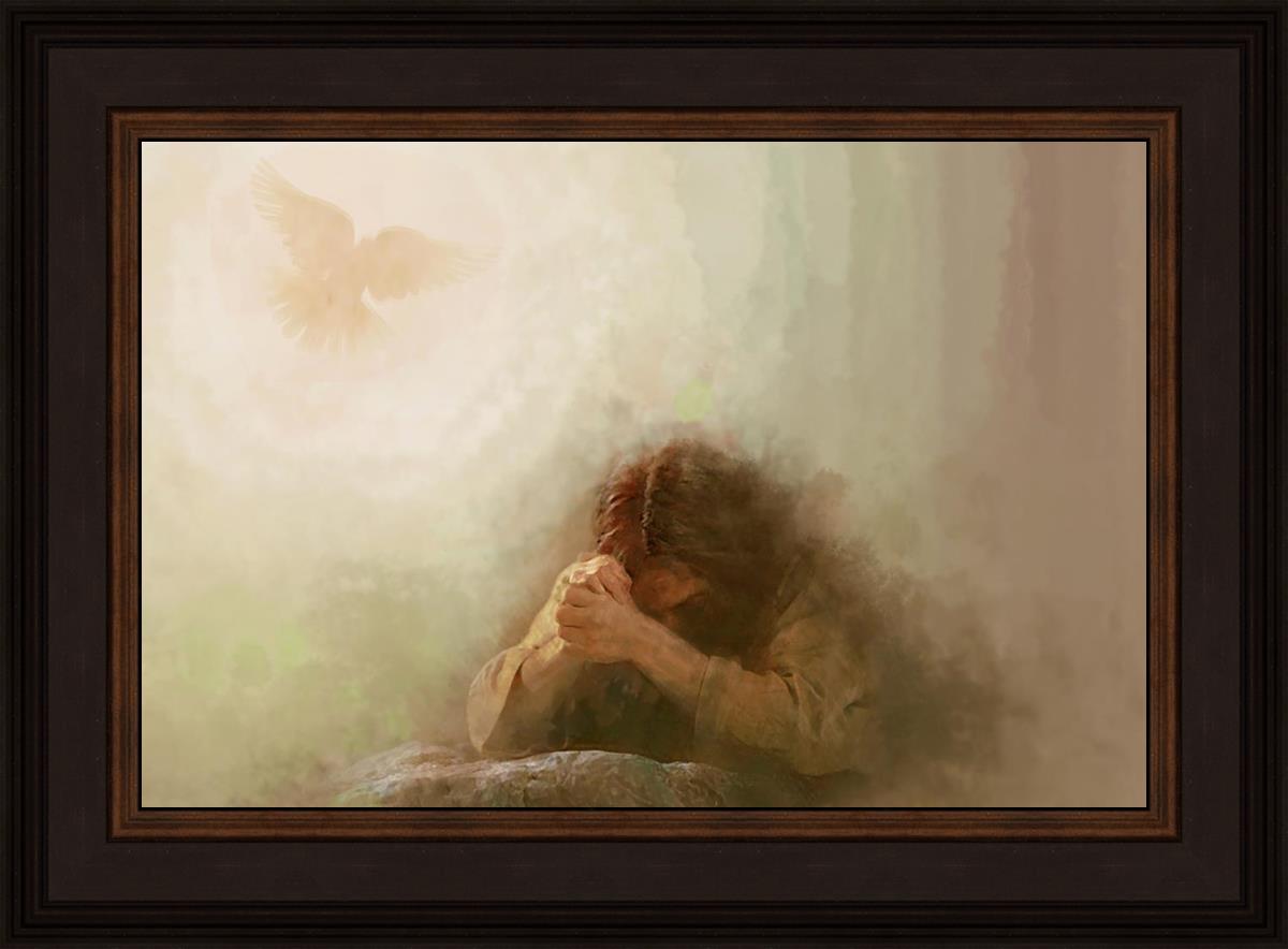 Lord of Prayer NEUTRAL by Yongsung Kim depicts Jesus christ praying on a rock with the Holy Ghost in the form of a dove descending from a bright light in the sky. This painting is available in print and canvas.