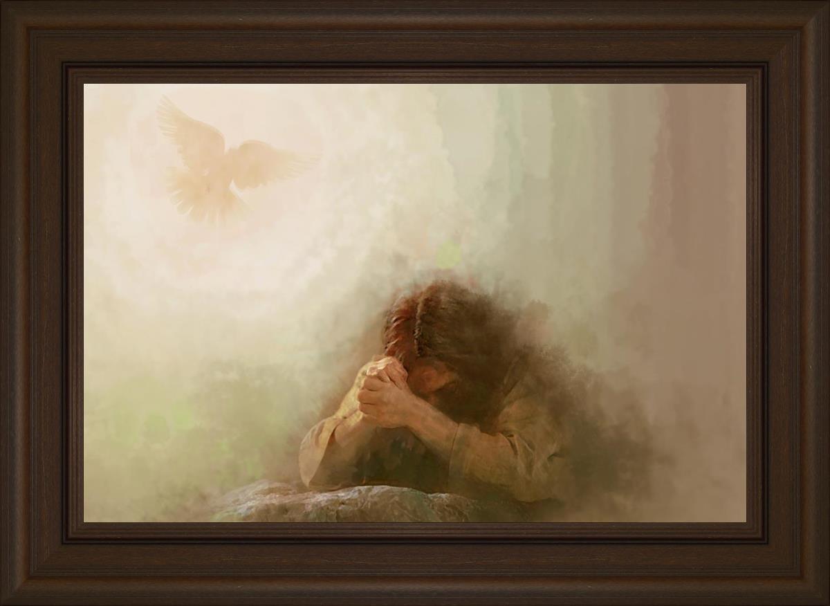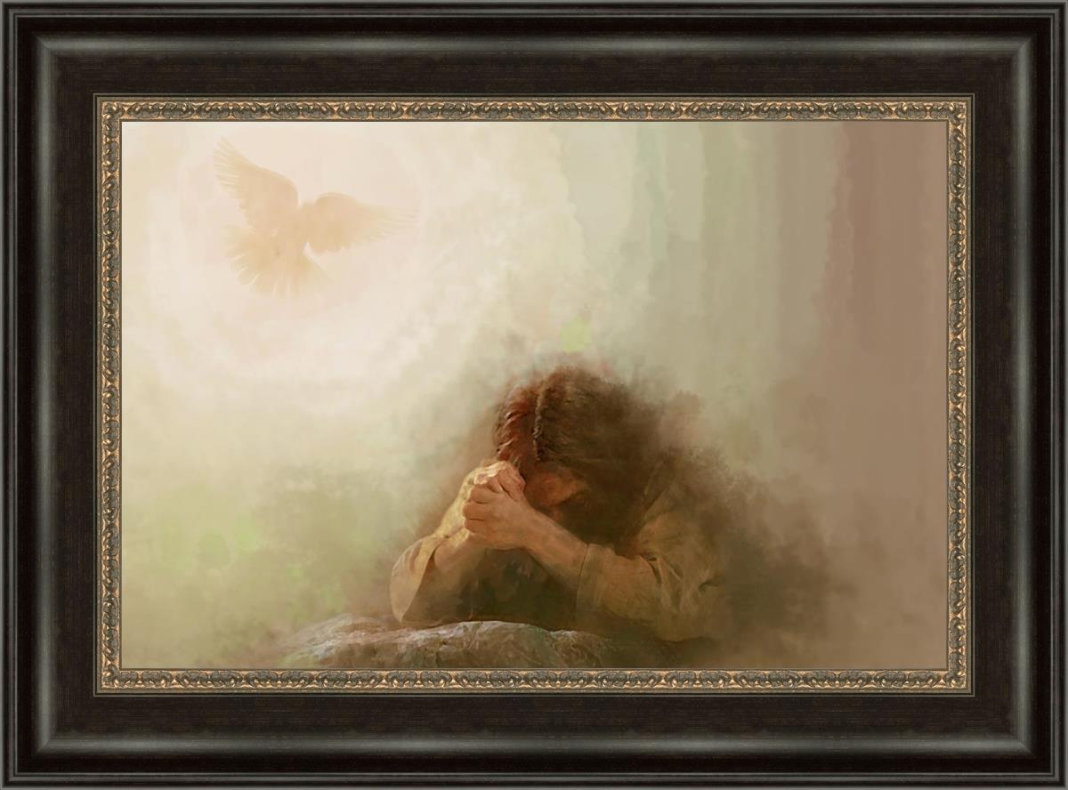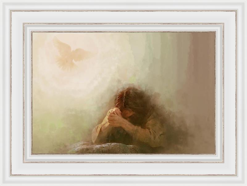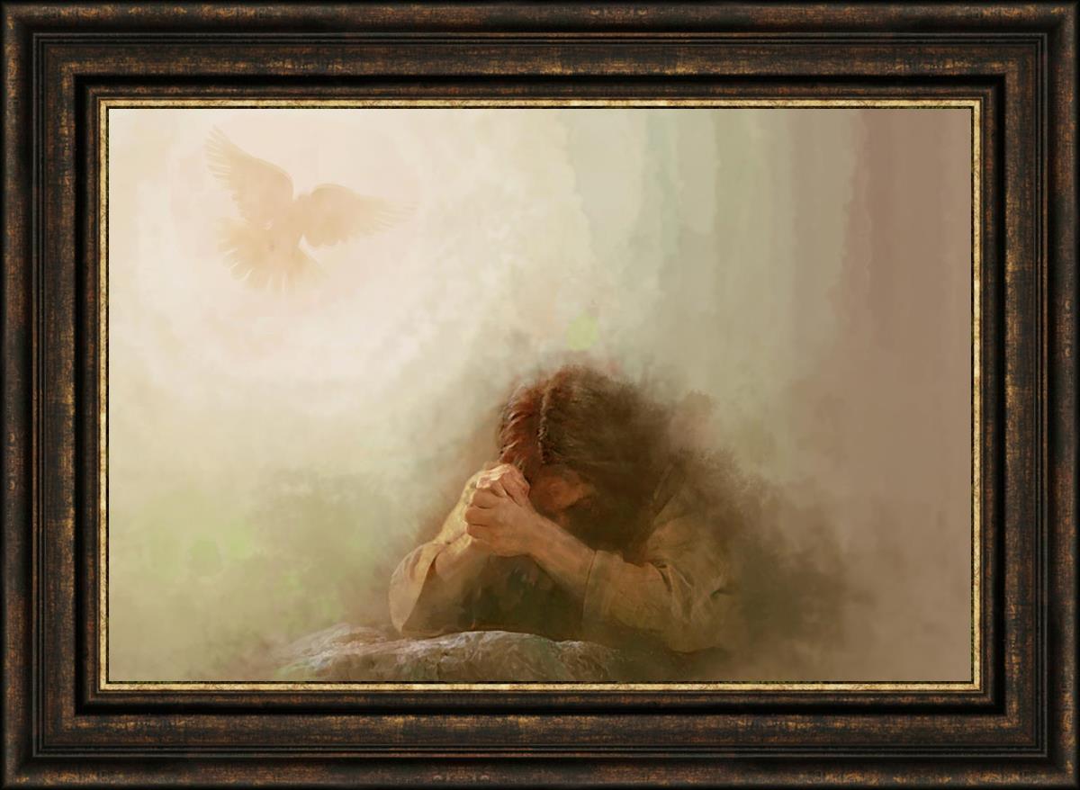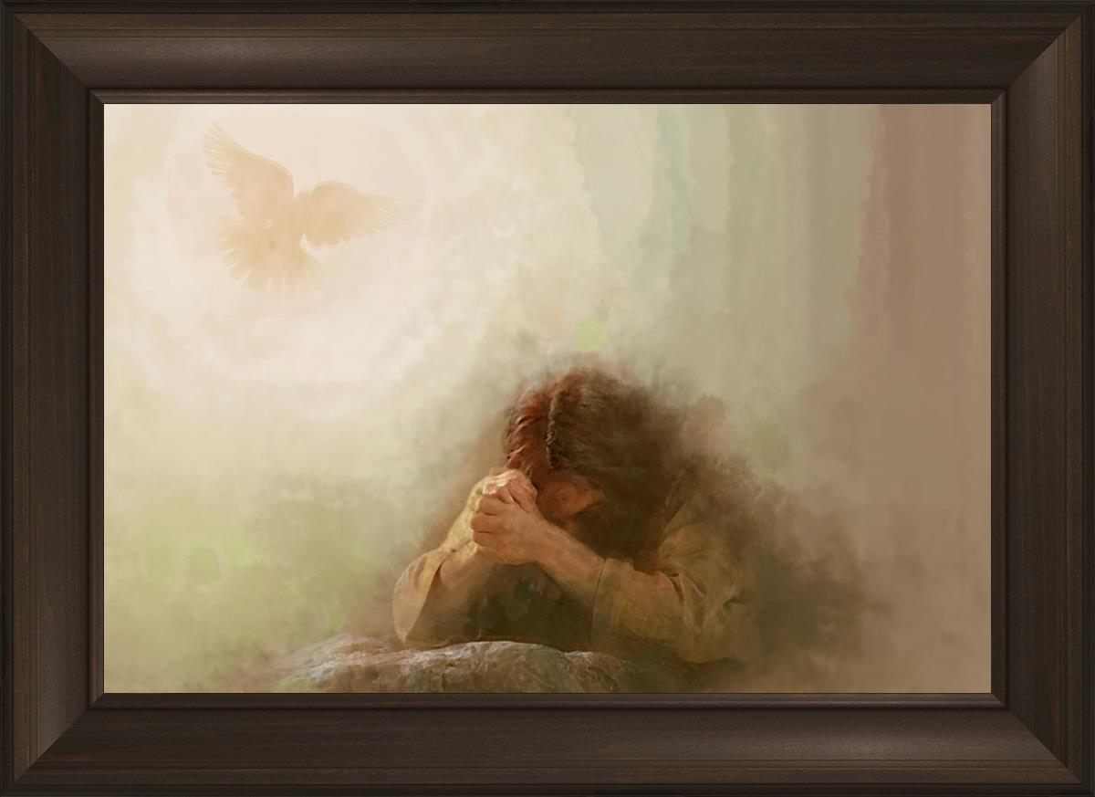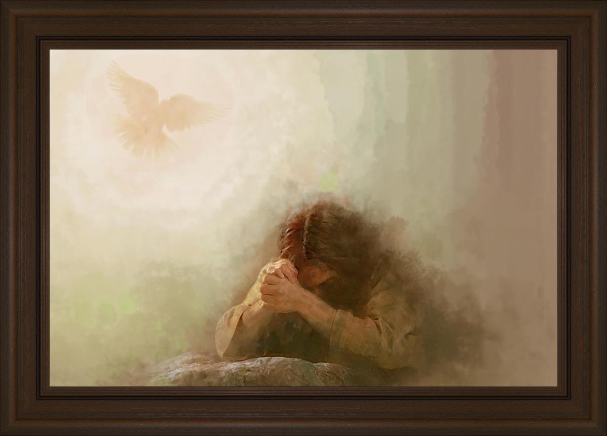 Lord of Prayer NEUTRAL by Yongsung Kim depicts Jesus christ praying on a rock with the Holy Ghost in the form of a dove descending from a bright light in the sky. This painting is available in print and canvas.