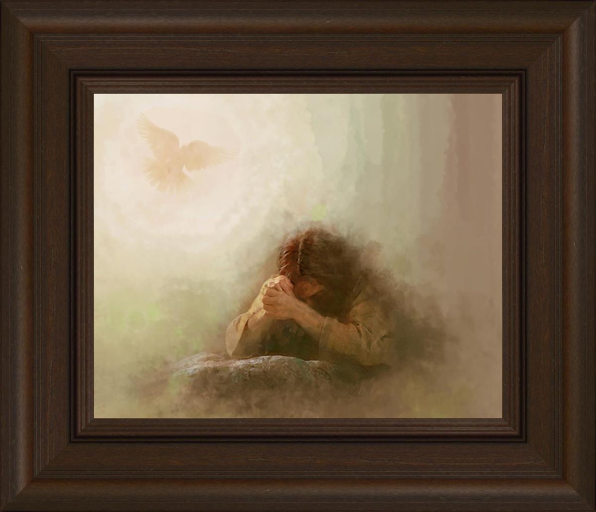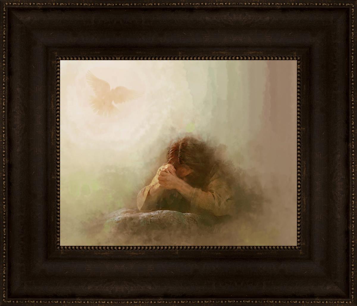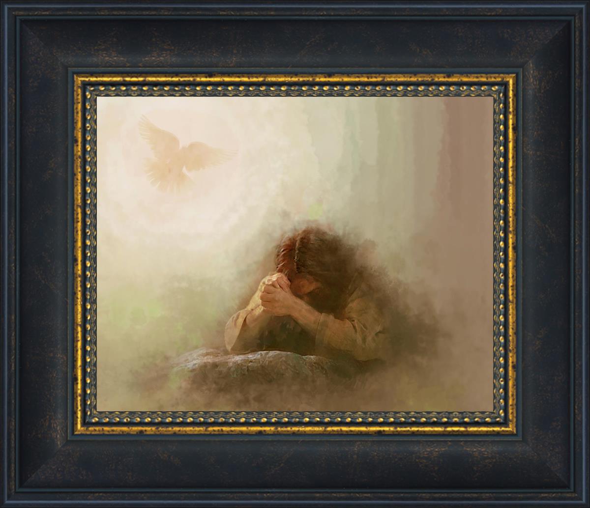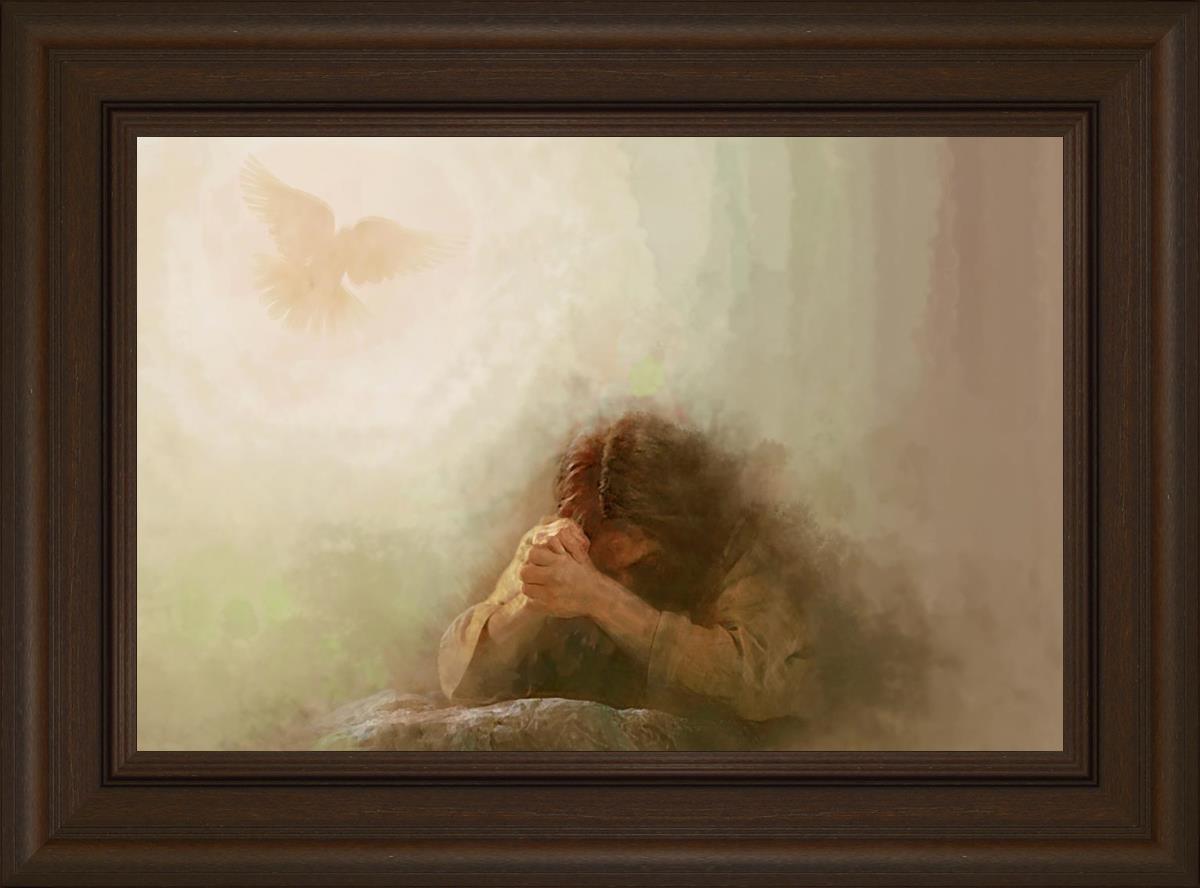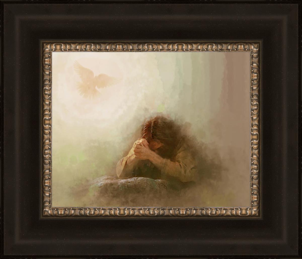Lord of Prayer NEUTRAL by Yongsung Kim depicts Jesus christ praying on a rock with the Holy Ghost in the form of a dove descending from a bright light in the sky. This painting is available in print and canvas.