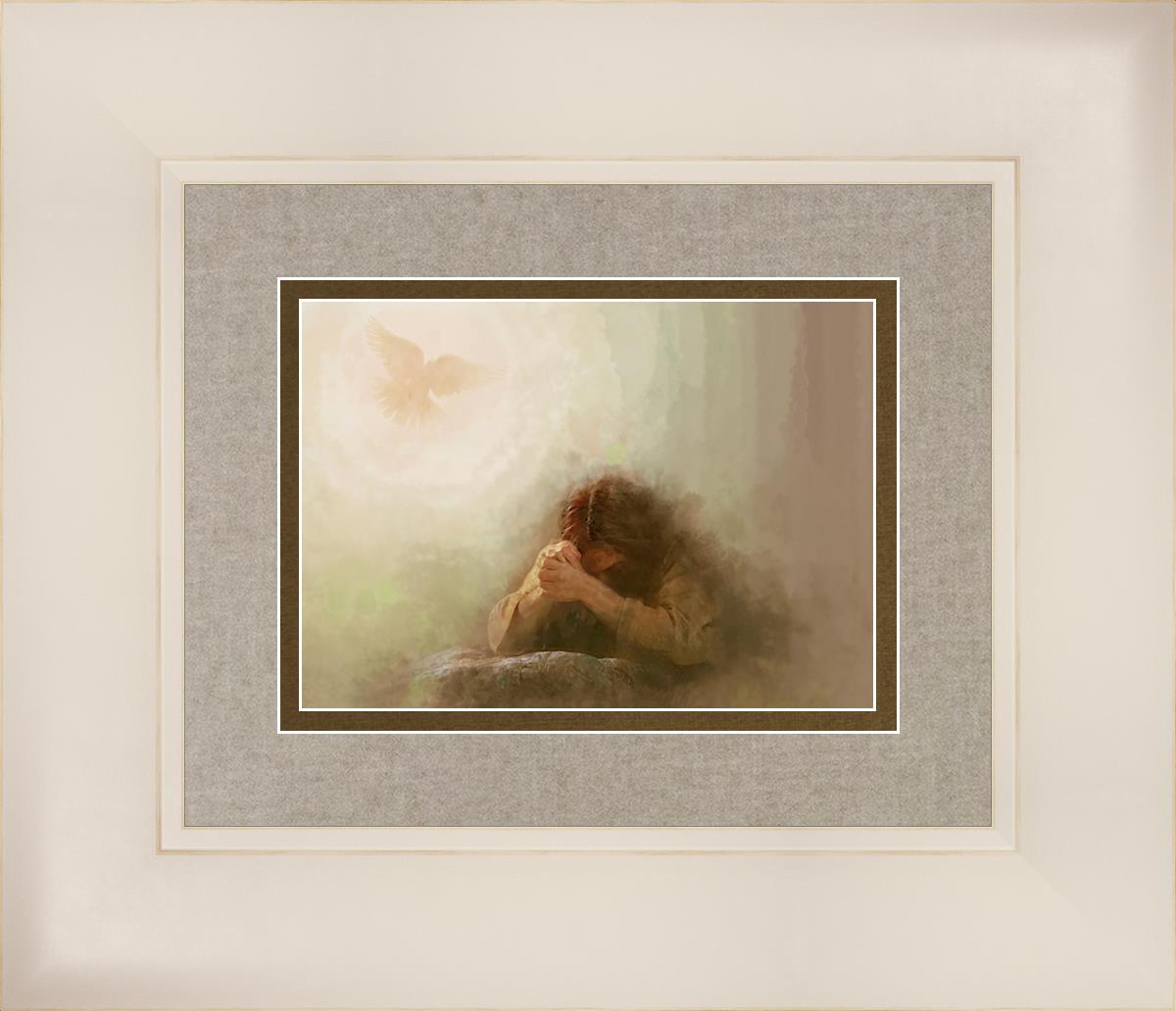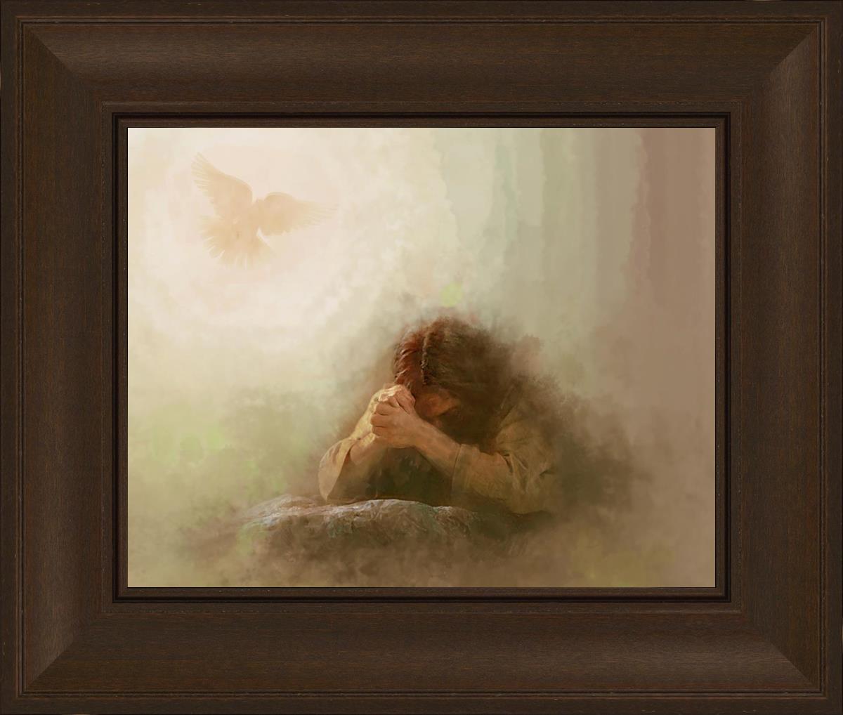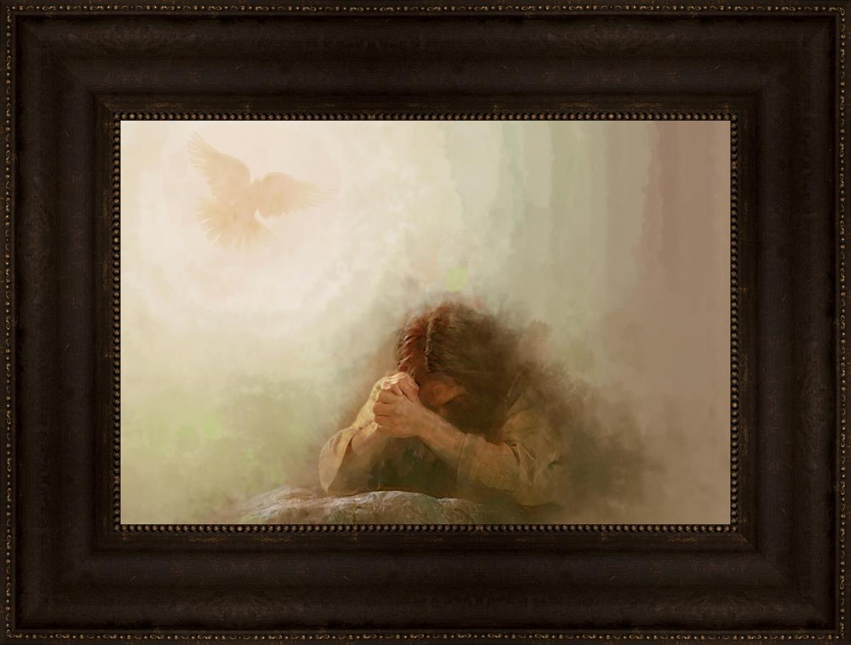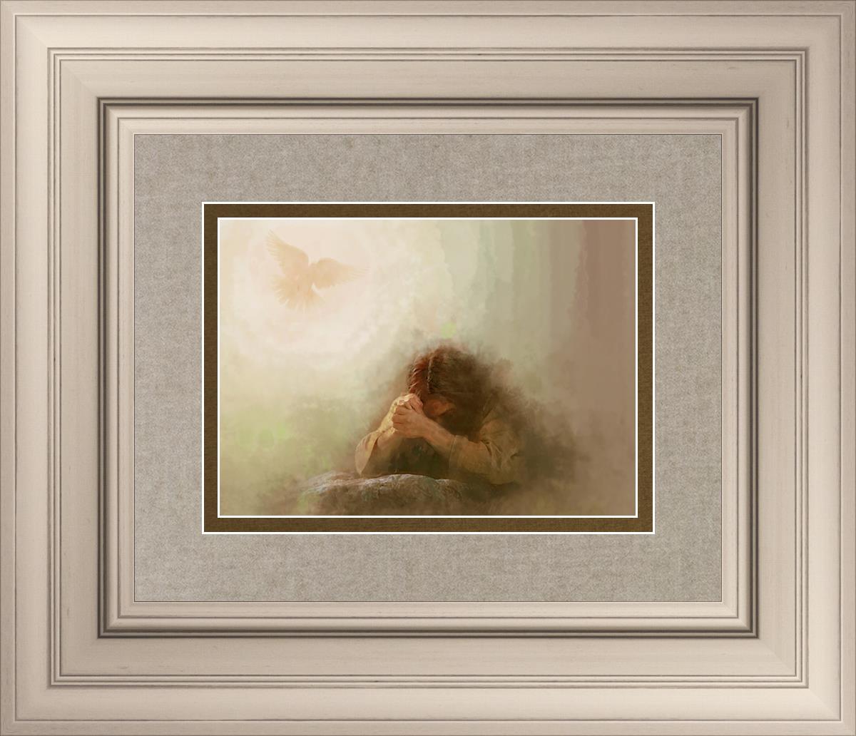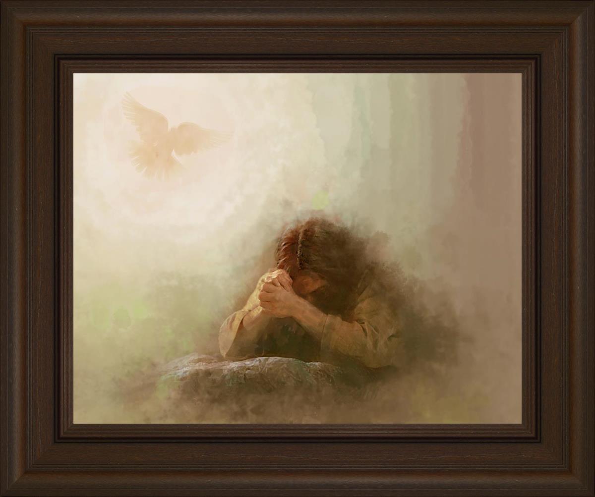Lord of Prayer NEUTRAL by Yongsung Kim depicts Jesus christ praying on a rock with the Holy Ghost in the form of a dove descending from a bright light in the sky. This painting is available in print and canvas.