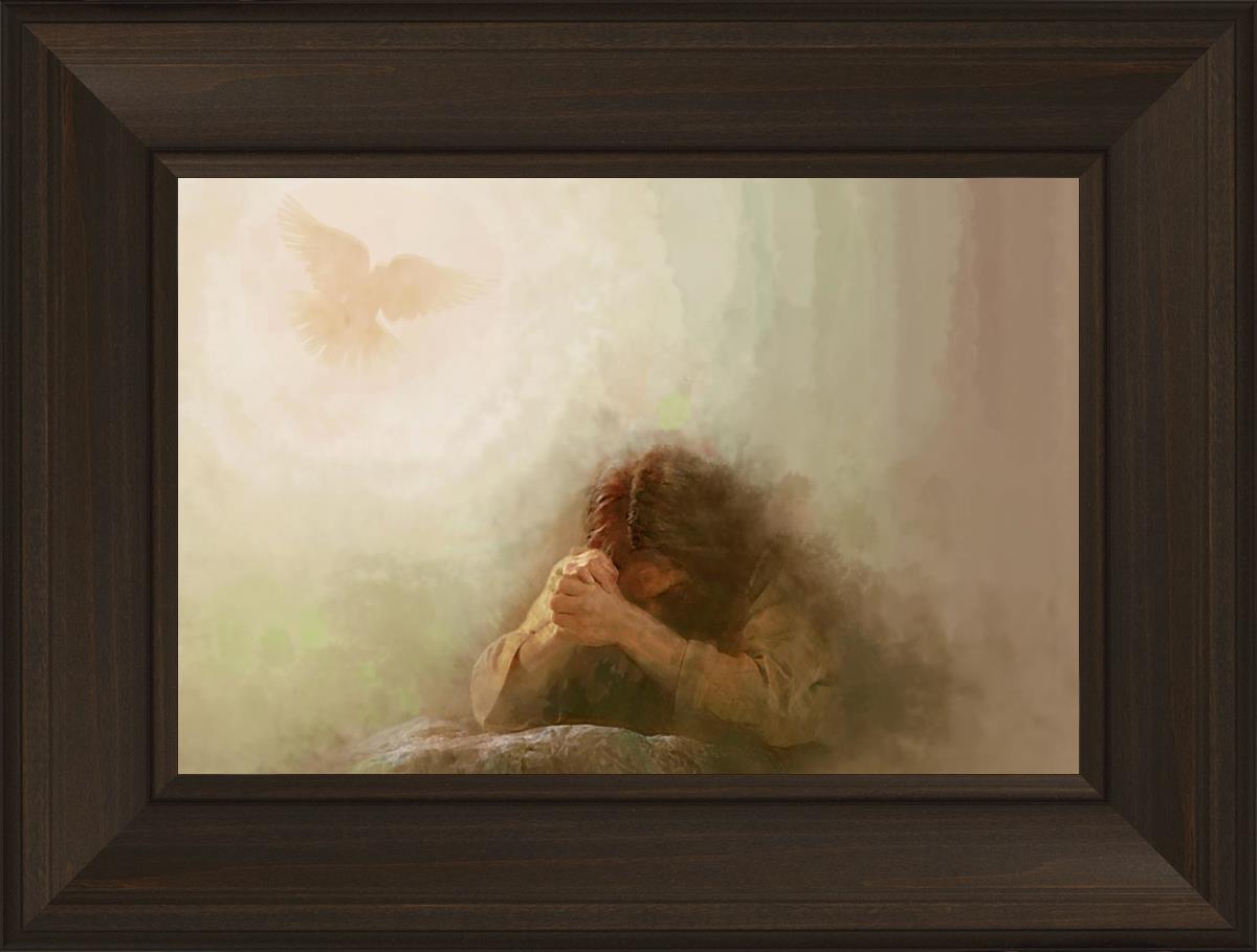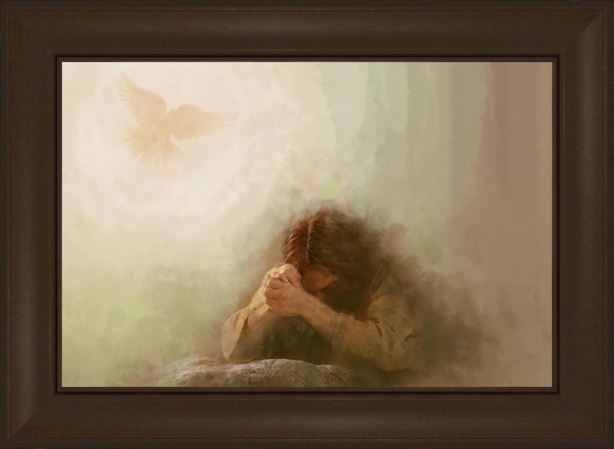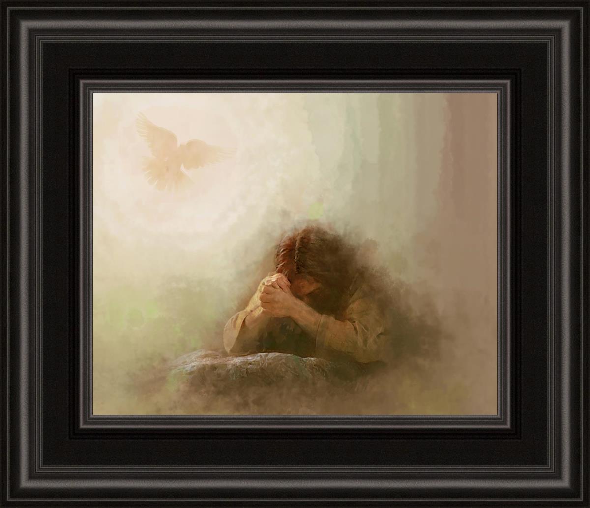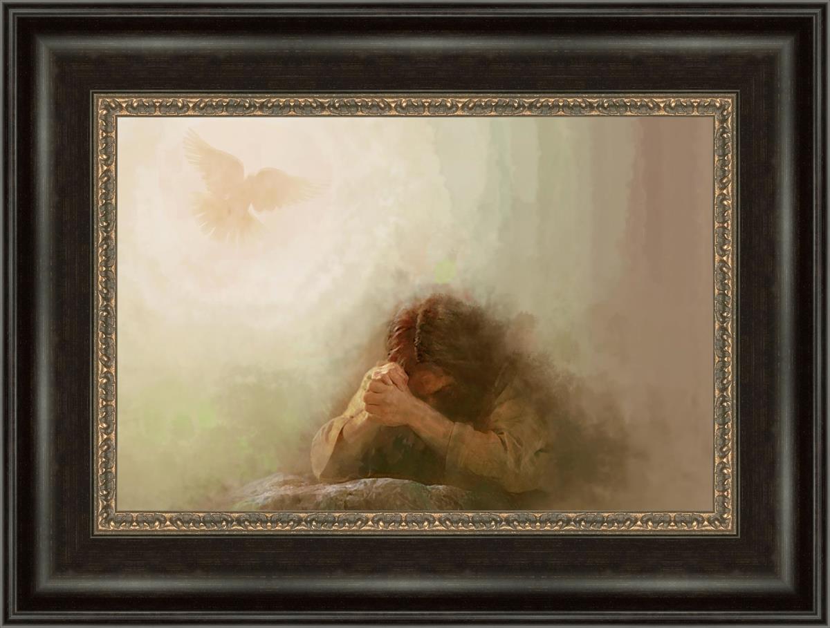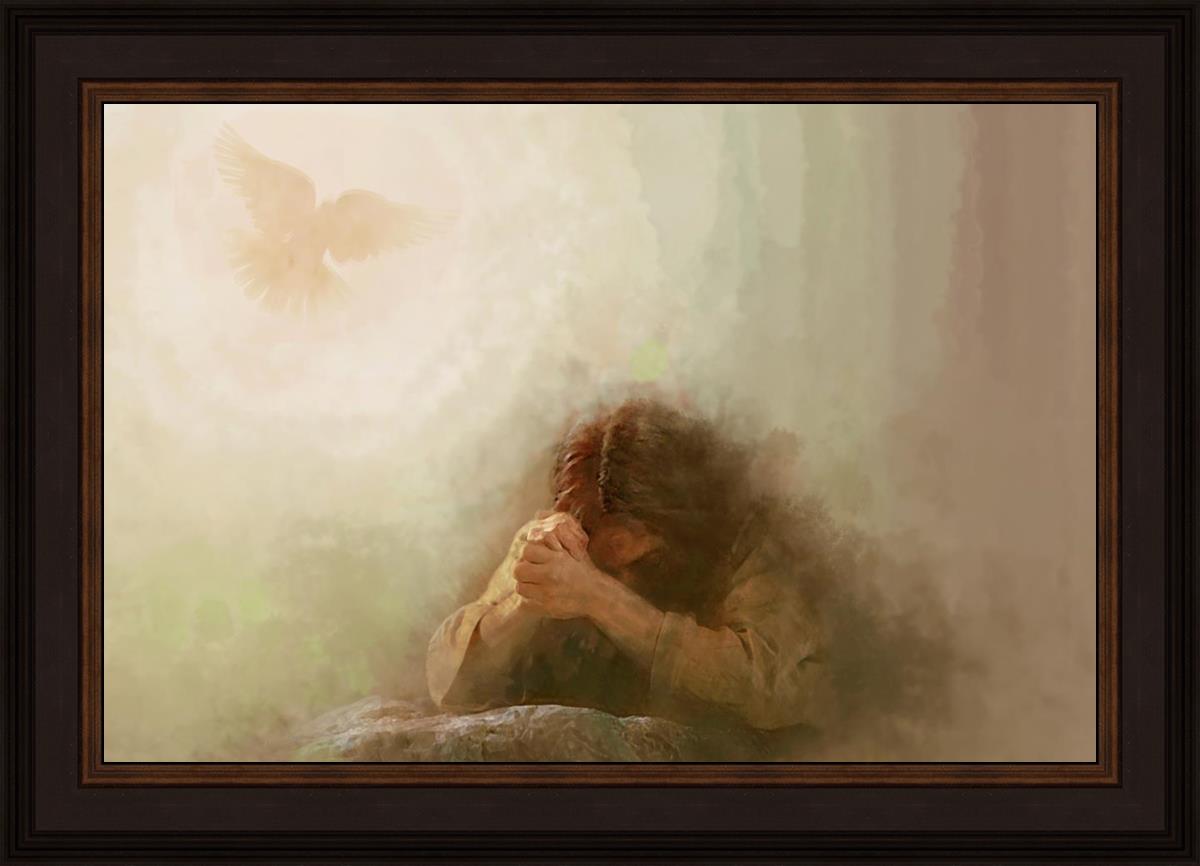 Lord of Prayer NEUTRAL by Yongsung Kim depicts Jesus christ praying on a rock with the Holy Ghost in the form of a dove descending from a bright light in the sky. This painting is available in print and canvas.