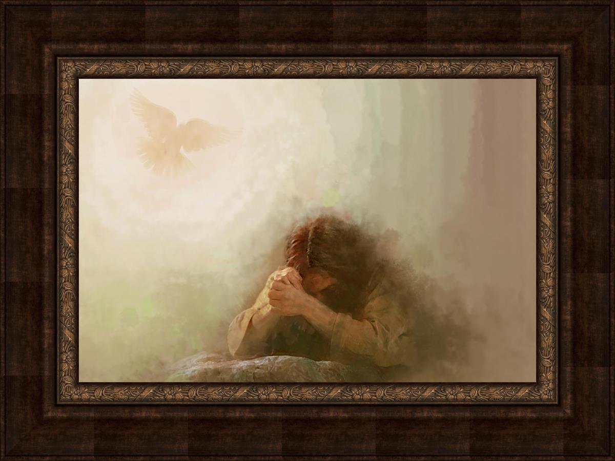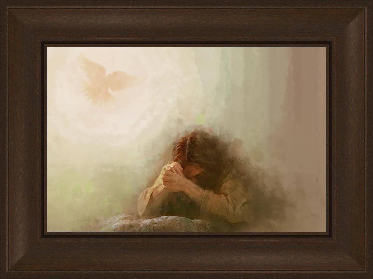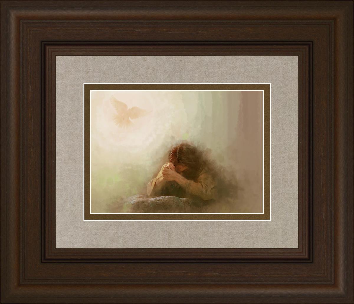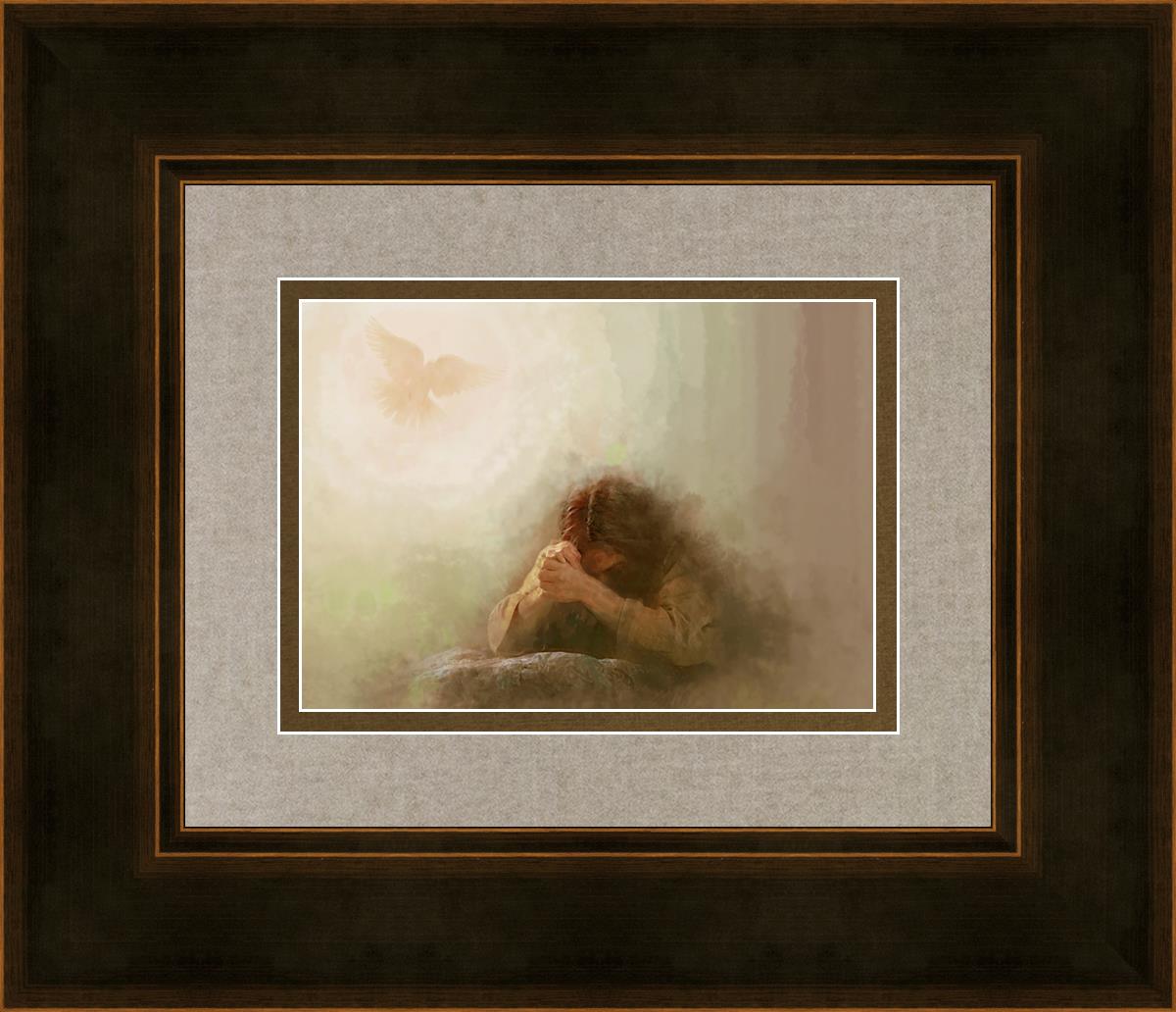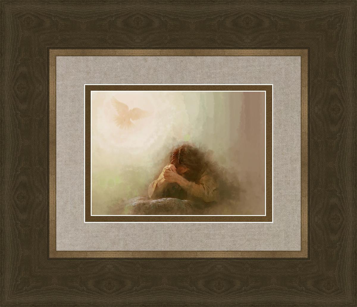Lord of Prayer NEUTRAL by Yongsung Kim depicts Jesus christ praying on a rock with the Holy Ghost in the form of a dove descending from a bright light in the sky. This painting is available in print and canvas.