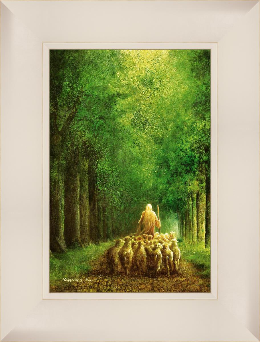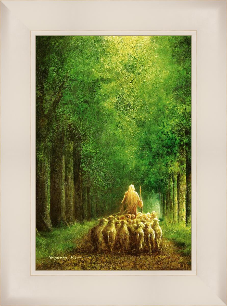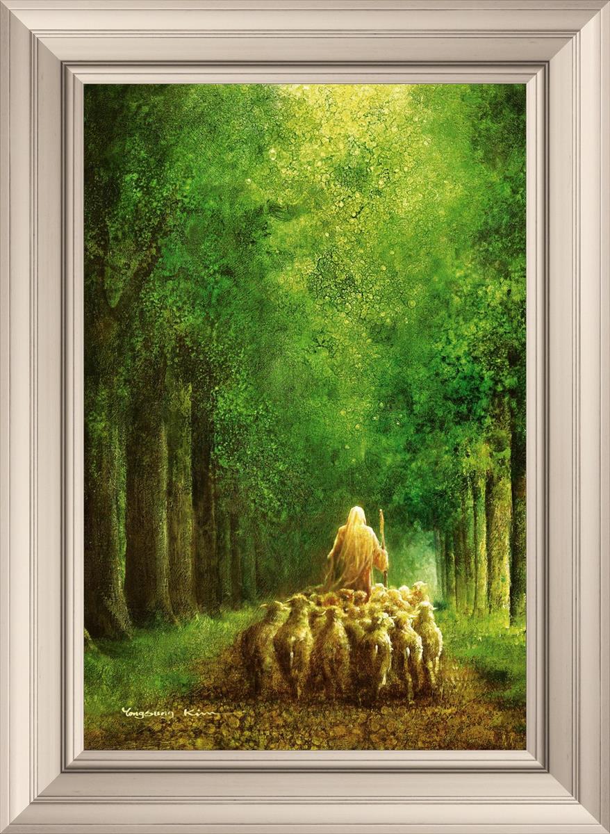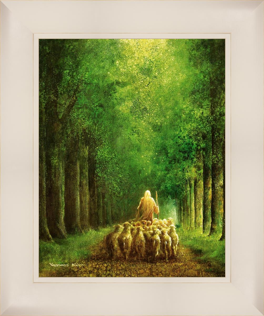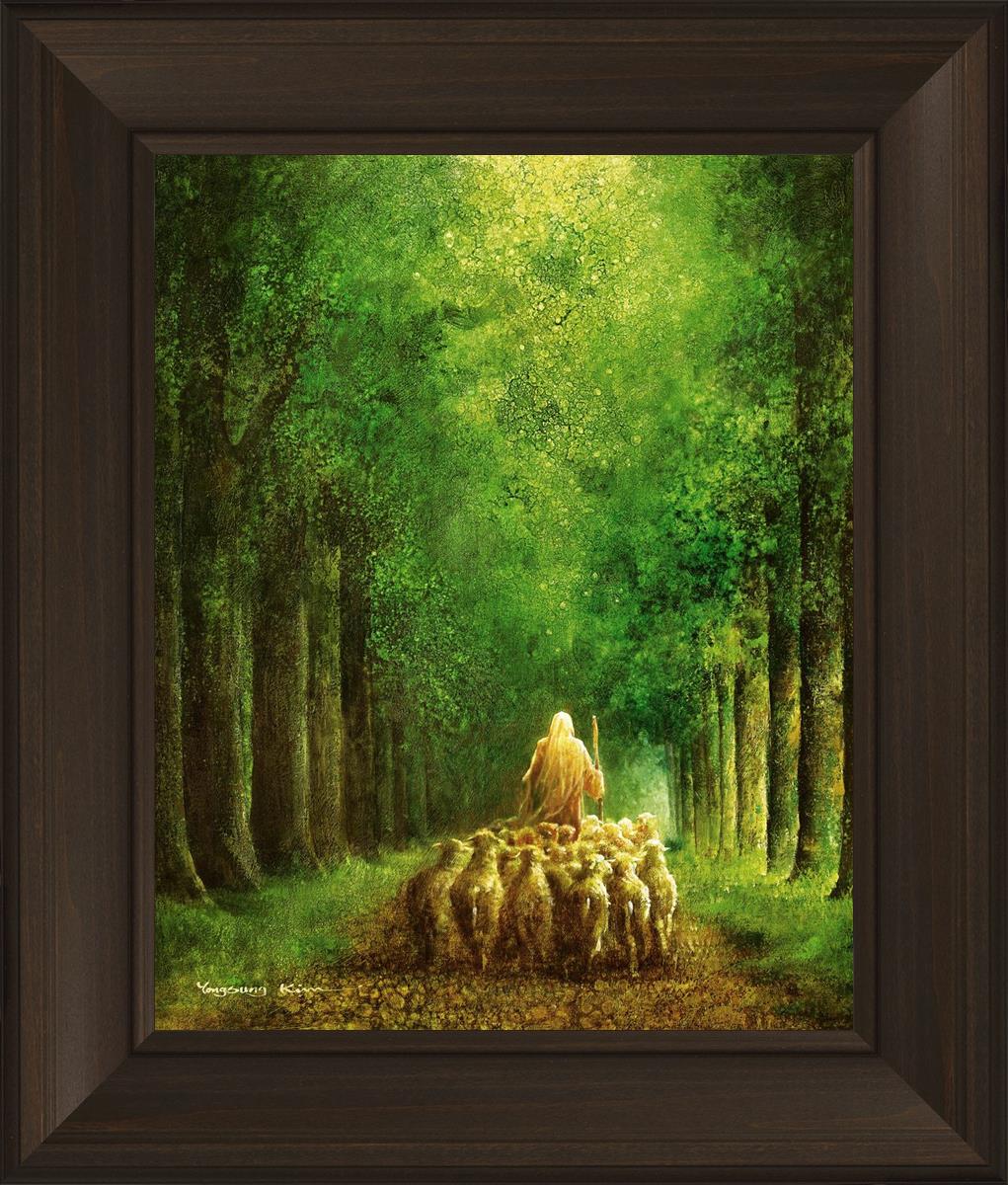 Narrow is the Way by Yongsung Kim depicts Jesus leading a flock of sheep down a dirt road through tall green trees on either side. This painting is available in print and canvas.