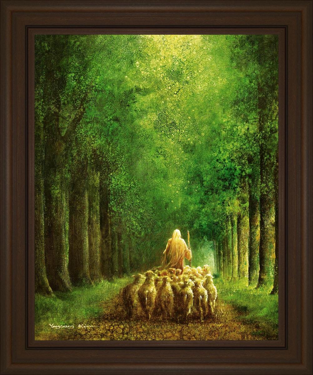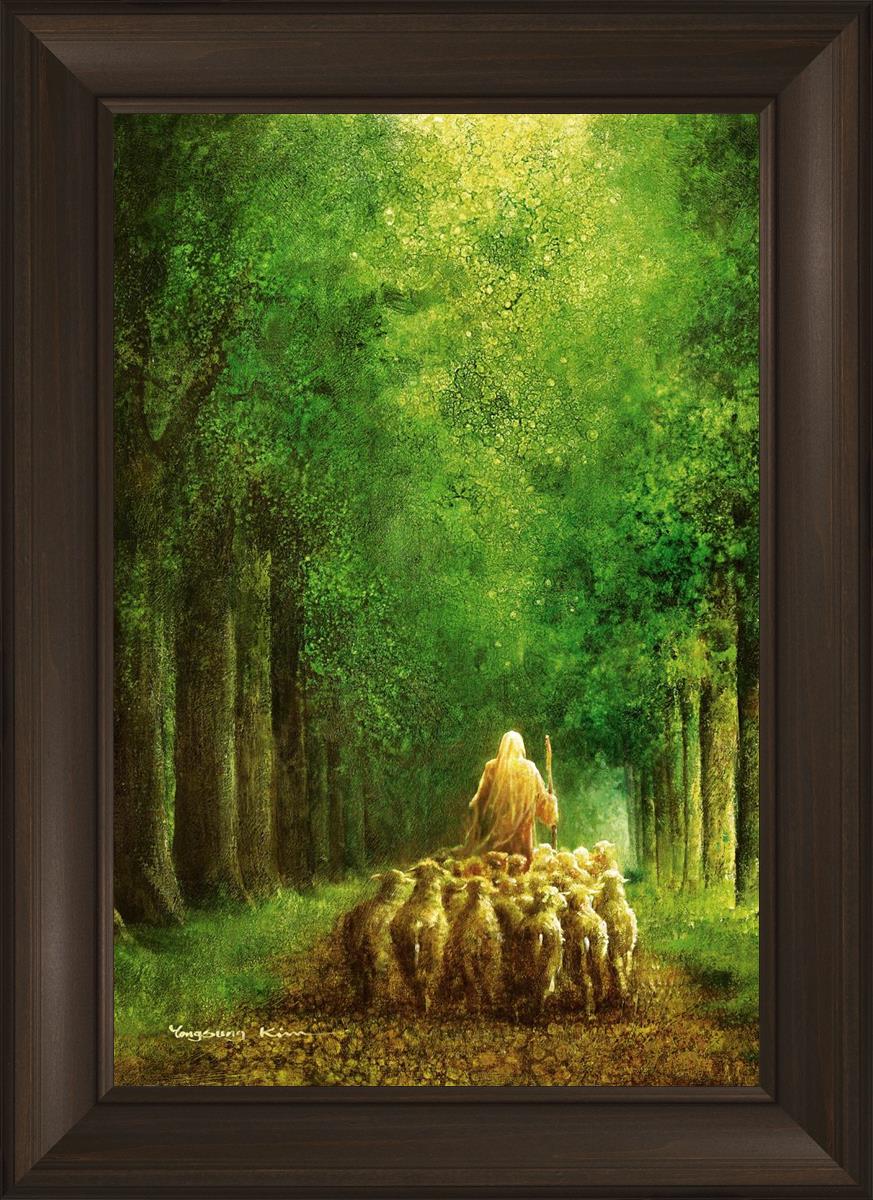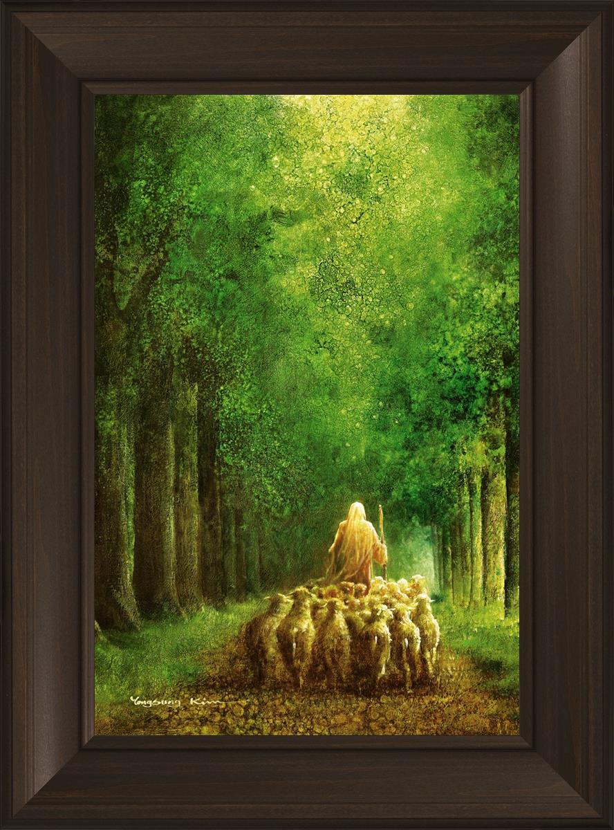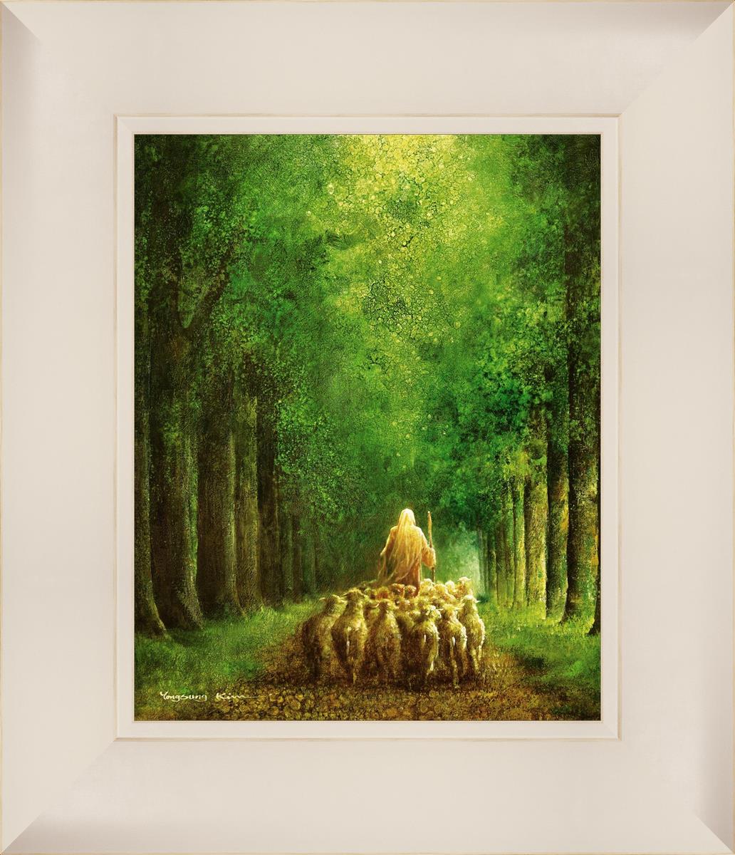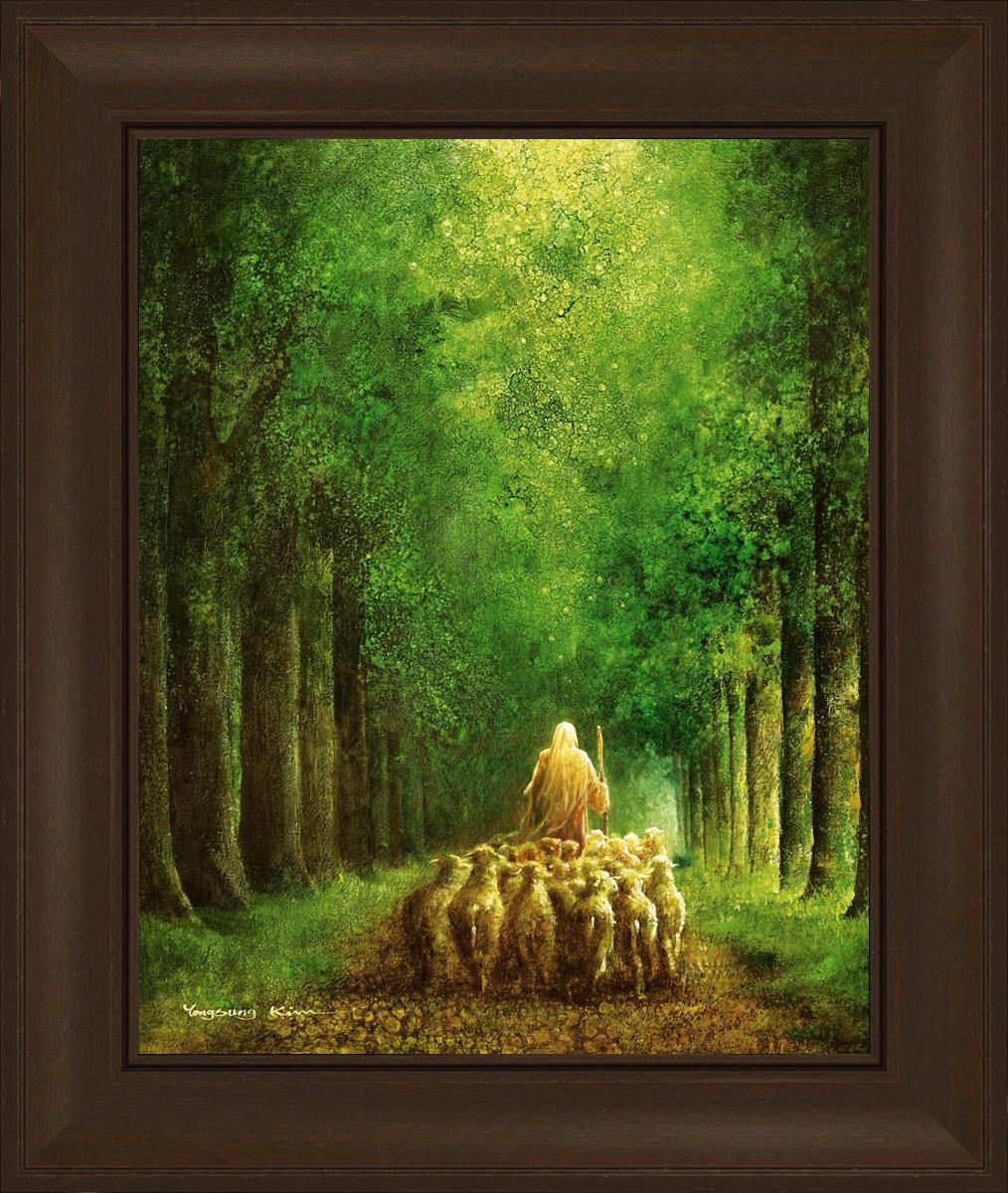 Narrow is the Way by Yongsung Kim depicts Jesus leading a flock of sheep down a dirt road through tall green trees on either side. This painting is available in print and canvas.