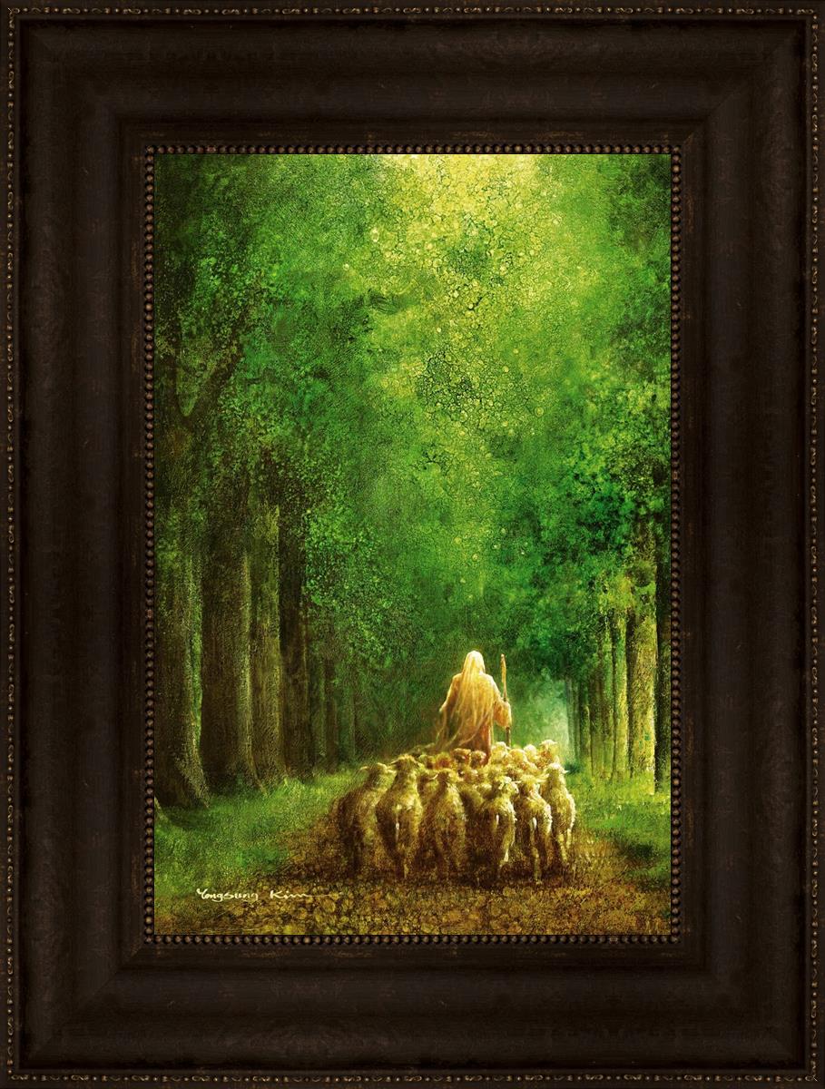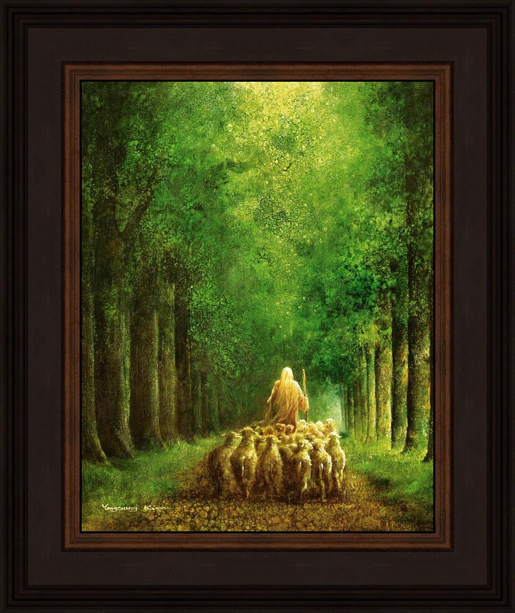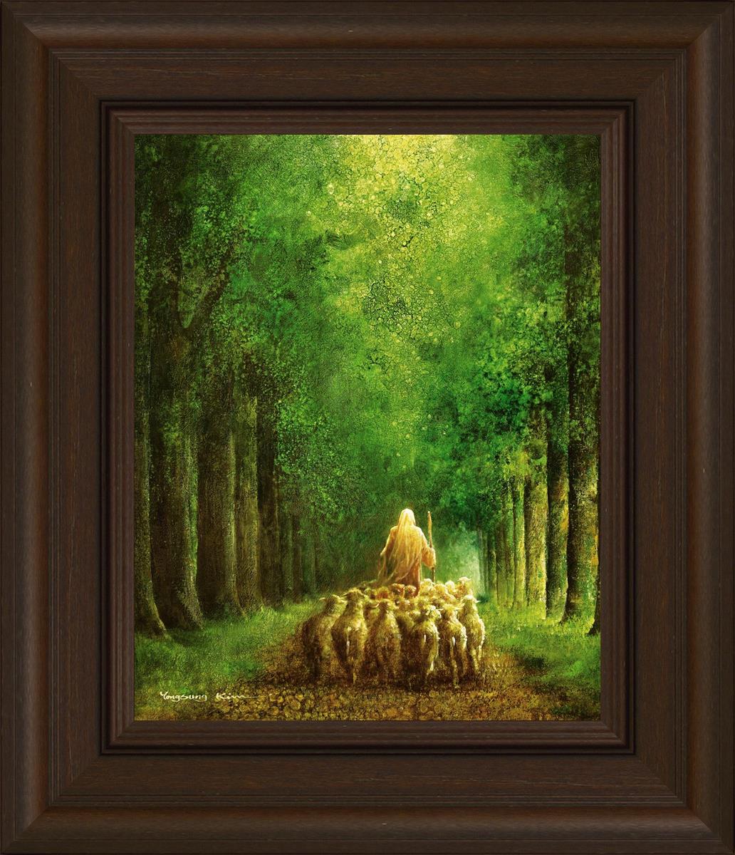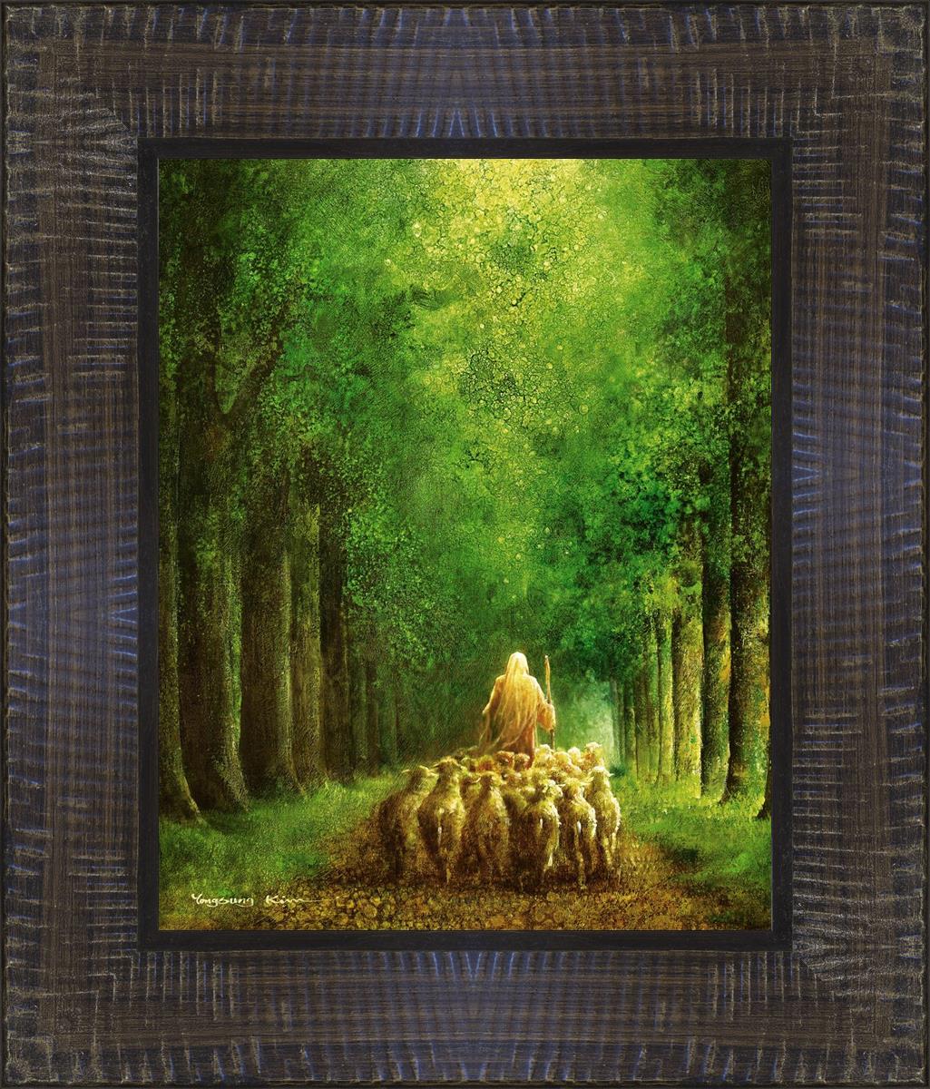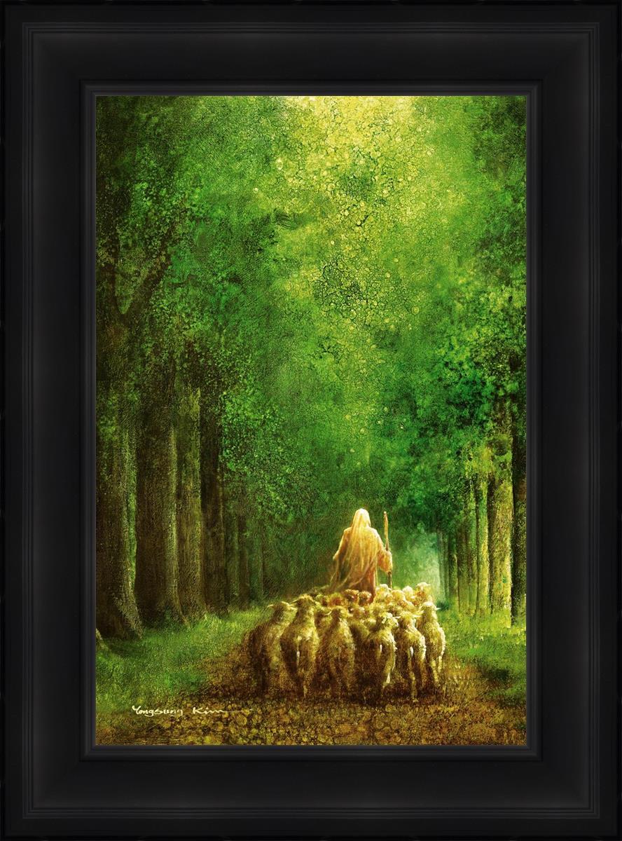 Narrow is the Way by Yongsung Kim depicts Jesus leading a flock of sheep down a dirt road through tall green trees on either side. This painting is available in print and canvas.