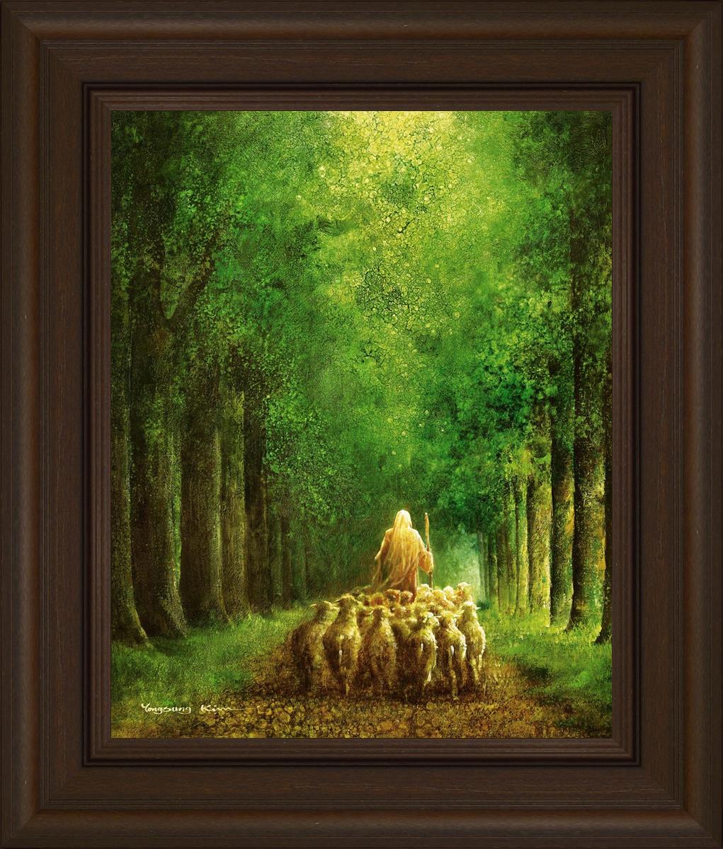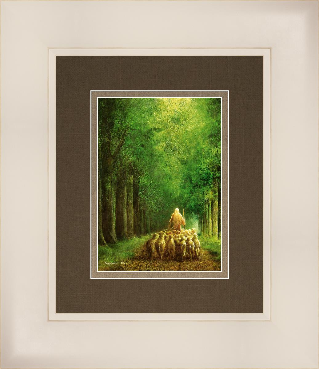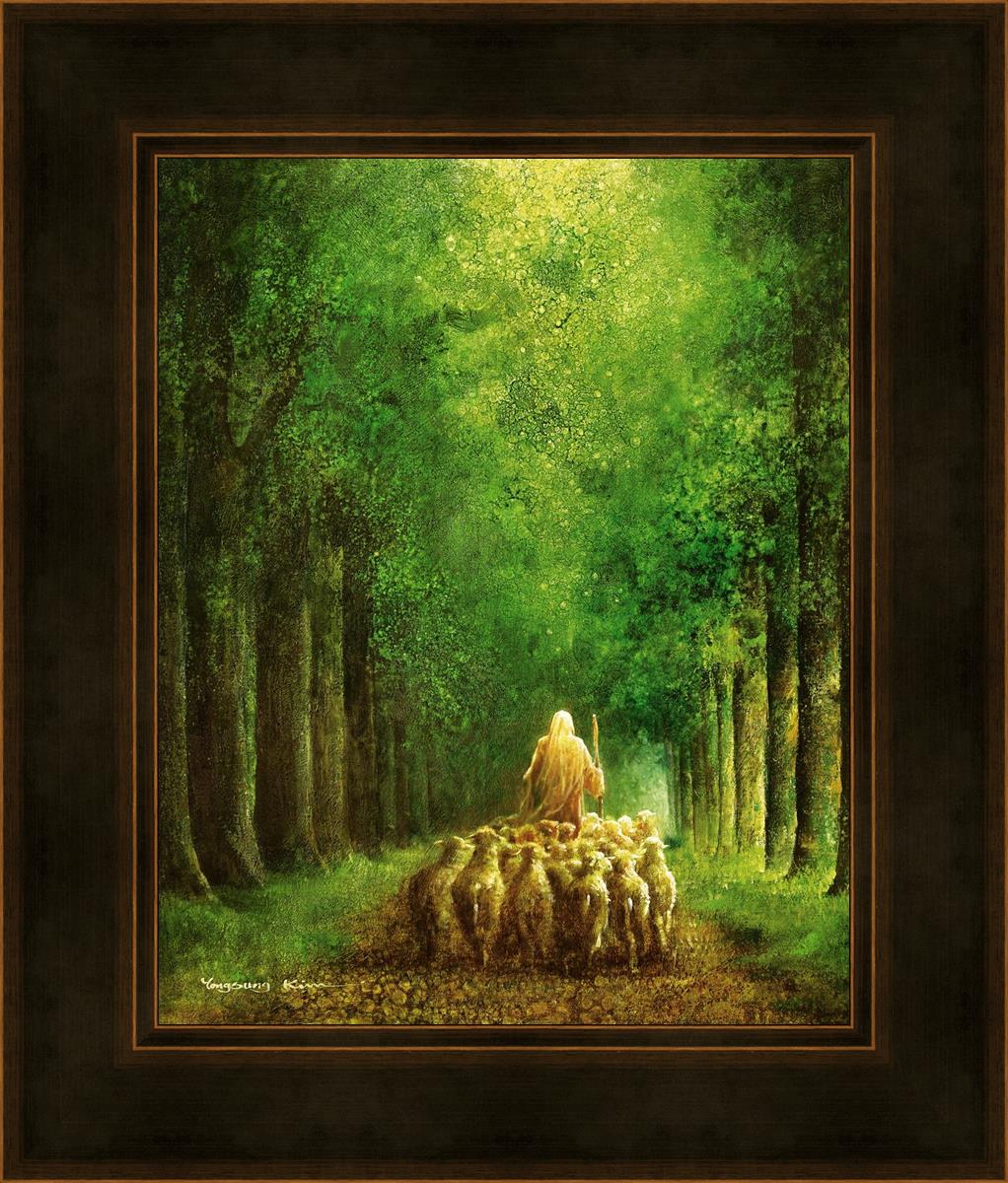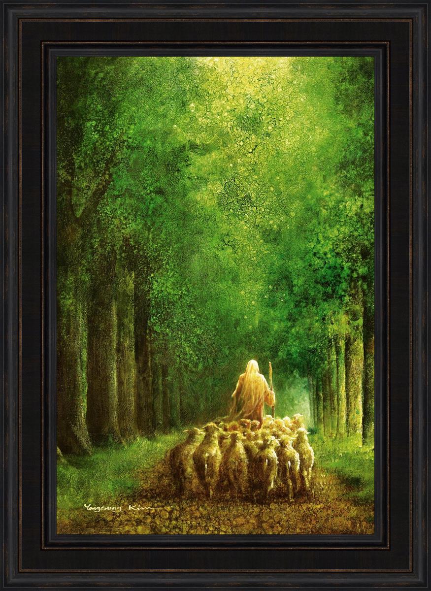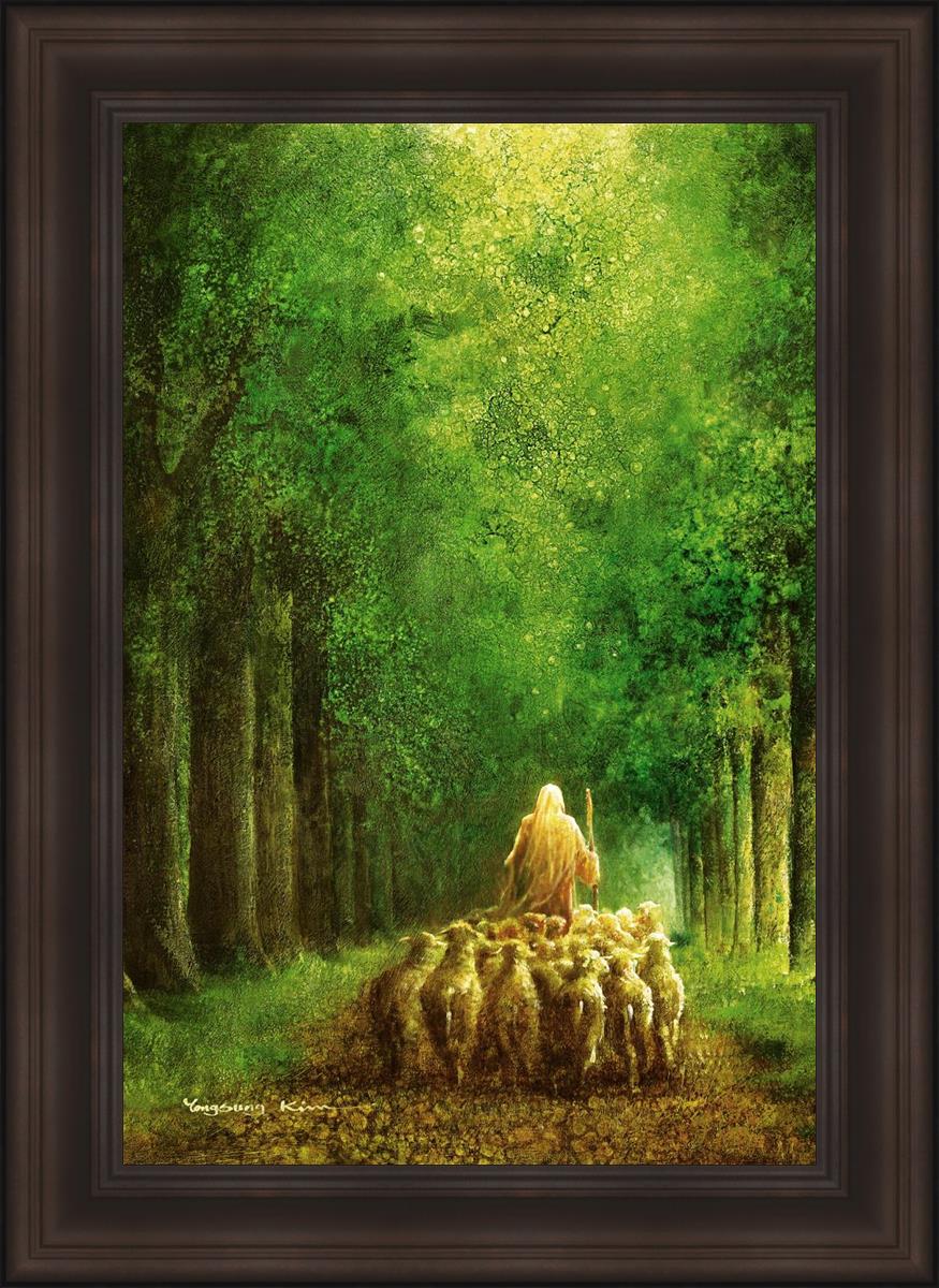Narrow is the Way by Yongsung Kim depicts Jesus leading a flock of sheep down a dirt road through tall green trees on either side. This painting is available in print and canvas.