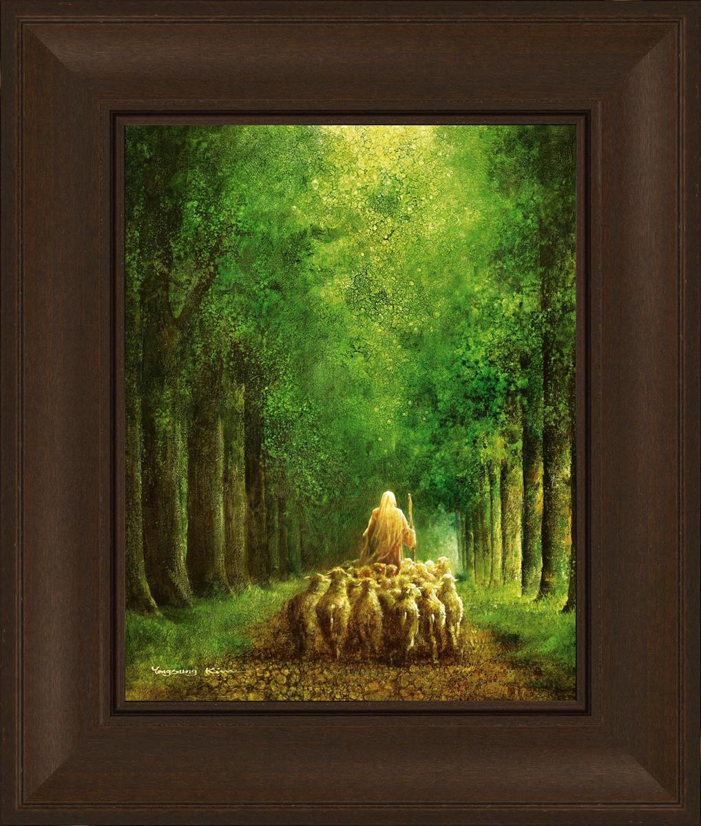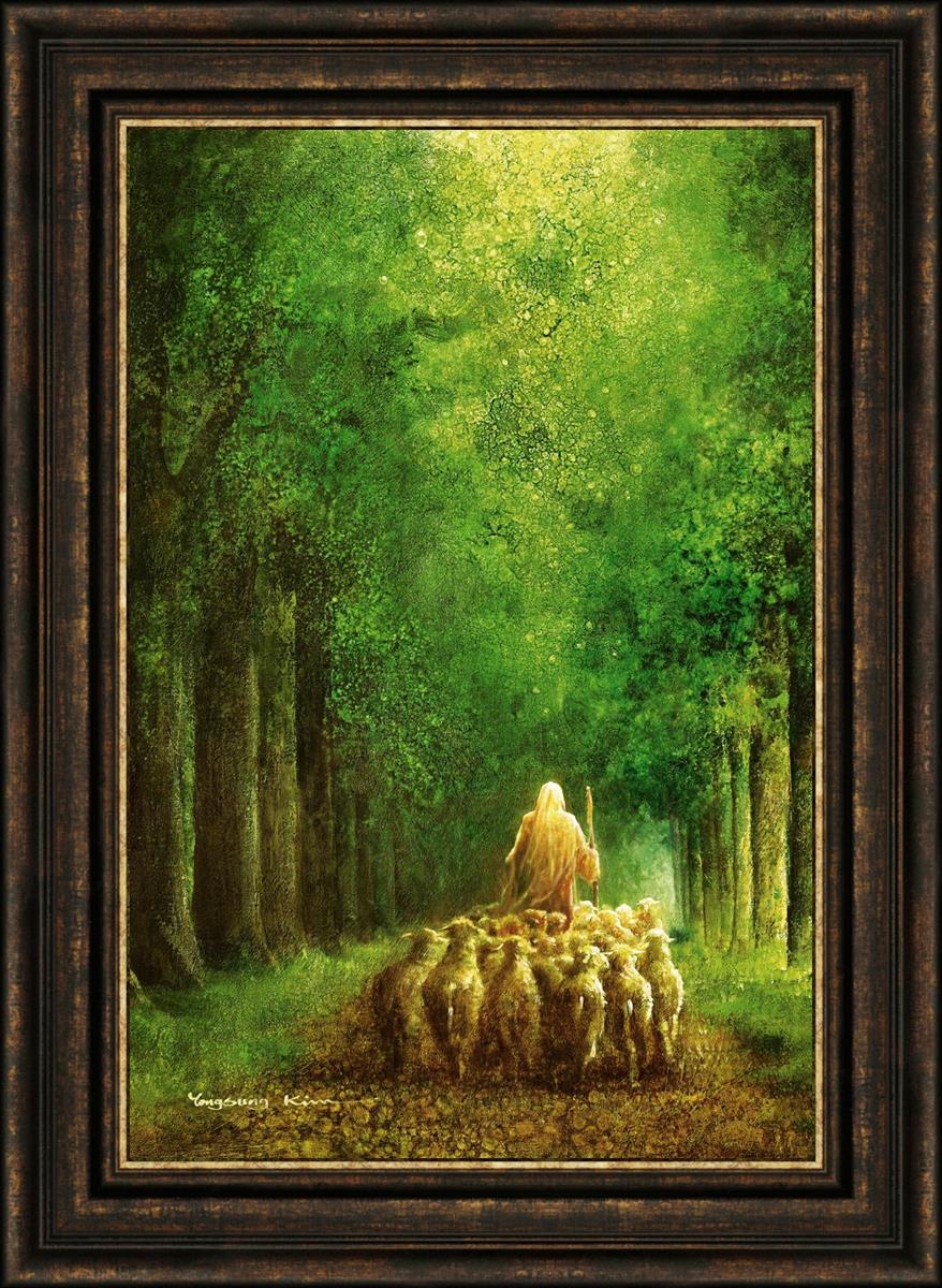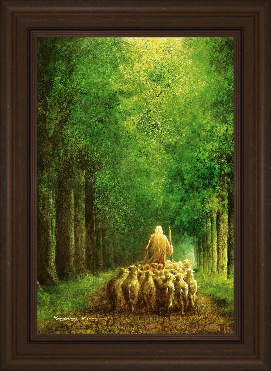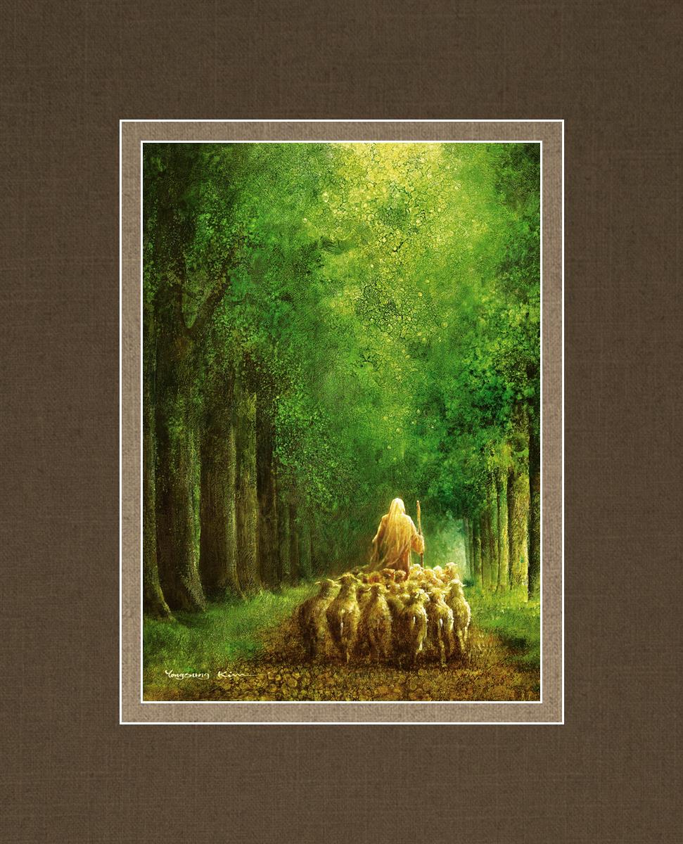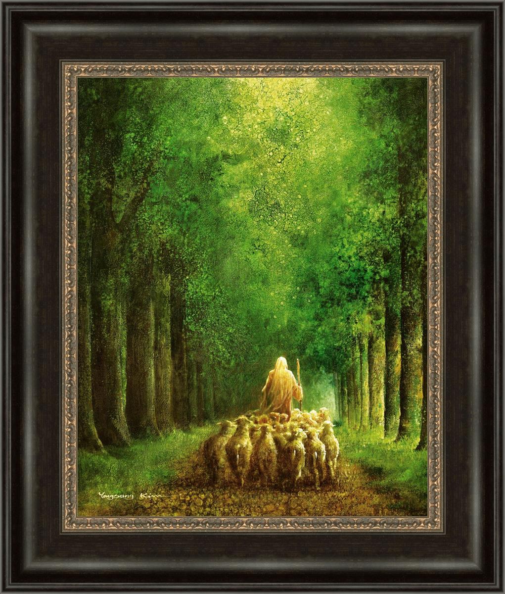 Narrow is the Way by Yongsung Kim depicts Jesus leading a flock of sheep down a dirt road through tall green trees on either side. This painting is available in print and canvas.