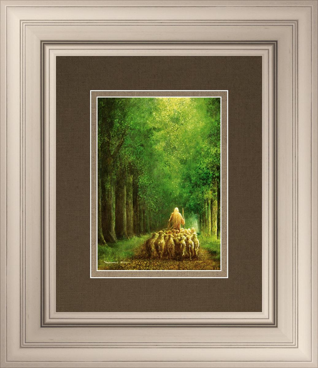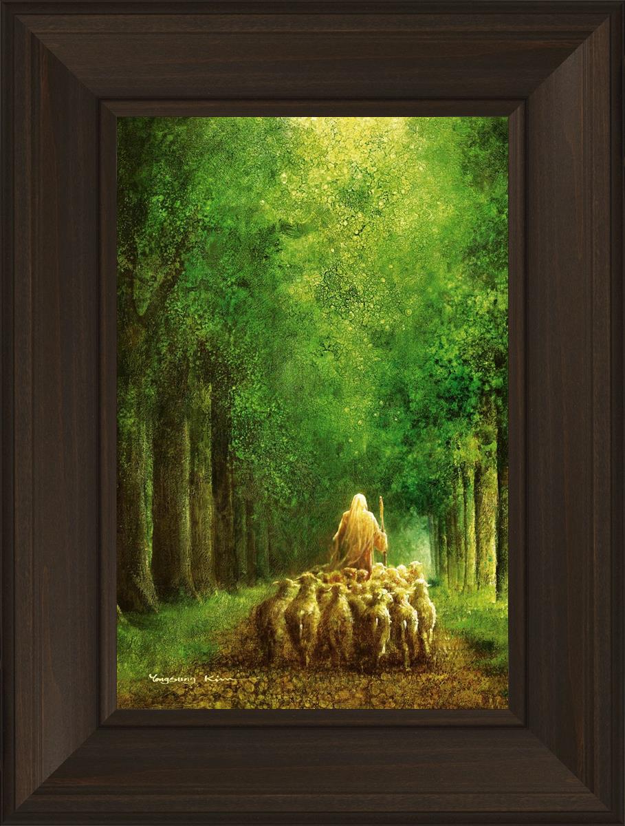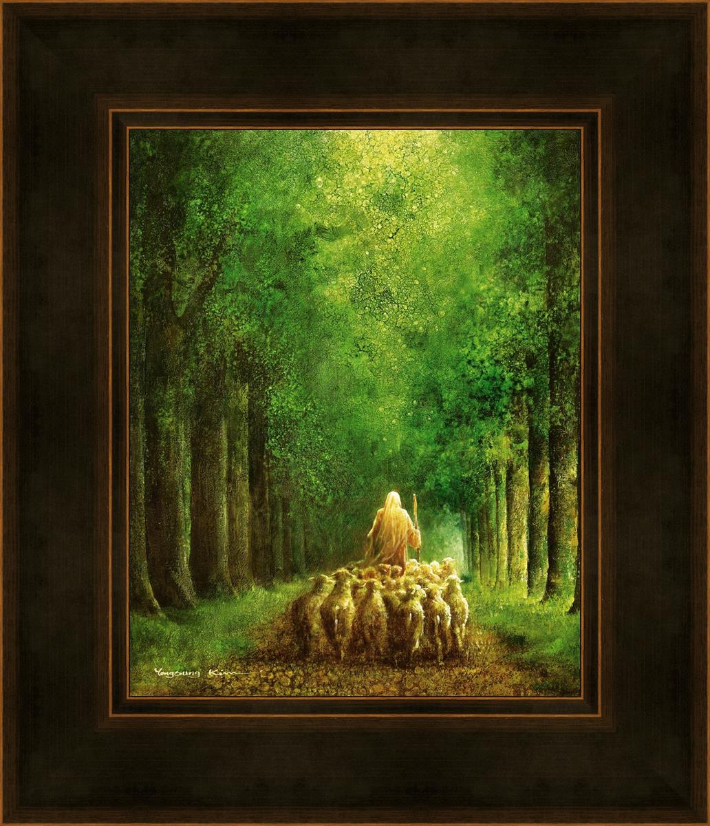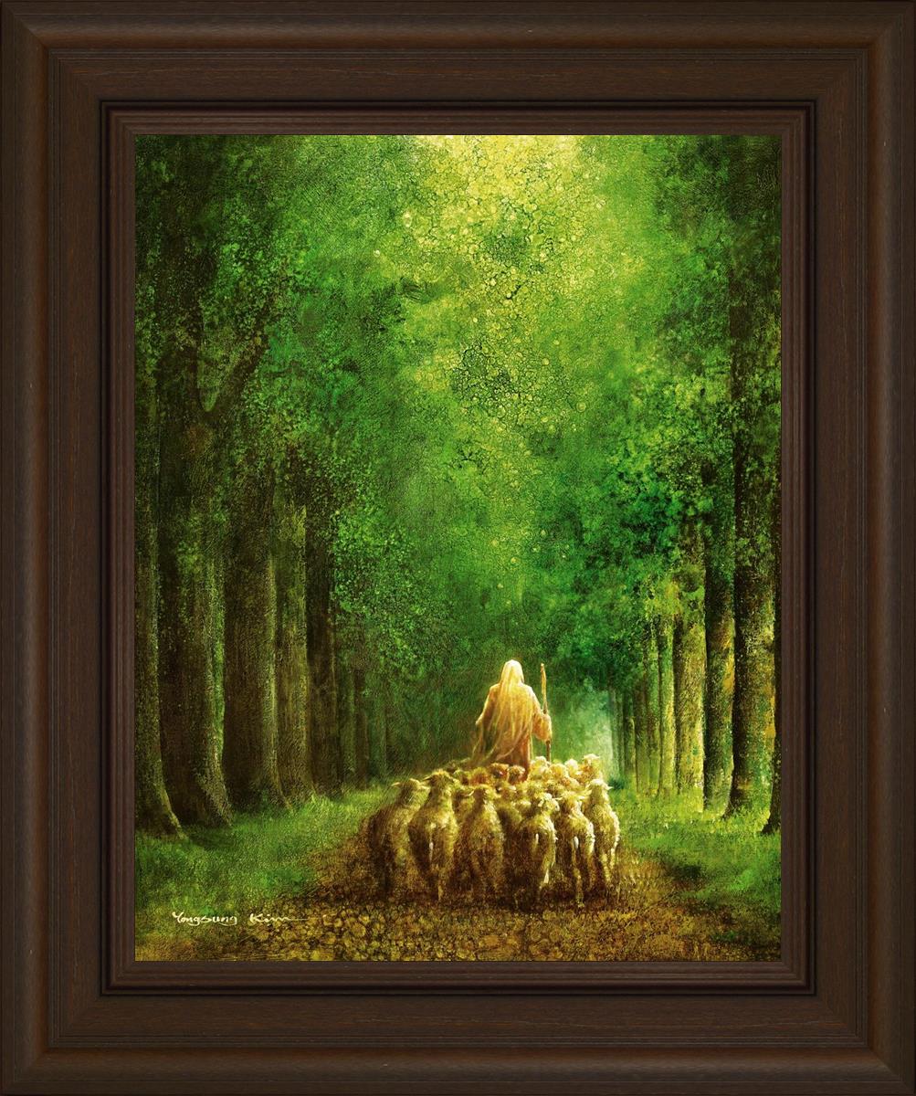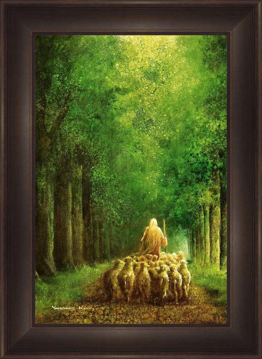 Narrow is the Way by Yongsung Kim depicts Jesus leading a flock of sheep down a dirt road through tall green trees on either side. This painting is available in print and canvas.