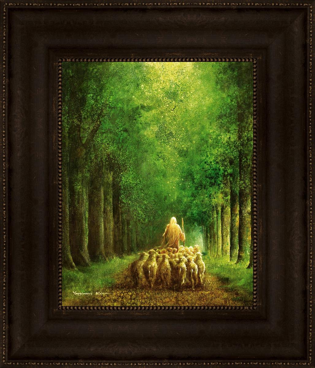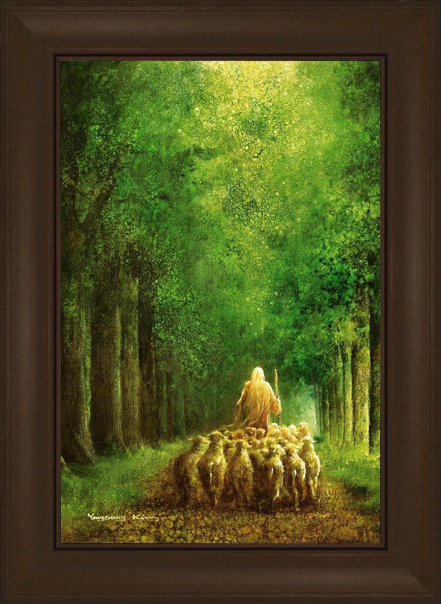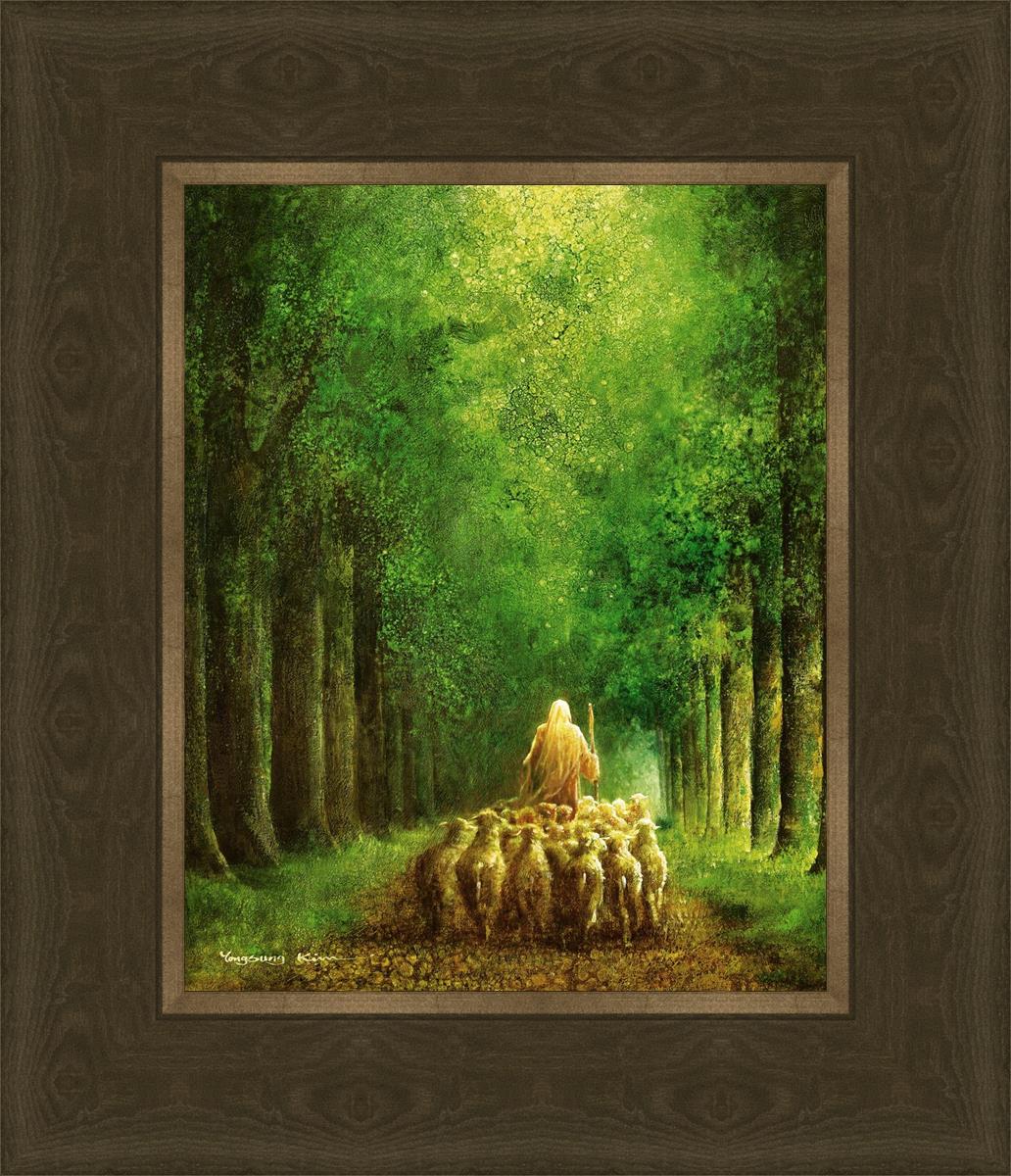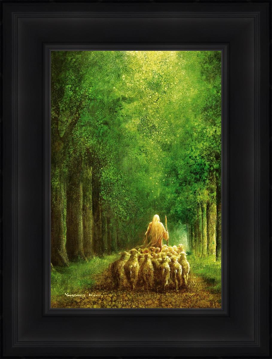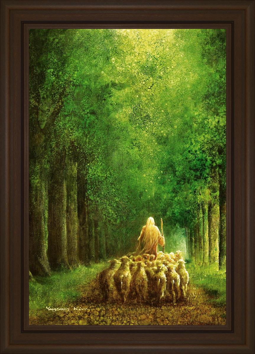 Narrow is the Way by Yongsung Kim depicts Jesus leading a flock of sheep down a dirt road through tall green trees on either side. This painting is available in print and canvas.