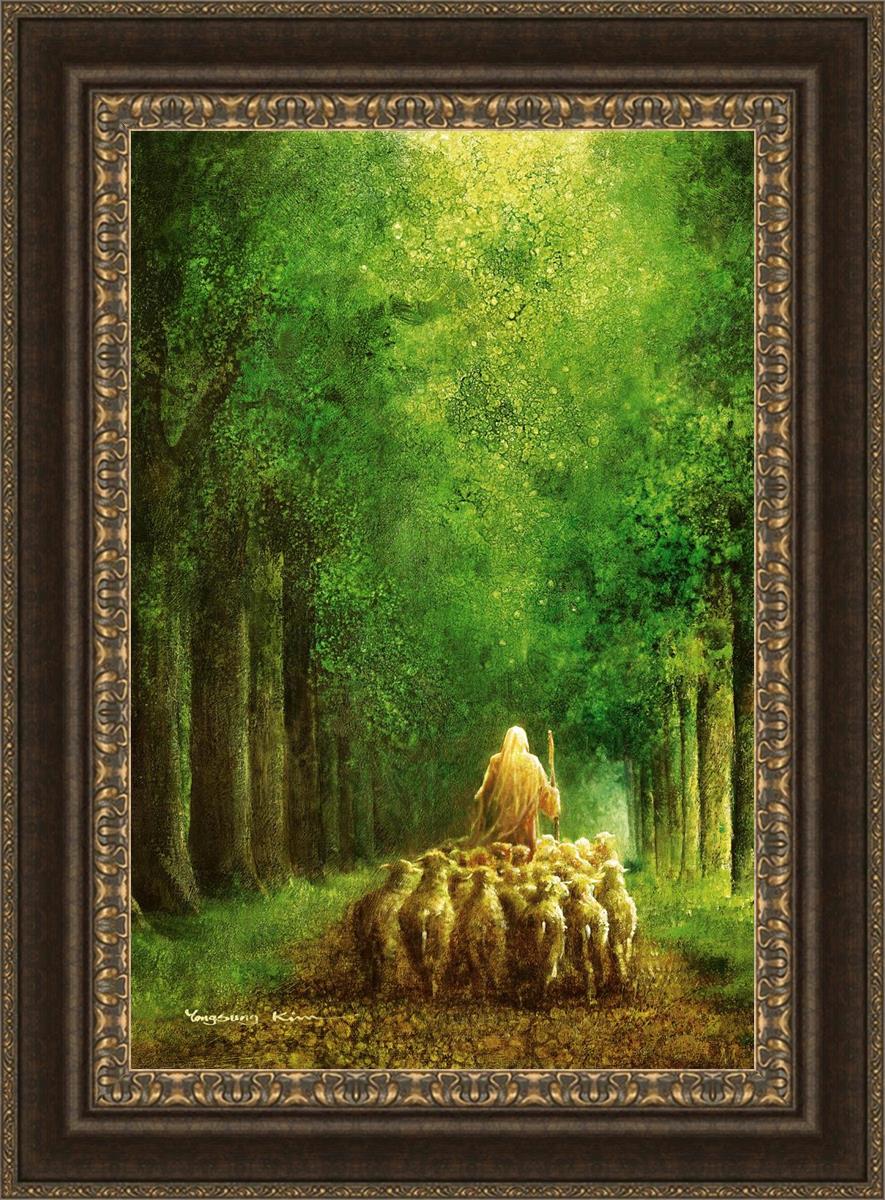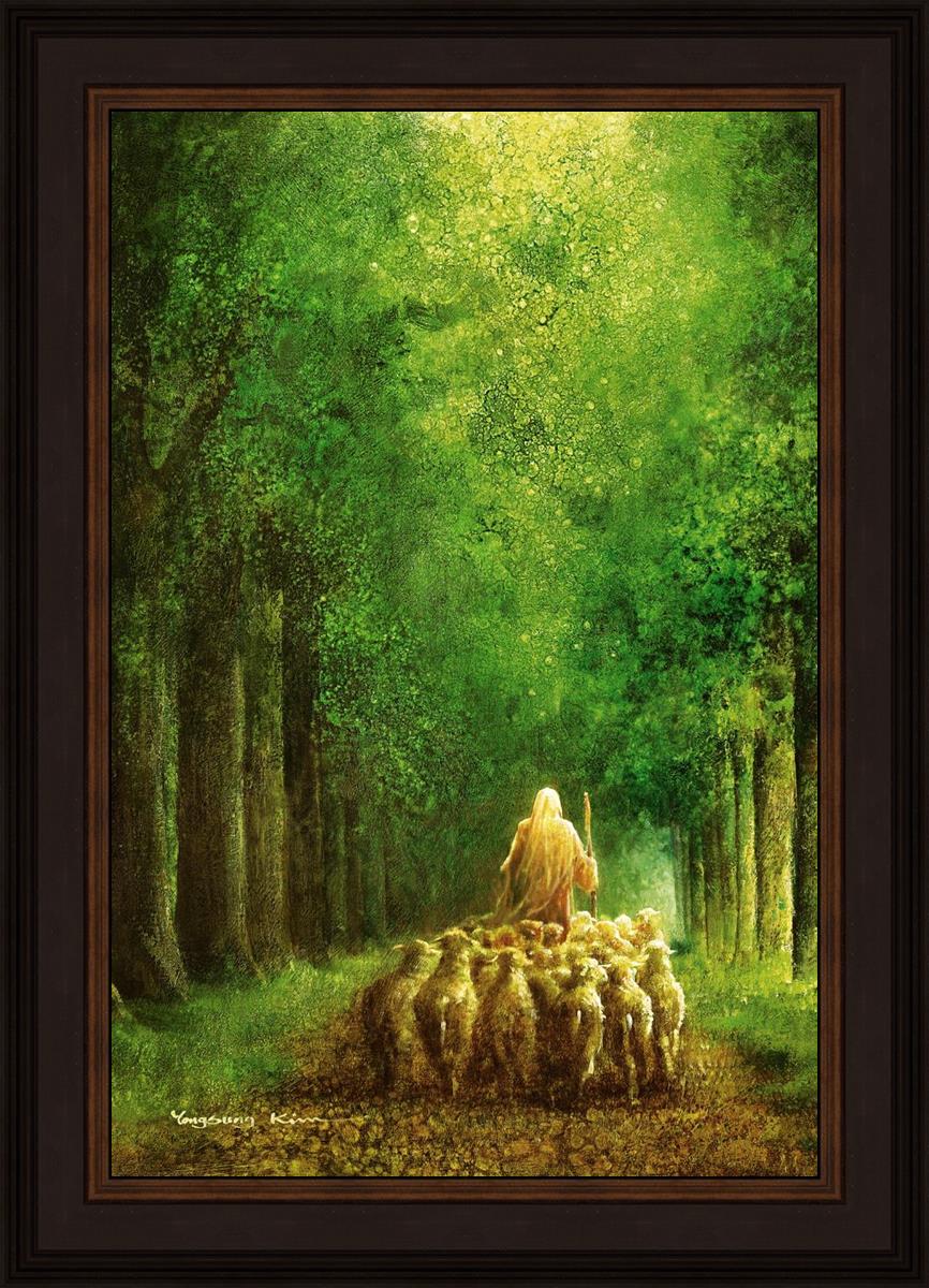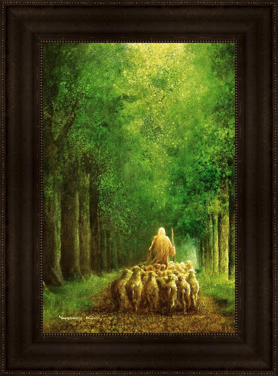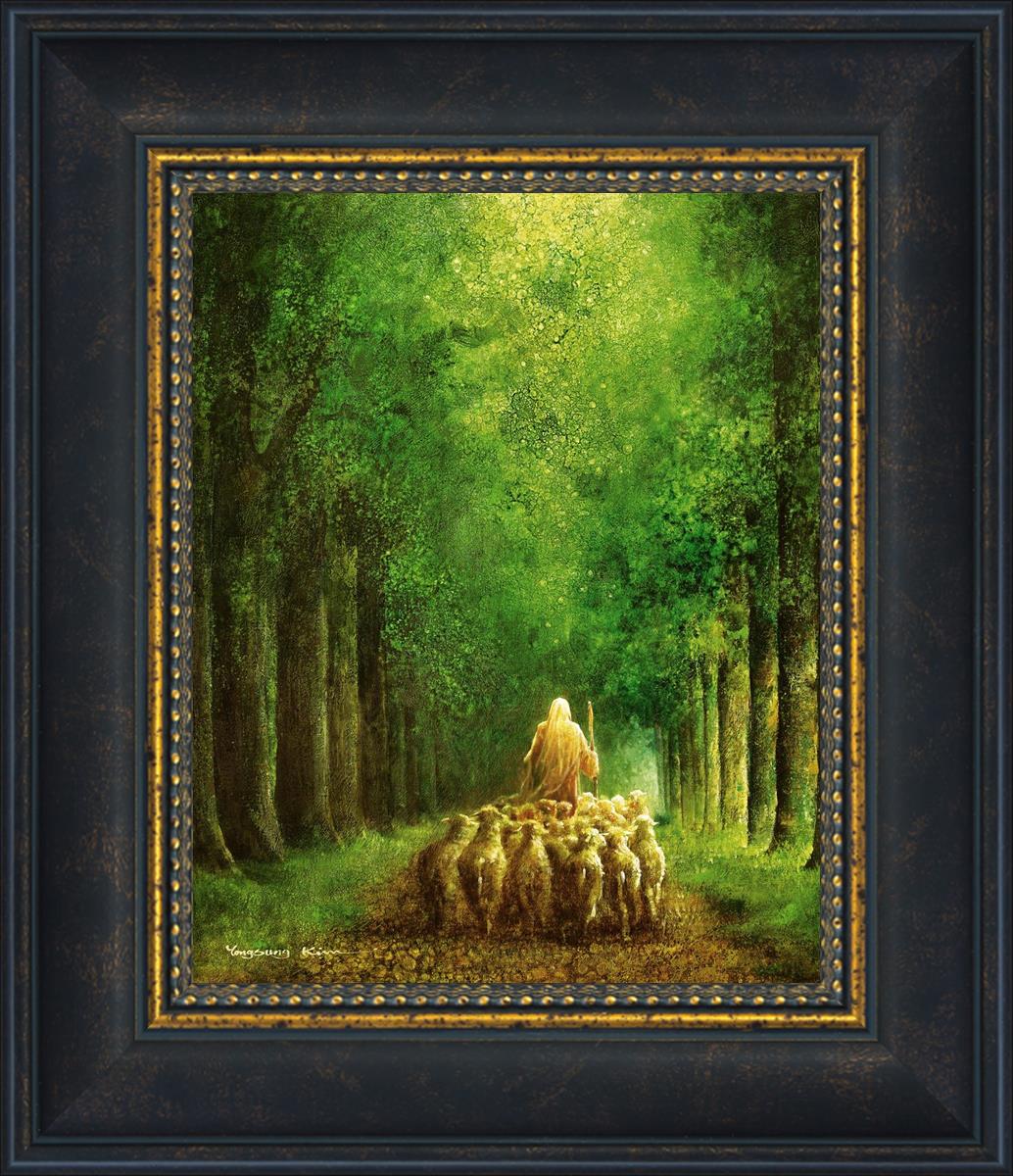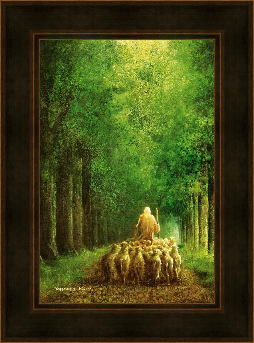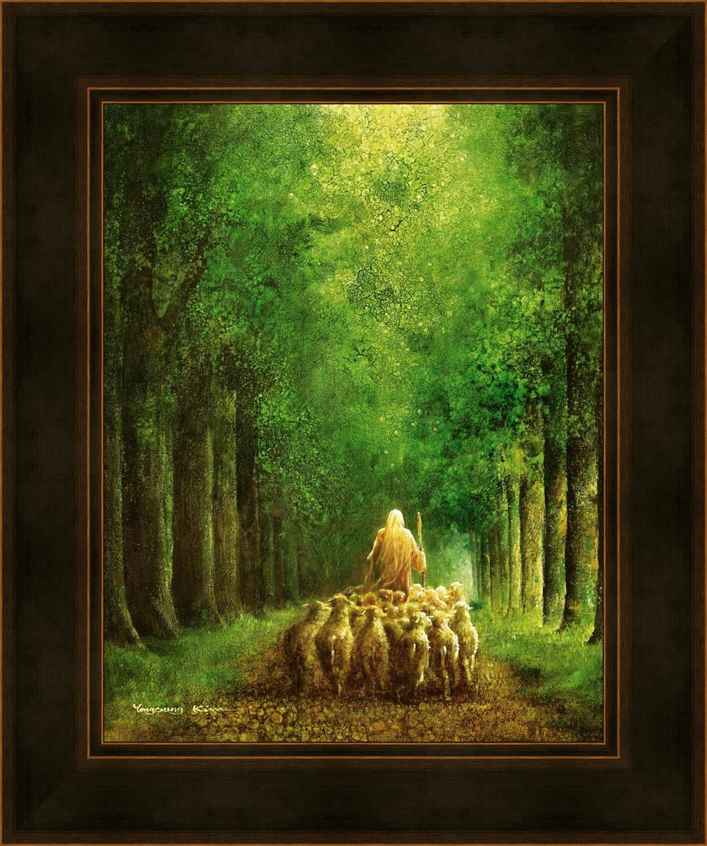 Narrow is the Way by Yongsung Kim depicts Jesus leading a flock of sheep down a dirt road through tall green trees on either side. This painting is available in print and canvas.