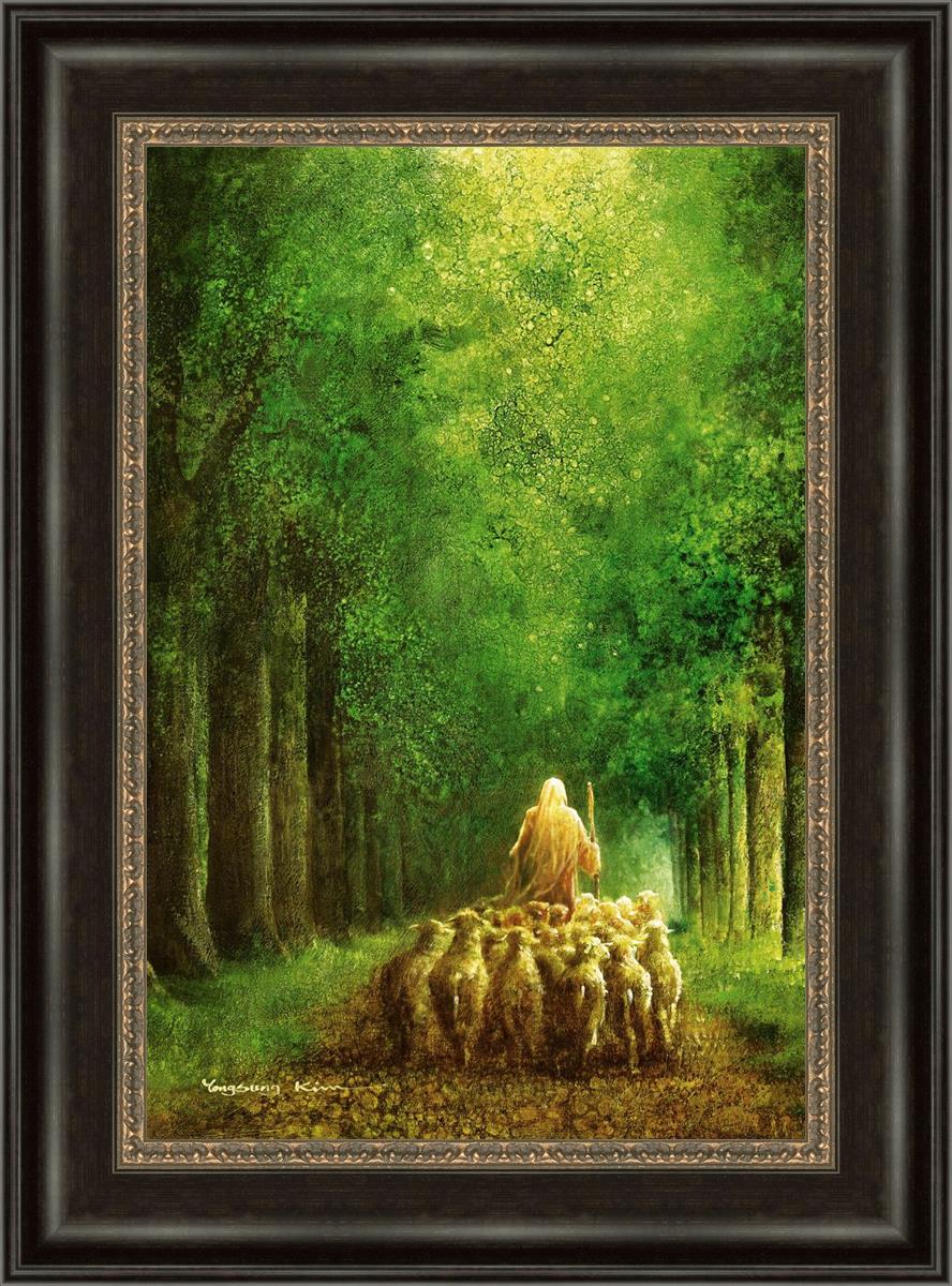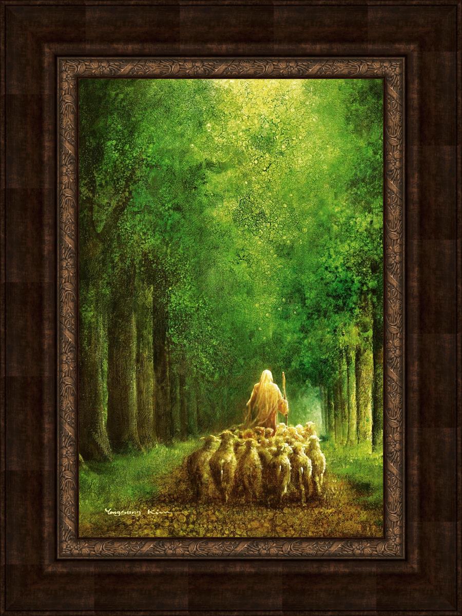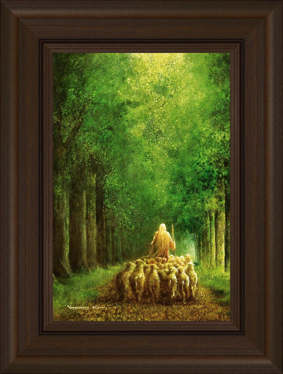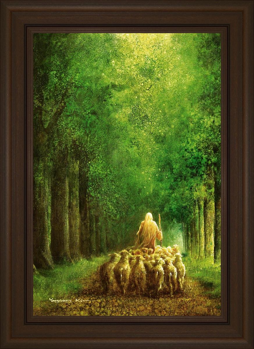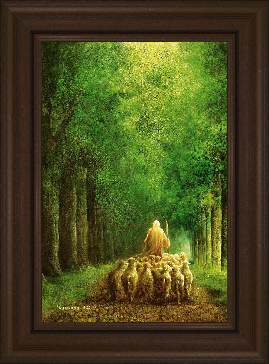 Narrow is the Way by Yongsung Kim depicts Jesus leading a flock of sheep down a dirt road through tall green trees on either side. This painting is available in print and canvas.