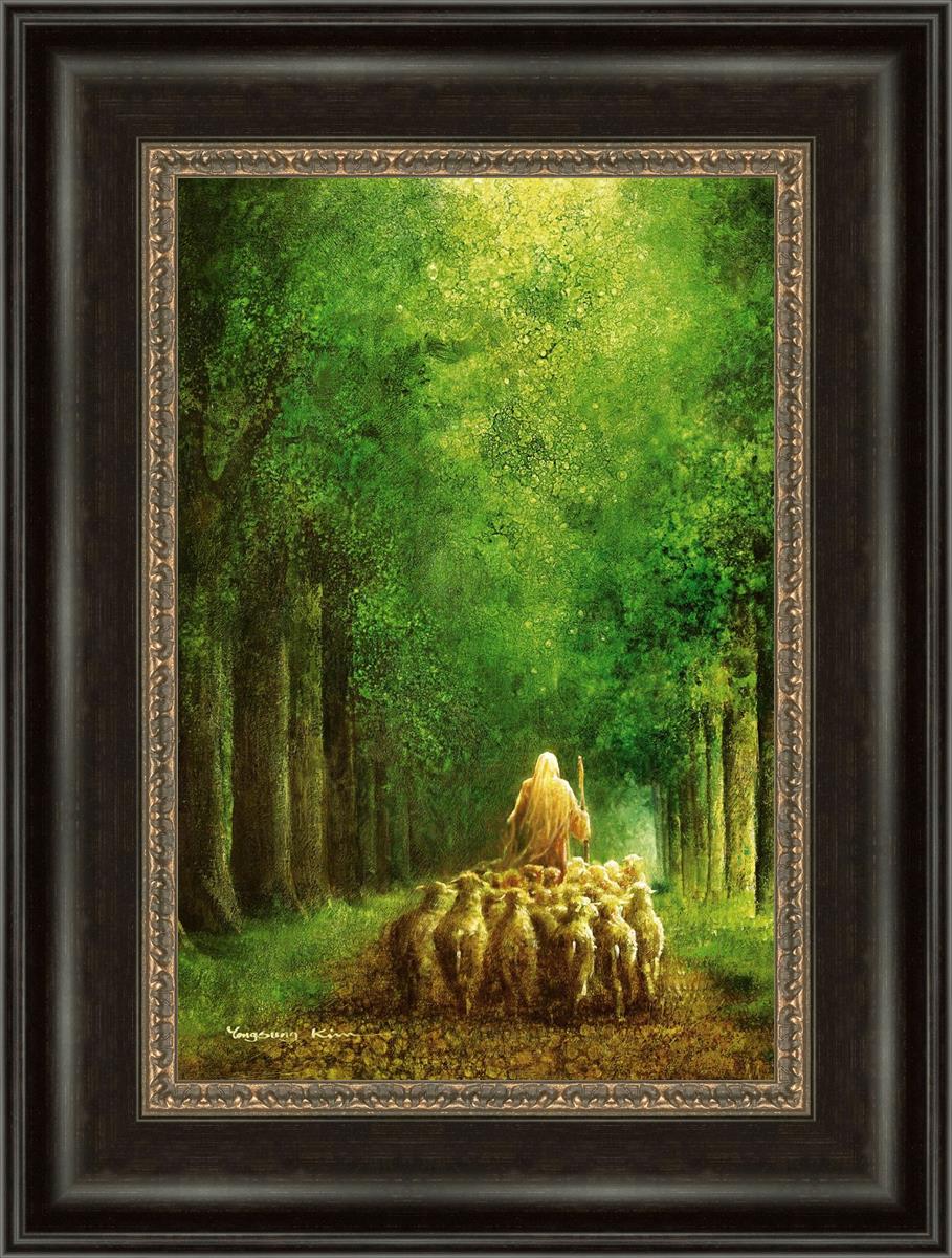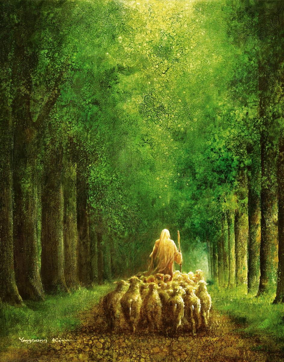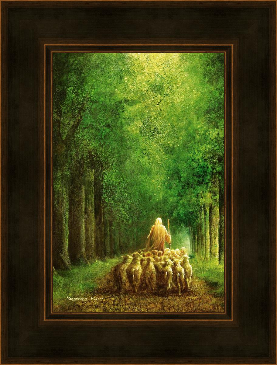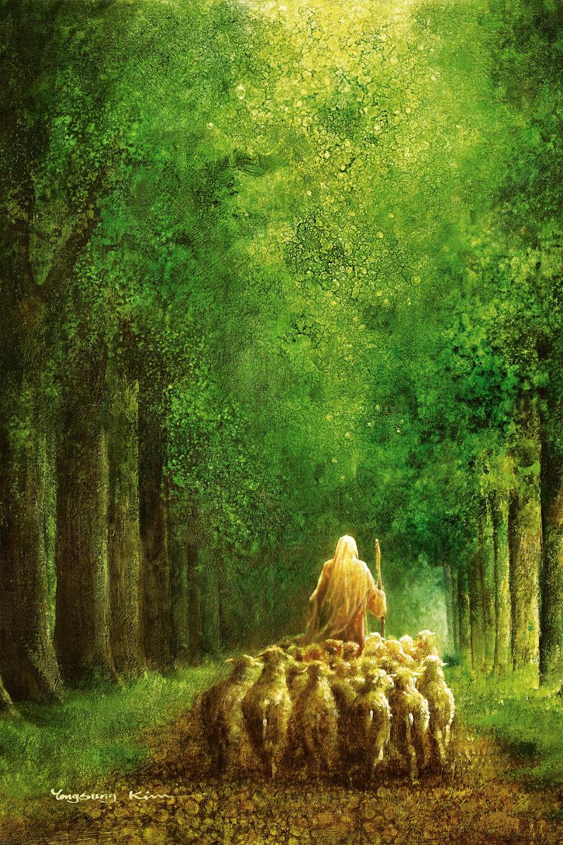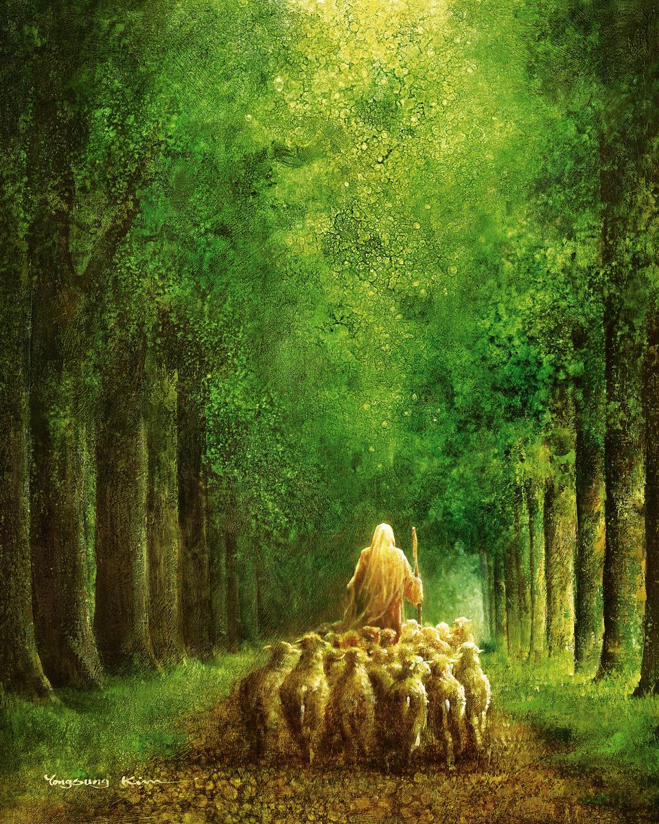 Narrow is the Way by Yongsung Kim depicts Jesus leading a flock of sheep down a dirt road through tall green trees on either side. This painting is available in print and canvas.
