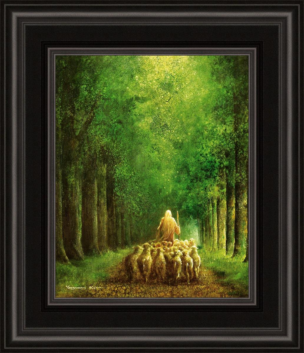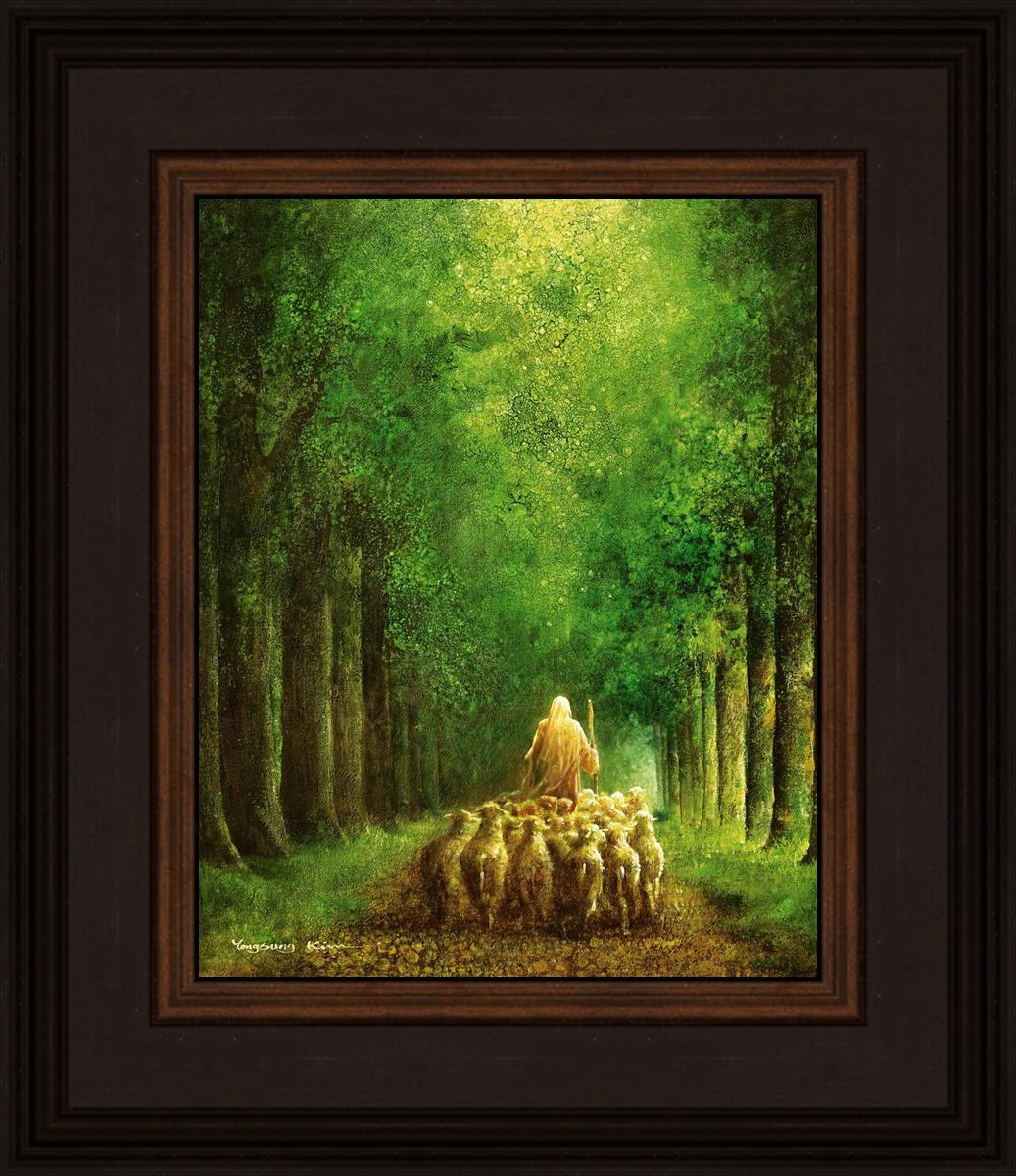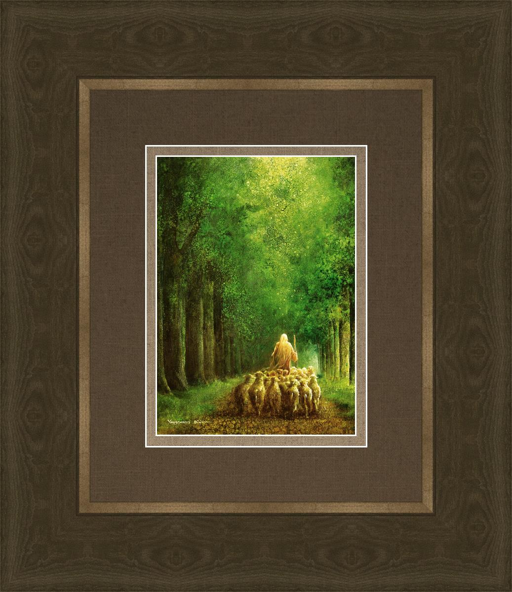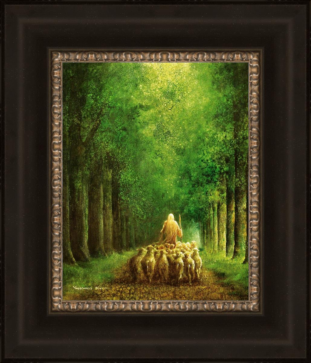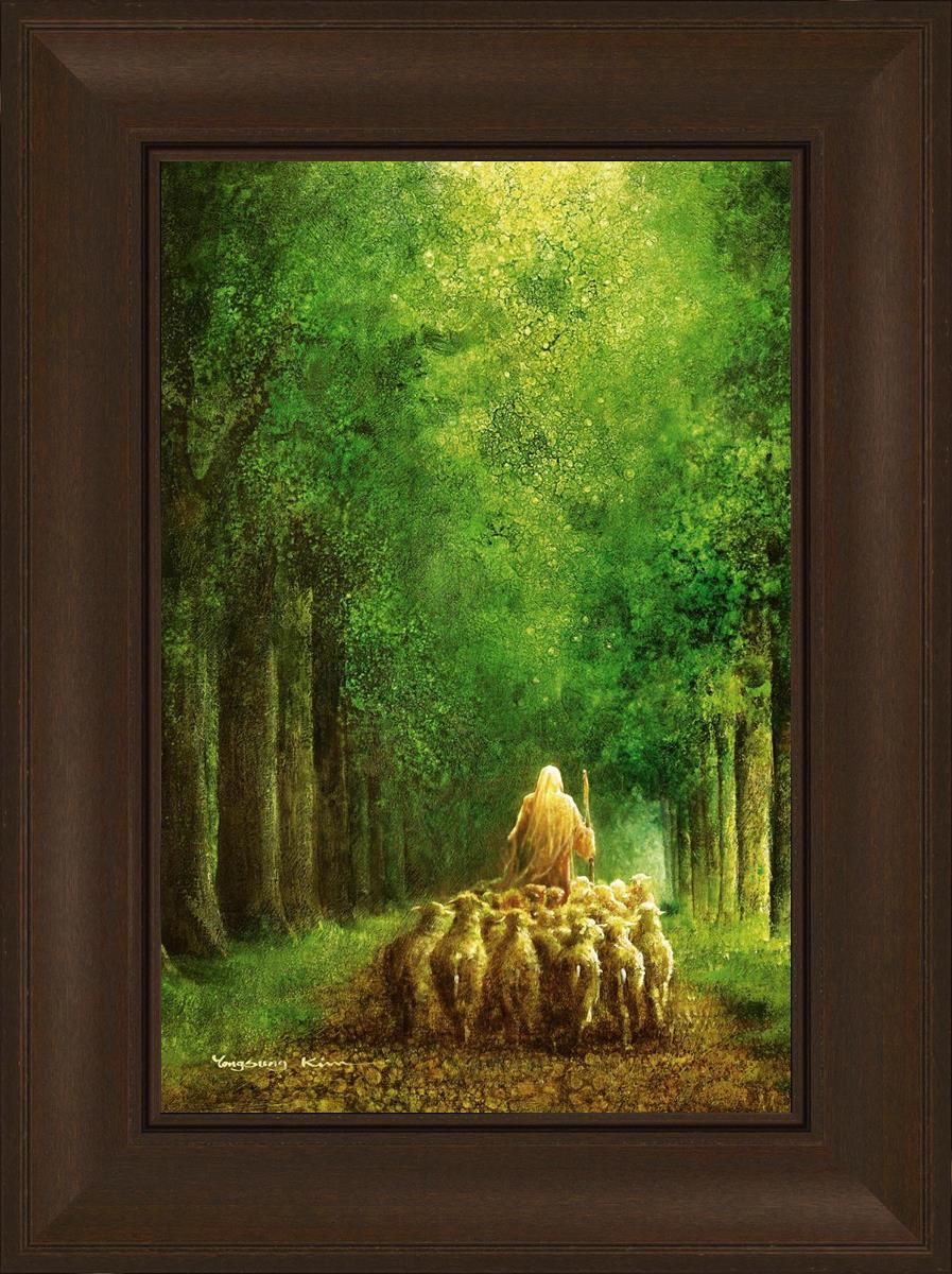 Narrow is the Way by Yongsung Kim depicts Jesus leading a flock of sheep down a dirt road through tall green trees on either side. This painting is available in print and canvas.