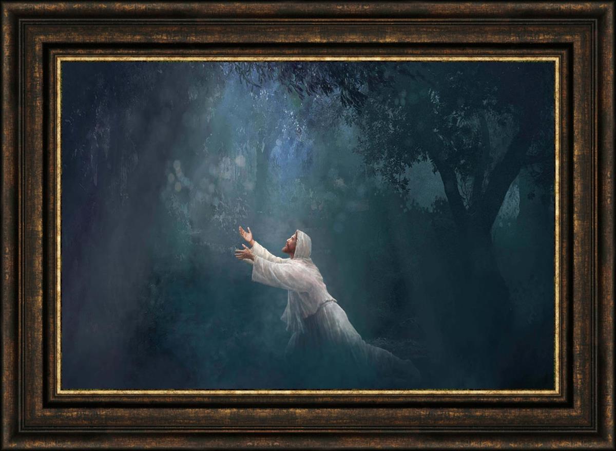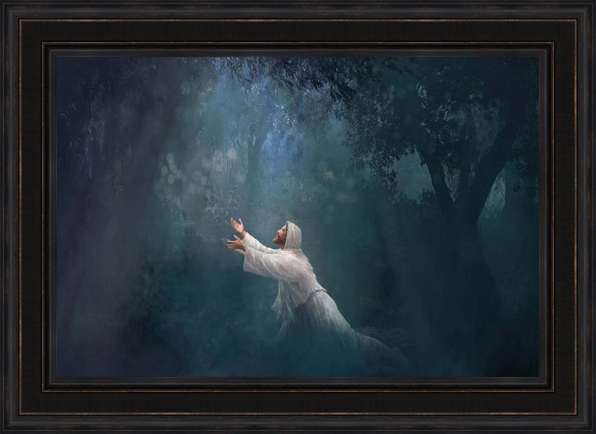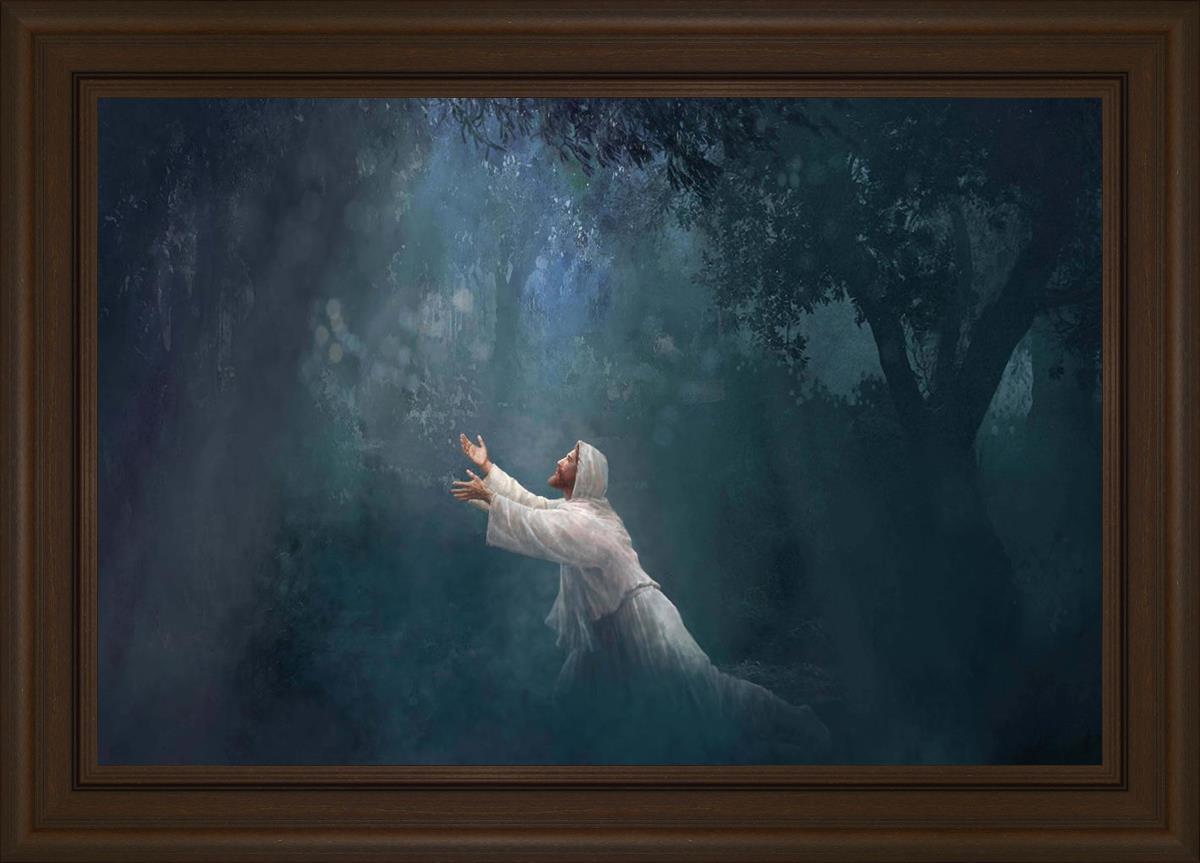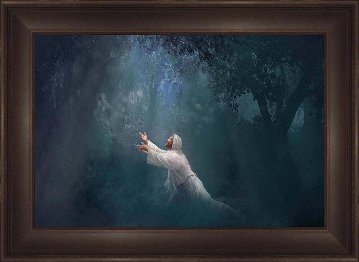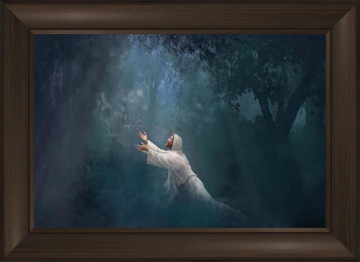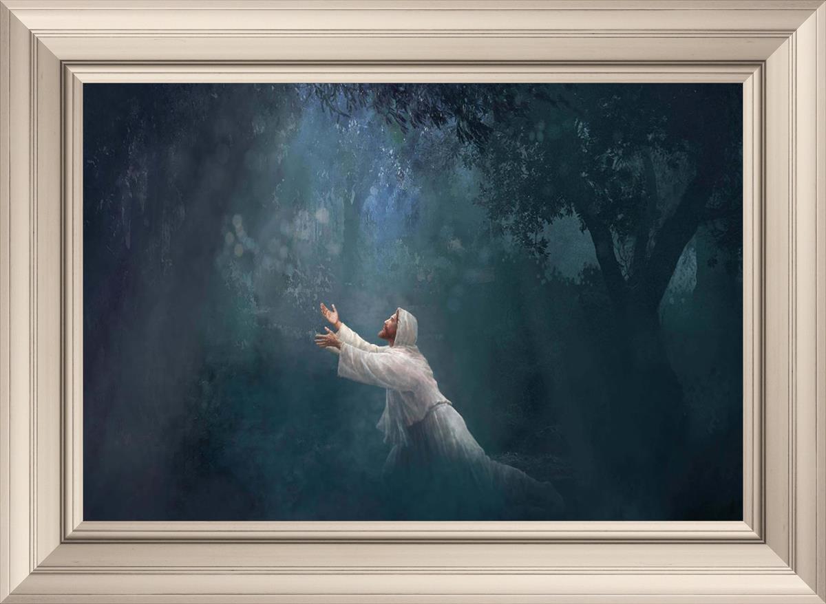 Not My Will But Thine by Yongsung Kim depicts Jesus kneeling in the garden of gethsemane at night with His arms raised to heaven pleading with the Father that if it be possible He let this cup pass by Him. This painting is available in print and canvas.