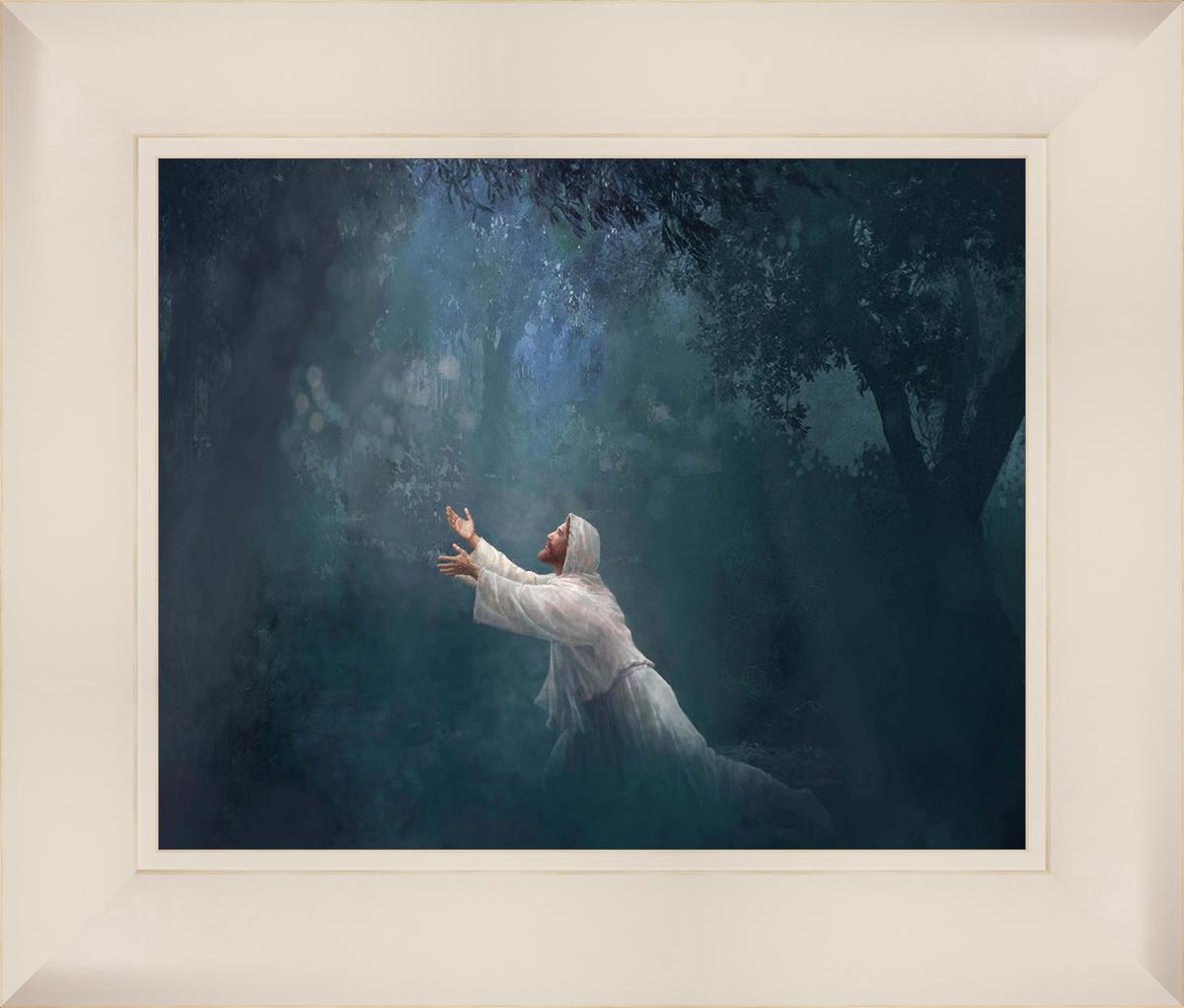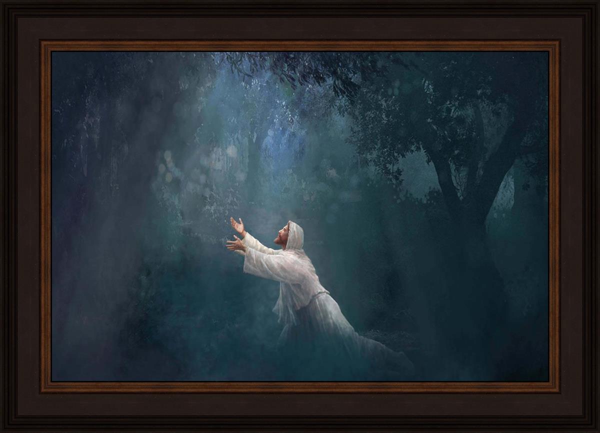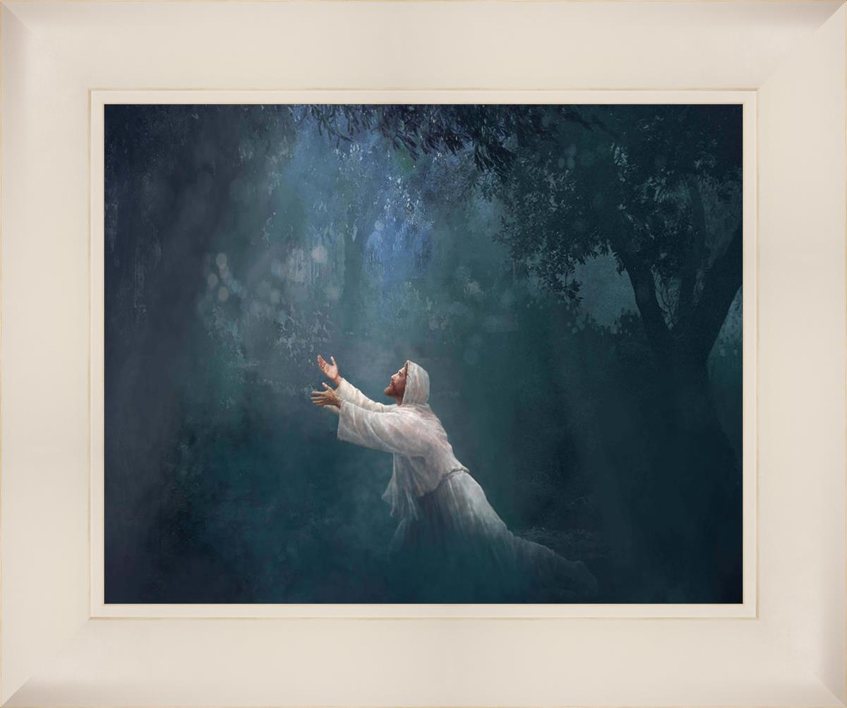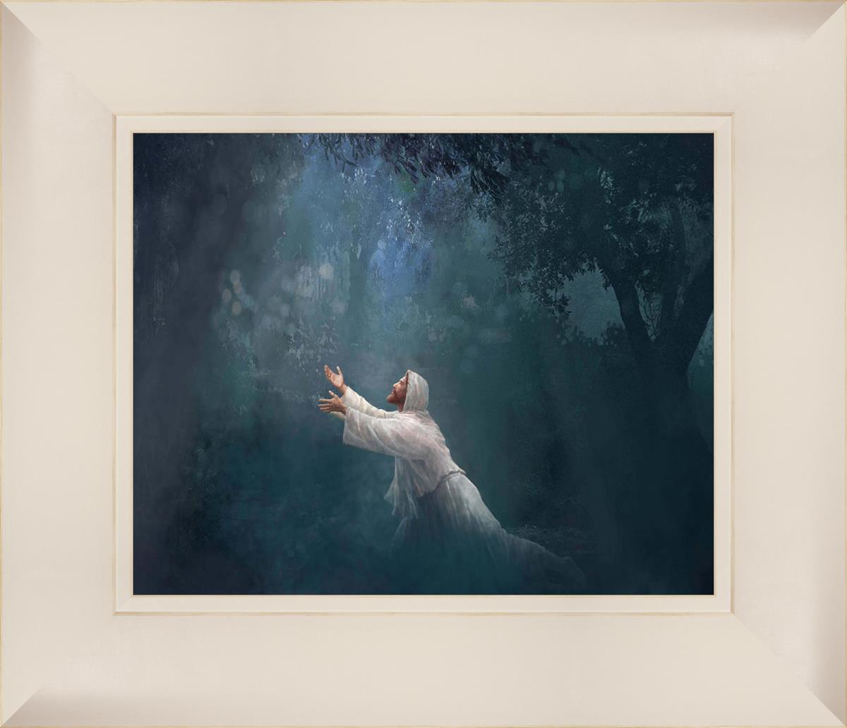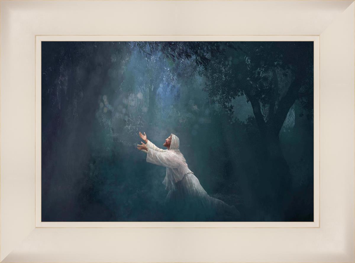 Not My Will But Thine by Yongsung Kim depicts Jesus kneeling in the garden of gethsemane at night with His arms raised to heaven pleading with the Father that if it be possible He let this cup pass by Him. This painting is available in print and canvas.