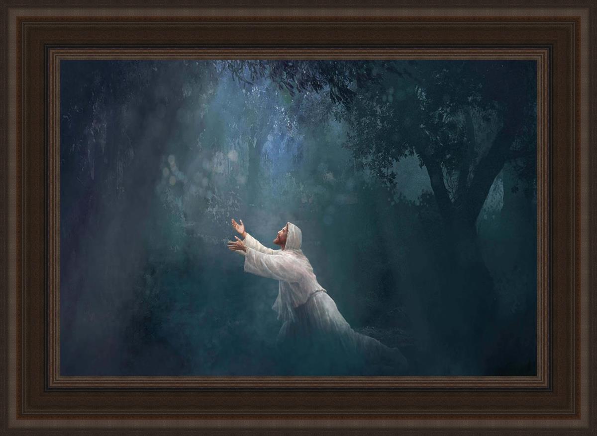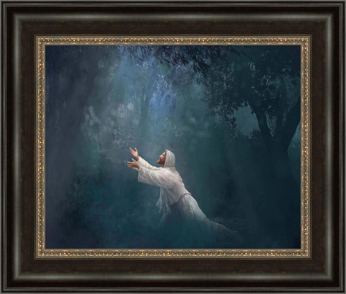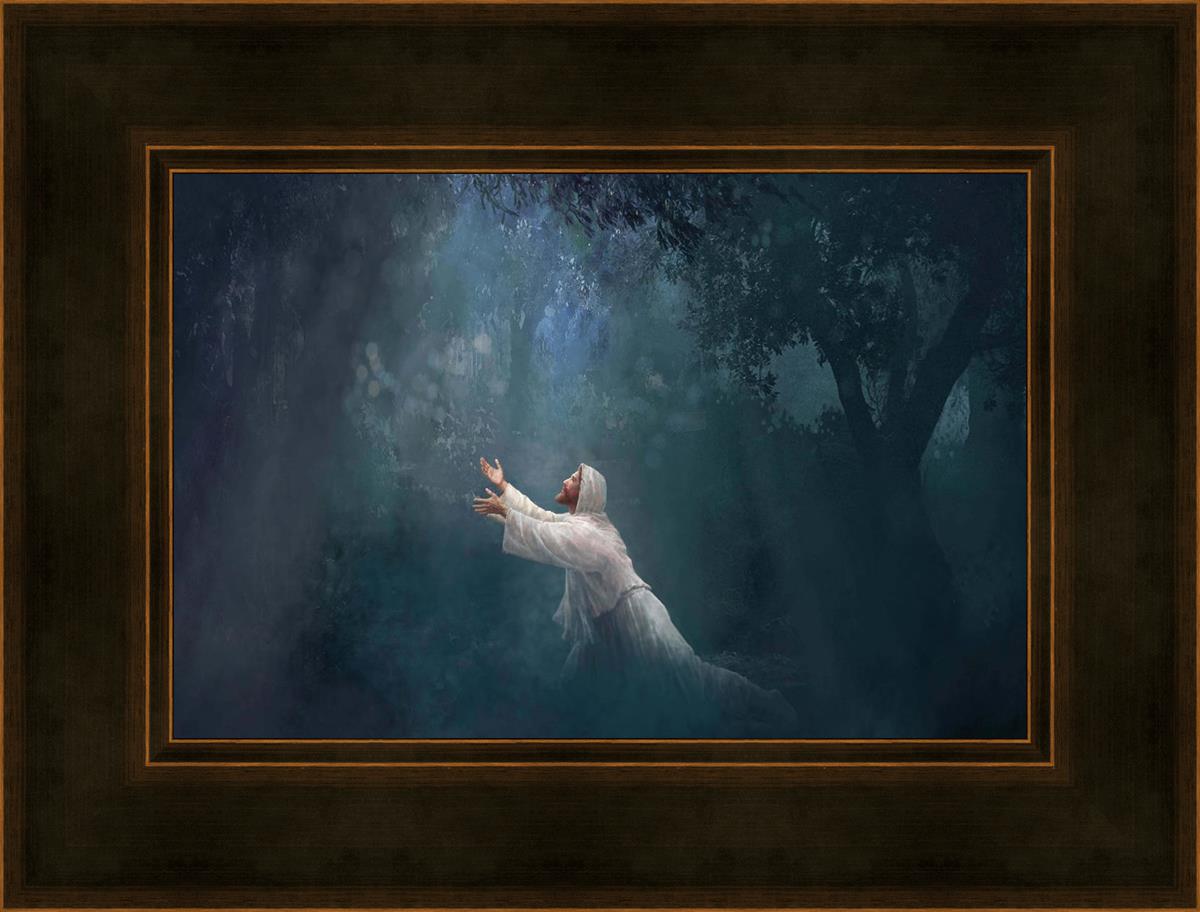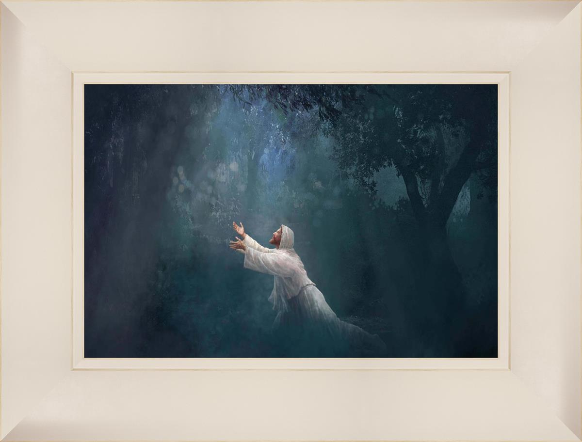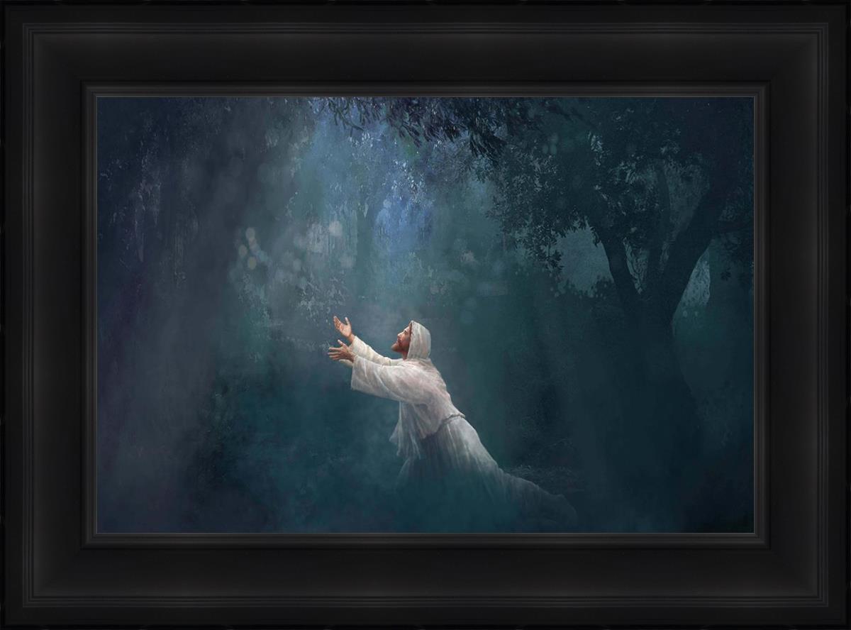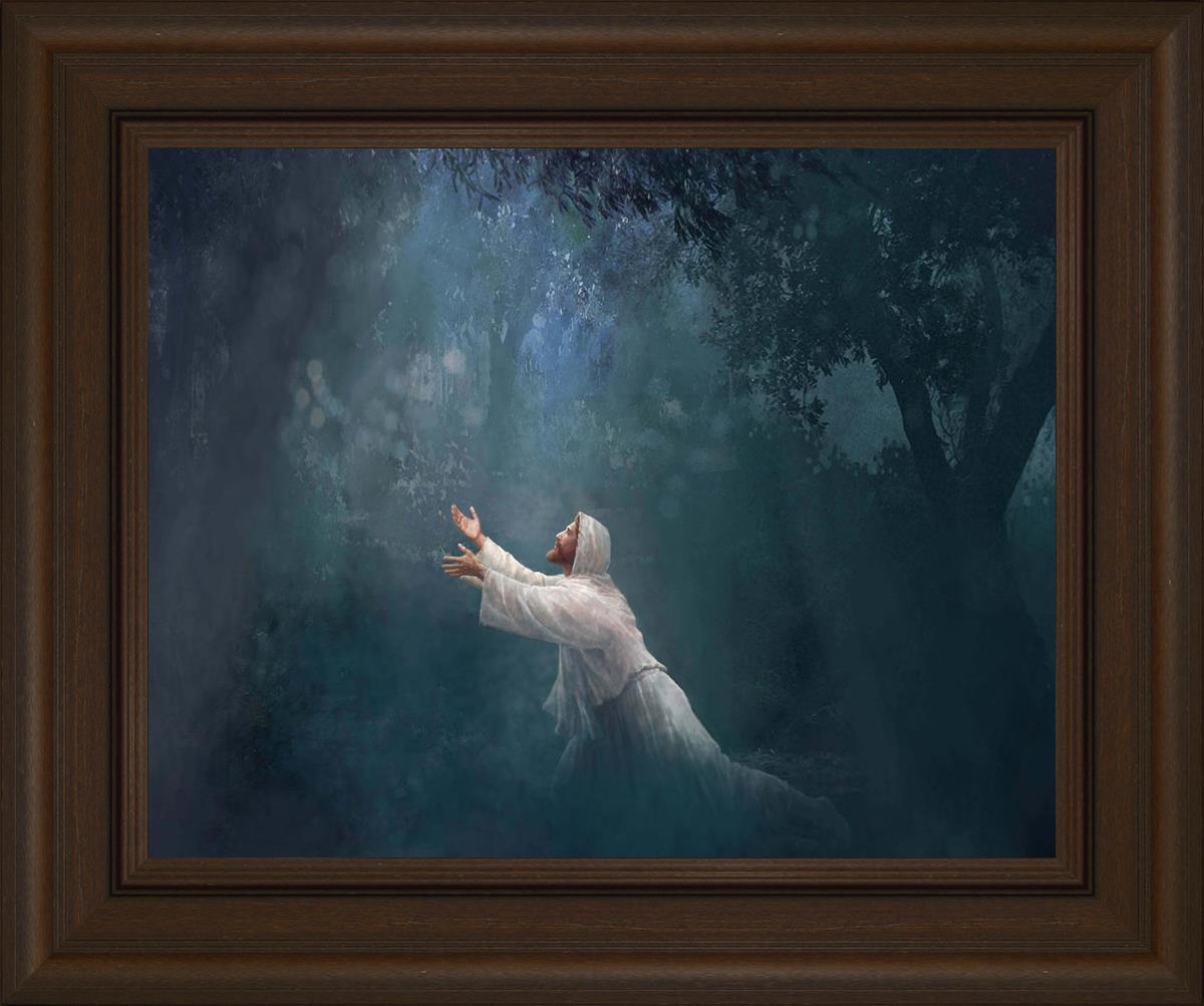 Not My Will But Thine by Yongsung Kim depicts Jesus kneeling in the garden of gethsemane at night with His arms raised to heaven pleading with the Father that if it be possible He let this cup pass by Him. This painting is available in print and canvas.