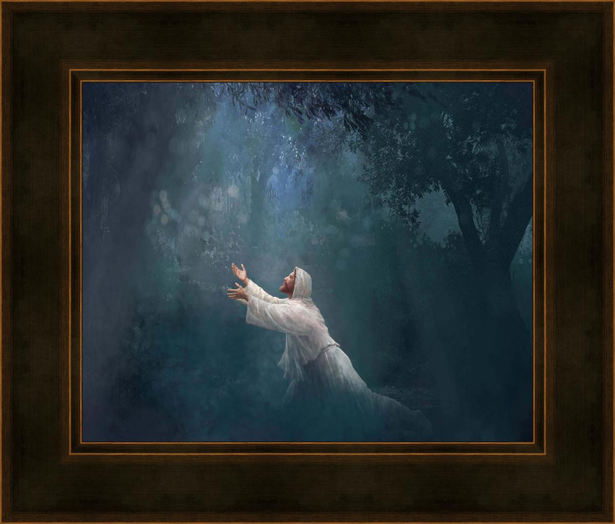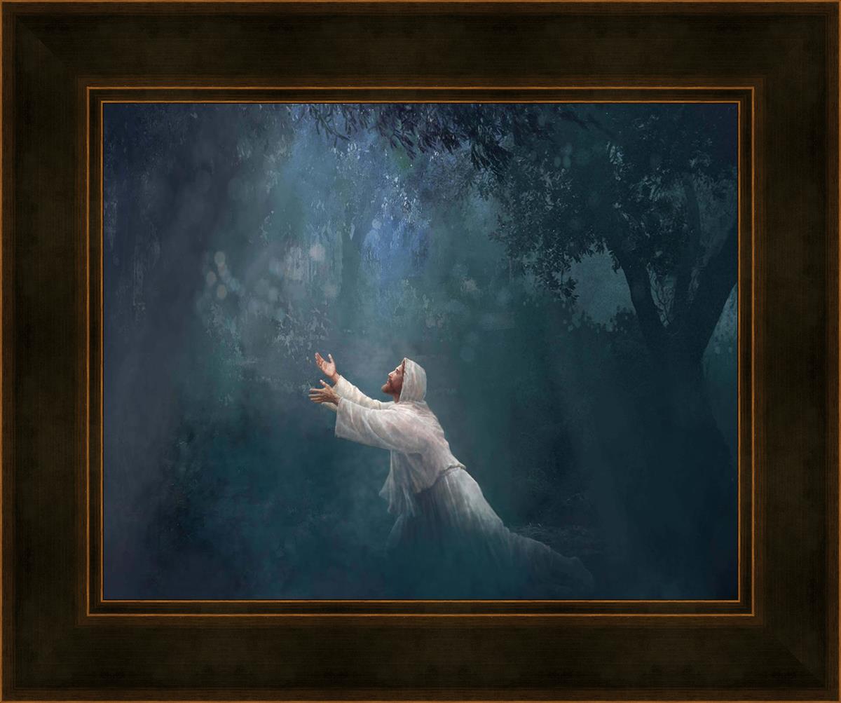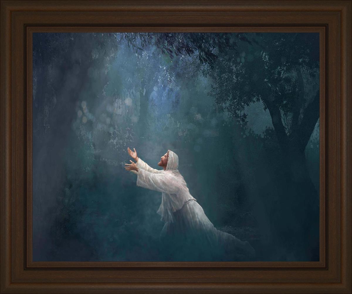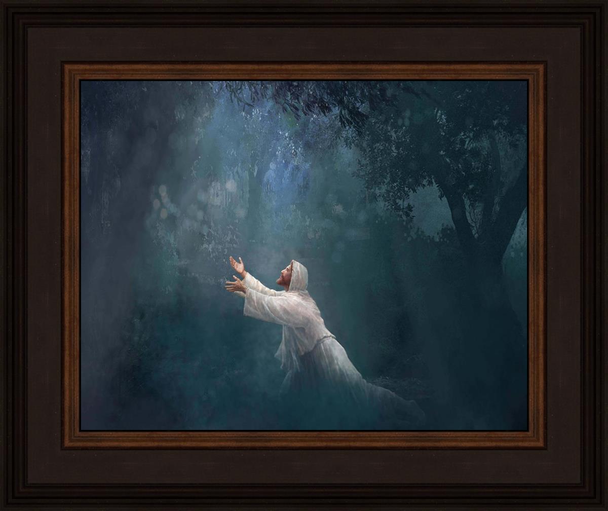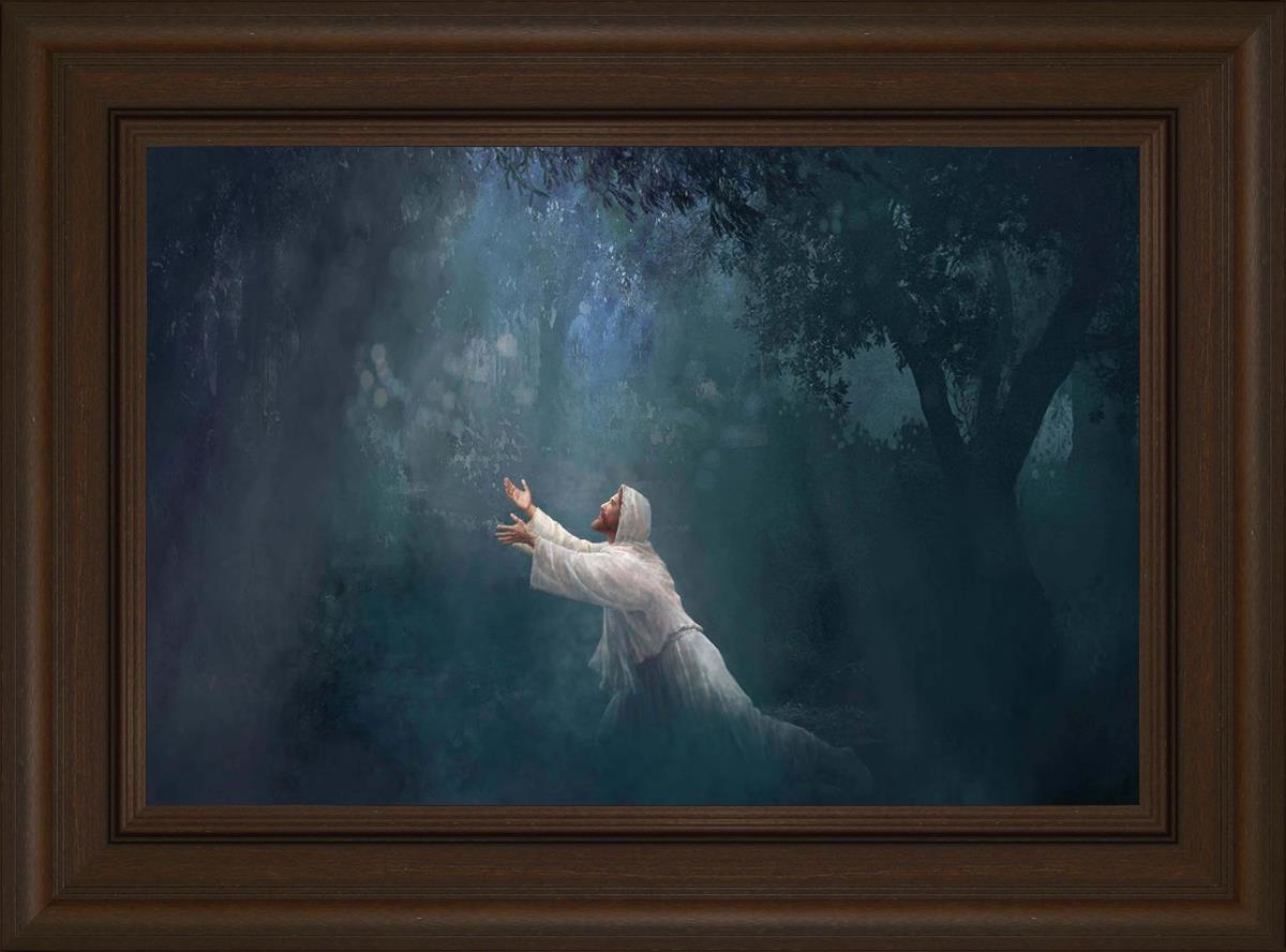 Not My Will But Thine by Yongsung Kim depicts Jesus kneeling in the garden of gethsemane at night with His arms raised to heaven pleading with the Father that if it be possible He let this cup pass by Him. This painting is available in print and canvas.