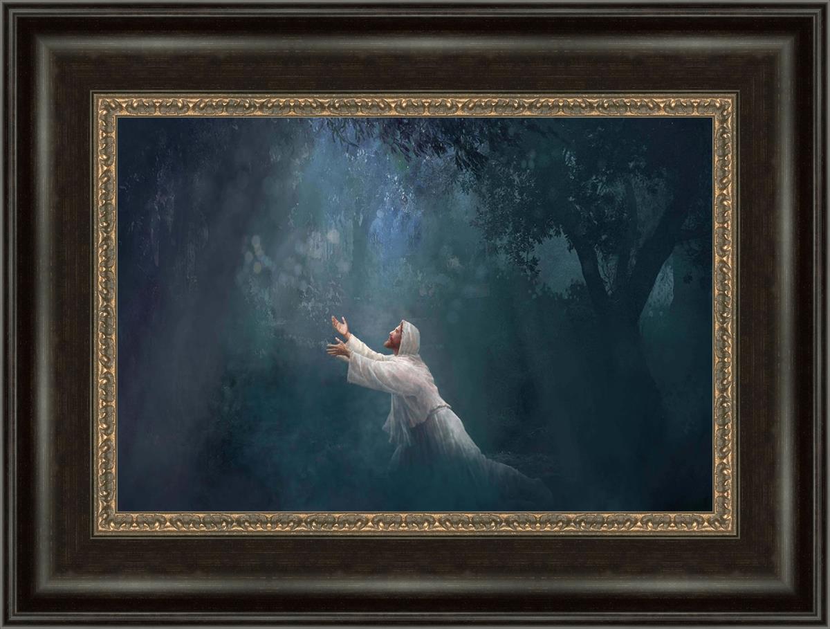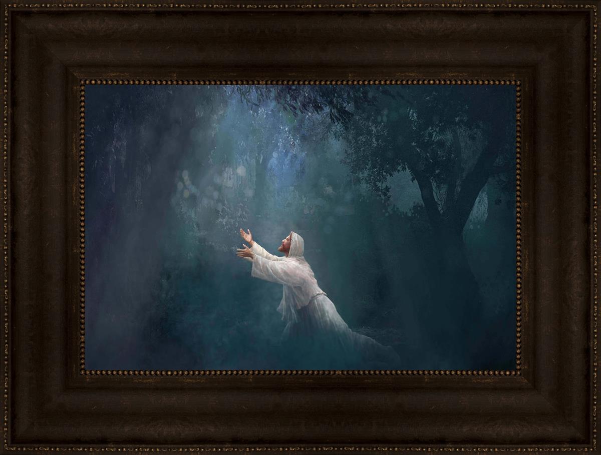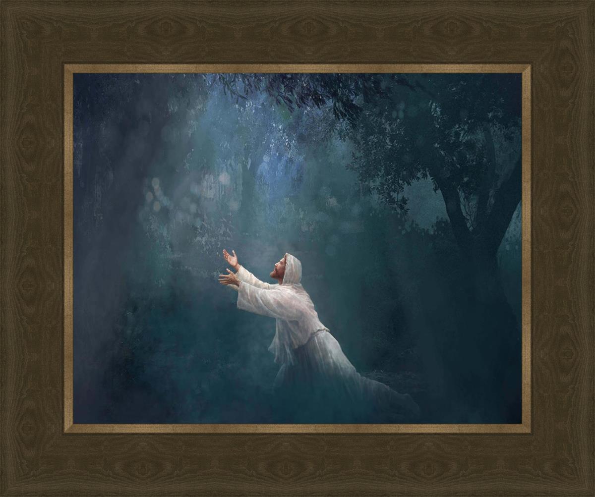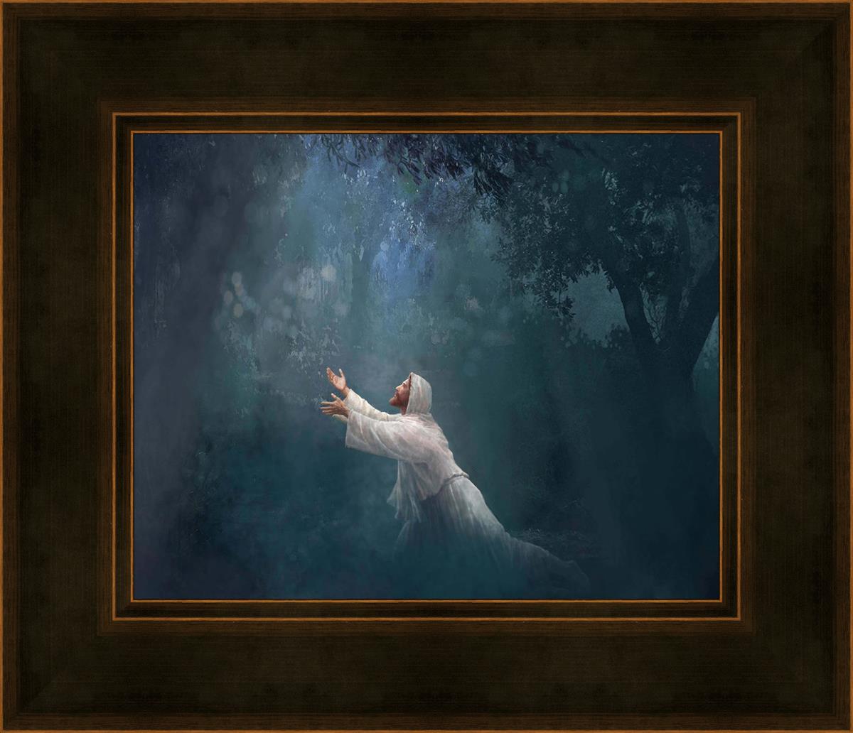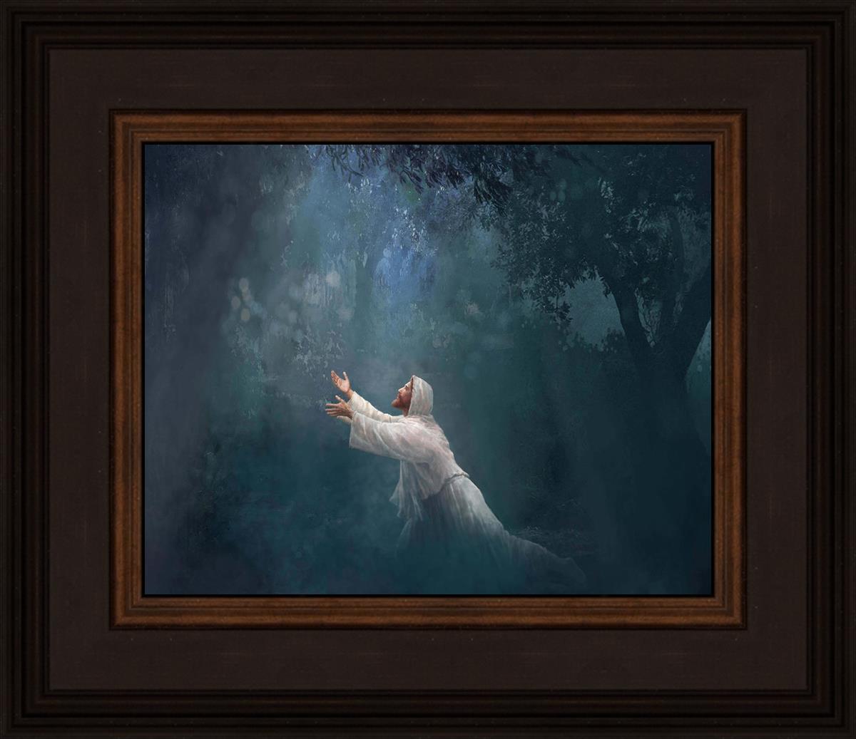 Not My Will But Thine by Yongsung Kim depicts Jesus kneeling in the garden of gethsemane at night with His arms raised to heaven pleading with the Father that if it be possible He let this cup pass by Him. This painting is available in print and canvas.