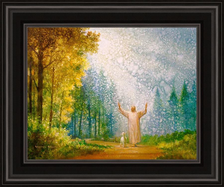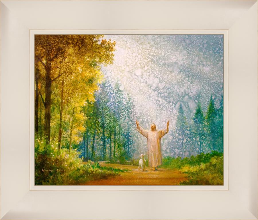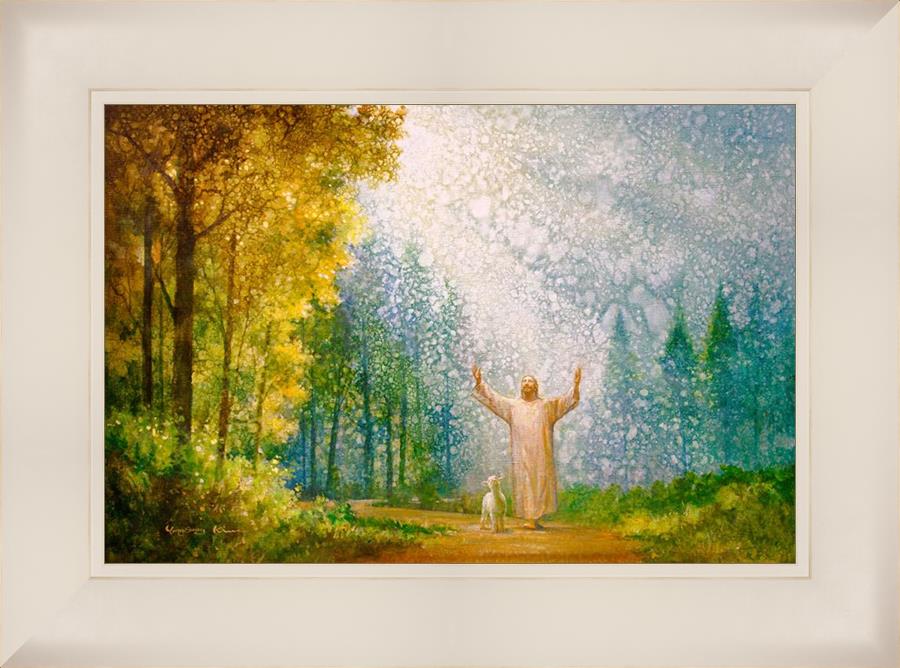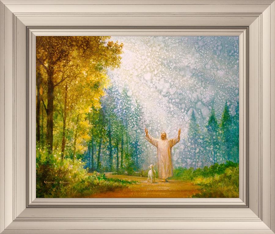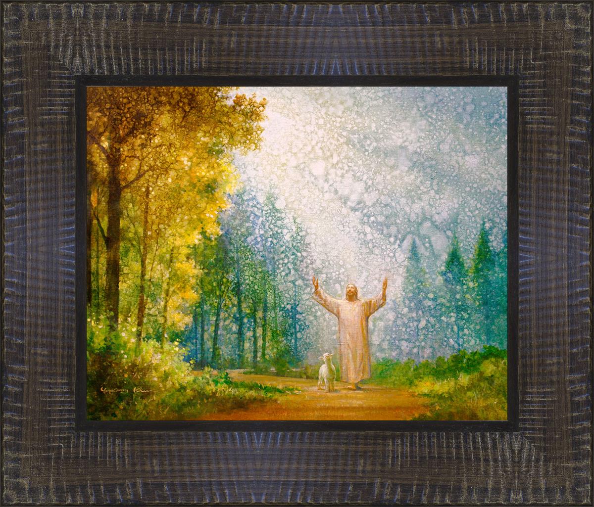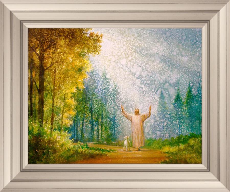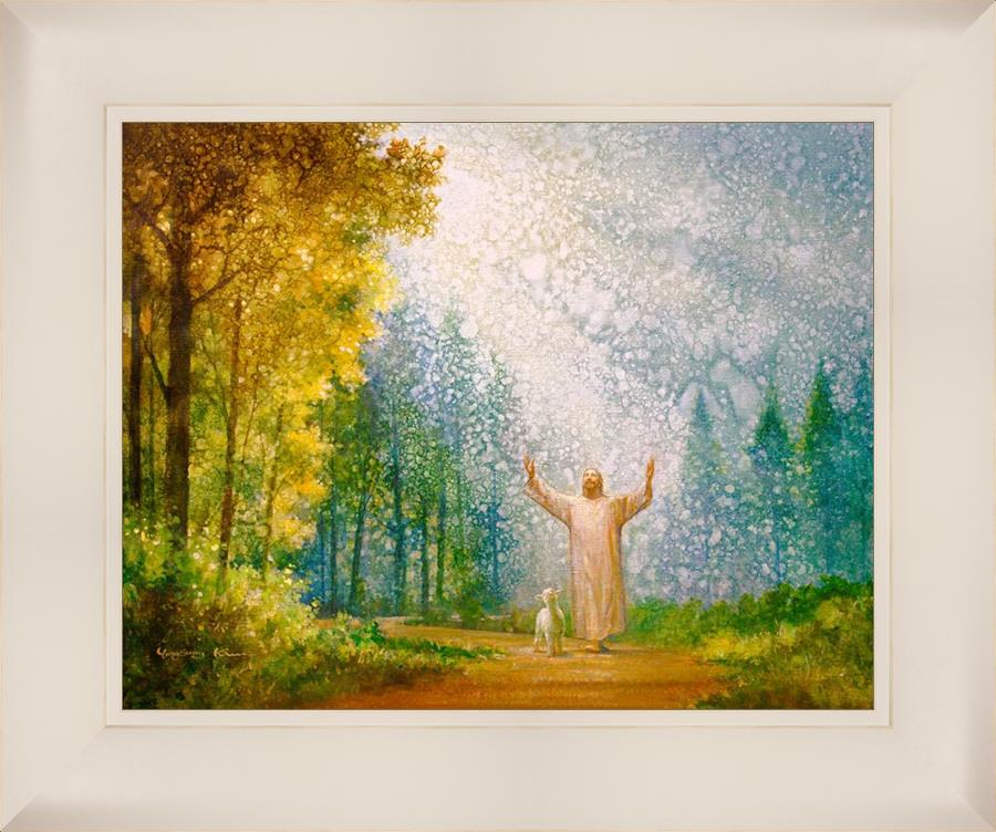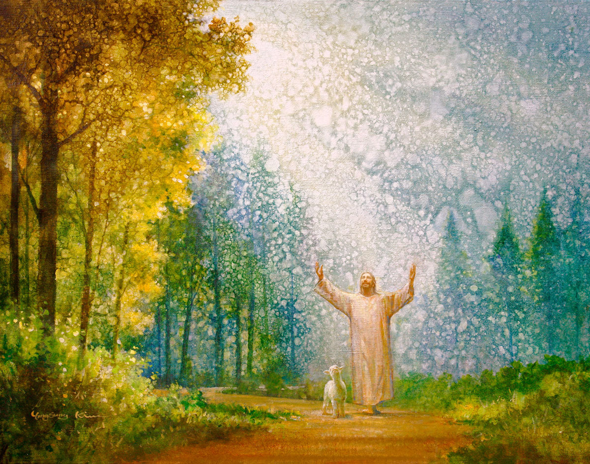 Oh My Father by Yongsung Kim depicts Jesus Christ with arms raised looking toward heaven with a lamb by his side and rays of light hitting Him through tall yellow trees. This painting is available in print and canvas.