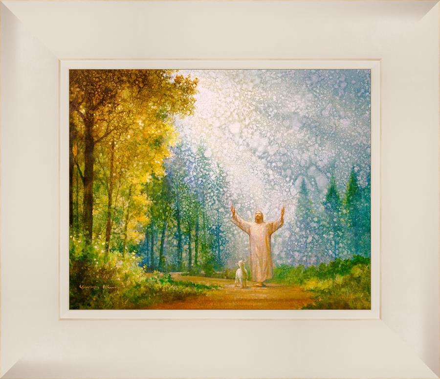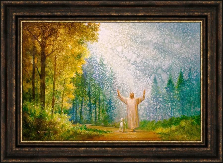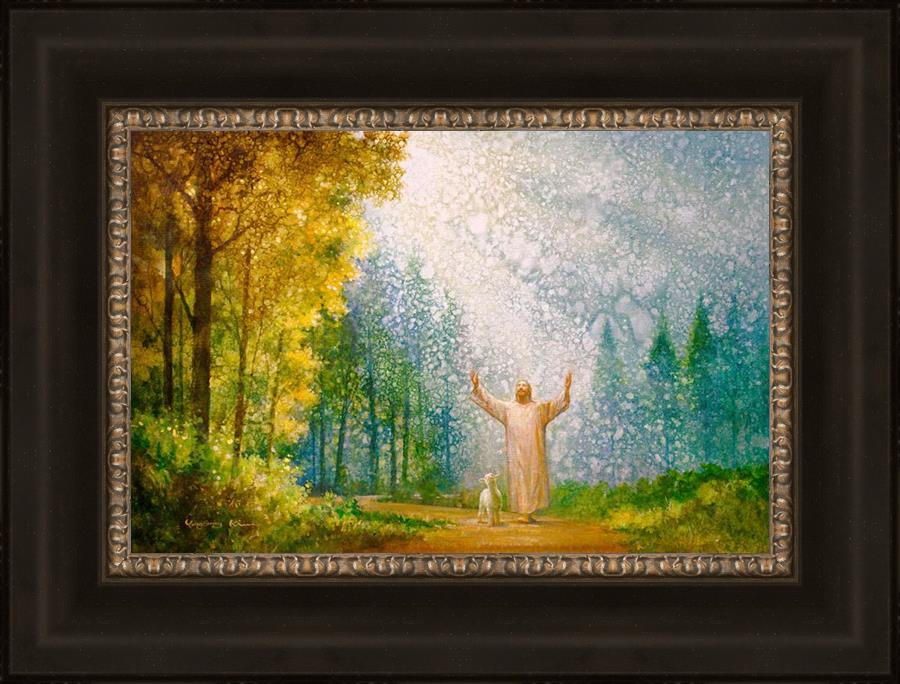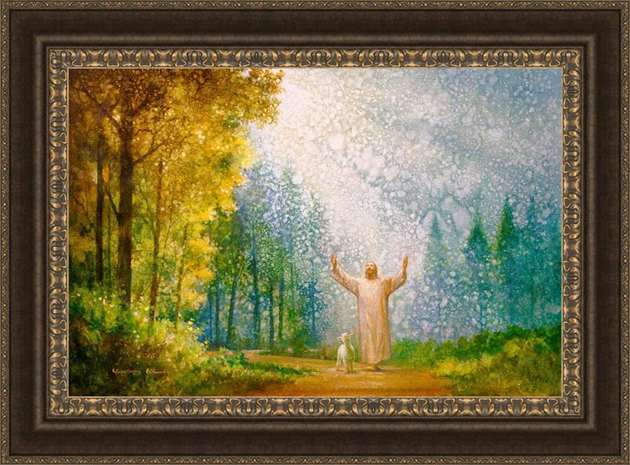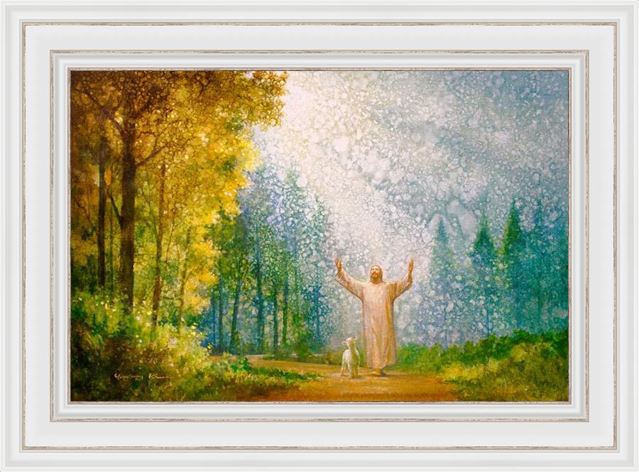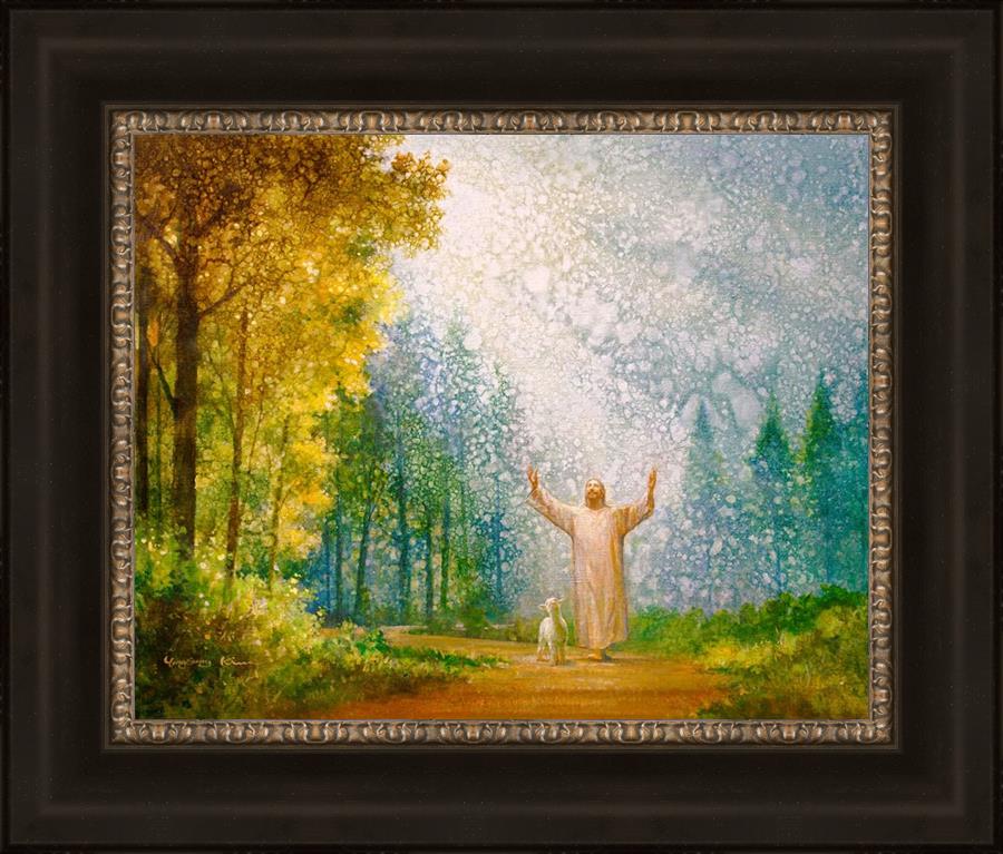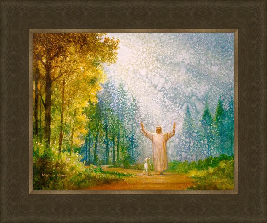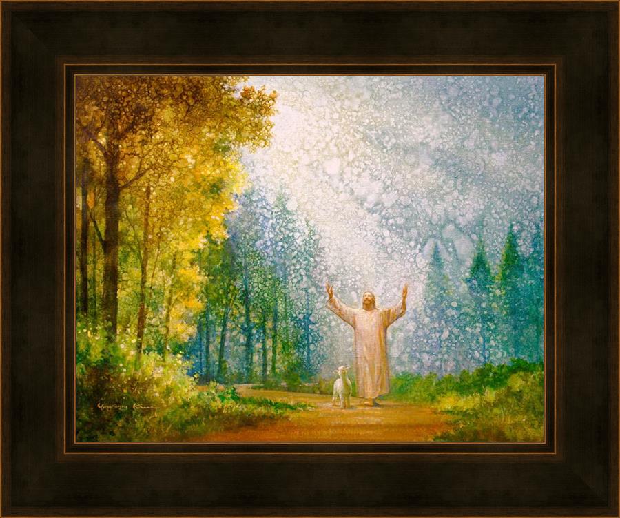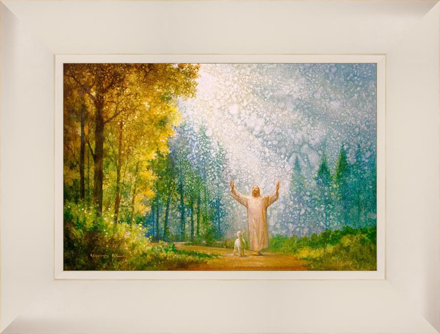 Oh My Father by Yongsung Kim depicts Jesus Christ with arms raised looking toward heaven with a lamb by his side and rays of light hitting Him through tall yellow trees. This painting is available in print and canvas.