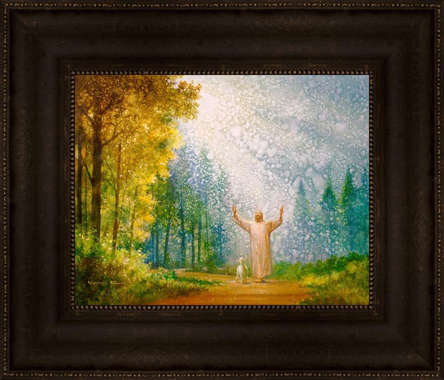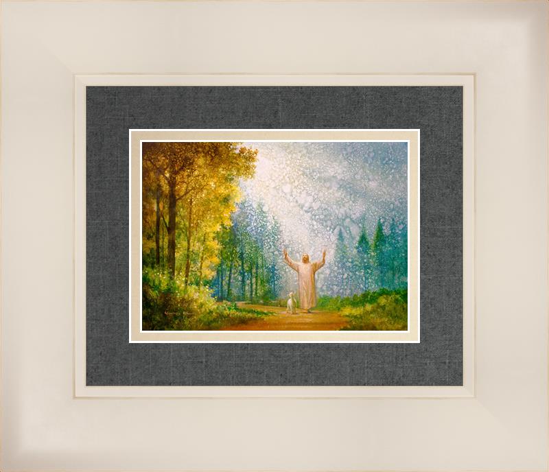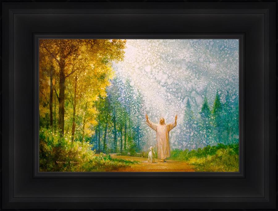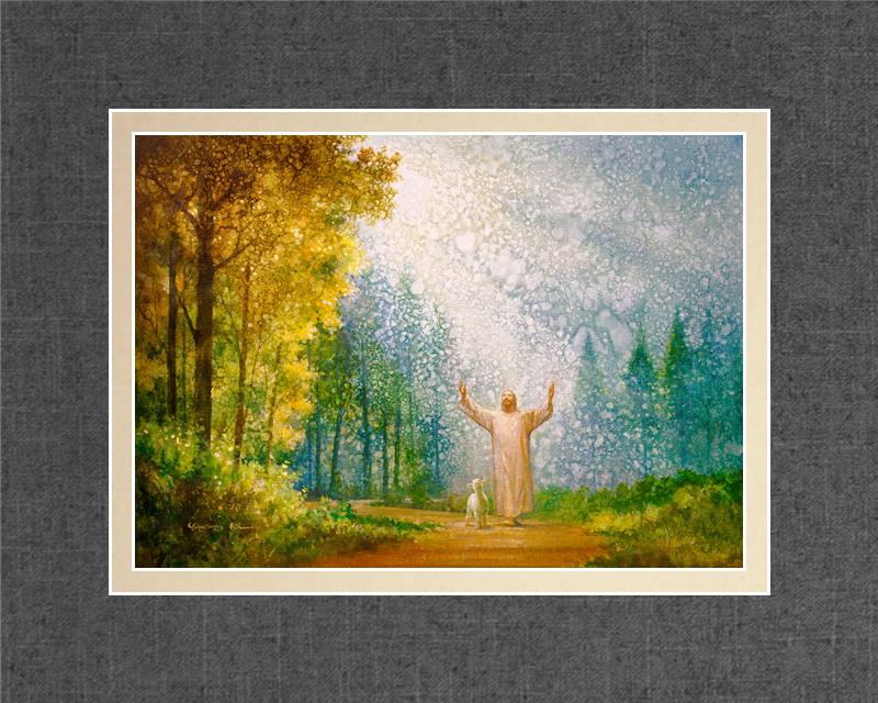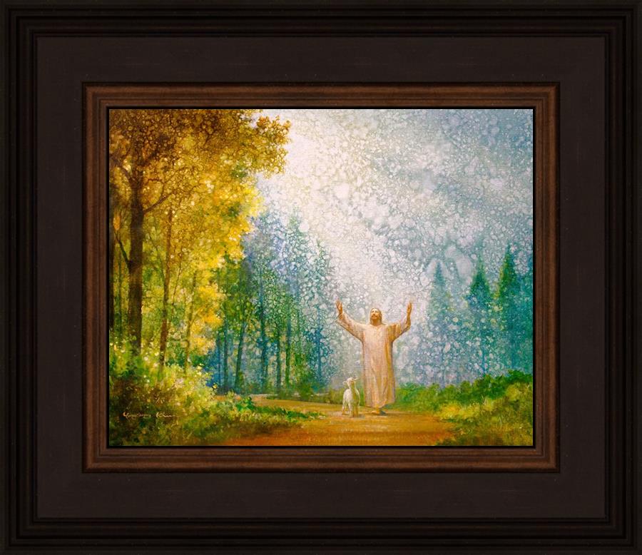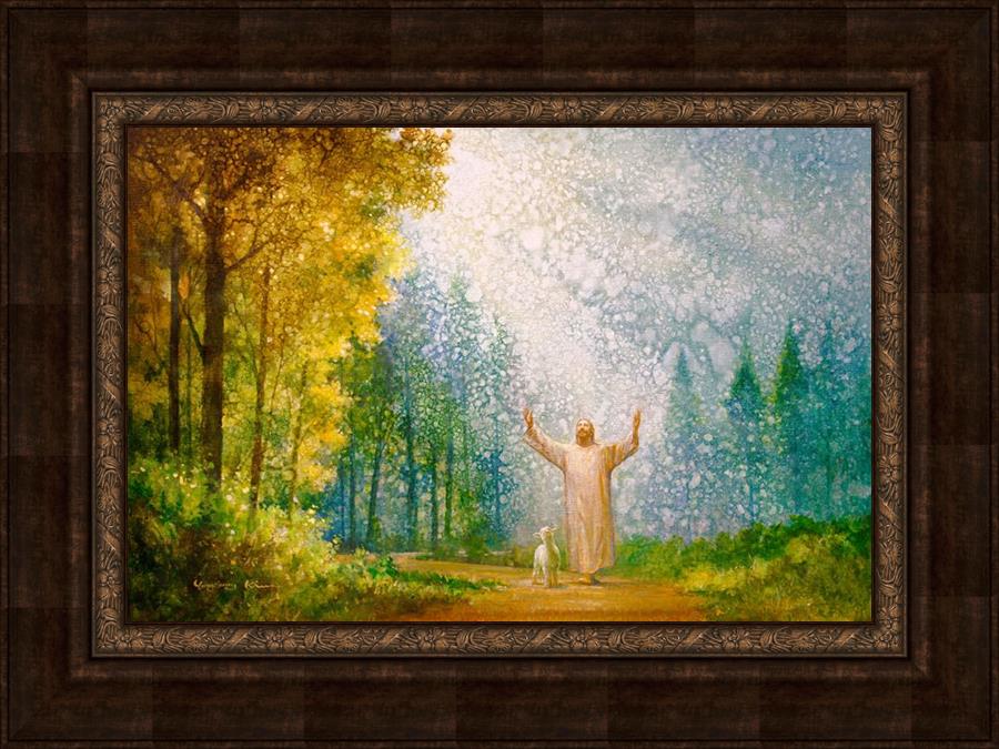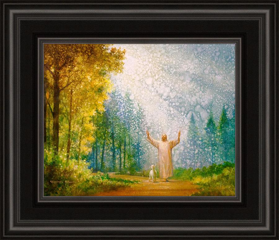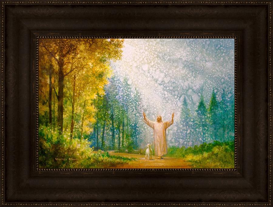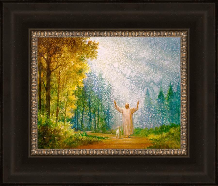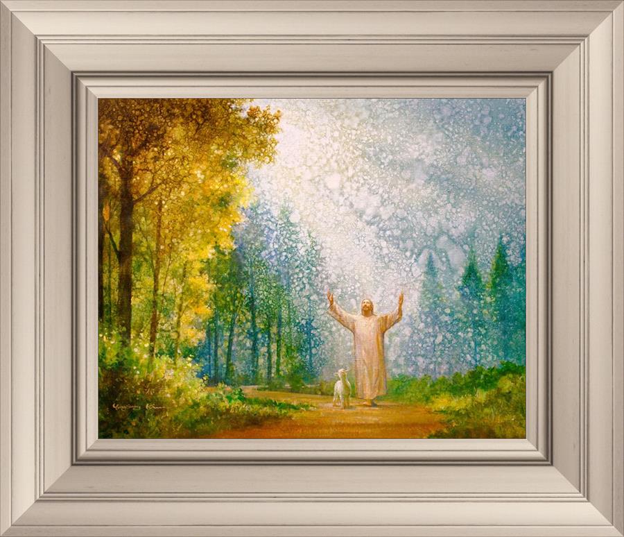 Oh My Father by Yongsung Kim depicts Jesus Christ with arms raised looking toward heaven with a lamb by his side and rays of light hitting Him through tall yellow trees. This painting is available in print and canvas.