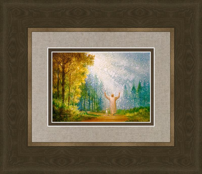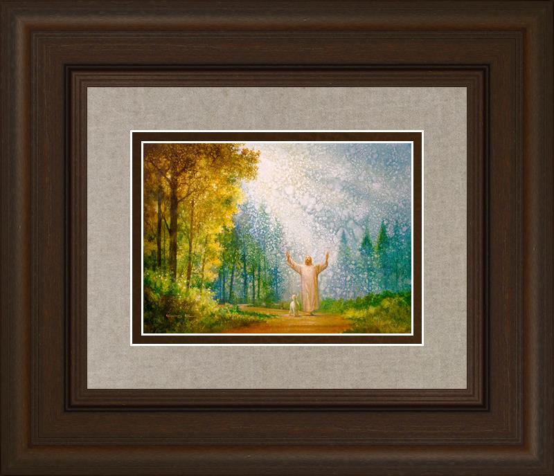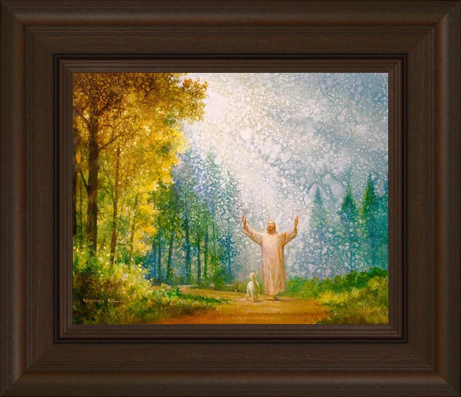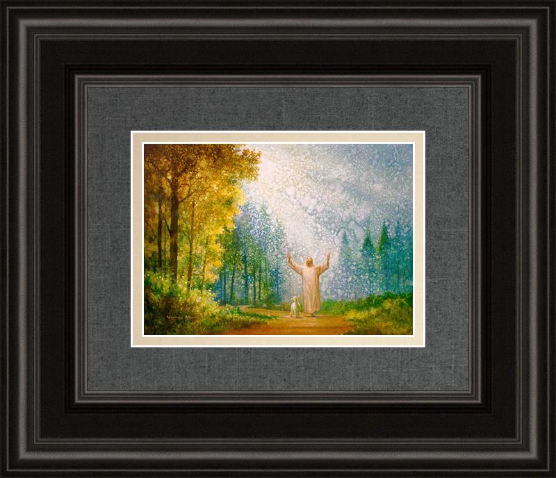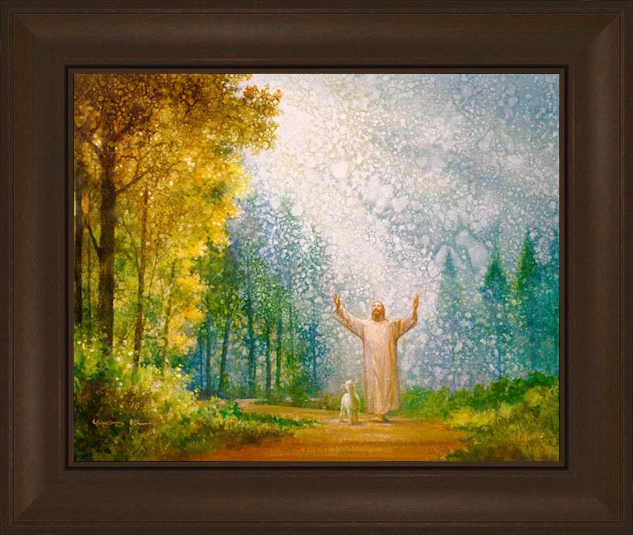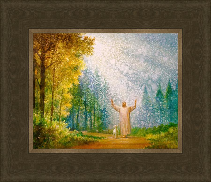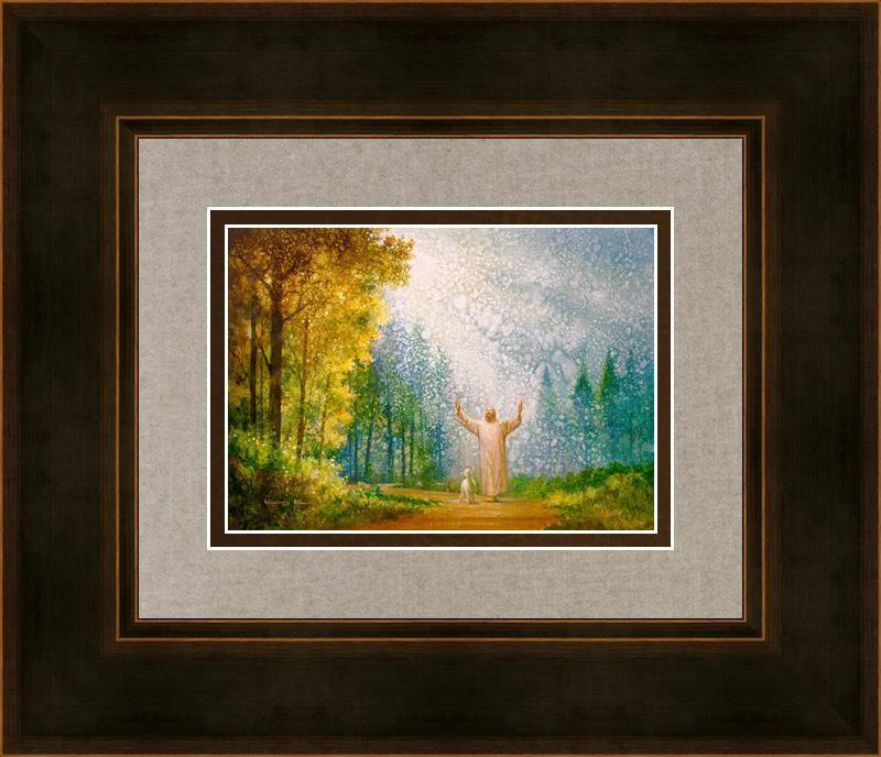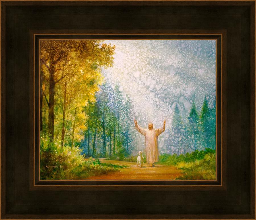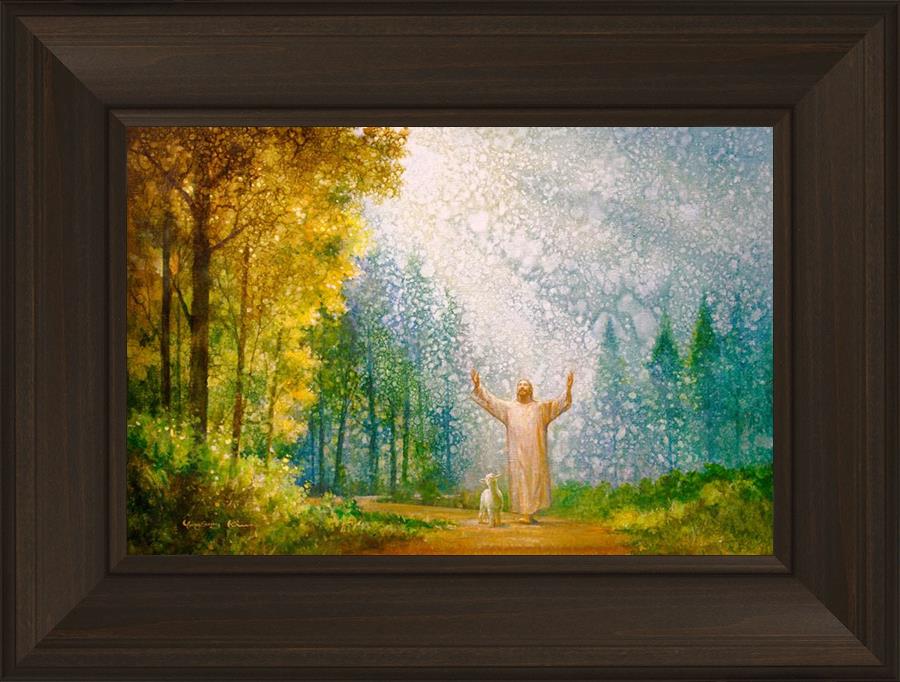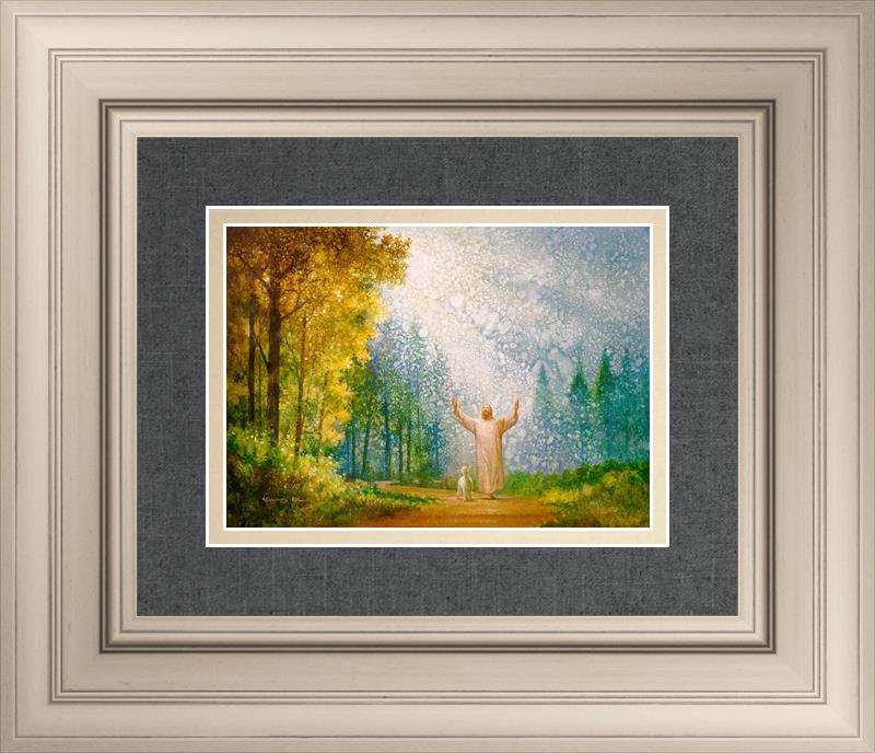 Oh My Father by Yongsung Kim depicts Jesus Christ with arms raised looking toward heaven with a lamb by his side and rays of light hitting Him through tall yellow trees. This painting is available in print and canvas.