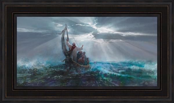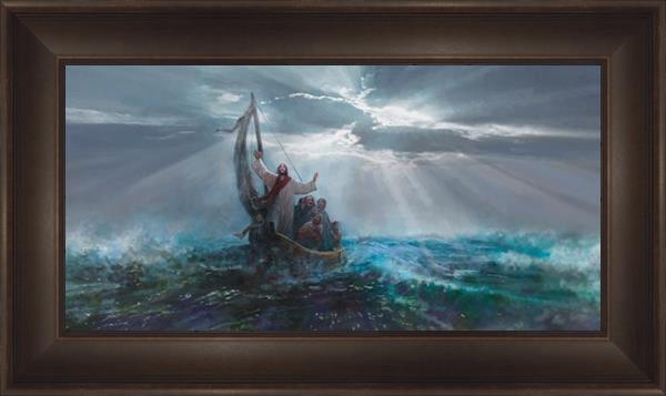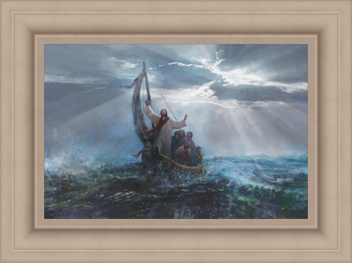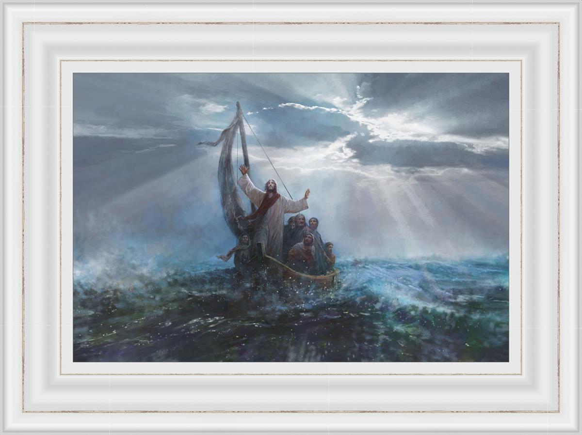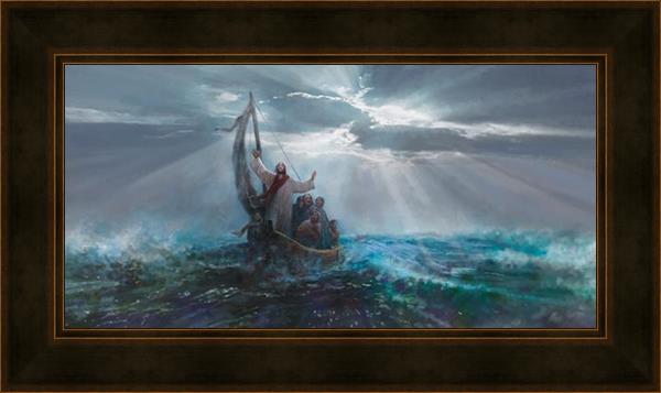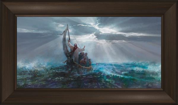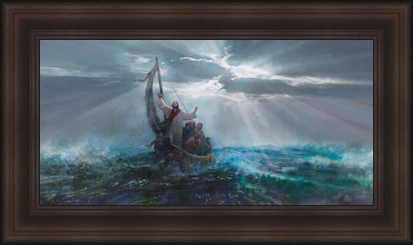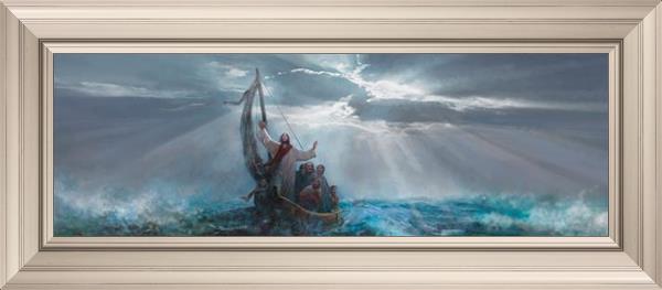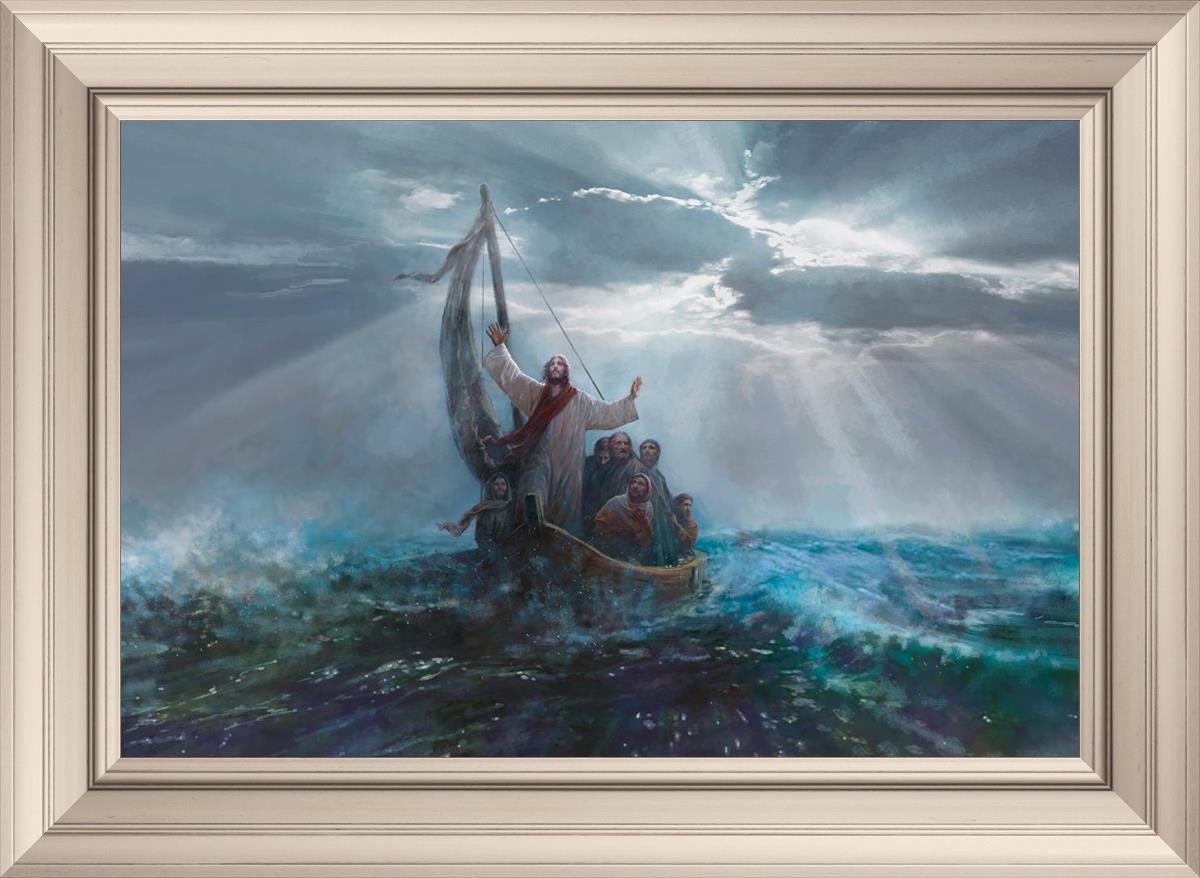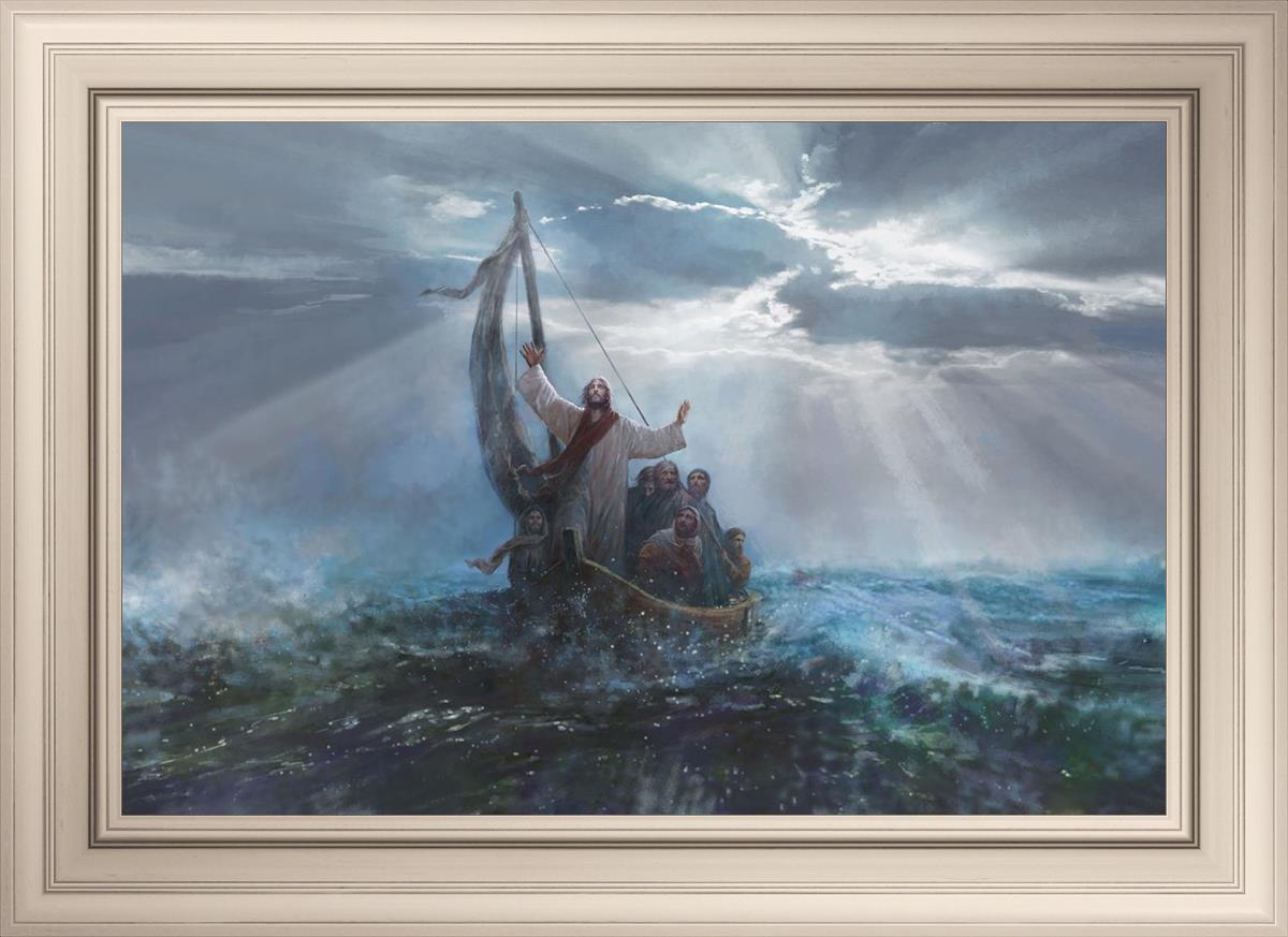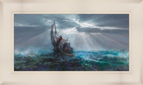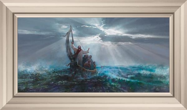 Peace Be Still by Yongsung Kim depicts Jesus on the sea with His arms raised to heaven calming the storm from a boat with his disciples. This painting is available in print and canvas.