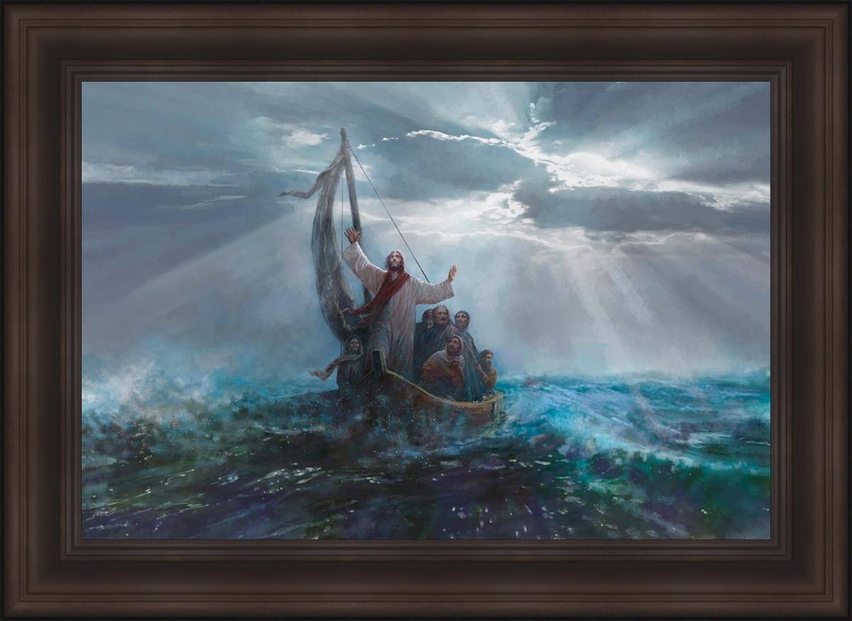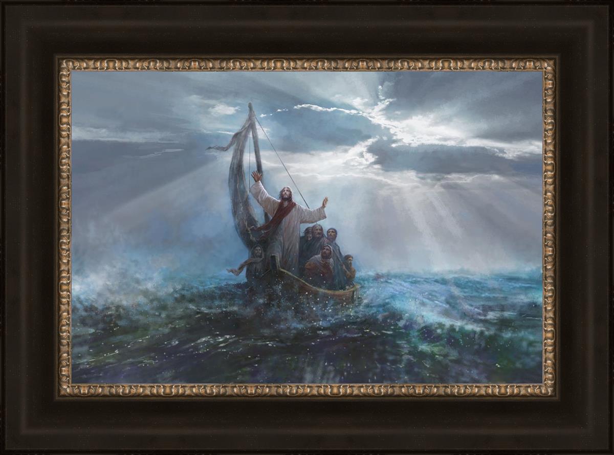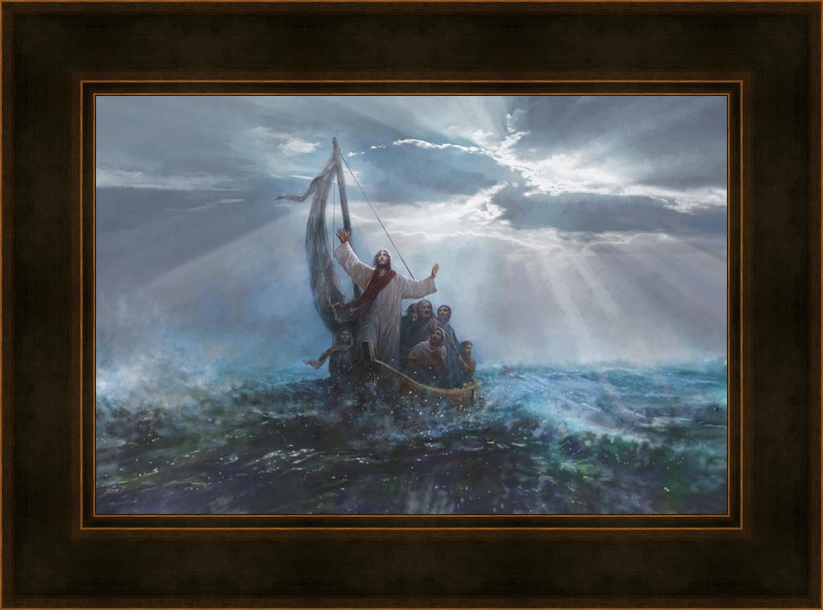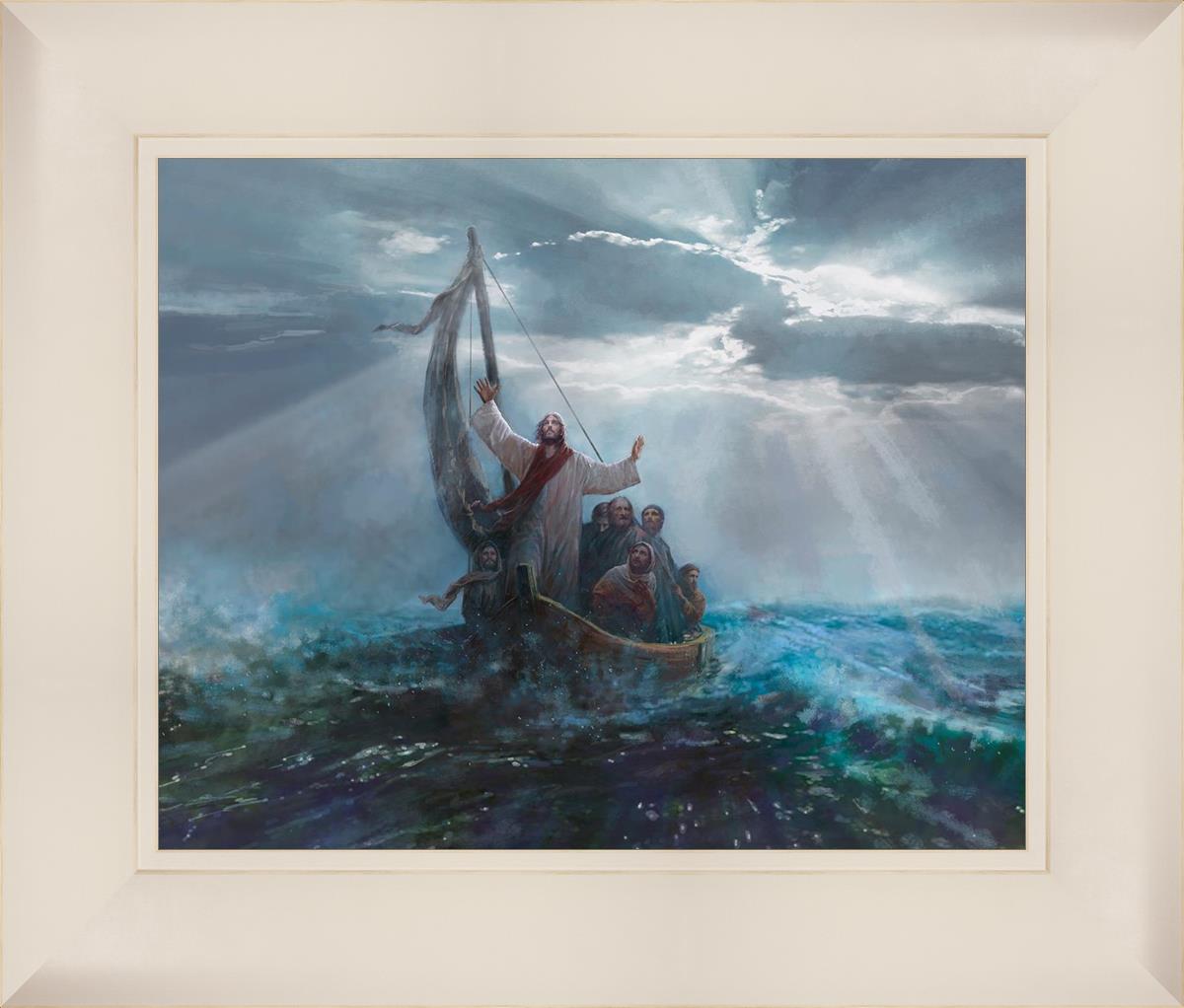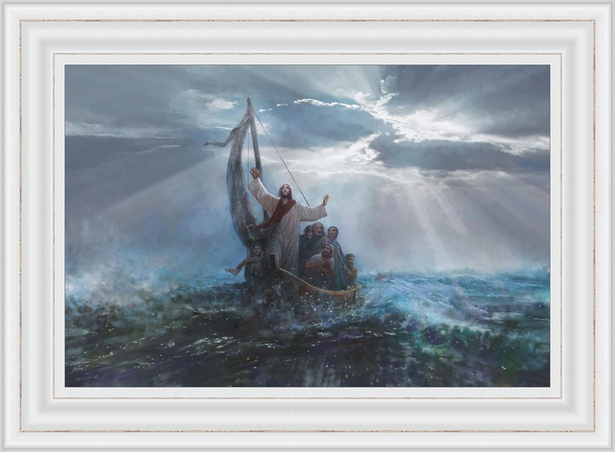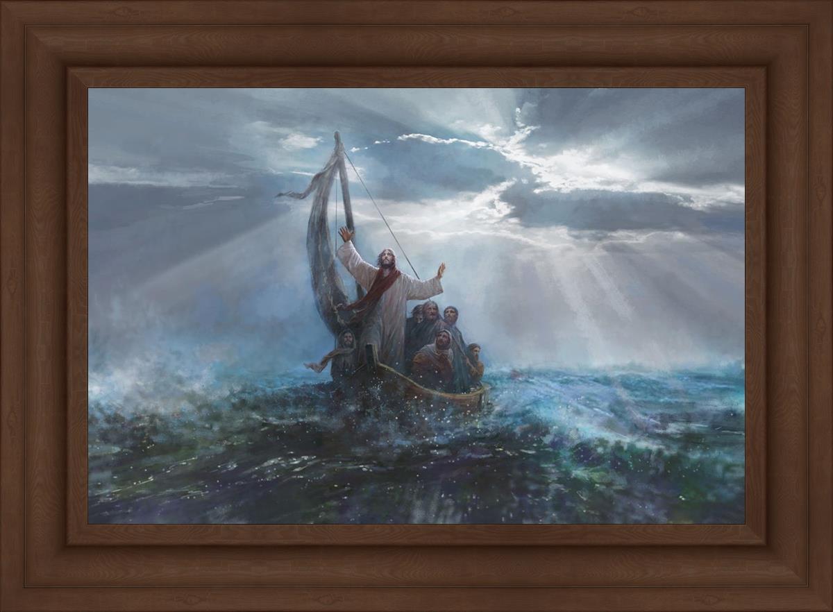 Peace Be Still by Yongsung Kim depicts Jesus on the sea with His arms raised to heaven calming the storm from a boat with his disciples. This painting is available in print and canvas.