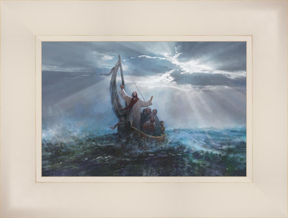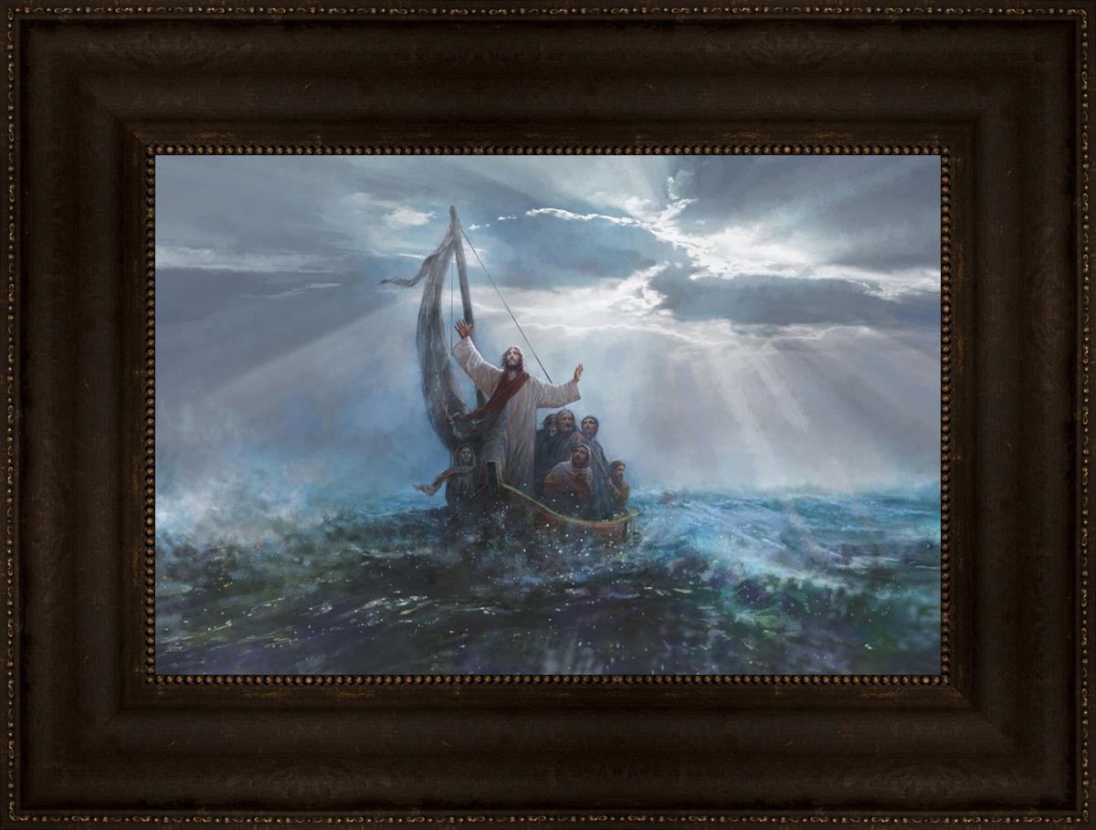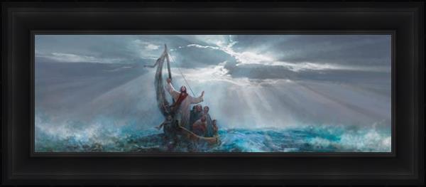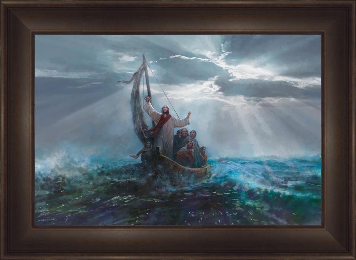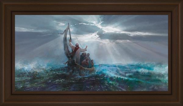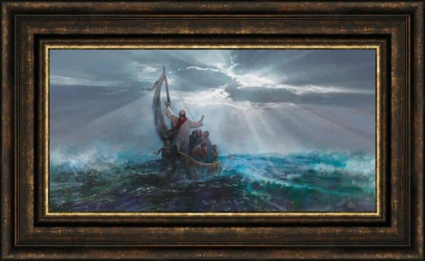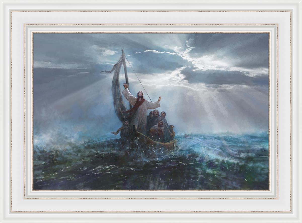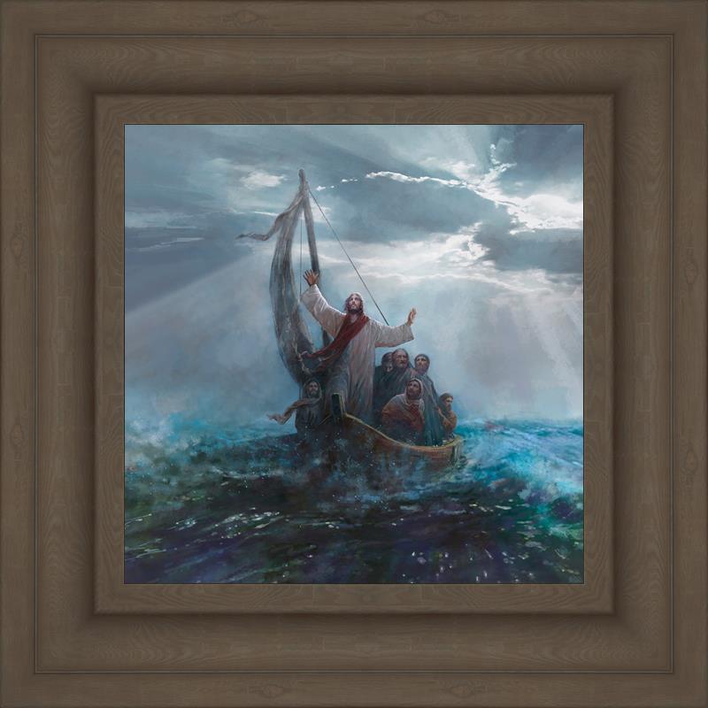 Peace Be Still by Yongsung Kim depicts Jesus on the sea with His arms raised to heaven calming the storm from a boat with his disciples. This painting is available in print and canvas.