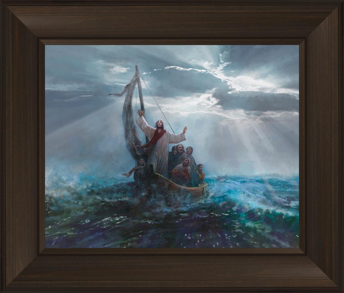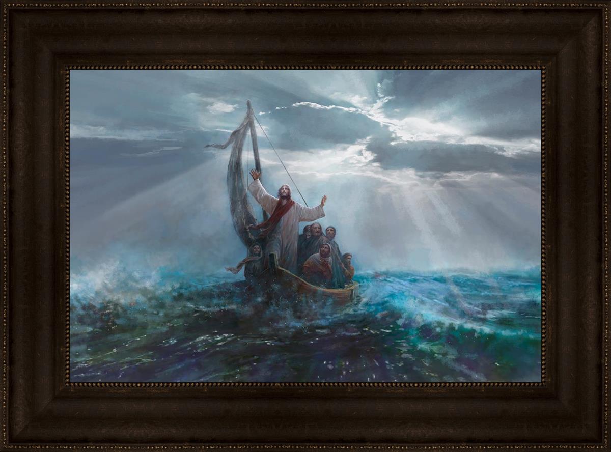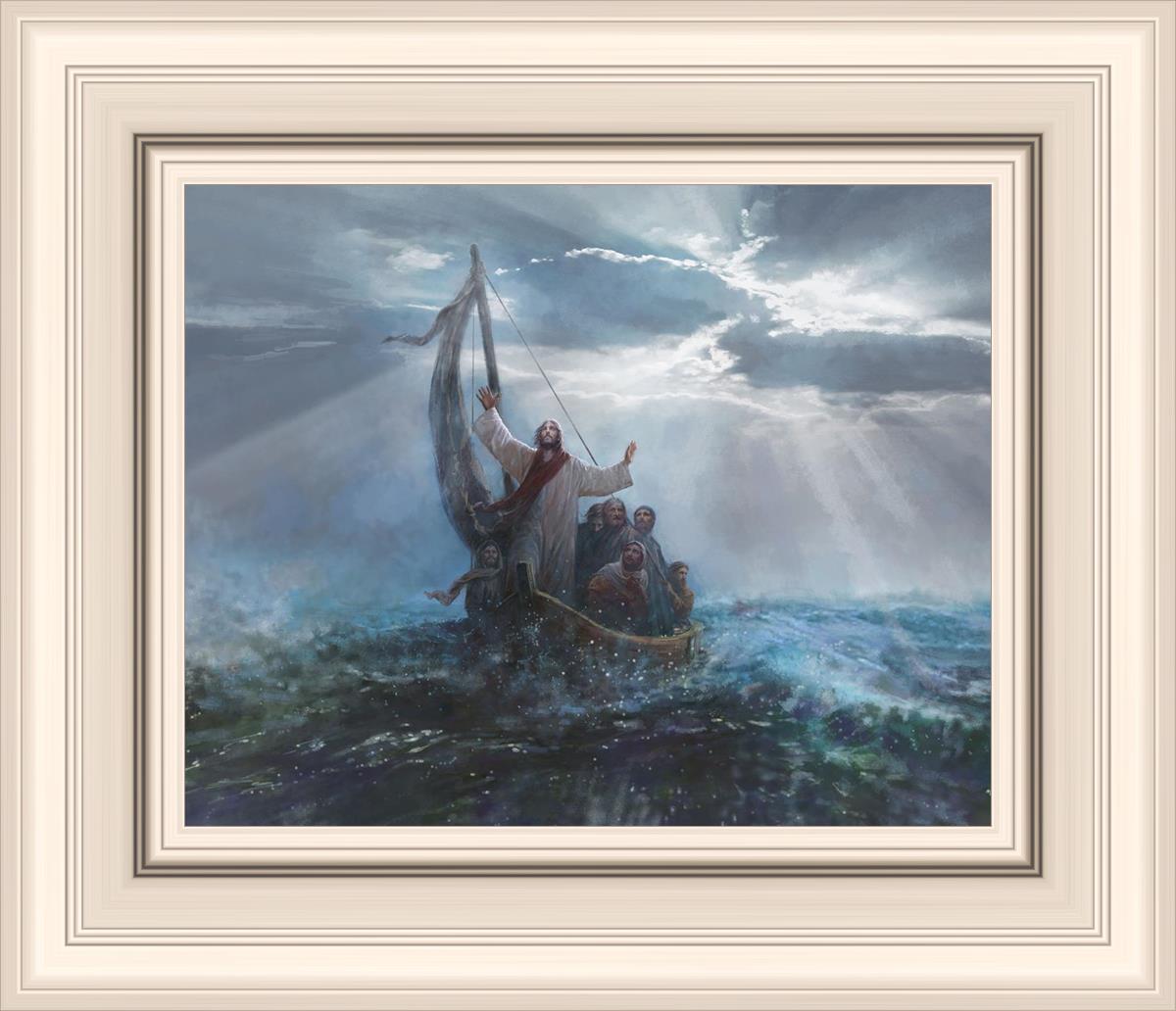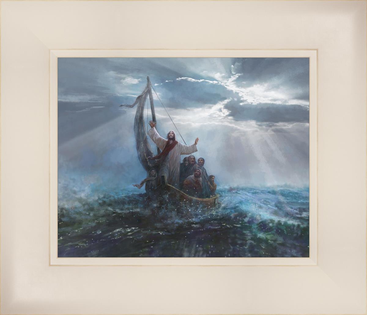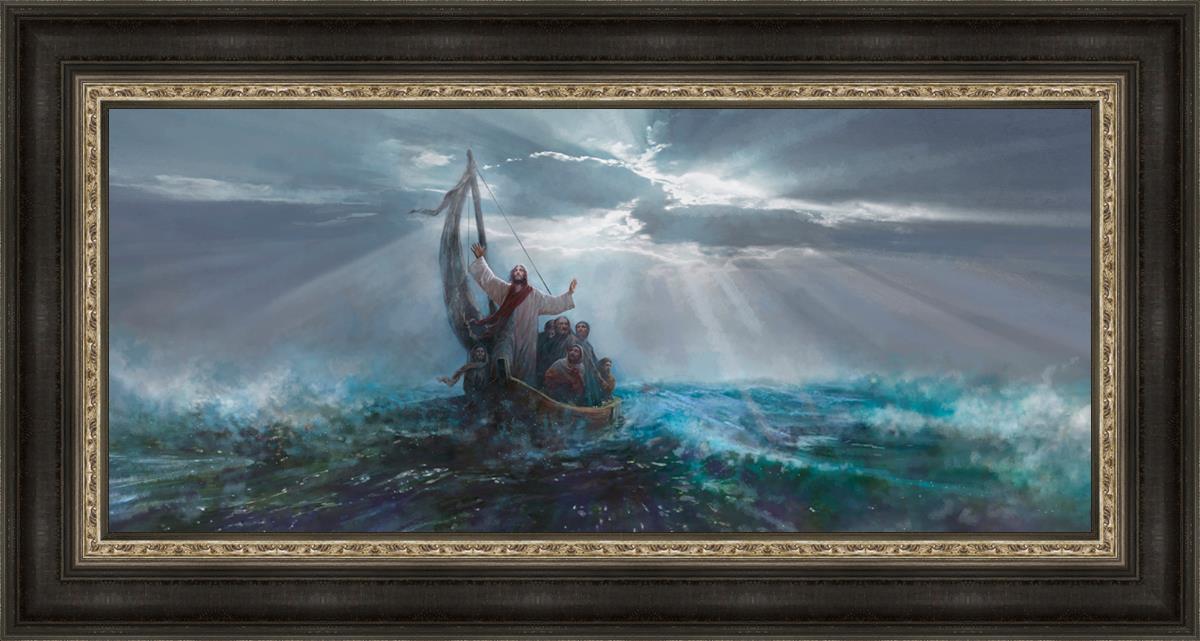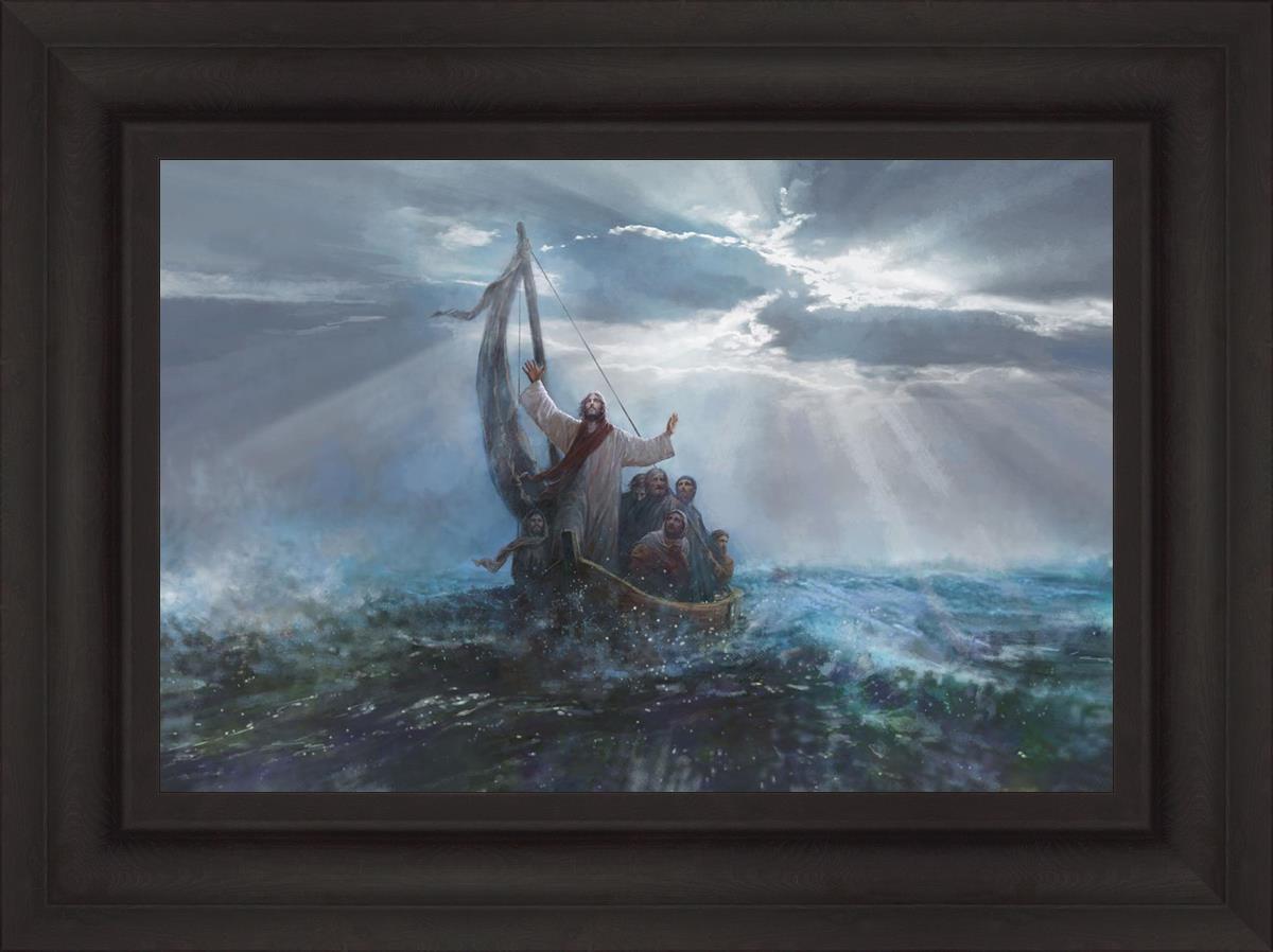 Peace Be Still by Yongsung Kim depicts Jesus on the sea with His arms raised to heaven calming the storm from a boat with his disciples. This painting is available in print and canvas.