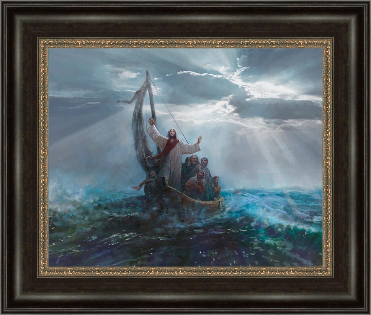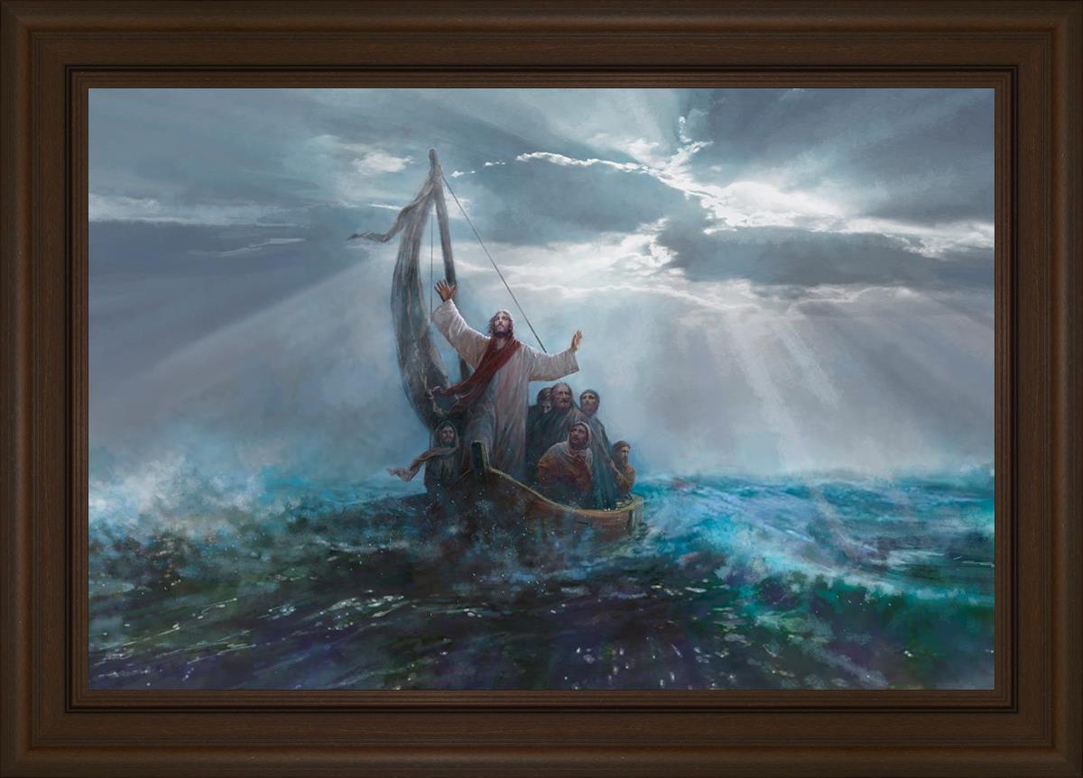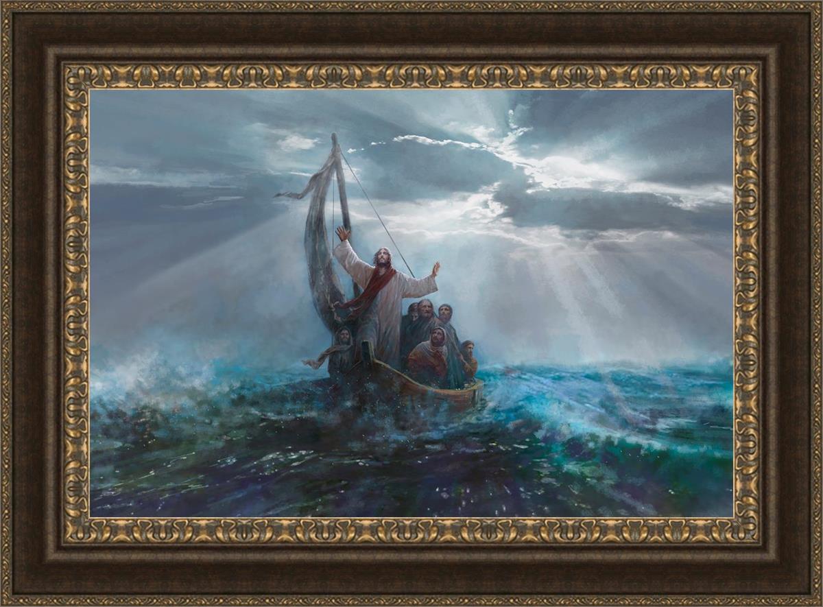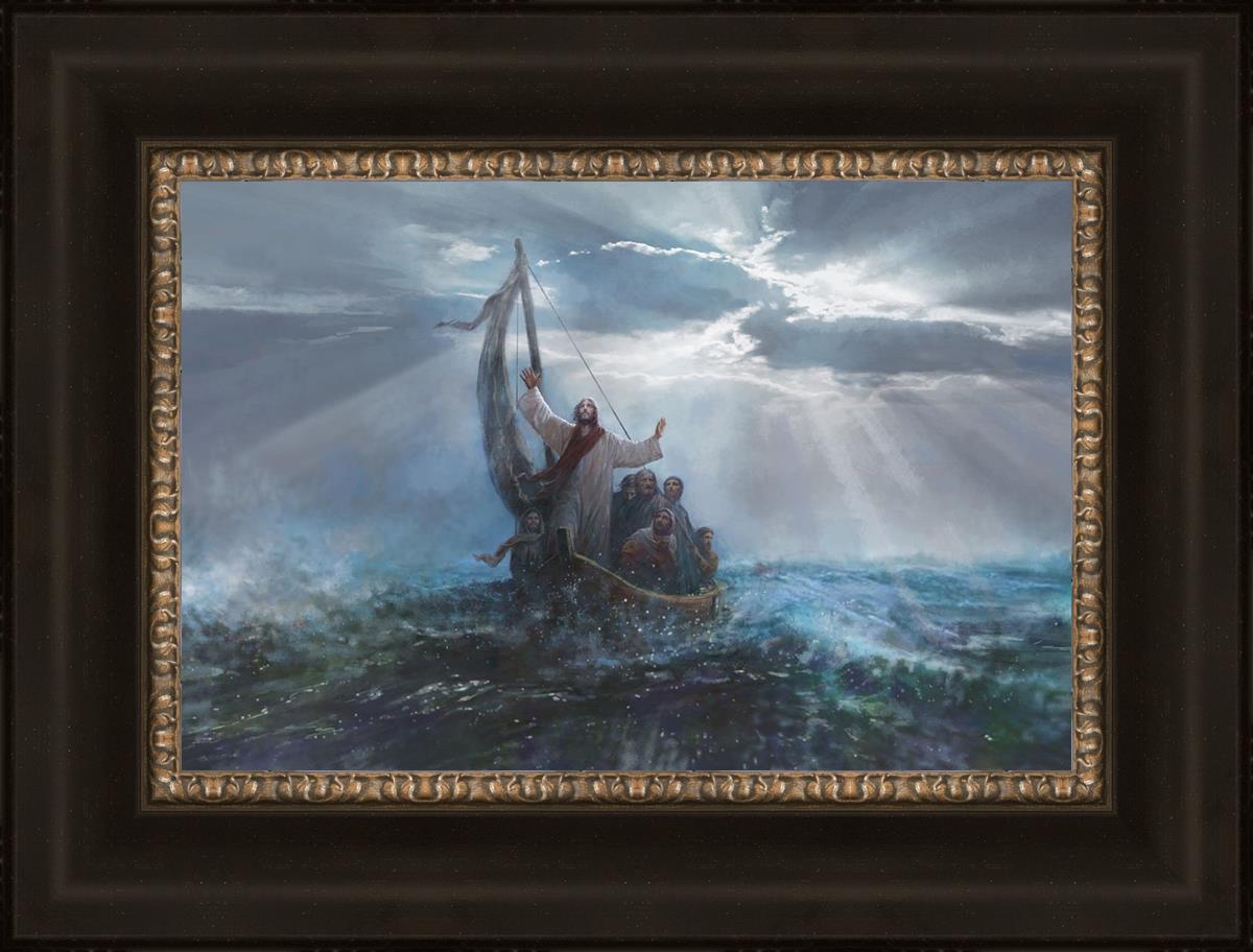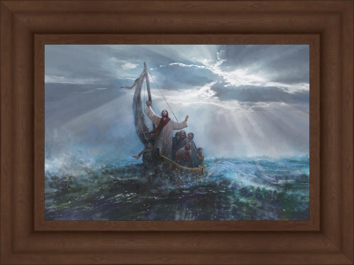 Peace Be Still by Yongsung Kim depicts Jesus on the sea with His arms raised to heaven calming the storm from a boat with his disciples. This painting is available in print and canvas.
