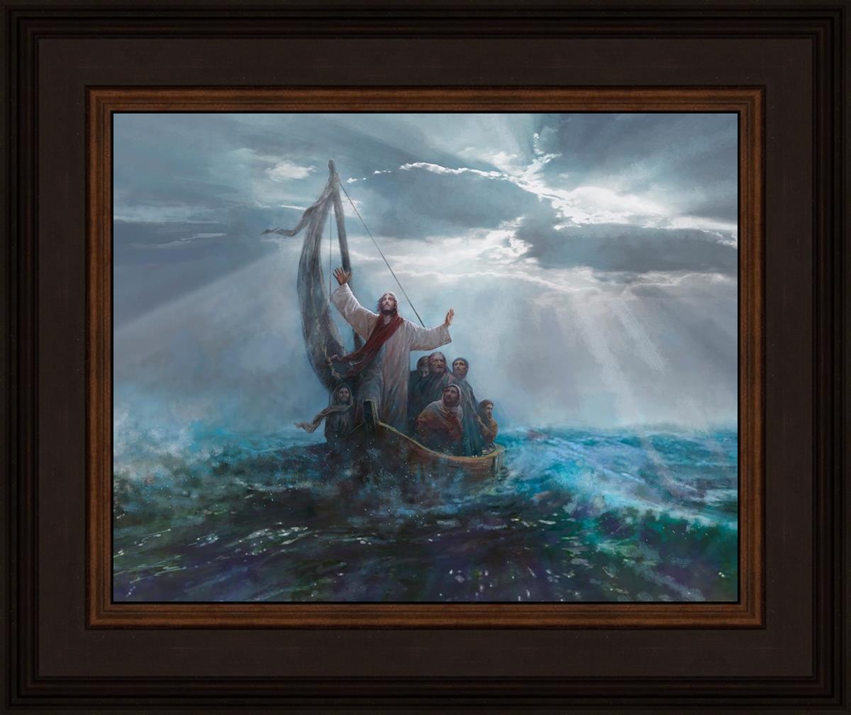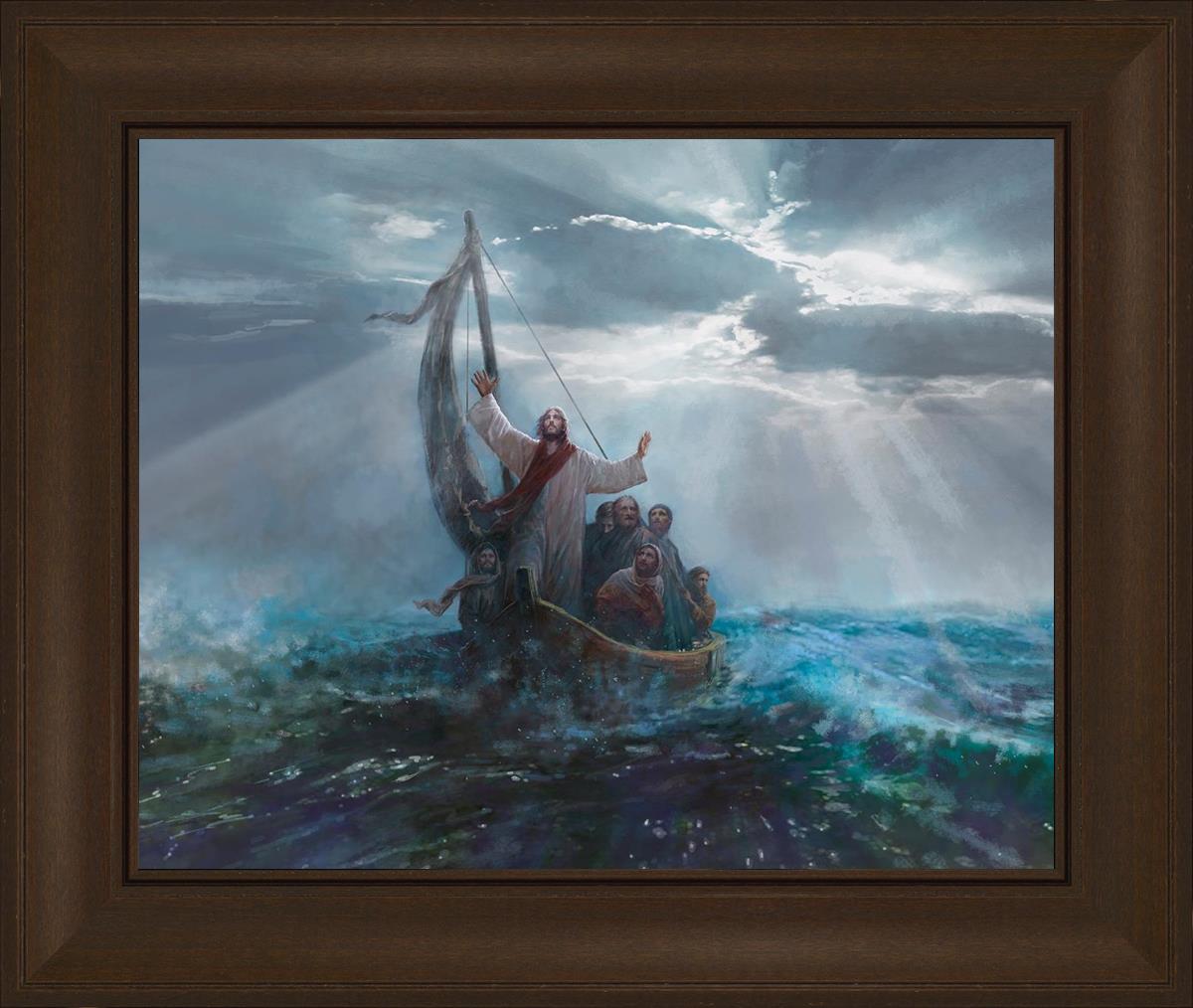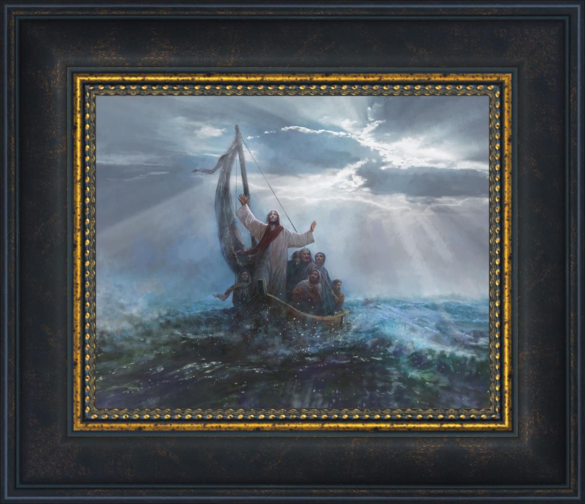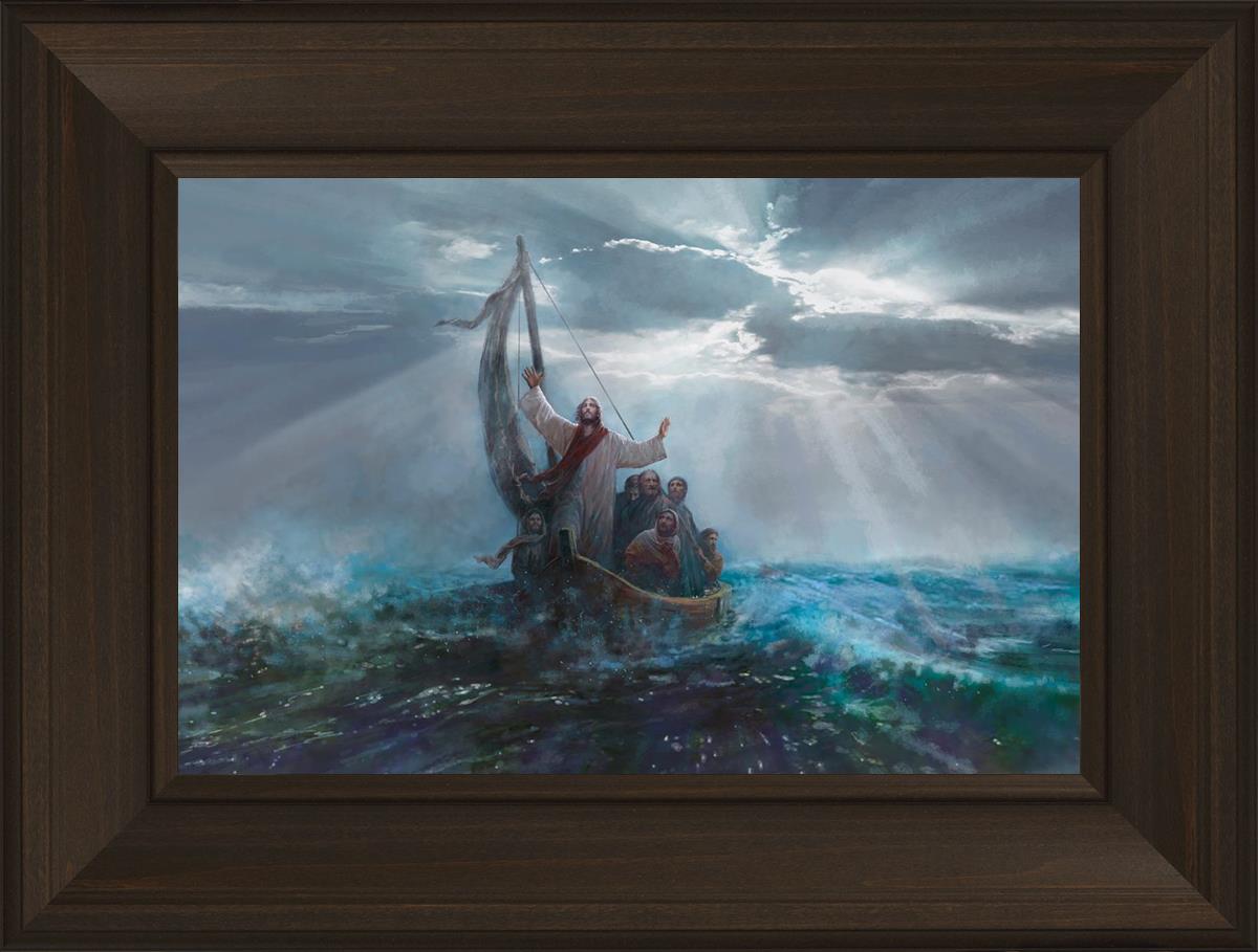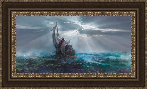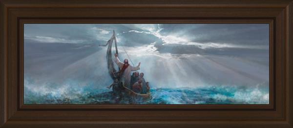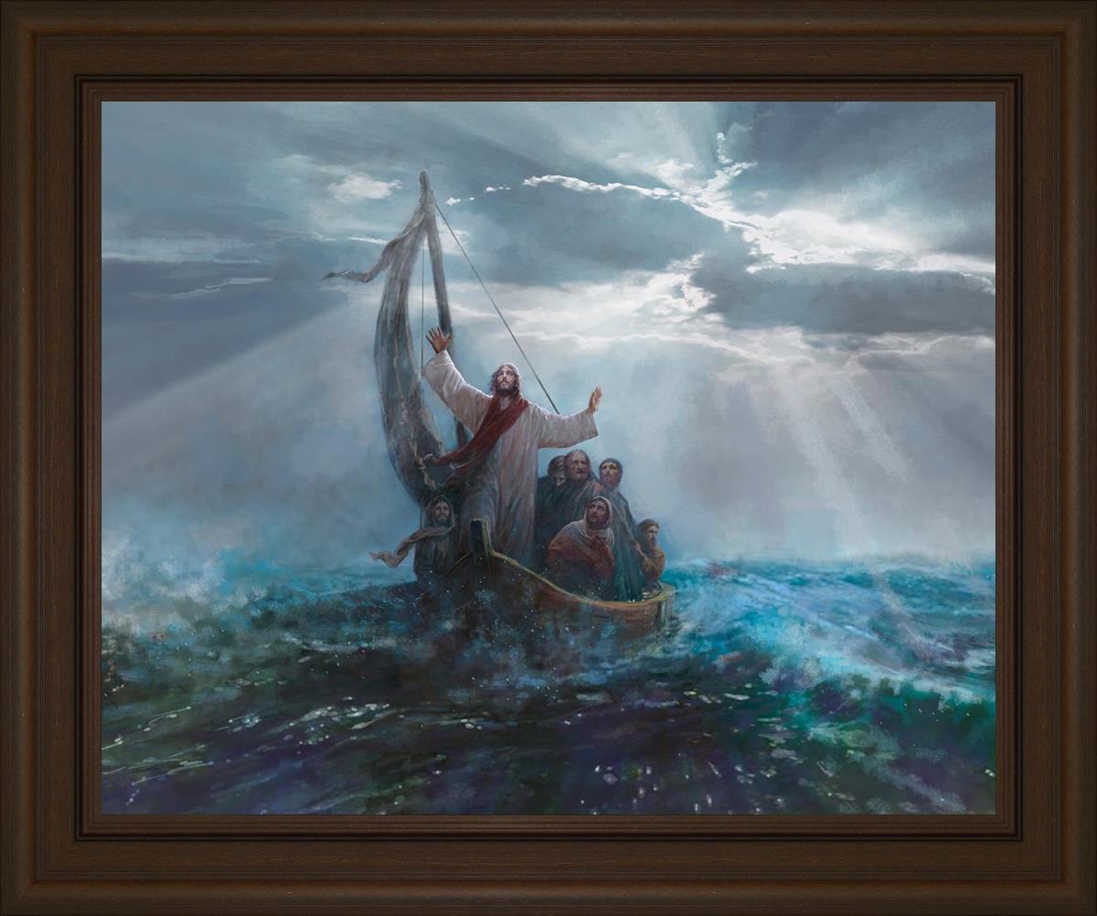 Peace Be Still by Yongsung Kim depicts Jesus on the sea with His arms raised to heaven calming the storm from a boat with his disciples. This painting is available in print and canvas.