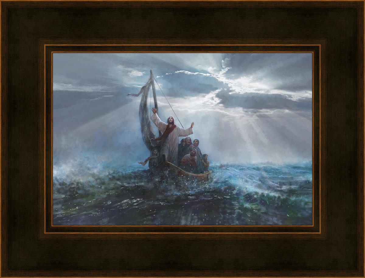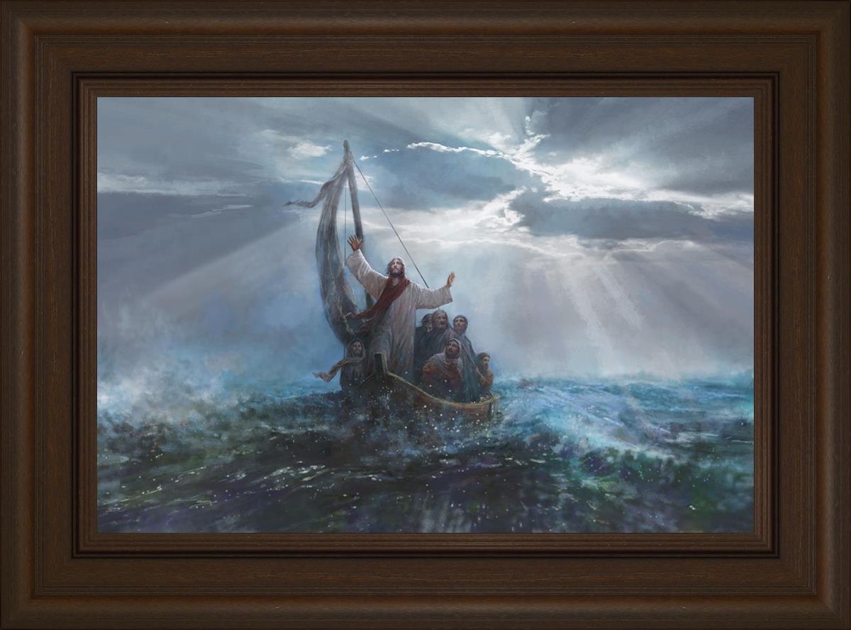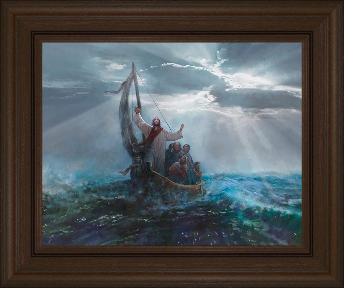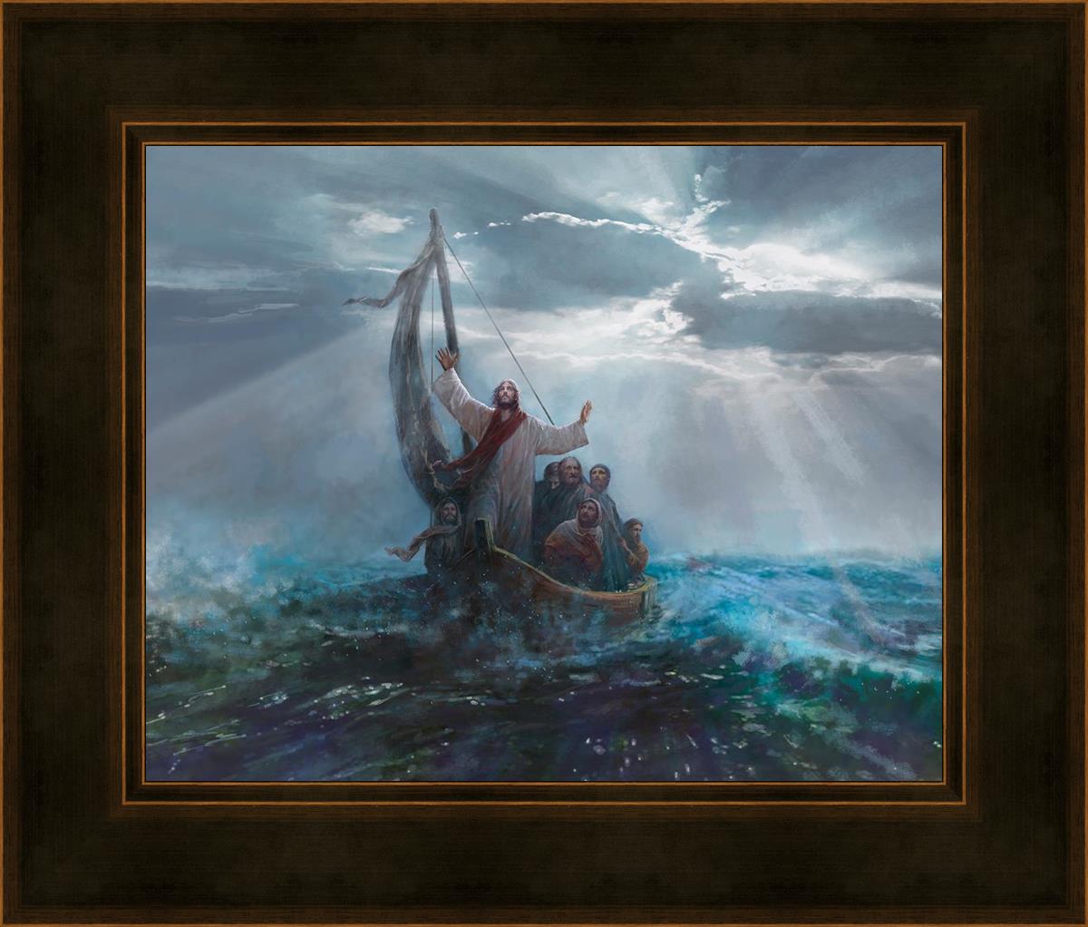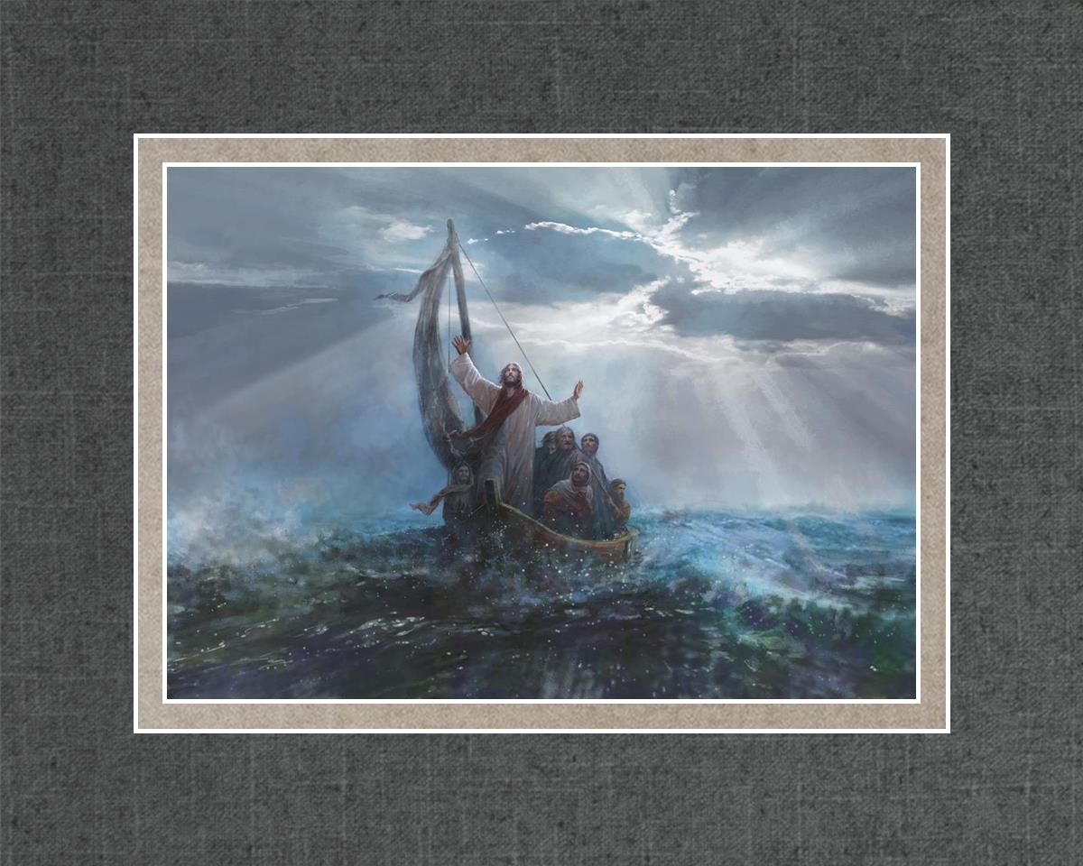 Peace Be Still by Yongsung Kim depicts Jesus on the sea with His arms raised to heaven calming the storm from a boat with his disciples. This painting is available in print and canvas.