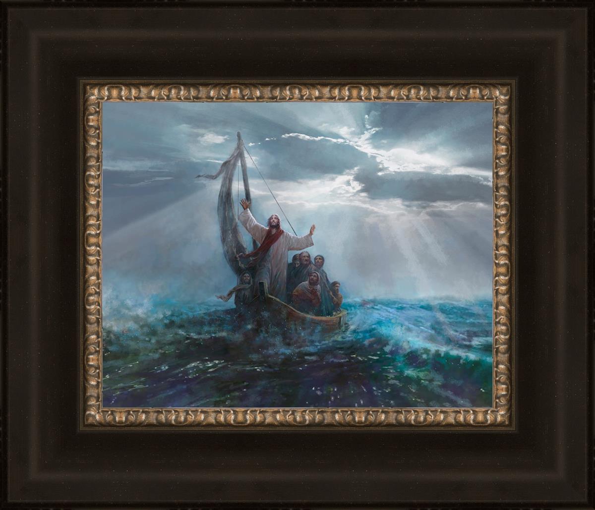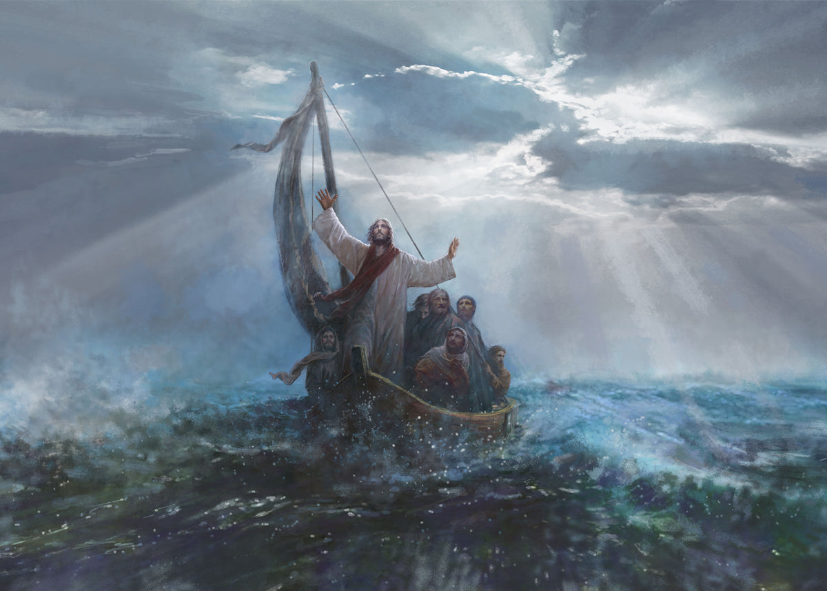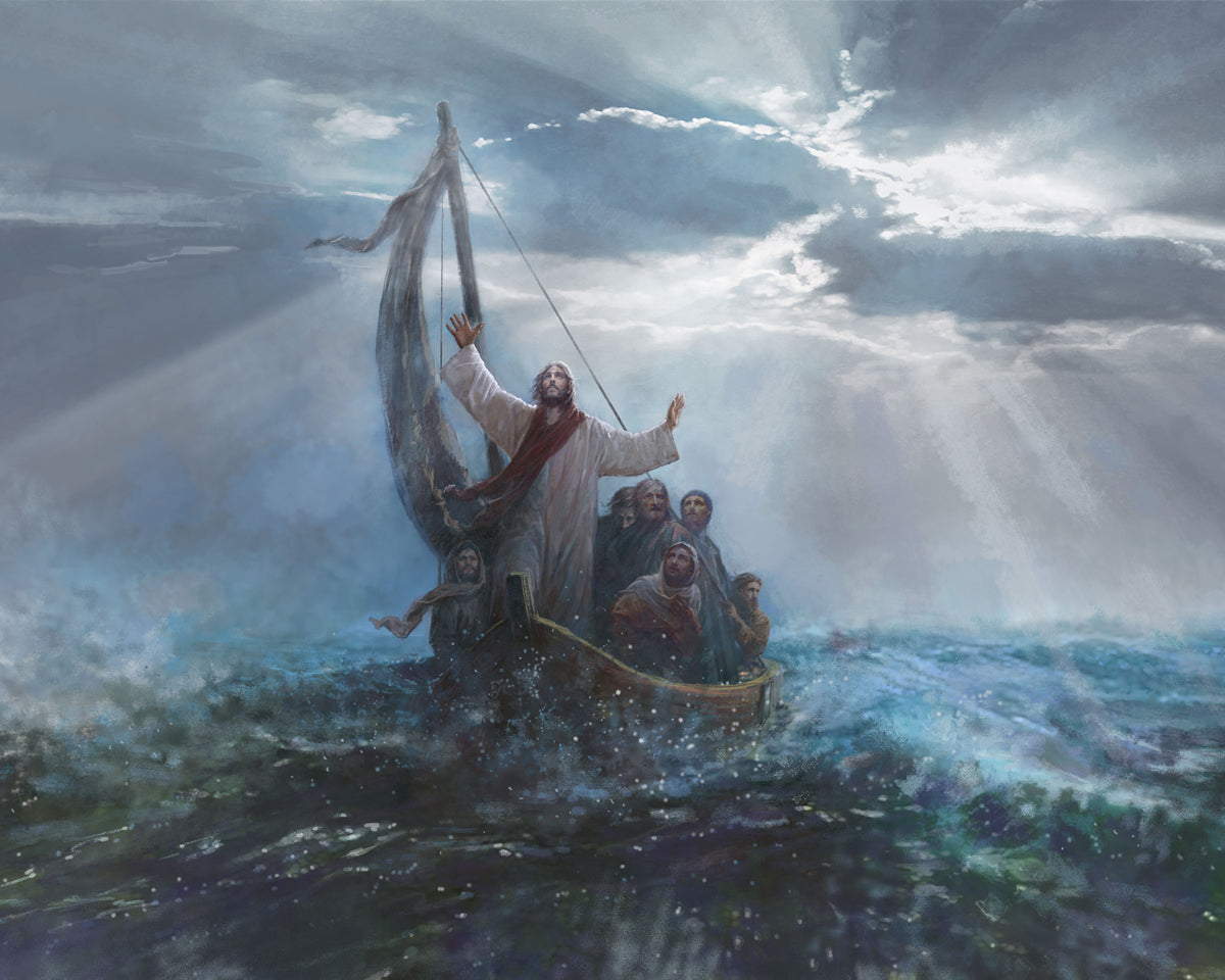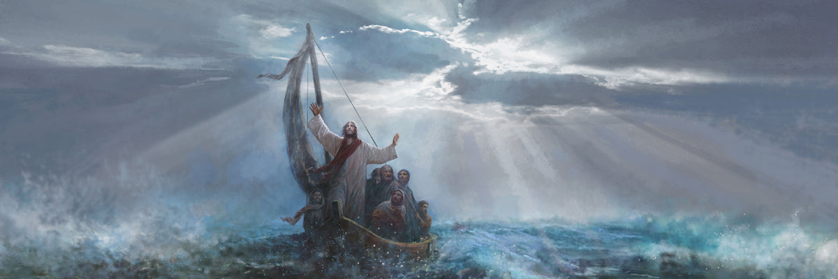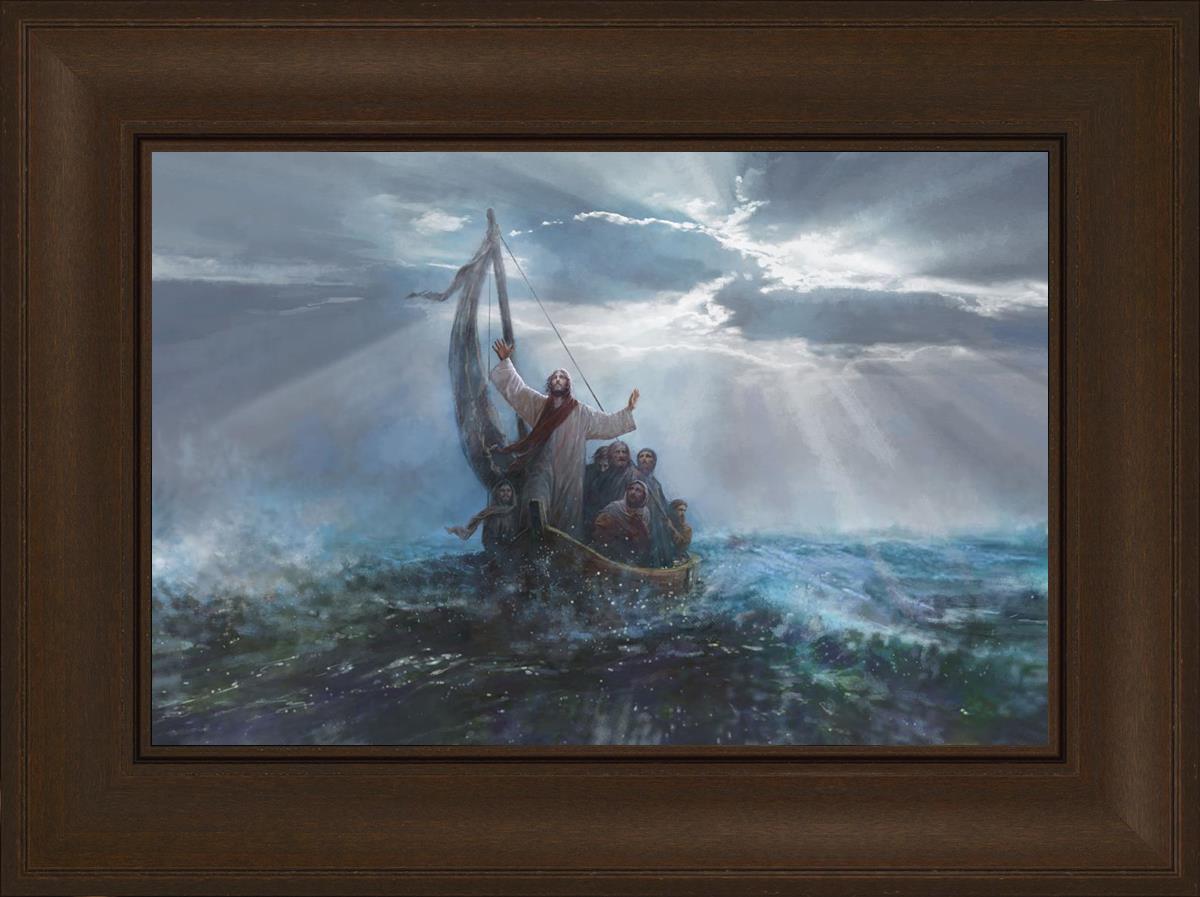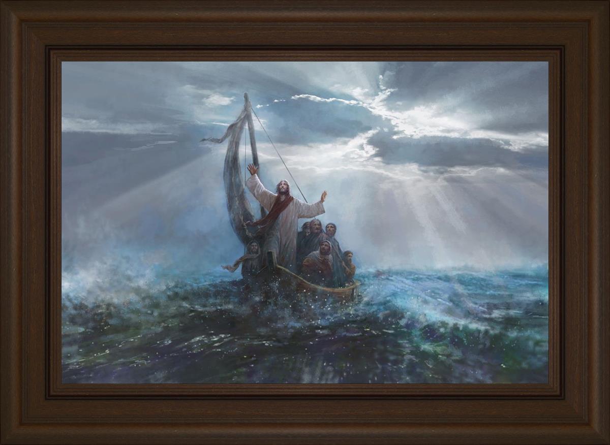 Peace Be Still by Yongsung Kim depicts Jesus on the sea with His arms raised to heaven calming the storm from a boat with his disciples. This painting is available in print and canvas.