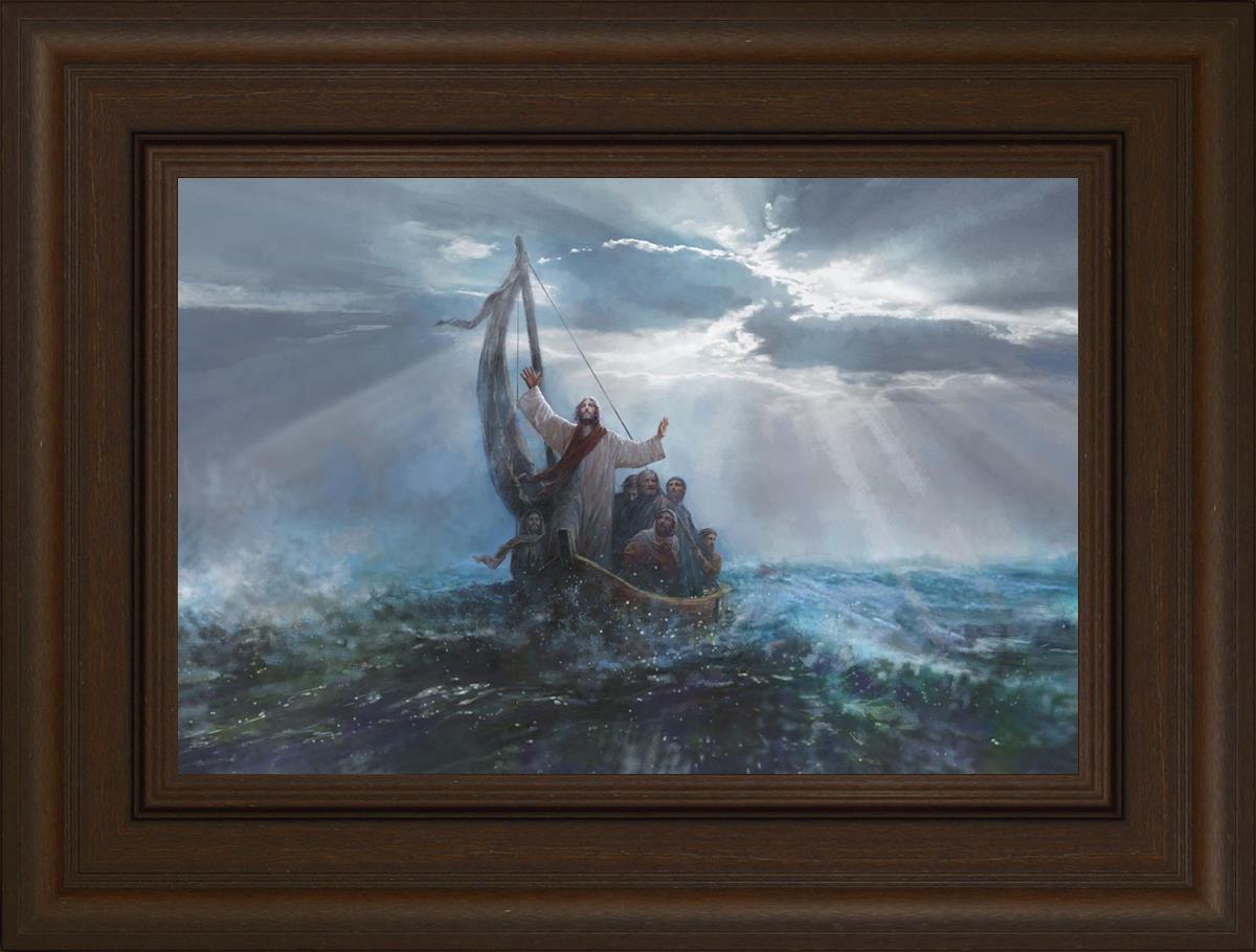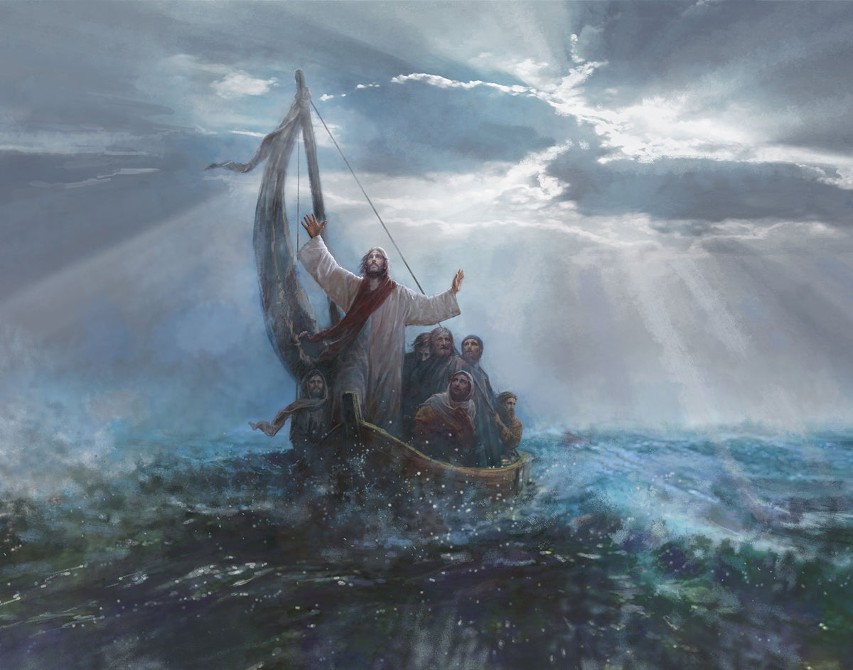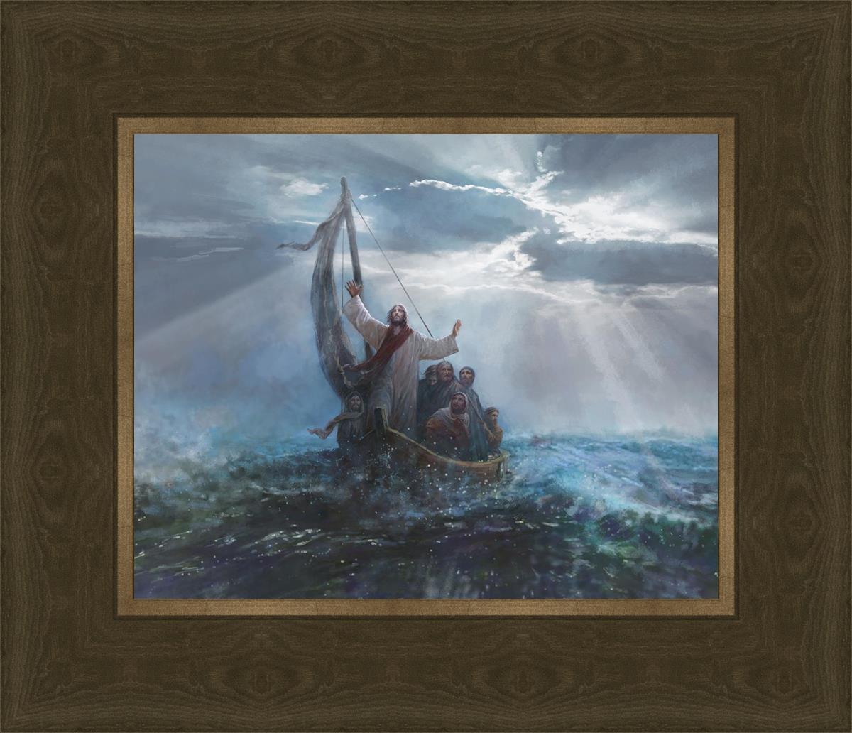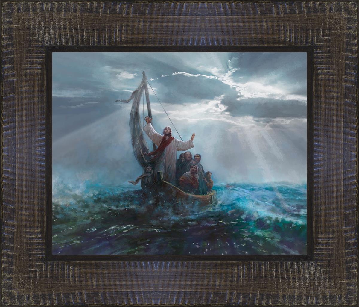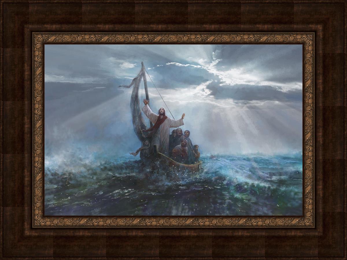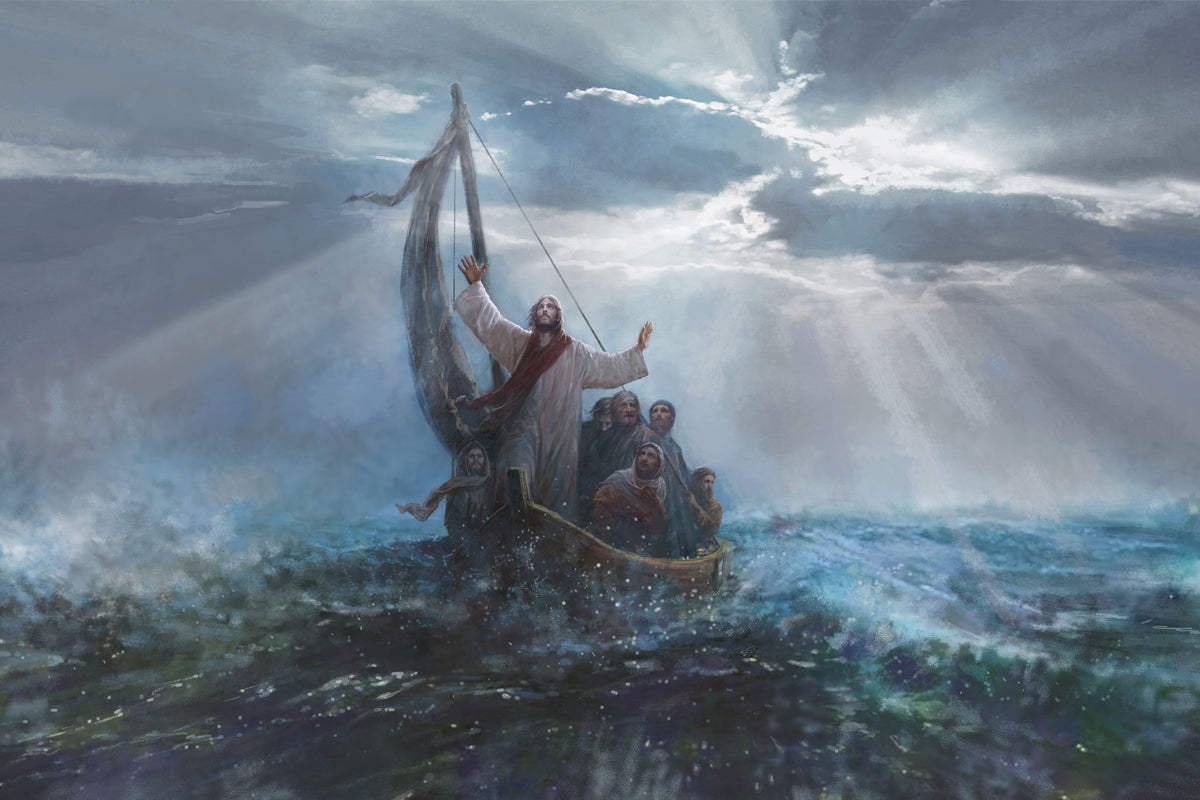 Peace Be Still by Yongsung Kim depicts Jesus on the sea with His arms raised to heaven calming the storm from a boat with his disciples. This painting is available in print and canvas.