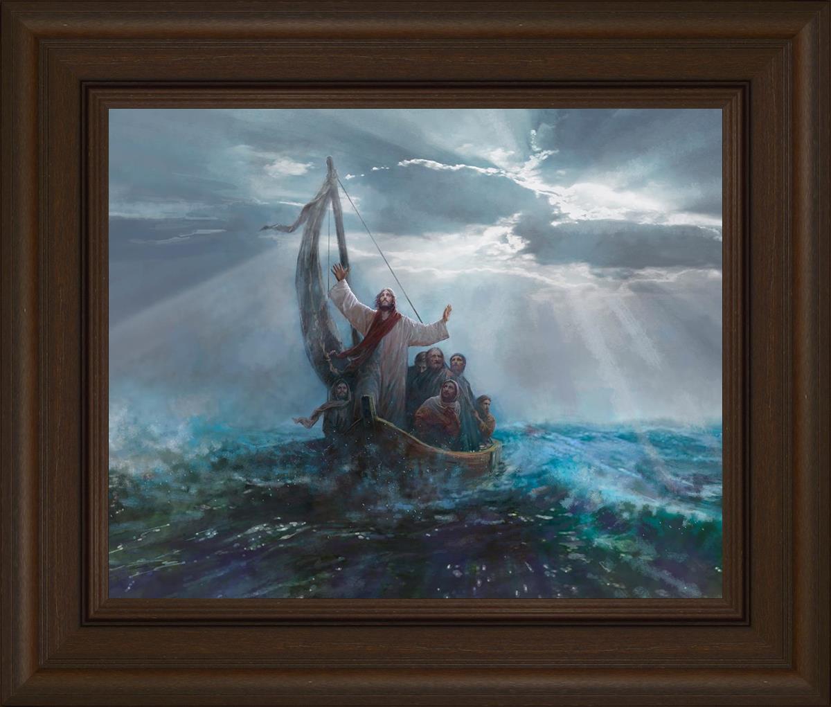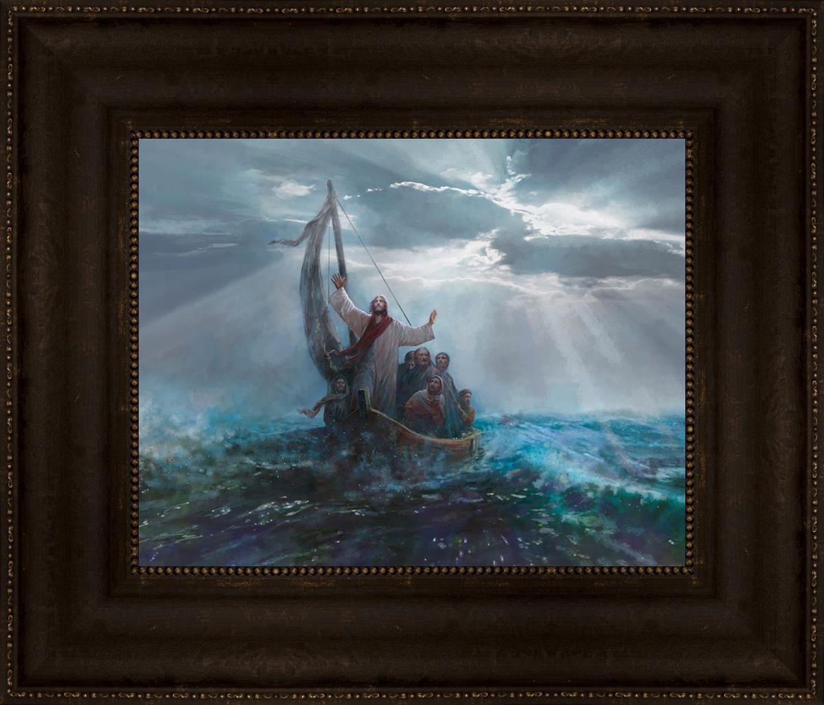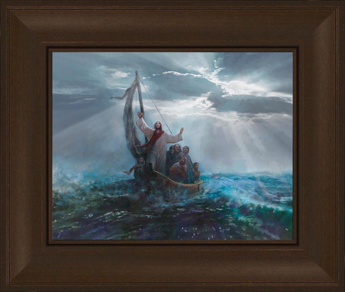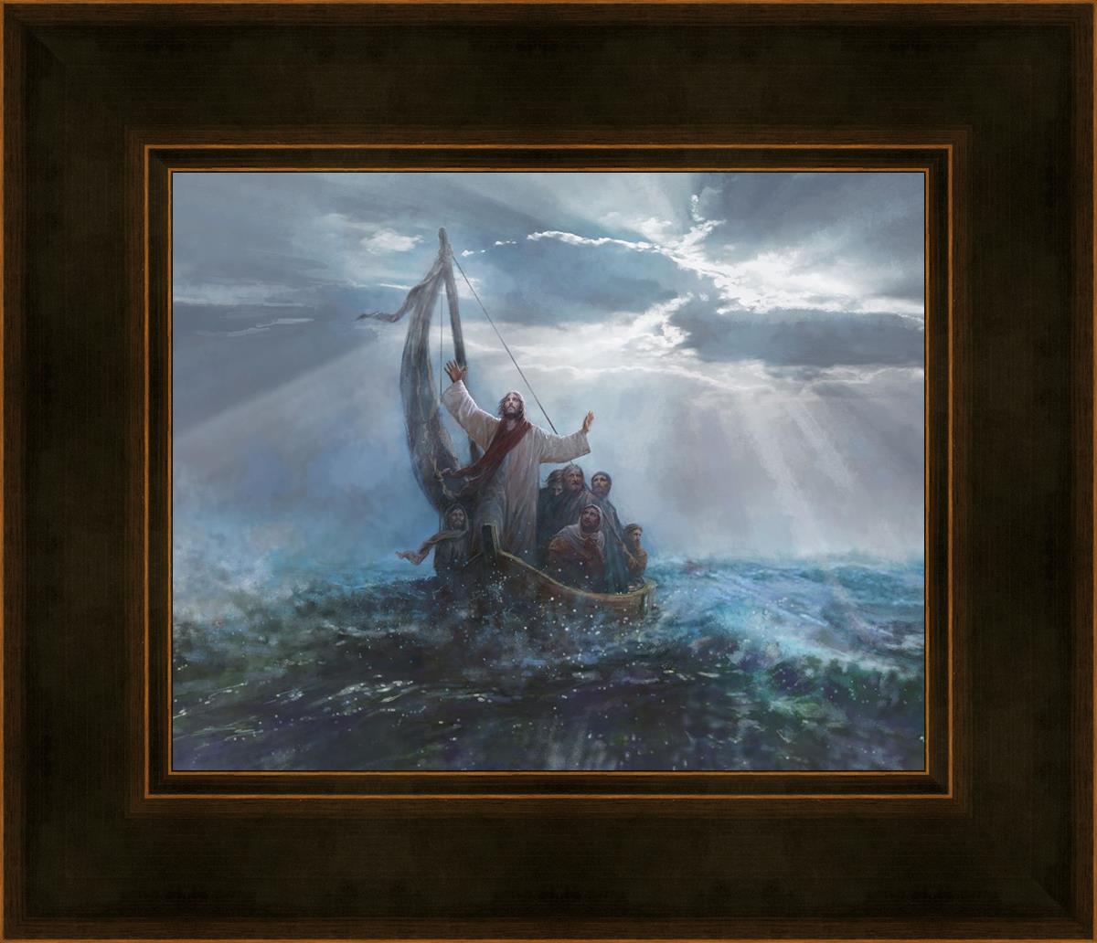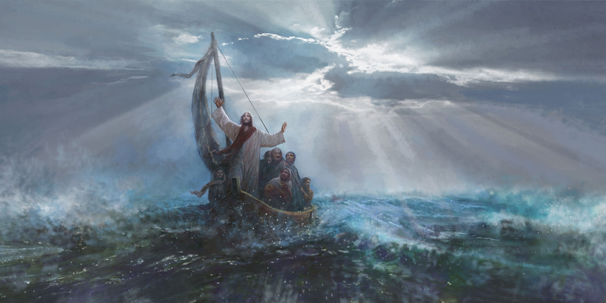 Peace Be Still by Yongsung Kim depicts Jesus on the sea with His arms raised to heaven calming the storm from a boat with his disciples. This painting is available in print and canvas.