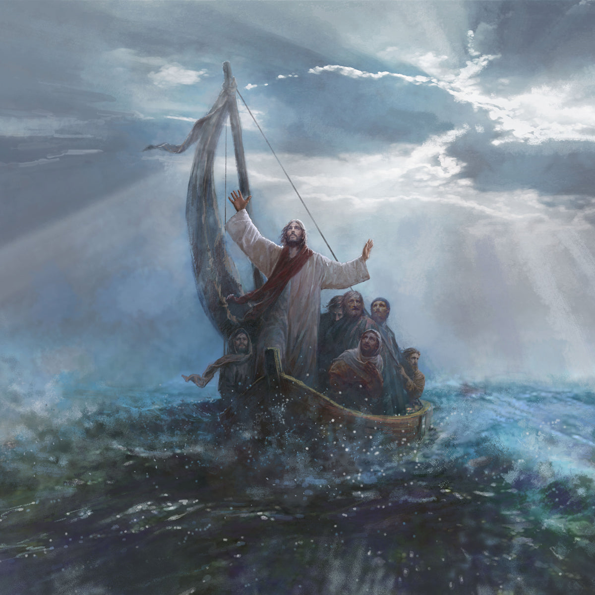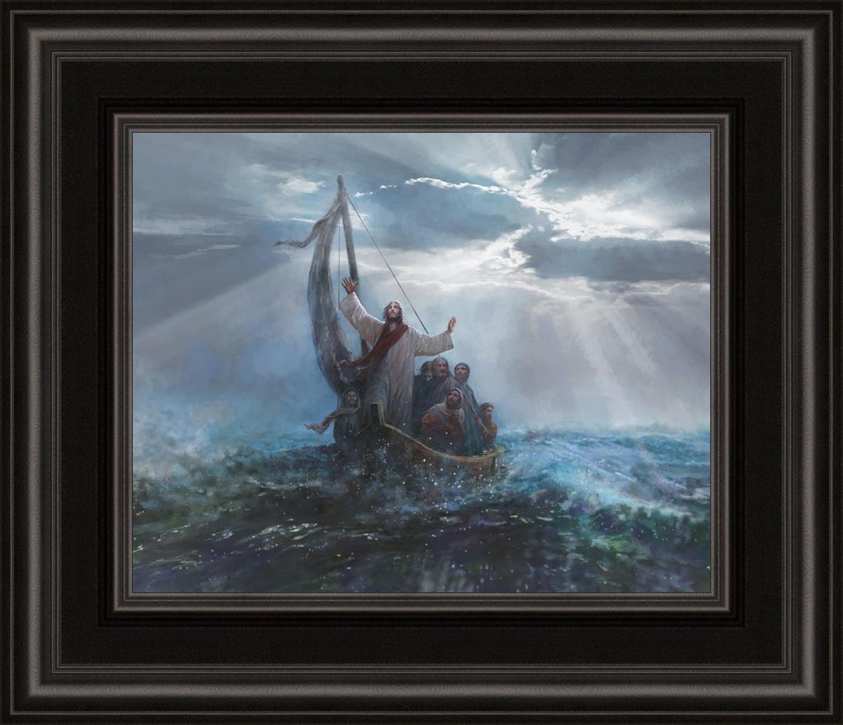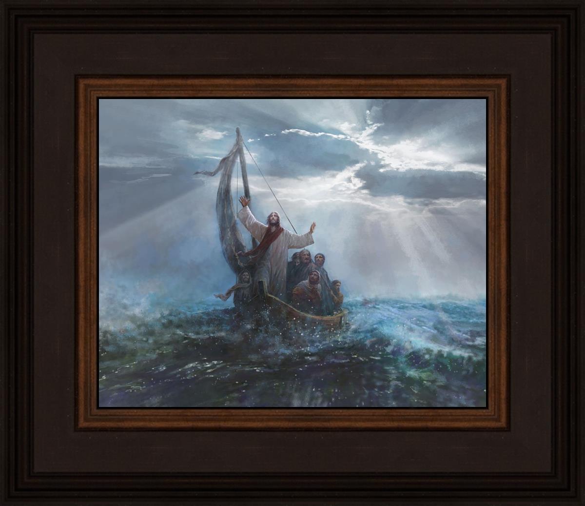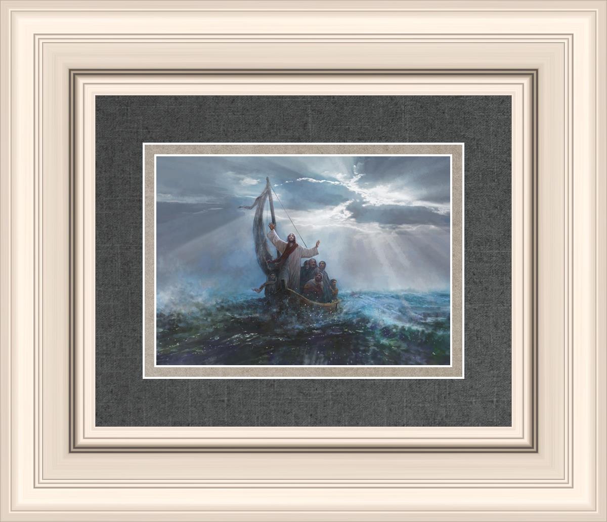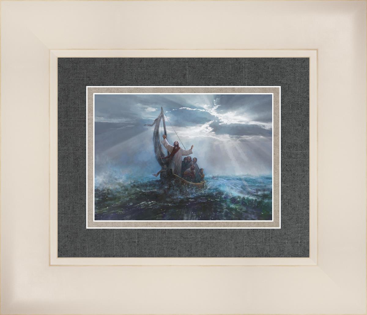 Peace Be Still by Yongsung Kim depicts Jesus on the sea with His arms raised to heaven calming the storm from a boat with his disciples. This painting is available in print and canvas.