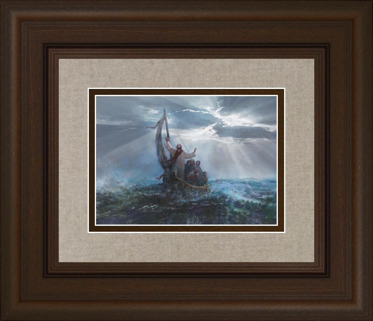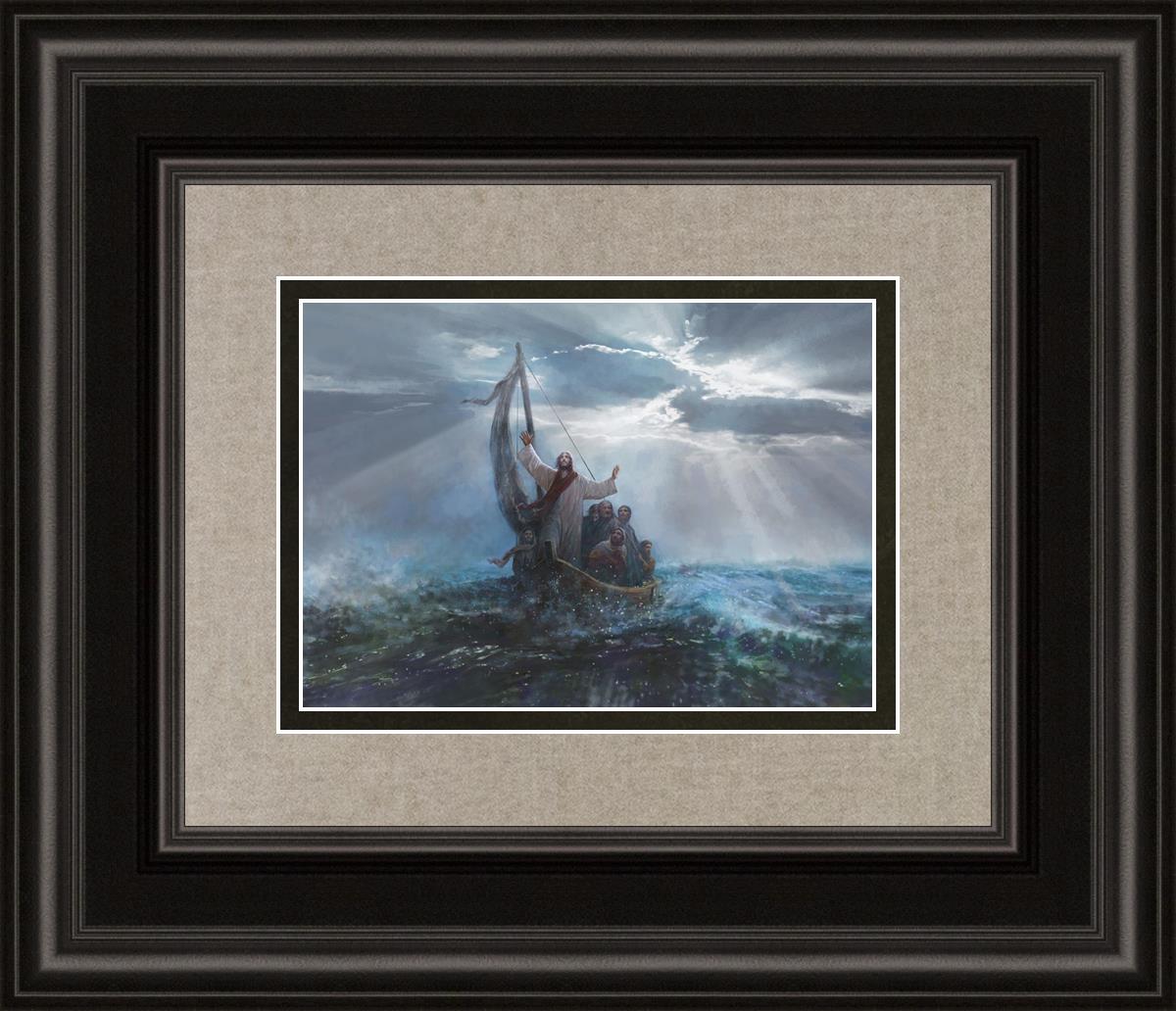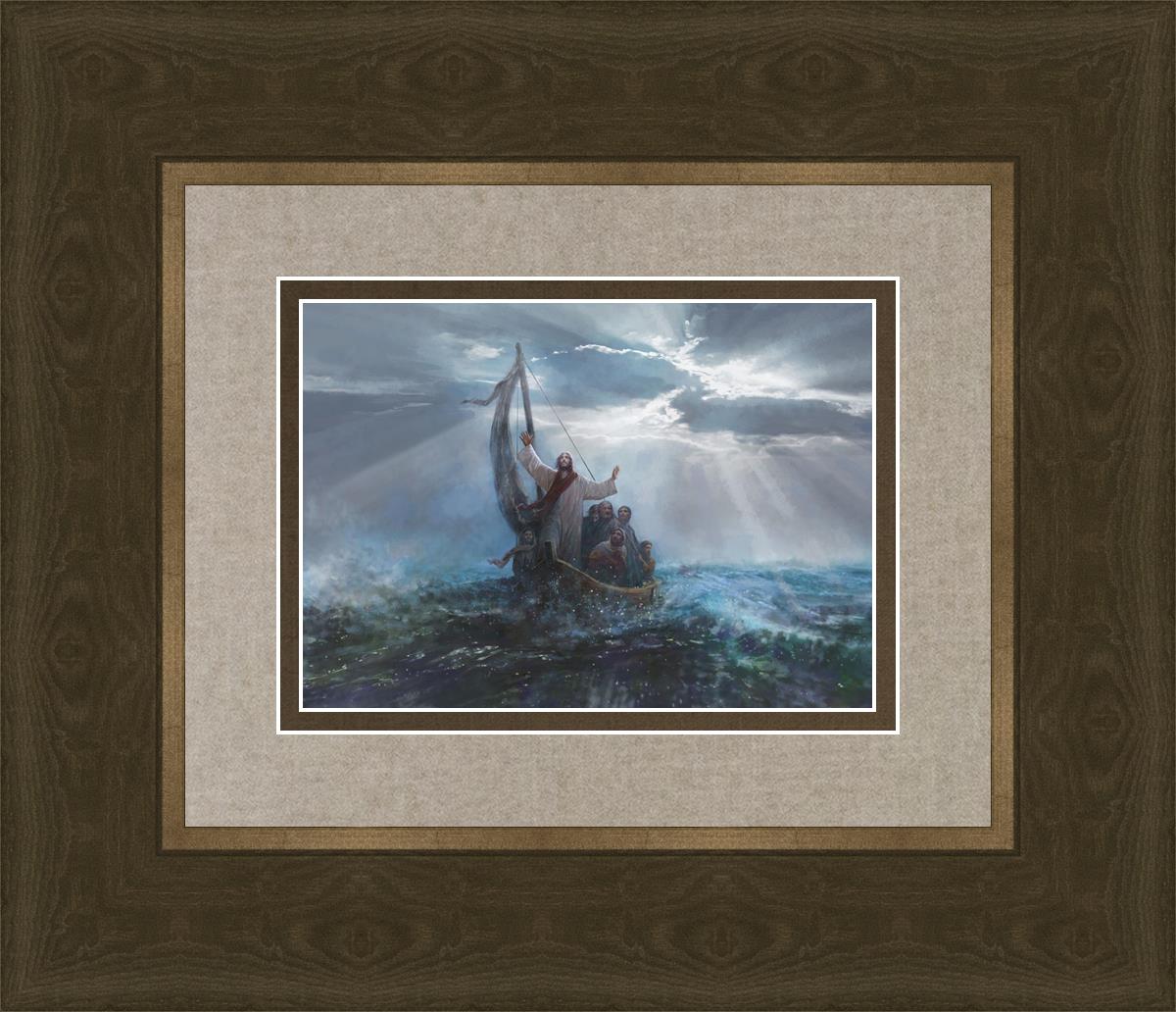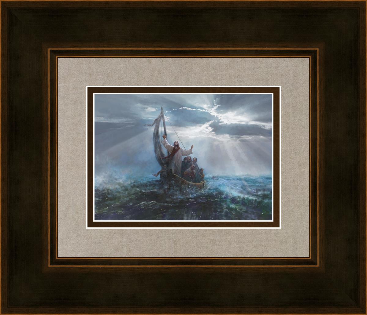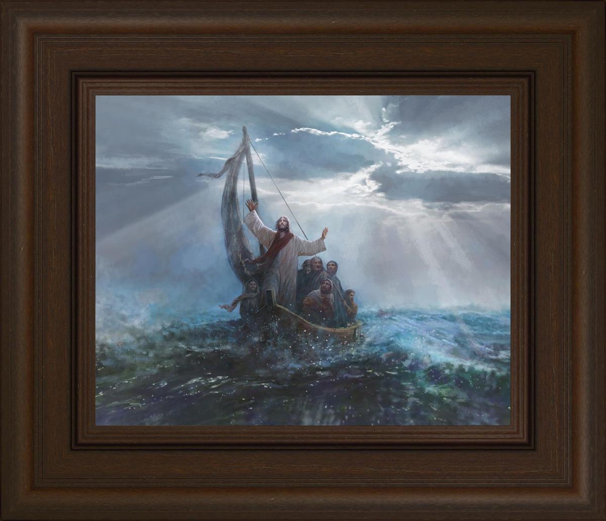 Peace Be Still by Yongsung Kim depicts Jesus on the sea with His arms raised to heaven calming the storm from a boat with his disciples. This painting is available in print and canvas.