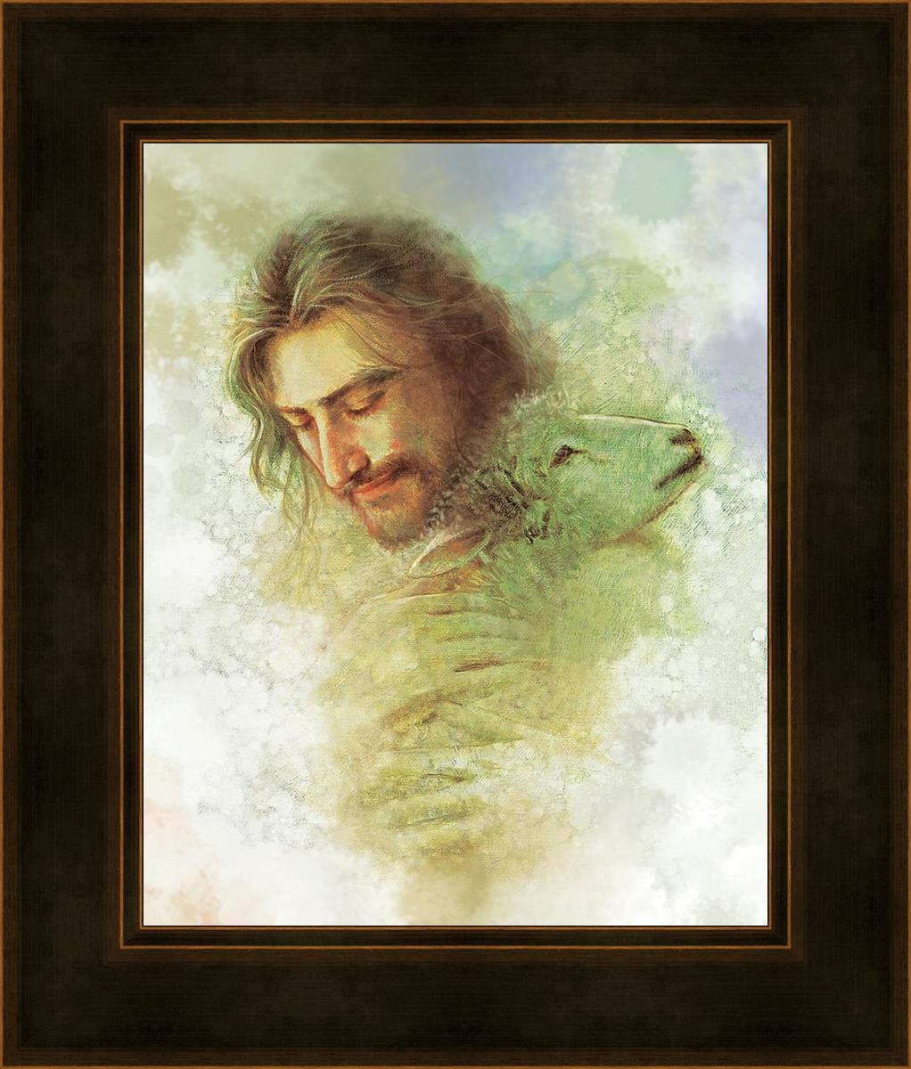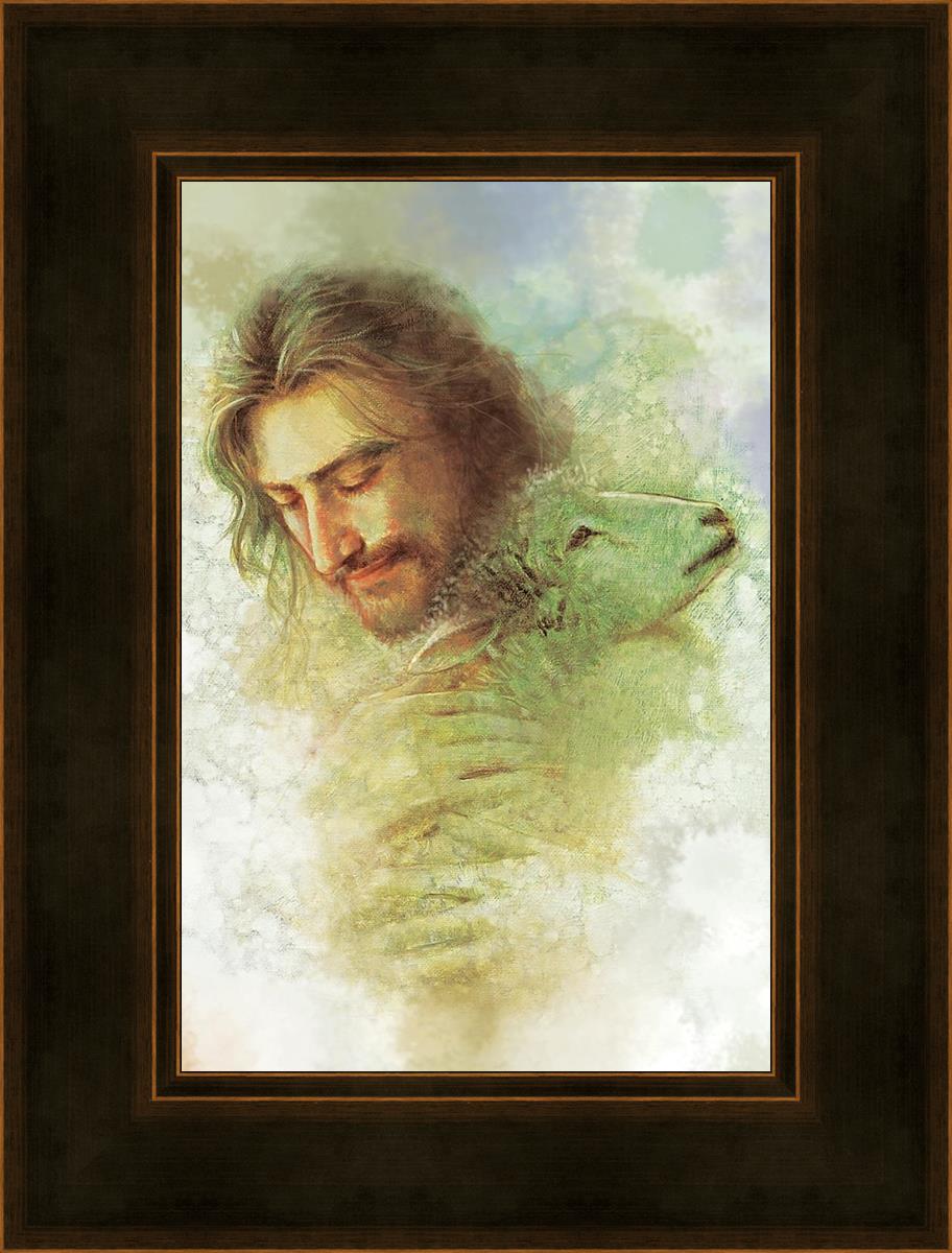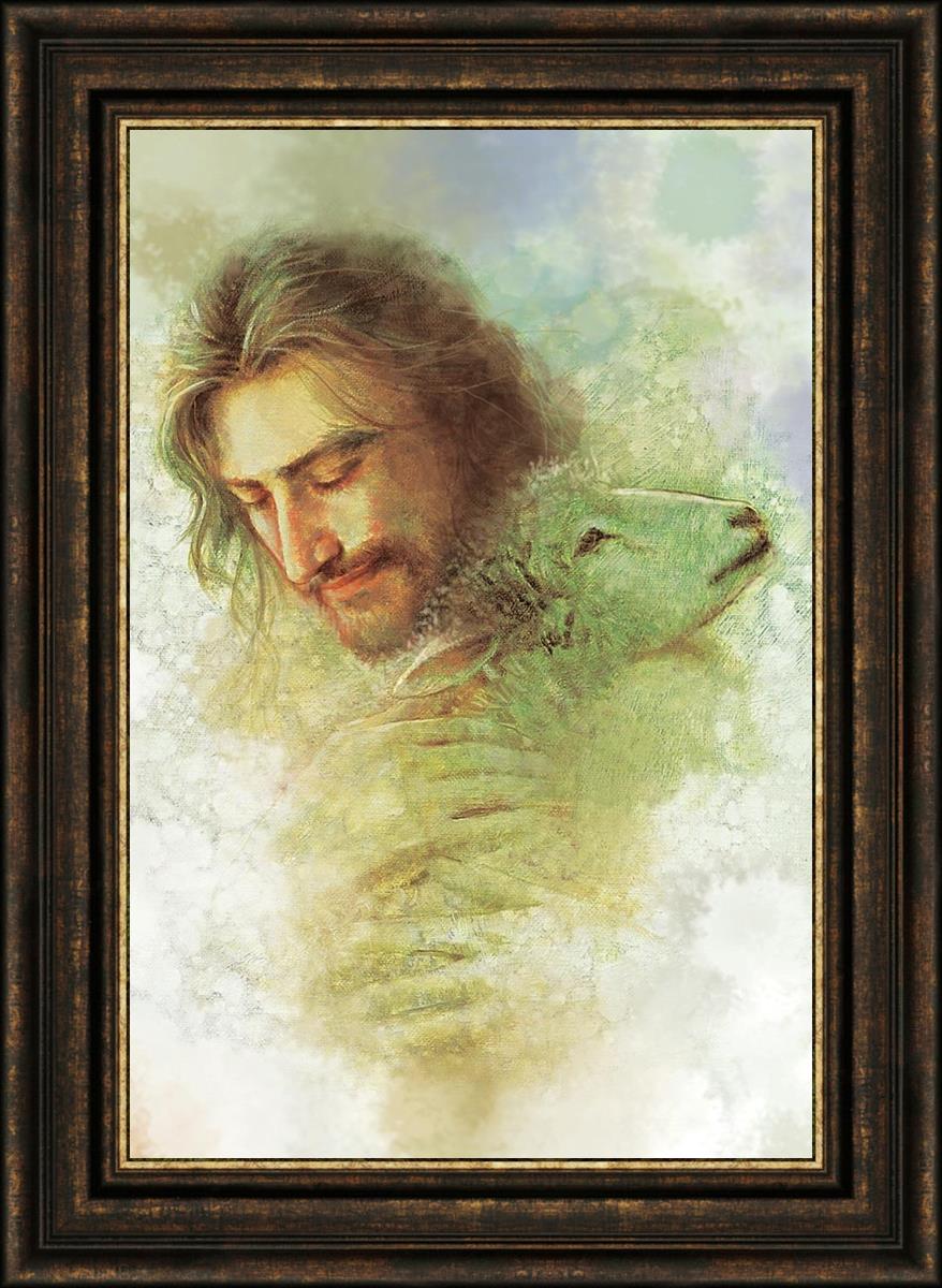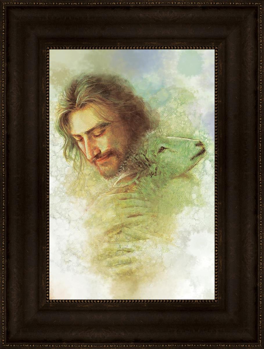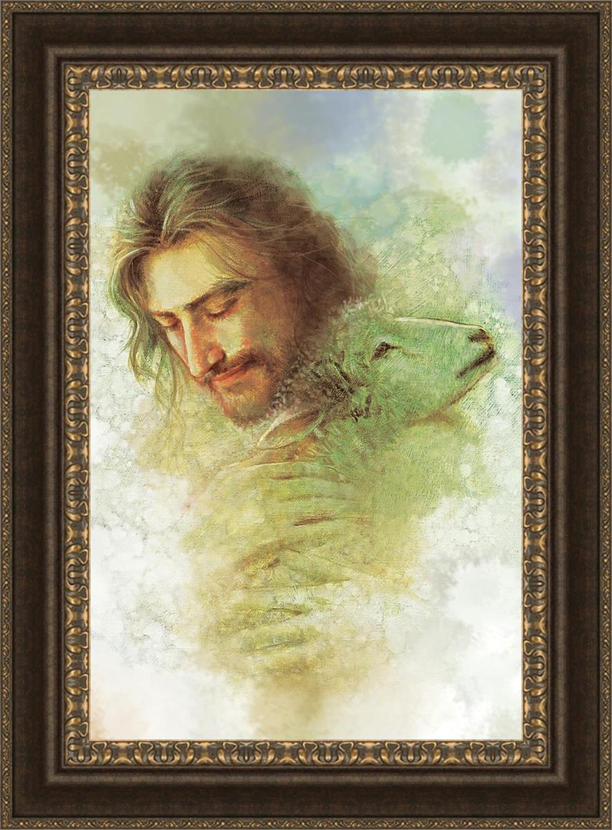 Rejoice by Yongsung Kimdepicts Jesus embracing a lamb. This painting is available in print and canvas.