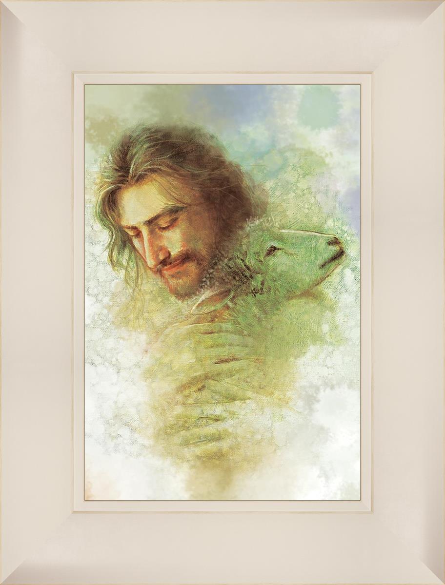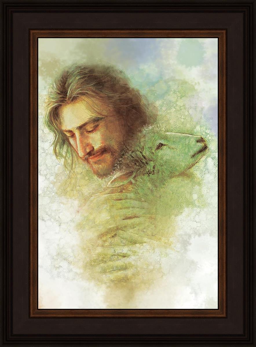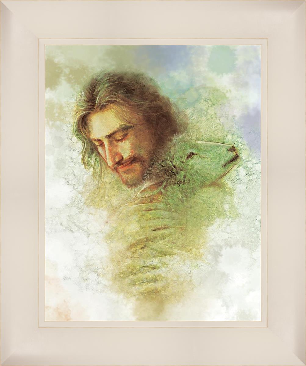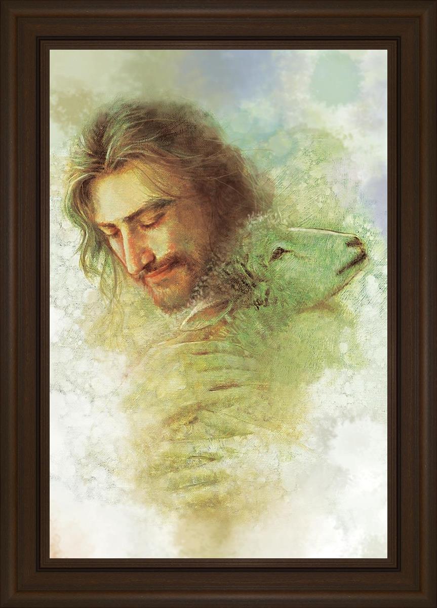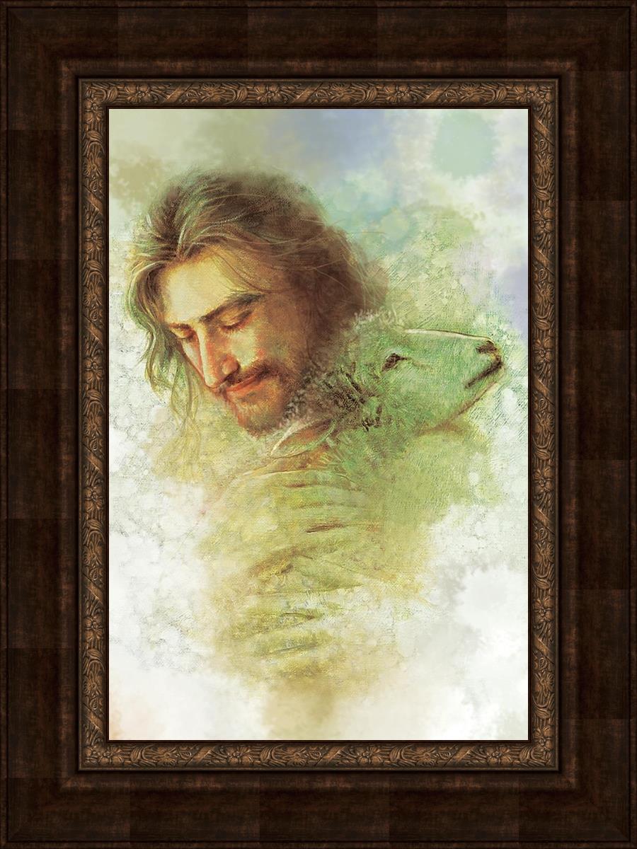 Rejoice by Yongsung Kimdepicts Jesus embracing a lamb. This painting is available in print and canvas.
