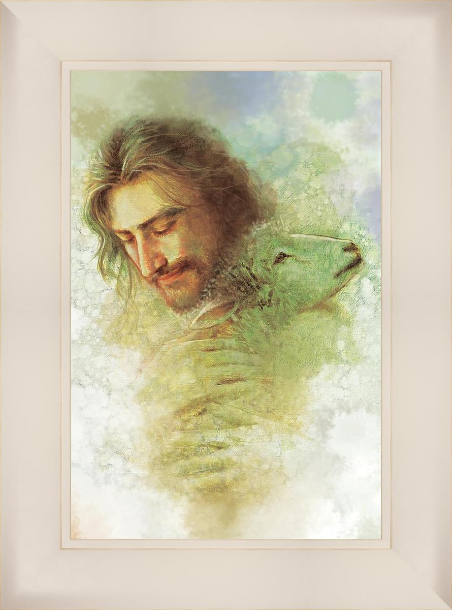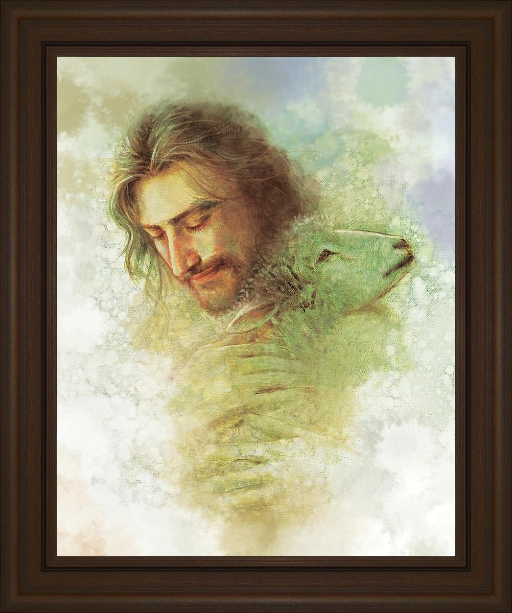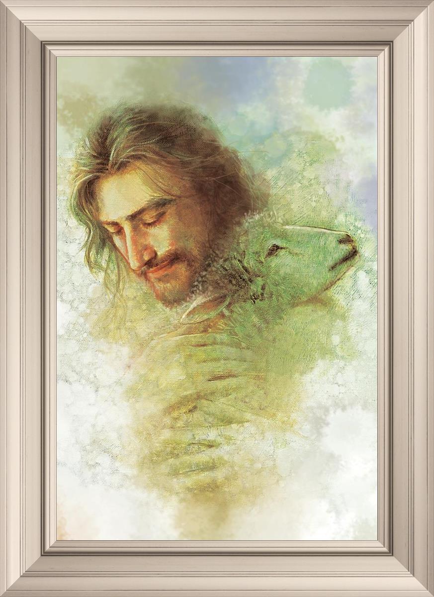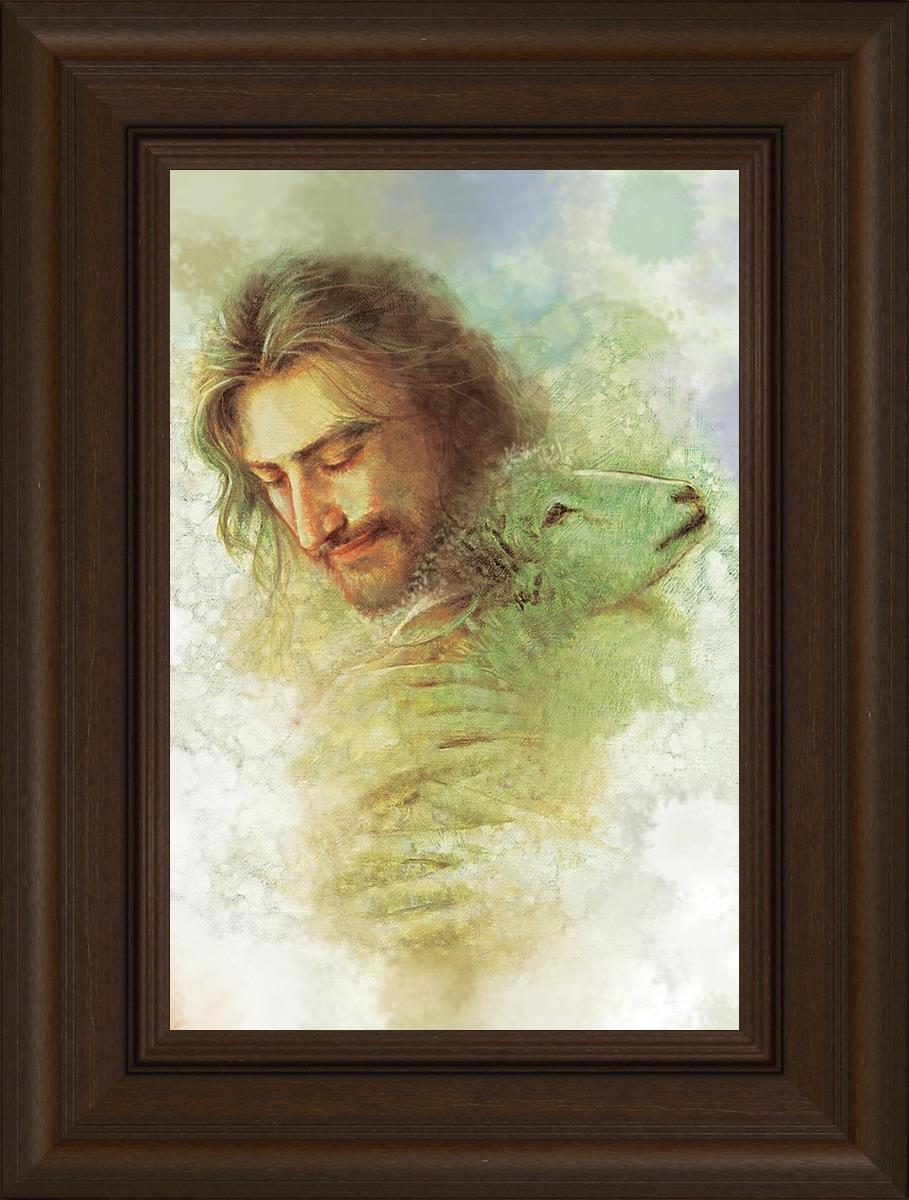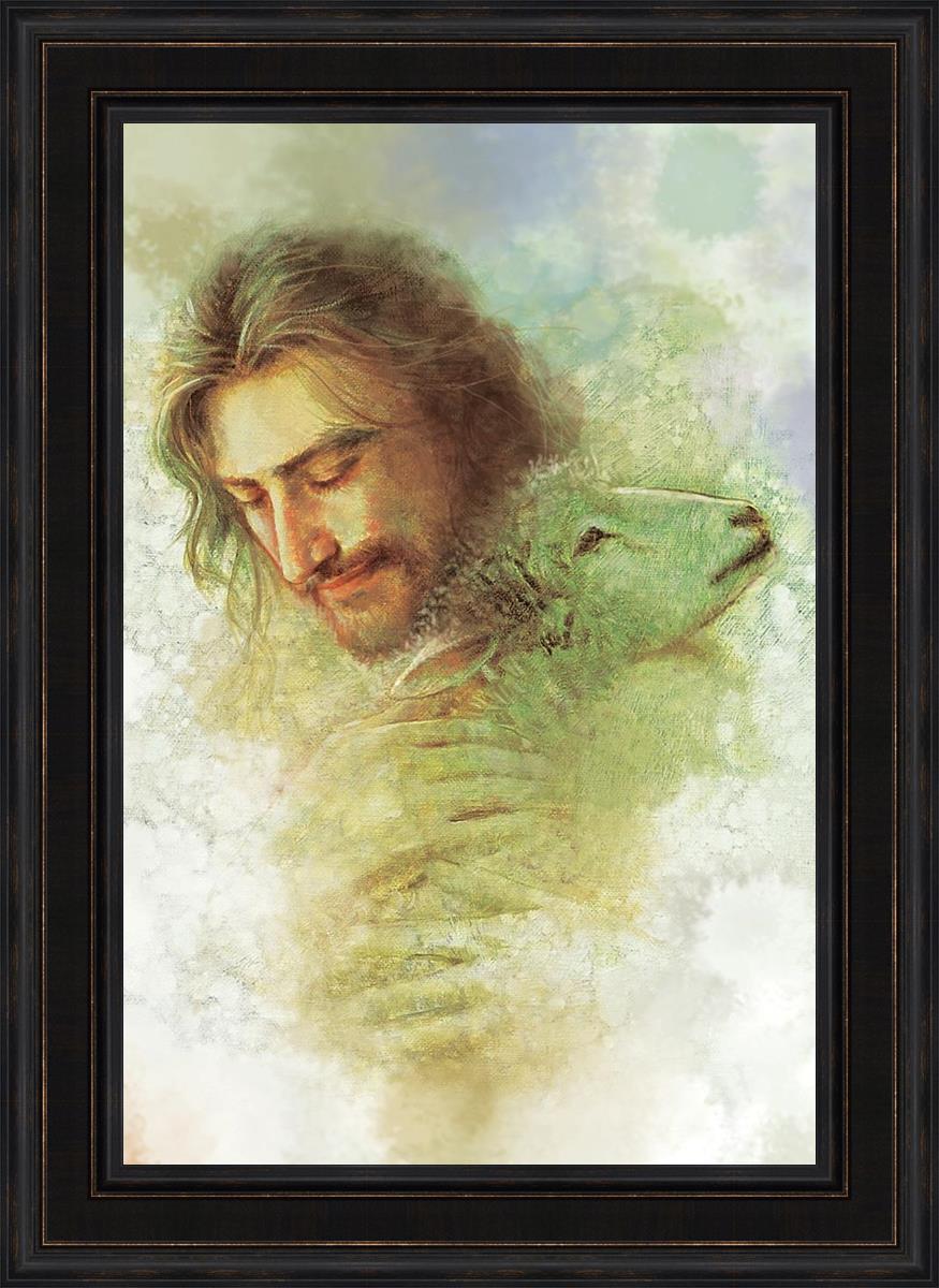 Rejoice by Yongsung Kimdepicts Jesus embracing a lamb. This painting is available in print and canvas.