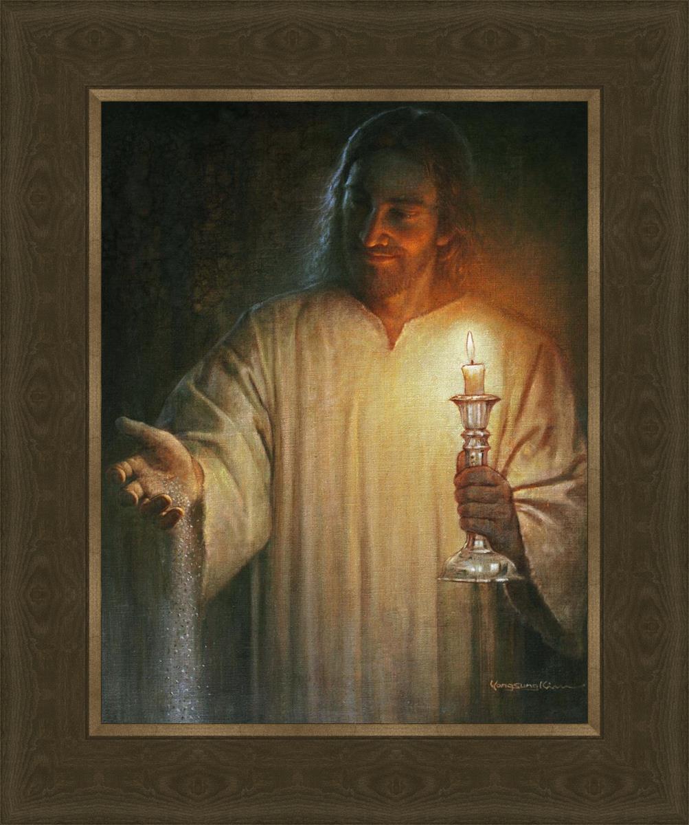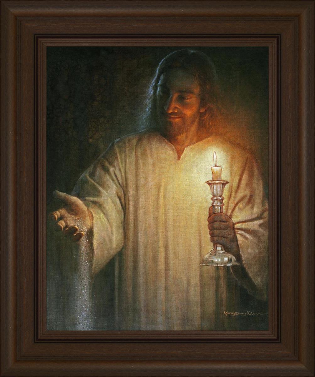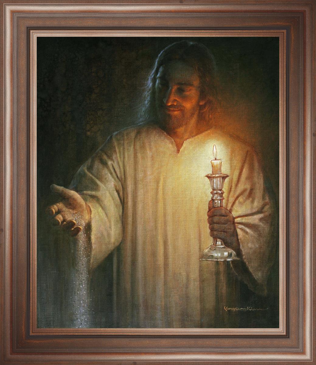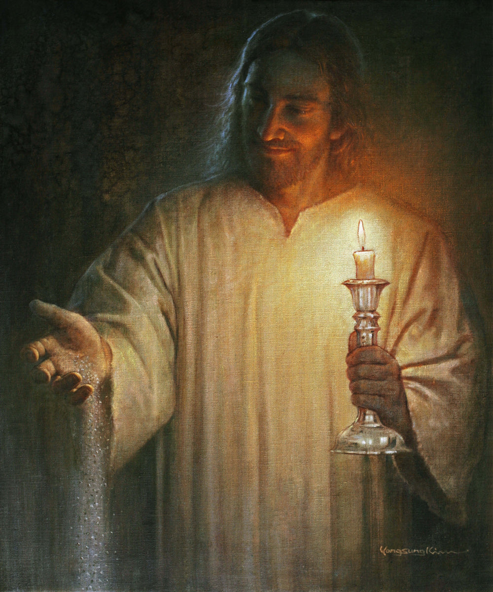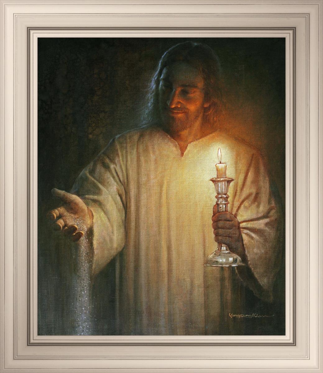 Salt and Light by Yongsung Kim depicts Jesus with a candle in one hand and salt pouring from the other. This painting is available in print and canvas.
