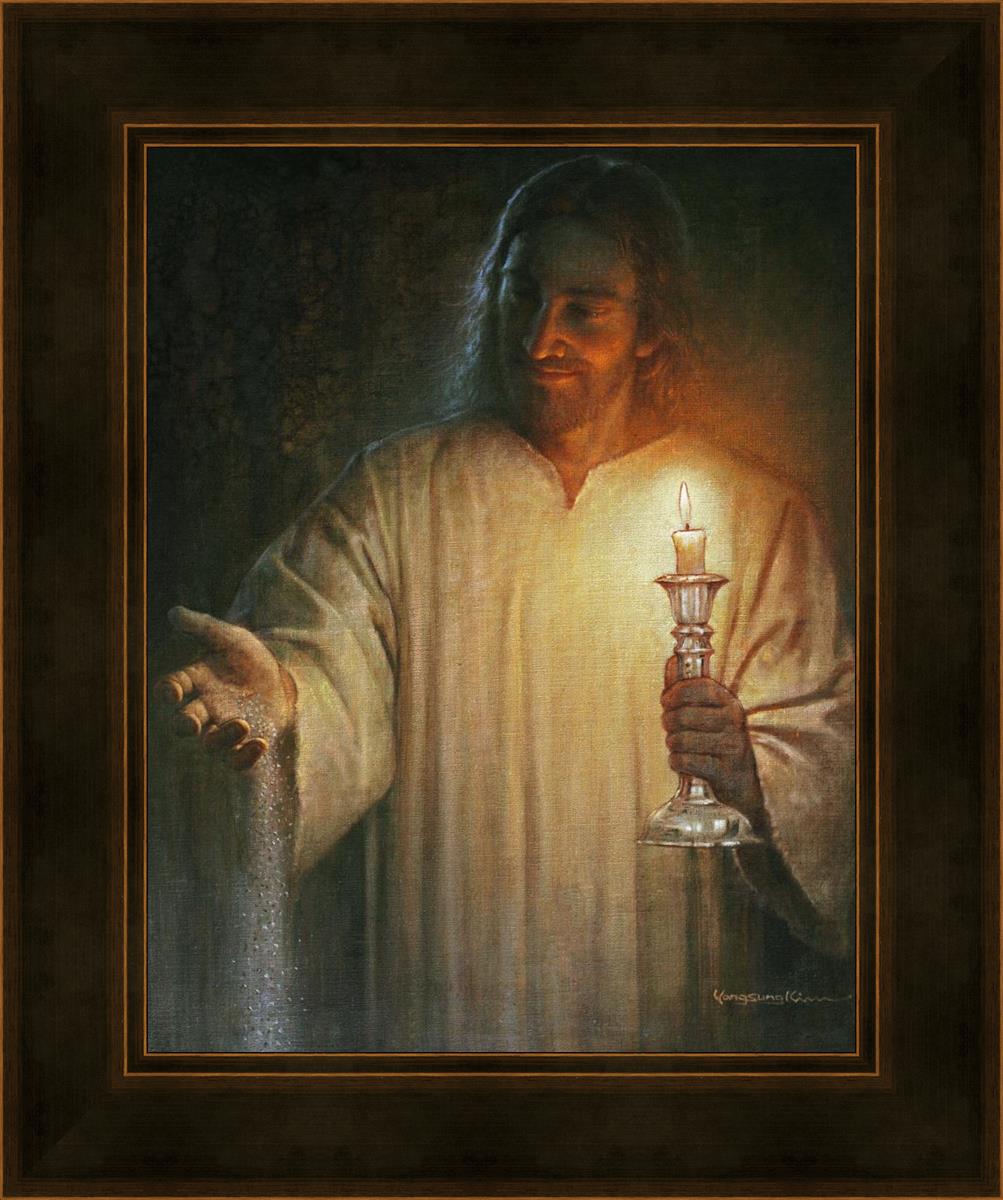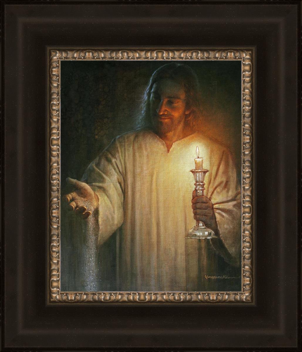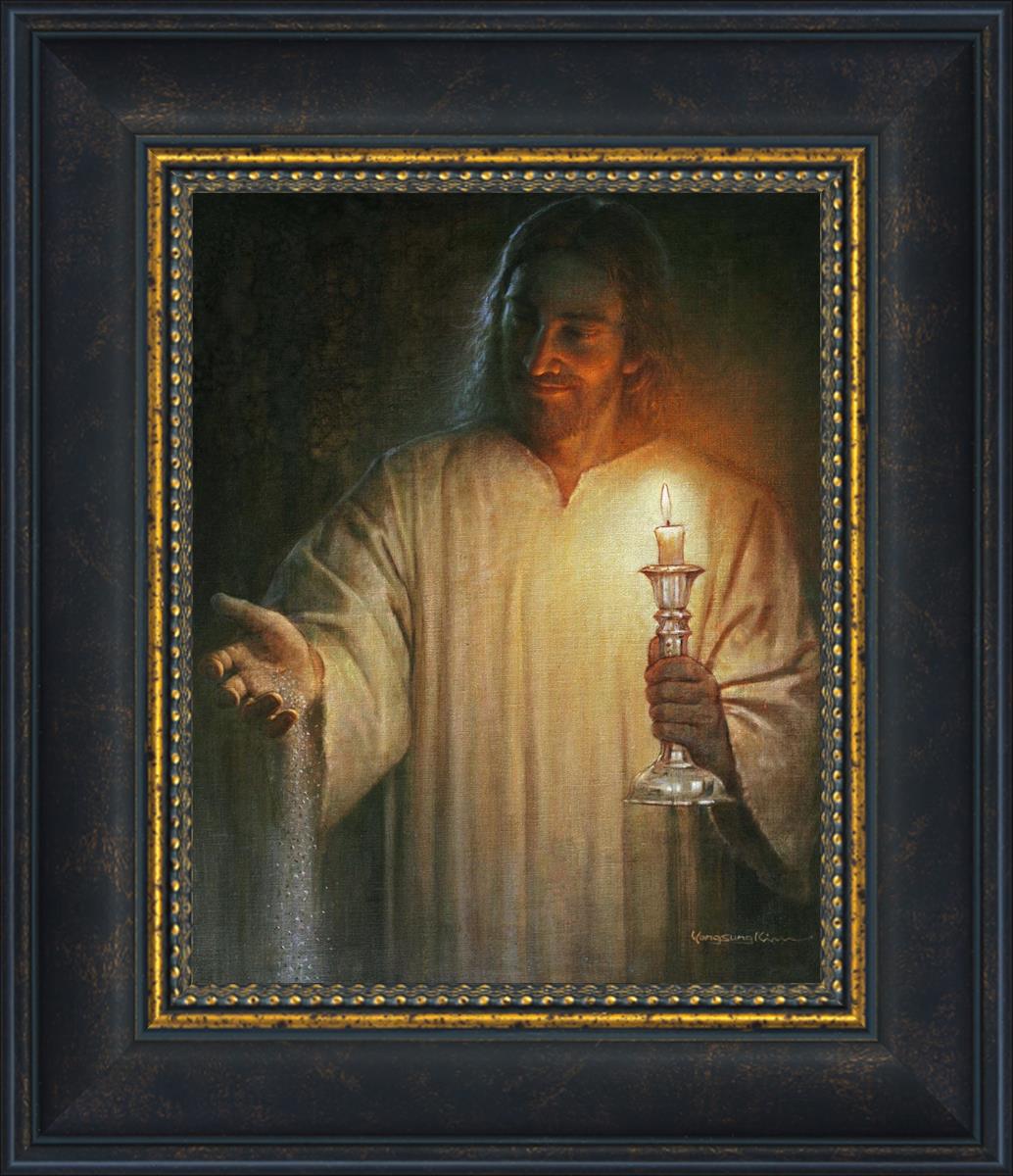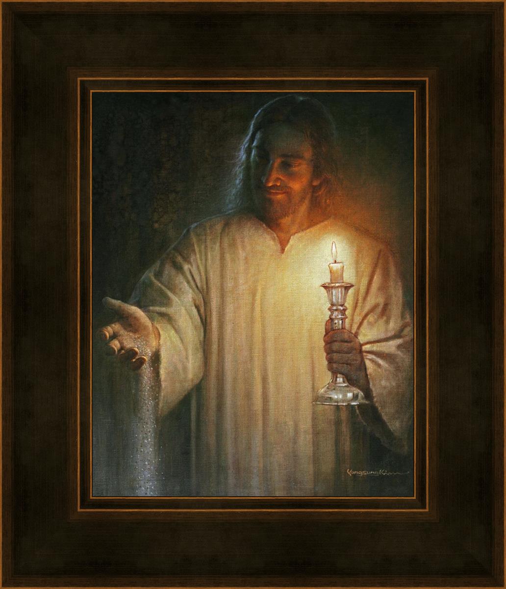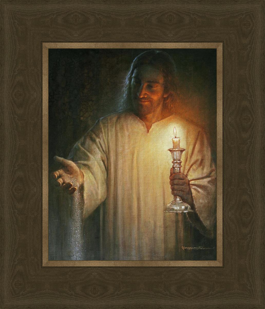 Salt and Light by Yongsung Kim depicts Jesus with a candle in one hand and salt pouring from the other. This painting is available in print and canvas.