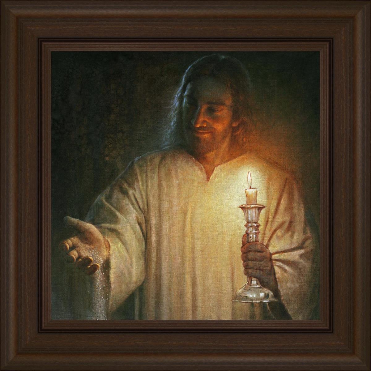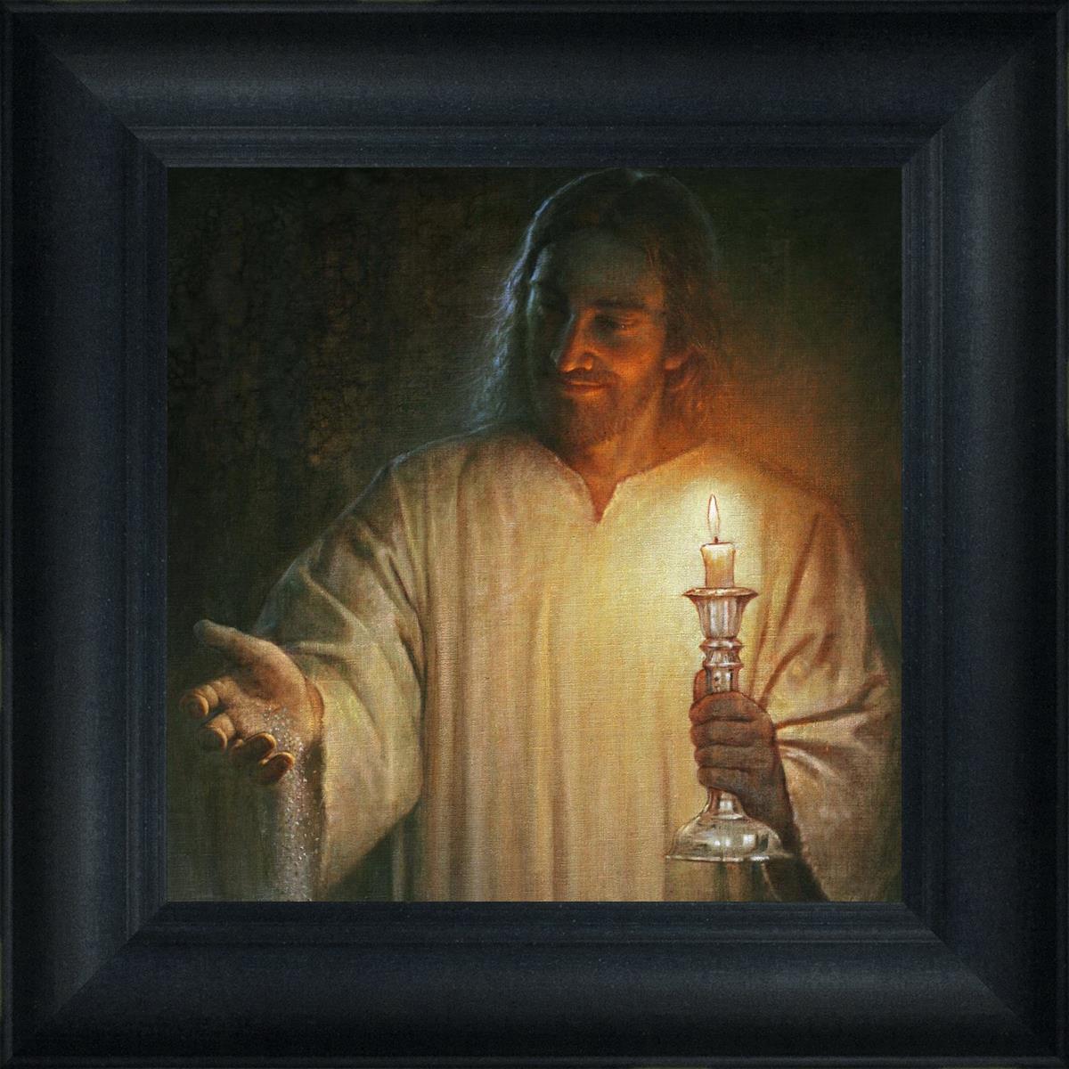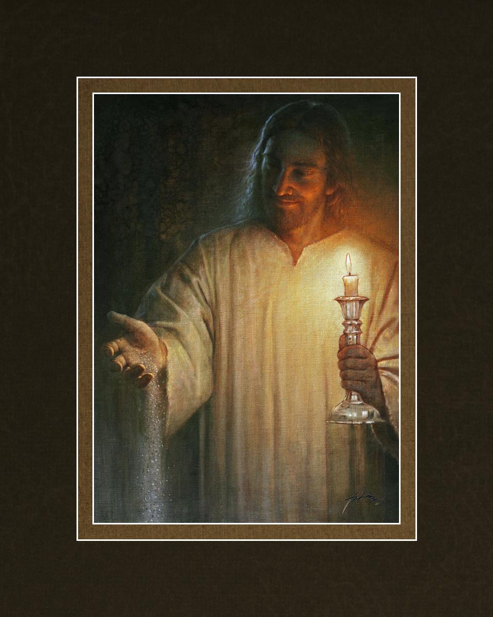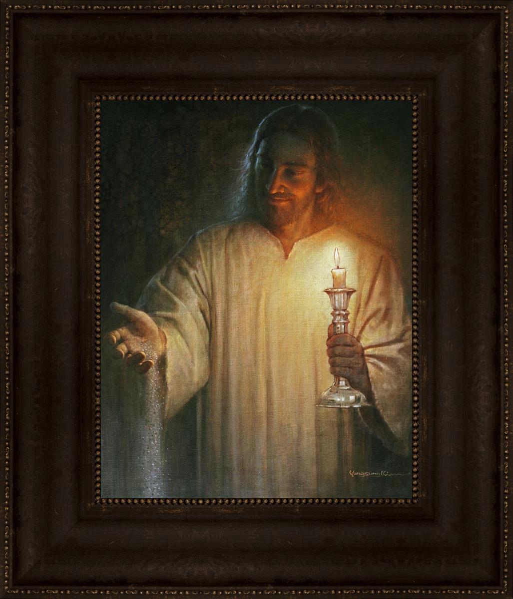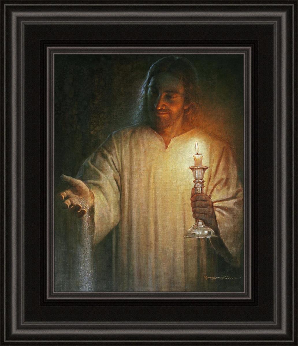 Salt and Light by Yongsung Kim depicts Jesus with a candle in one hand and salt pouring from the other. This painting is available in print and canvas.